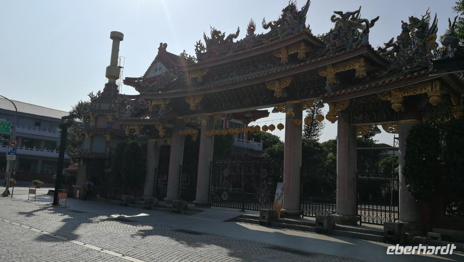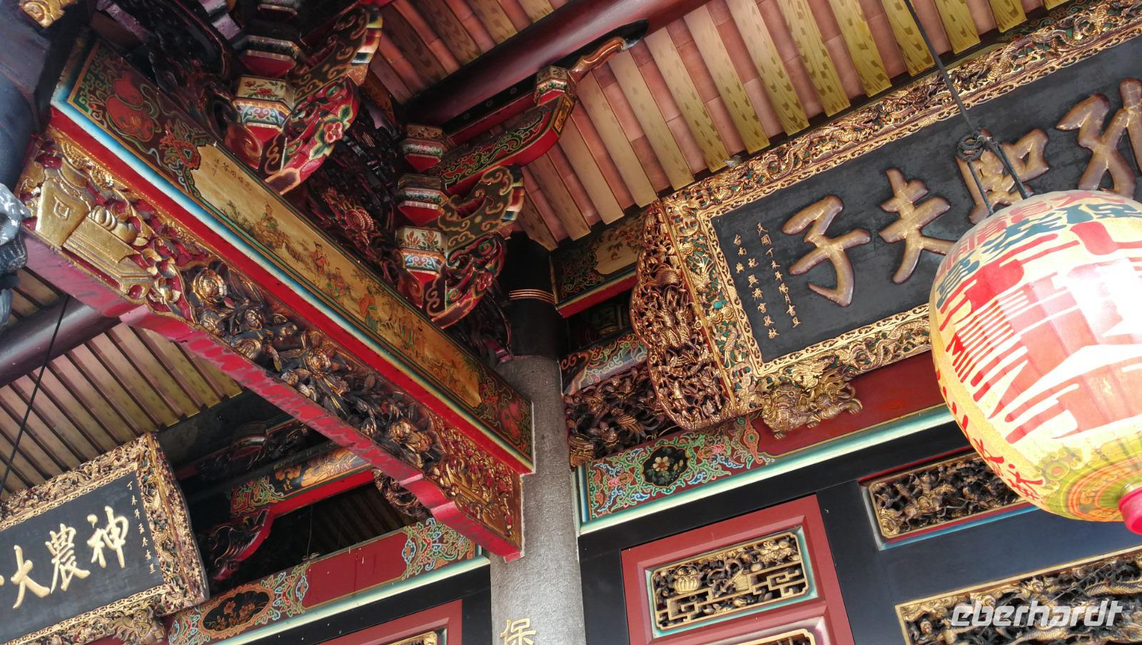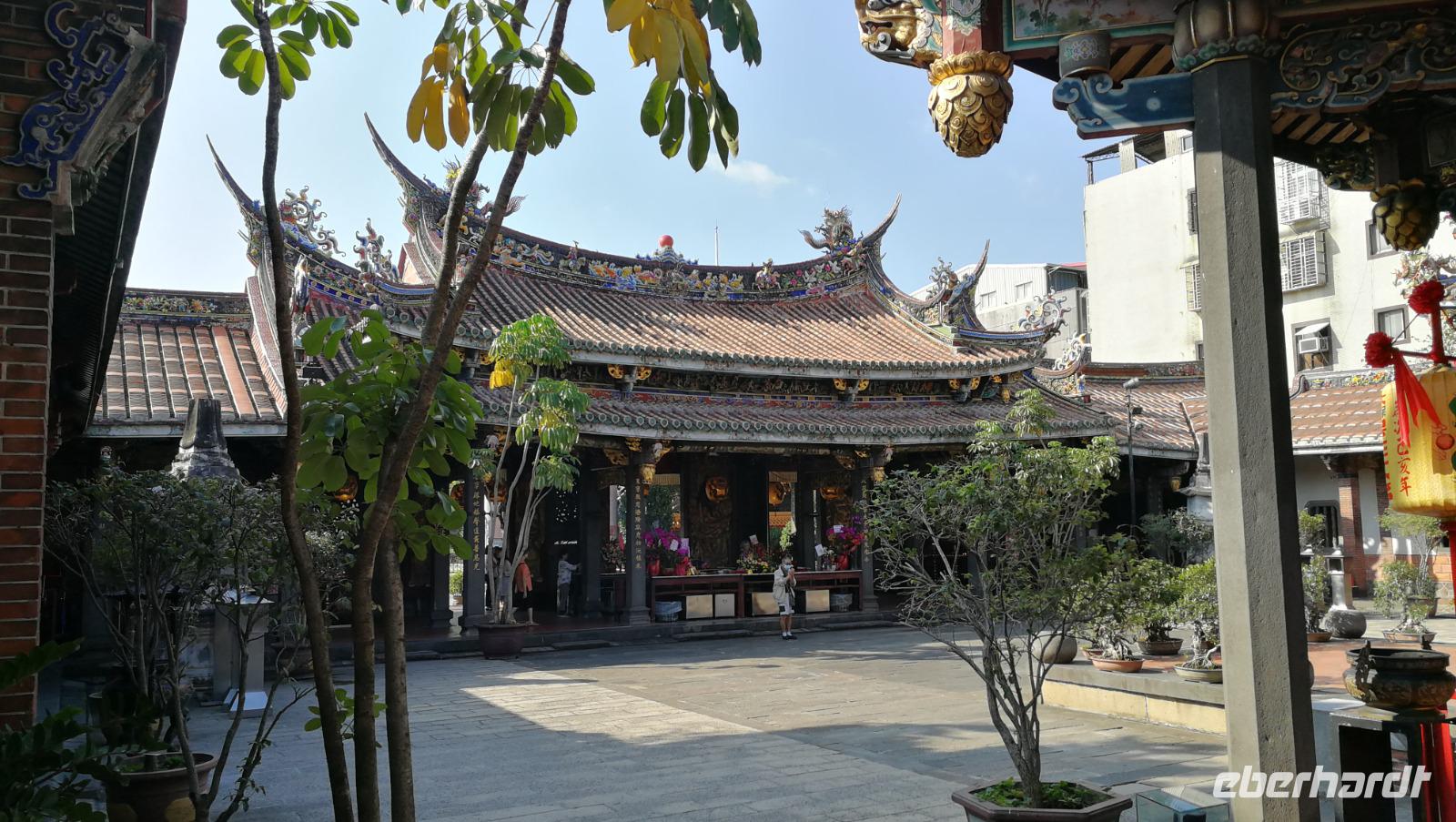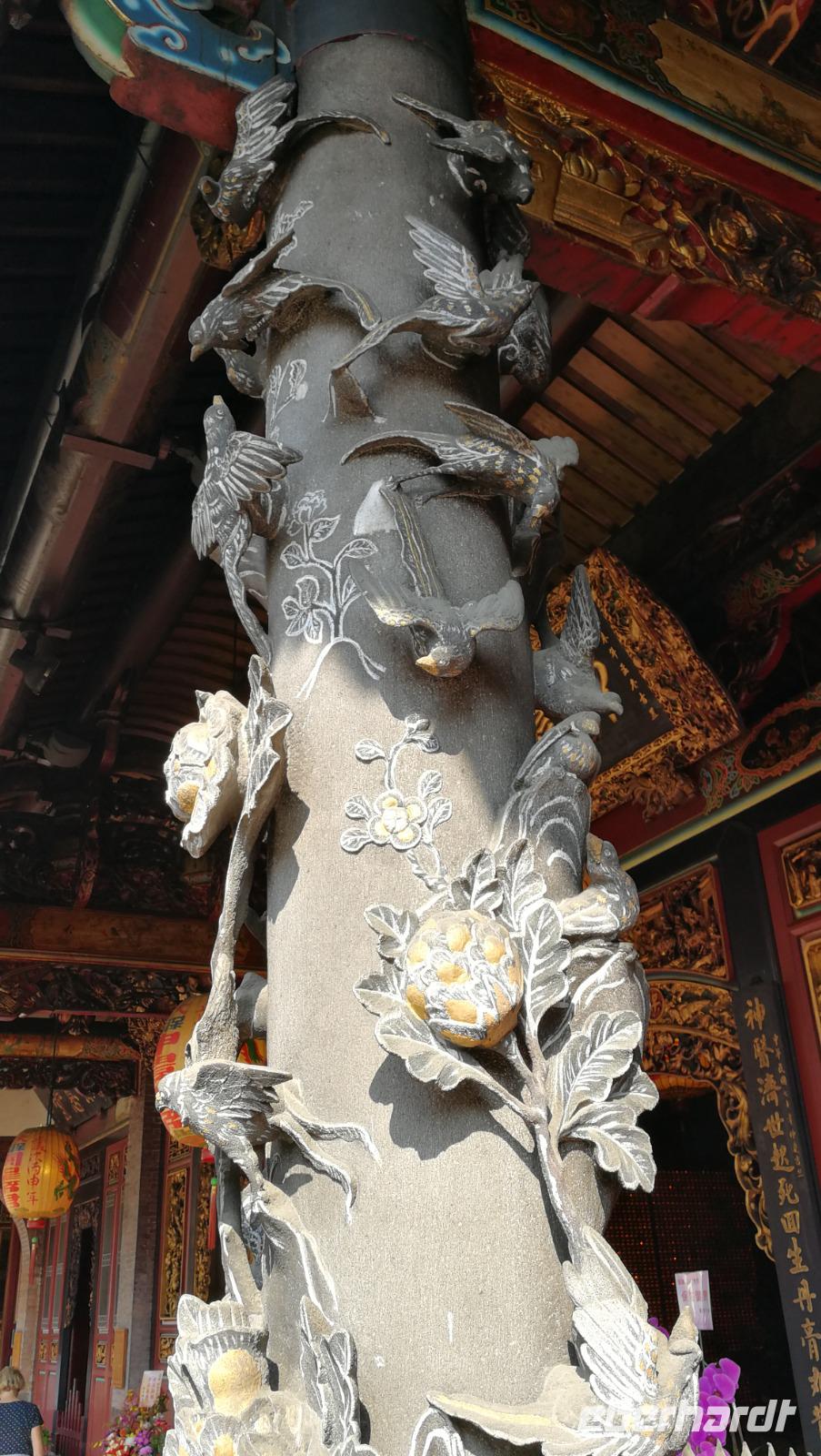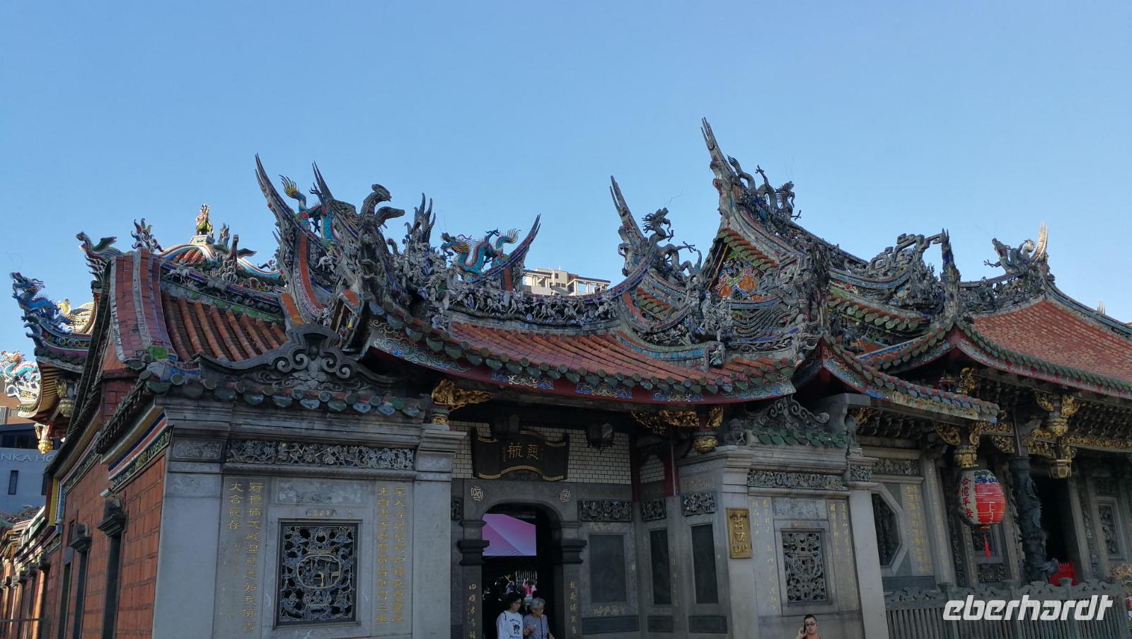 Unsere Reisegruppe traf sich vor dem Abflug nach Taipeh am Gate in Frankfurt und schon früh merkte man, dass über die nächsten Tage eine tolle Gruppendynamik entstehen wird. Aus allen Ecken Deutschlands hatten wir uns zusammengefunden und freuten uns auf die bevorstehende Zeit in Ostasien. Um 11:40 hob der Flieger ab und brachte uns nach ca. 12 Stunden Flugzeit wohlbehalten nach Taiwan, wo es zum Zeitpunkt der Landung früh am Morgen war. Nach den Einreiseprozeduren trafen wir auf unsere taiwanesische Reiseleiterin Syntia, die uns herzlich begrüßte. Auf der Fahrt in die Stadt stellte Sie uns den pazifischen Inselstaat näher vor. Auf einer Fläche so groß wie Baden-Württemberg leben hier ca. 24 Millionen Menschen - die Hauptstadt Taipeh selbst zählt davon ein Zehntel. Selbst im Oktober hat es hier noch immer 25-30°C - ein starker Kontrast zum nasskalten Deutschland aus dem wir am Morgen angereist waren. Nach der kurzen Fahrt kamen wir am Pao-an (sprich: Baoan) Tempel an. Dieser taoistische Tempel aus dem 18. Und 19. Jahrhundert liegt in der Altstadt, gehört zum UNESCO Weltkulturerbe und beeindruckte uns durch die farbenfrohe und reich verzierte Dekoration aus Porzellanfiguren und Goldverzierten Ornamenten. Syntia erklärte uns die taoistischen Gebetsriten: man richtet seine drängenden Fragen an die Gottheit seiner Wahl und formuliert eine einfache ja-nein Frage wie man weiter vorgehen soll. Eine Antwort erhält man durch das Fallenlassen von Gebetssteinen. Je nachdem, wie die Steine auf dem Boden zu liegen kommen befürwortet die Gottheit das Vorhaben oder rät einem davon ab und man formuliert eine neue Frage.