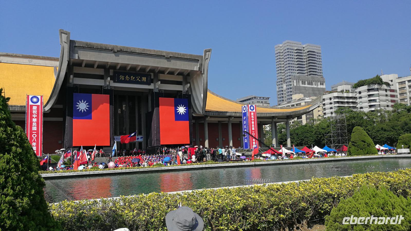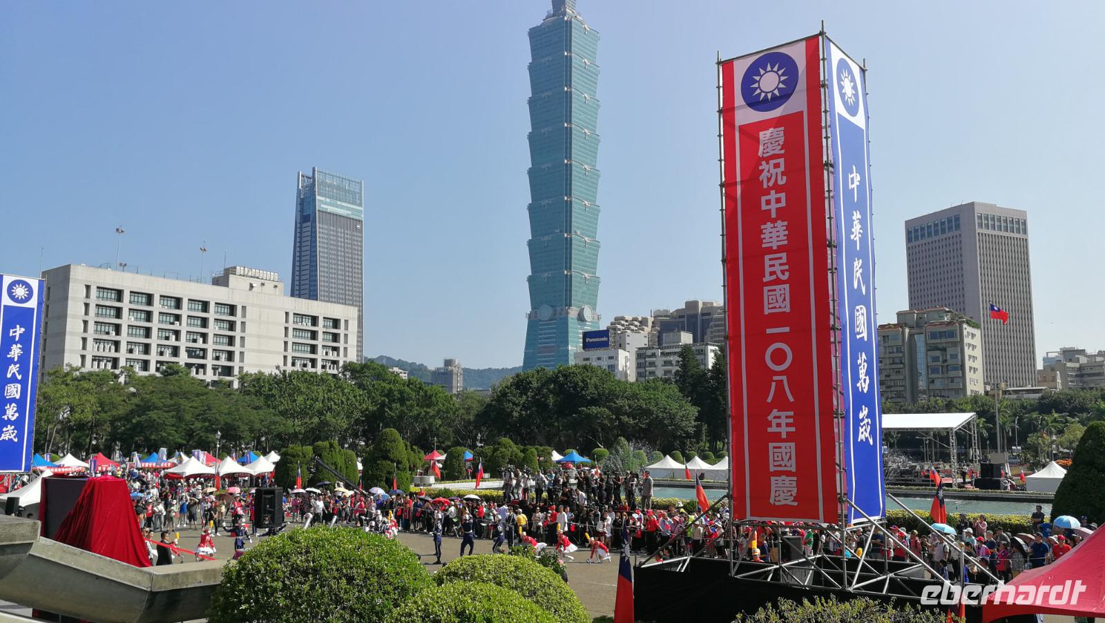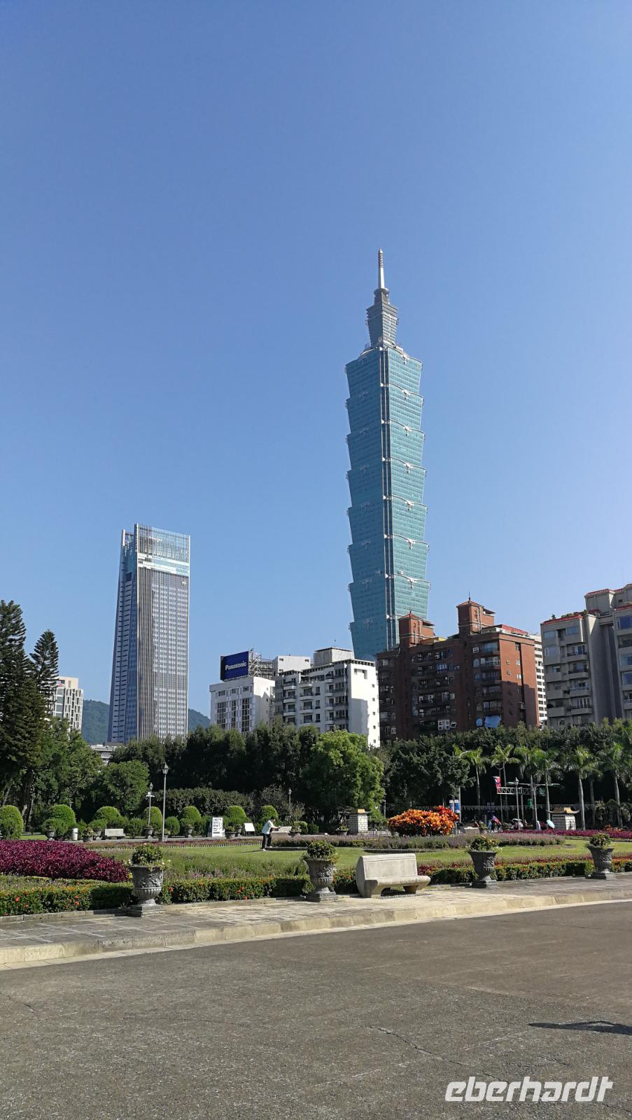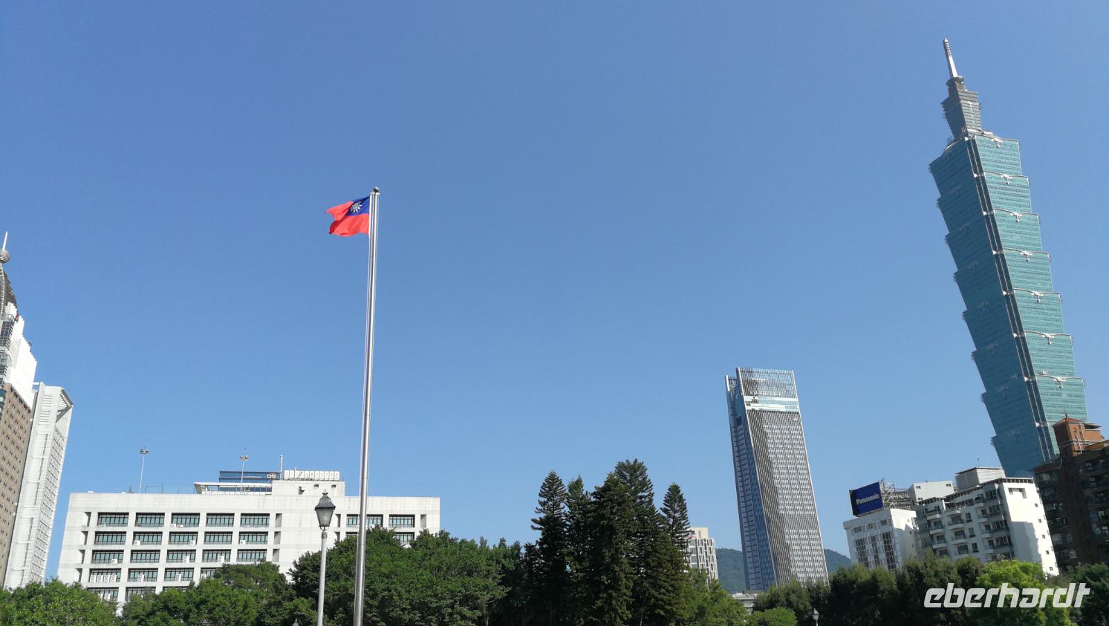 Nach dem Tempel erreichten wir den höchsten Turm des Landes und das weltberühmte Wahrzeichen der Stadt den Taipei 101. Dieser Turm mit 101 Stockwerken und 508 Meter Höhe war zwischen 2004 und 2007 der höchste Turm der Welt und verlor diesen Titel an den damals noch im Bau befindlichen Burj Khalifa. Wir fuhren mit dem schnellsten Aufzug der Welt auf den 89 Stock, wo wir den atemberaubenden Blick über die Stadt und die bergige Umgebung werfen konnten. Im Inneren des Turms kann man die frei hängende Stahlkugel betrachten, die die Schwingungen des Gebäudes durch Winde und Erdbeben ausgleicht und somit die Einsturzgefahr für den Turm verringert. Vom Turm aus konnten wir bereits die Sun Yat-Sen Gedächtnisstätte erblicken - unseren nächsten Stopp. Das Gebäude ist Sun Yat-Sen gewidmet: dem ersten Präsidenten und Begründer der Republik China. Bunte Blumen und riesige Nationalflaggen schmücken heute den Bau, denn es ist Nationalfeiertag in Taiwan. Wir bahnen uns einen Weg durch die Feierlichkeiten und politischen Kundgebungen hinein zur riesigen Statue des Präsidenten. Wir beobachten die feierliche Wachablösung und machen uns danach auf in unser Hotel zu beziehen. Am Abend kosten wir das erste Mal von der asiatischen Küche die uns die nächsten Tage immer wieder begleiten wird - der erste Eindruck ist sehr gut!