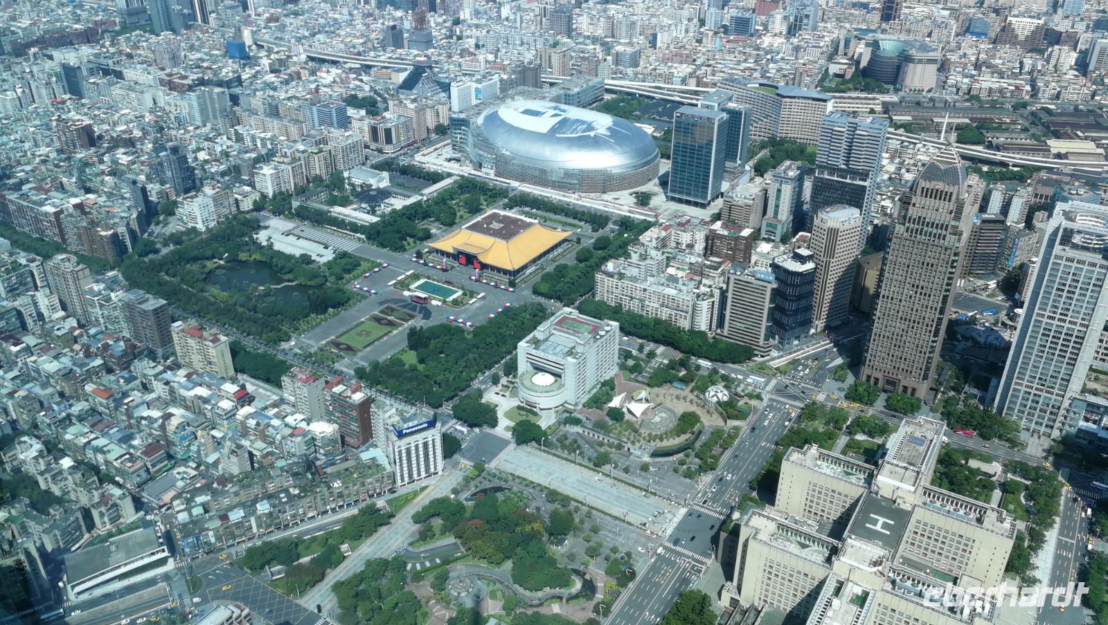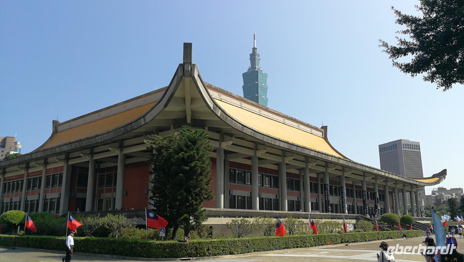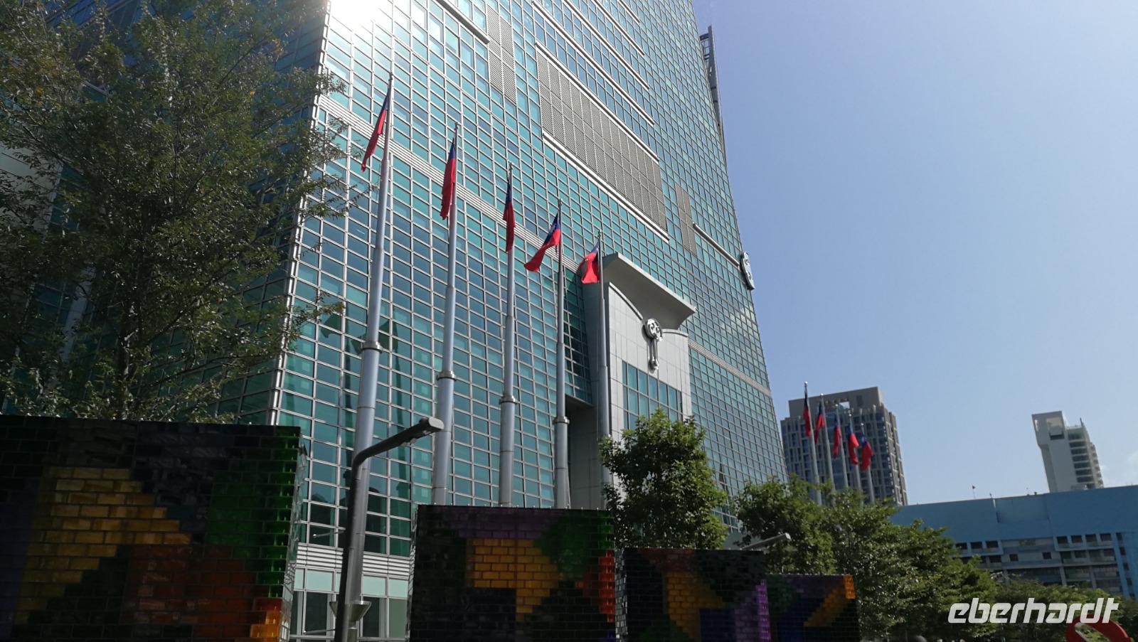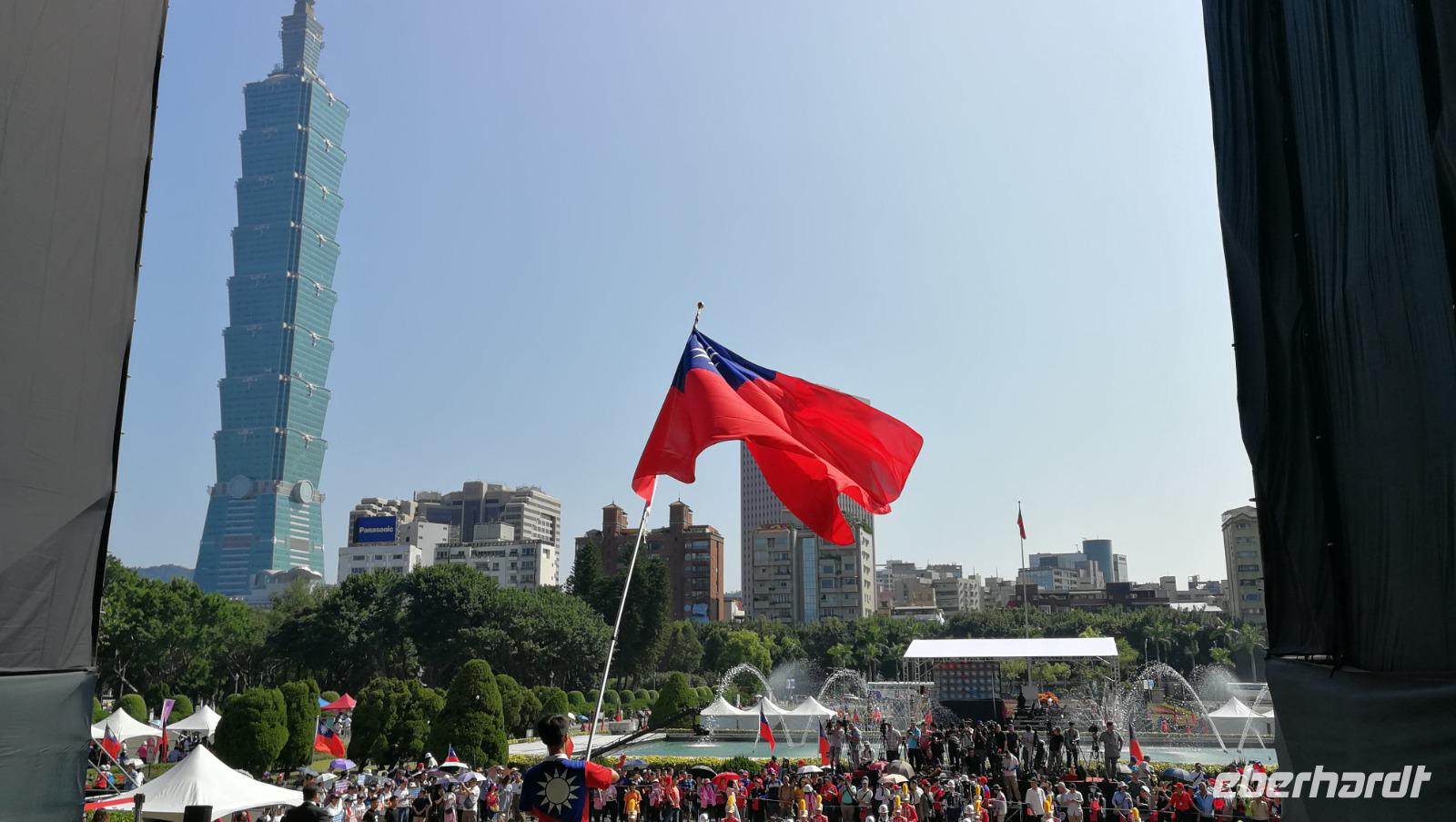 Nach dem Tempel erreichten wir den höchsten Turm des Landes und das weltberühmte Wahrzeichen der Stadt den Taipei 101. Dieser Turm mit 101 Stockwerken und 508 Meter Höhe war zwischen 2004 und 2007 der höchste Turm der Welt und verlor diesen Titel an den damals noch im Bau befindlichen Burj Khalifa. Wir fuhren mit dem schnellsten Aufzug der Welt auf den 89 Stock, wo wir den atemberaubenden Blick über die Stadt und die bergige Umgebung werfen konnten. Im Inneren des Turms kann man die frei hängende Stahlkugel betrachten, die die Schwingungen des Gebäudes durch Winde und Erdbeben ausgleicht und somit die Einsturzgefahr für den Turm verringert. Vom Turm aus konnten wir bereits die Sun Yat-Sen Gedächtnisstätte erblicken - unseren nächsten Stopp. Das Gebäude ist Sun Yat-Sen gewidmet: dem ersten Präsidenten und Begründer der Republik China. Bunte Blumen und riesige Nationalflaggen schmücken heute den Bau, denn es ist Nationalfeiertag in Taiwan. Wir bahnen uns einen Weg durch die Feierlichkeiten und politischen Kundgebungen hinein zur riesigen Statue des Präsidenten. Wir beobachten die feierliche Wachablösung und machen uns danach auf in unser Hotel zu beziehen. Am Abend kosten wir das erste Mal von der asiatischen Küche die uns die nächsten Tage immer wieder begleiten wird - der erste Eindruck ist sehr gut!