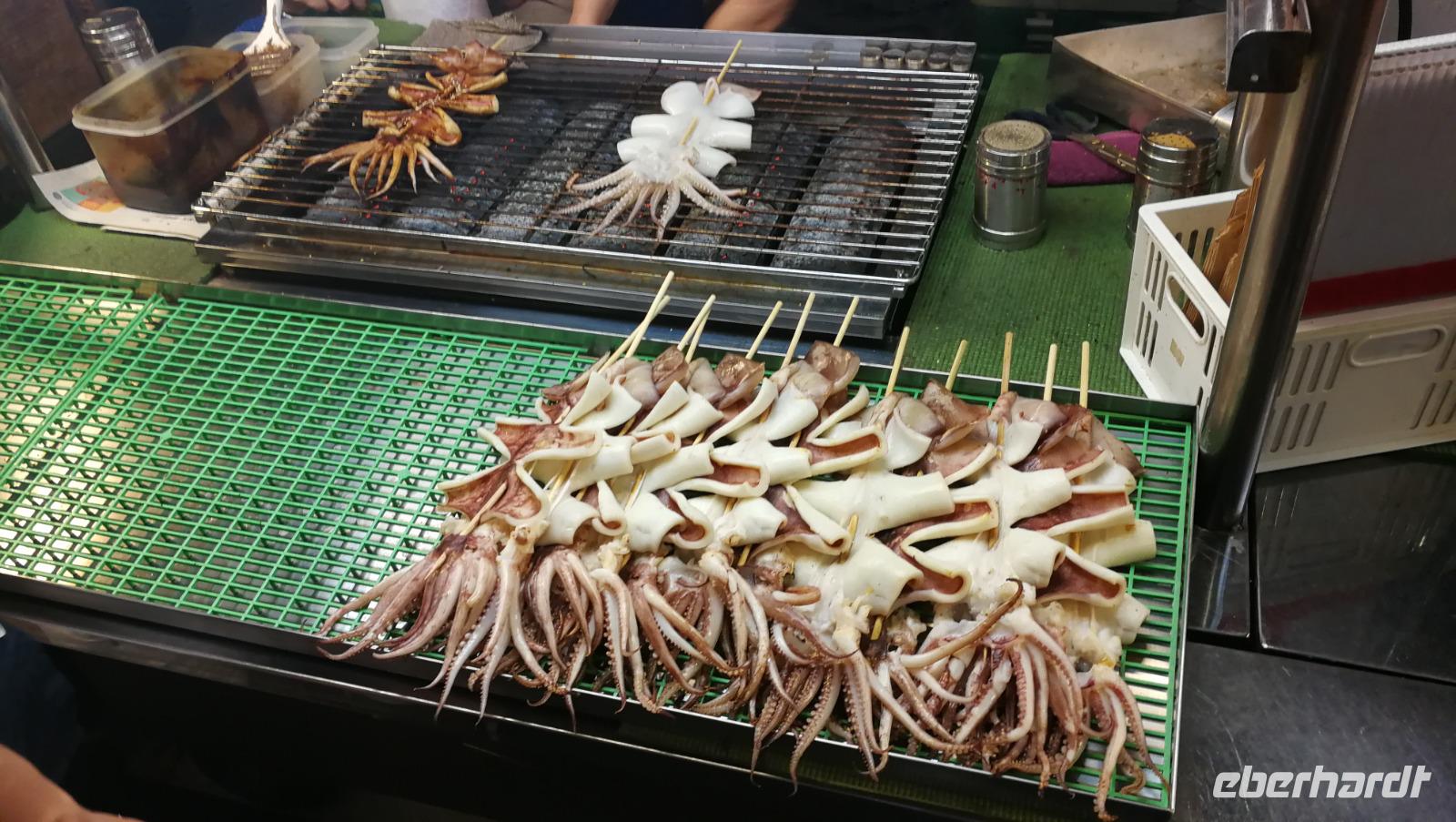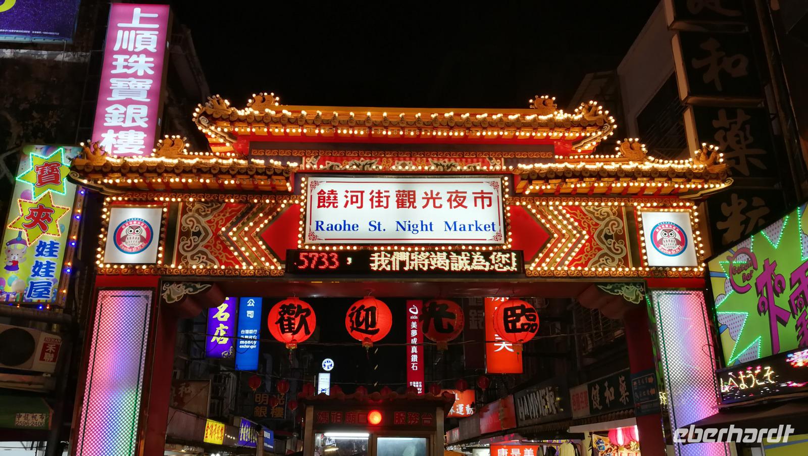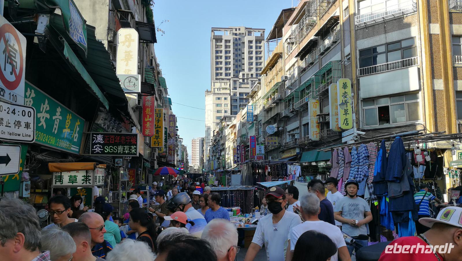 Danach tauchen wir nochmals in das geschäftige Treiben Taipehs ein indem wir den ältesten Tempel der Stadt sowie die umliegenden Straßenmärkte besuchen. Wir schlendern durch die Menschenmenge und sehen uns satt an dem bunten Treiben und Gebetsgesängen im Tempel bevor wir allerlei kuriose Waren auf dem Markt bewundern. Wir probieren heimischen Kräutertee und schlendern durch die schmalen Gassen die vollgepackt sind mit Essensständen und allerlei Kleinigkeiten. Auf dem Nachtmarkt Rau He suchen wir nach einer Mahlzeit und einigen uns schließlich auf ein kleines Steakrestaurant, welches uns die Atempause bietet, die ganzen fremden und überwältigenden Eindrücke des Markts zu verarbeiten. Allerlei für uns exotische Leckereien wie getrockneter Tintenfisch oder fritierten Meeresfrüchten lassen sich hier finden. Da wir am nächsten morgen früh weiterreisen kehren wir bald ins Hotel zurück und bereiten uns auf den Flug nach Korea vor.