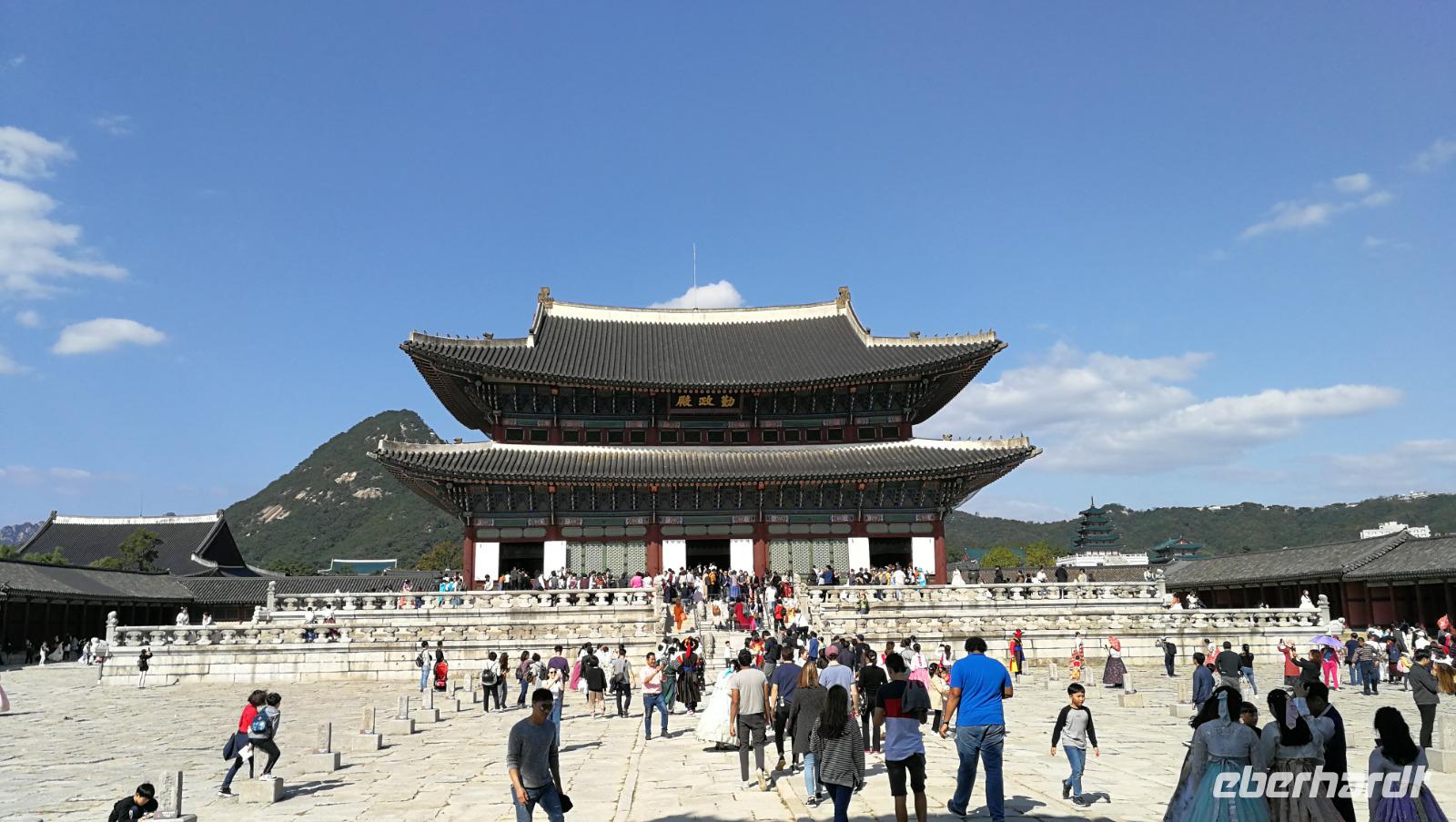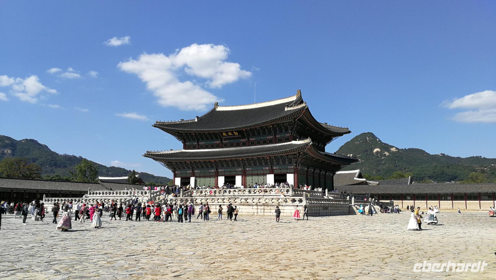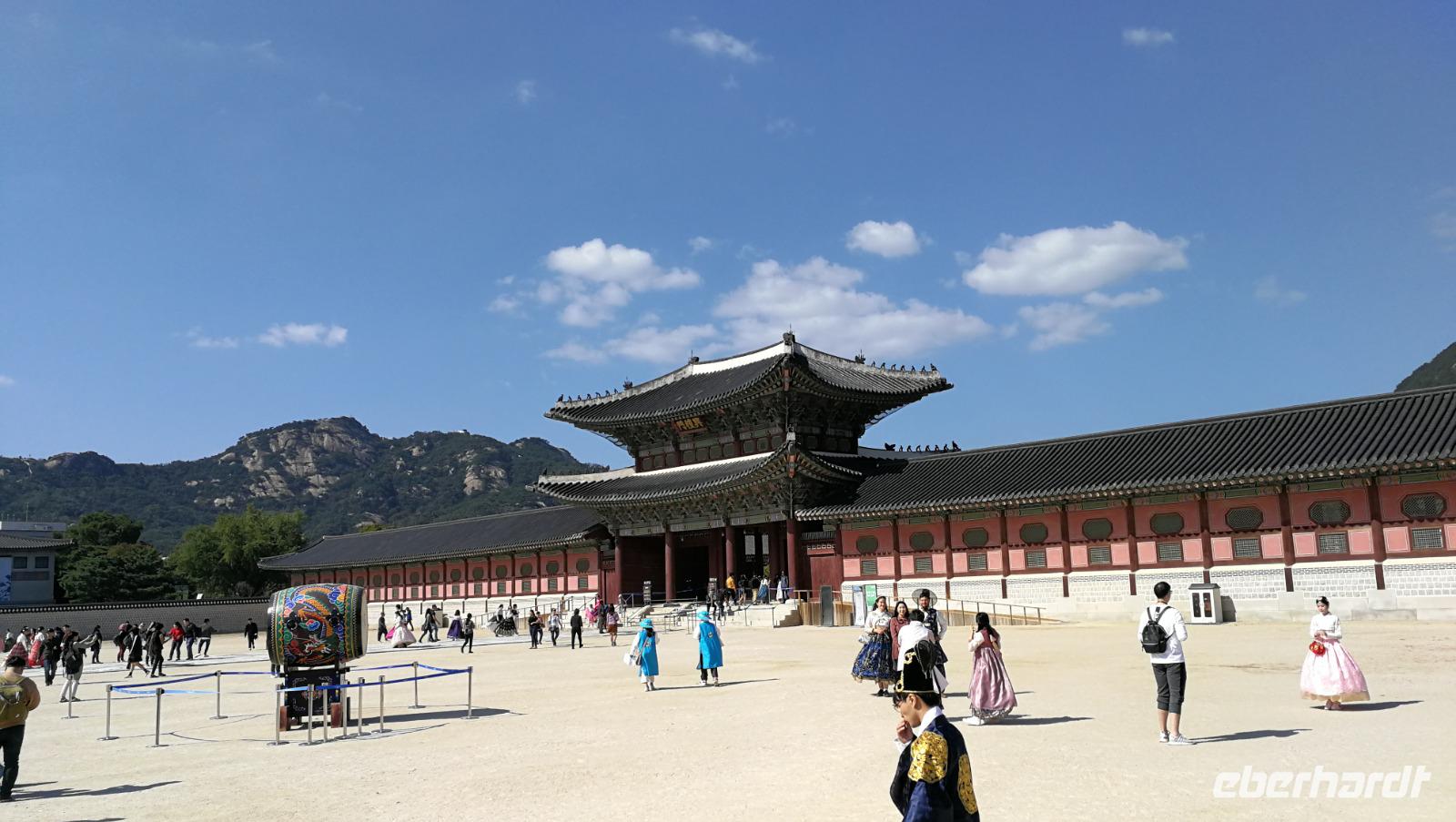 Um vier Uhr in der Früh klingelt für uns heute der Wecker - wir packen unsere Koffer und machen uns auf zum Flughafen. Dort verabschieden wir uns von Synthia, die uns ihre Heimat Taiwan mit Leidenschaft und viel Engagement vorgestellt hat. Nach gut drei Stunden Flug erreichen wir Seoul, wo wir unsere Reiseleiterin Son-Ya (oder Sonja) begrüßen, die uns während unseres Aufenthaltes in Südkorea begleiten wird. Nach einer kurzen Begrüßung tauschen wir die restlichen Taiwan-Dollar in koreanische Won und brechen auf in die Innenstadt von Seoul, wo wir den Königspalast besichtigen. Auf der riesigen, gut erhaltenen Palastanlage befinden sich die Audienzhalle sowie die Wohngemächer der Königsfamilie. Im Wissenschafts-Trakt entstanden die heutige koreanische Schrift sowie viele wertvolle Erkenntnisse und Schriftstücke aus der Astronomie und den Naturwissenschaften. Korea war aufgrund der Lage immer auch abhängig von den chinesischen Kaiserreichen und übernahm viele kulturelle und gesellschaftliche Einflüsse aus dem Reich der Mitte wie zum Beispiel die geschwungenen Dächer sowie die Ausrichtung der Gebäude nach Feng Shui. Als wir über das Palastgelände gehen fallen uns die zahlreichen Besucher in traditioneller koreanischer Kleidung auf - diese kann man sich leihen, oder von zuhause mitnehmen und bekommt kostenlosen Eintritt in das Gelände wenn man diese trägt.