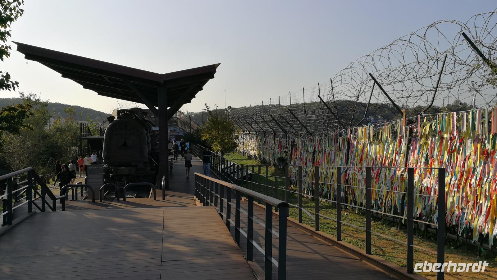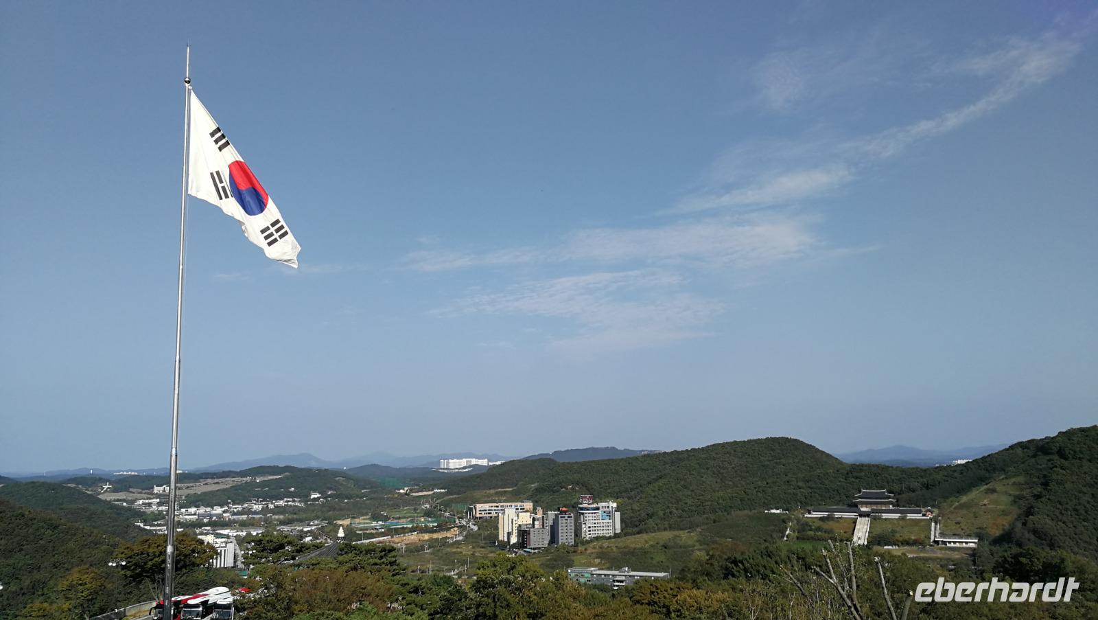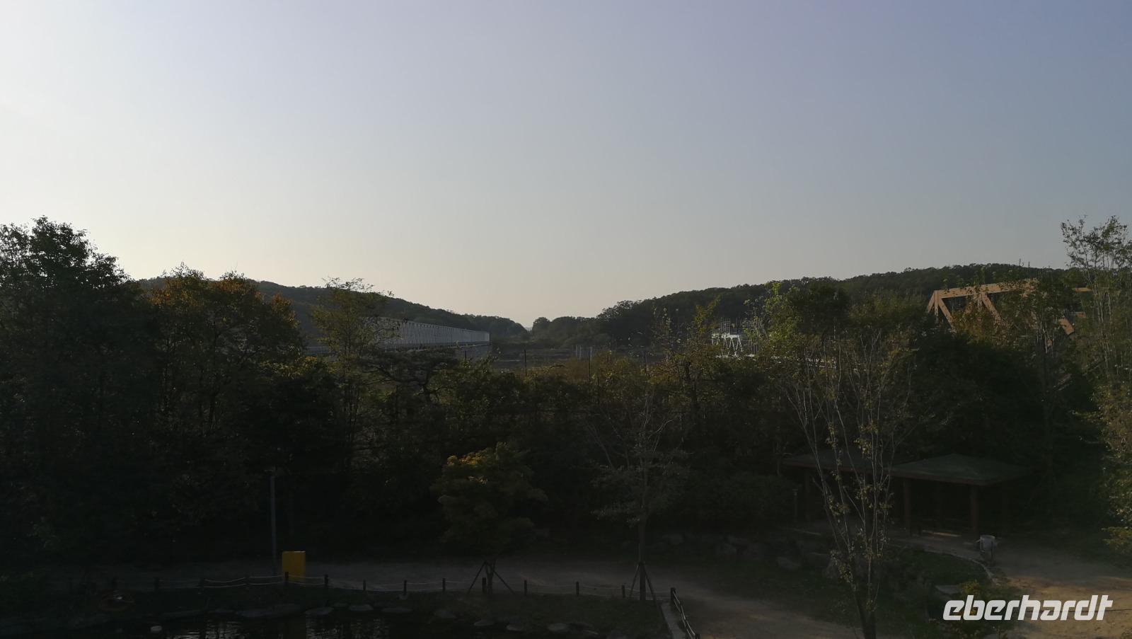 Während der Reise erreichte uns die Nachricht, dass die Demilitarisierte Zone zu Nordkorea unter Quarantäne steht - wegen eines Ausbruchs des afrikanischen Schweinefiebers können wir heute nicht wie geplant bis an die nordkoreanische Grenze fahren, sondern müssen das Programm etwas anpassen. Also machen wir uns auf zum Kriegsmuseum in Seoul, wo Ausstellungsstücke aus dem Koreakrieg die Brutalität des Konflikts aufzeigen und uns auch den Besuch der Grenzregion später am Abend vorbereiten. Zunächst fahren wir aber weiter zum N-Tower. Auf dem südlichen Berg in Seoul gelegen bietet dieser Aussichtsturm einen beeindruckenden Rundblick über Südkoreas Hauptstadt. Um den Turm herum befinden sich zahlreiche Cafés und Souvenirläden. Die Geländer sind gespickt mit Vorhängeschlössern, die von den Besuchern mit dem Wunsch nach Glück in der Liebe dort angebracht werden. Zum Mittagessen probieren wir Koreas berühmten Pfannkuchen aus Mung-Bohnen Teig. Die frittierten Röstis kommen super an und wir bestellen sogleich mehrere Geschmacksrichtungen ehe wir weiterziehen. Wir verlassen Seoul und erreichen nach kurzer Fahrt das Odusan Observatorium. Diese Aussichtsplattform liegt an der Grenze zu Nordkorea an der Mündung zweier Flüsse - des Grenzflusses Imjin sowie des Han-Flusses der durch Seoul fließt. Durch Fernrohre blicken wir über den Fluss auf den Nachbarstaat und können die Menschen dort bei der Feldarbeit oder beim alltäglichen Leben beobachten. Einige Kilometer weiter flussaufwärts befindet sich der Imjingak Friedenspark. Eine Gedenkstätte für aus dem Norden geflüchtete Koreaner, die hier ihrer zurückgelassenen Verwandten oder ihrer Kindheit in Nordkorea gedenken können. Wir besichtigen die Parkanlage und fühlen uns auf unheimliche aber faszinierende Weise an unsere eigene Geschichte erinnert.