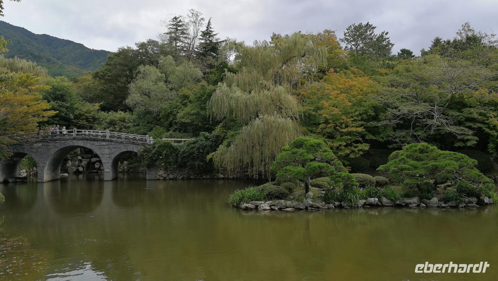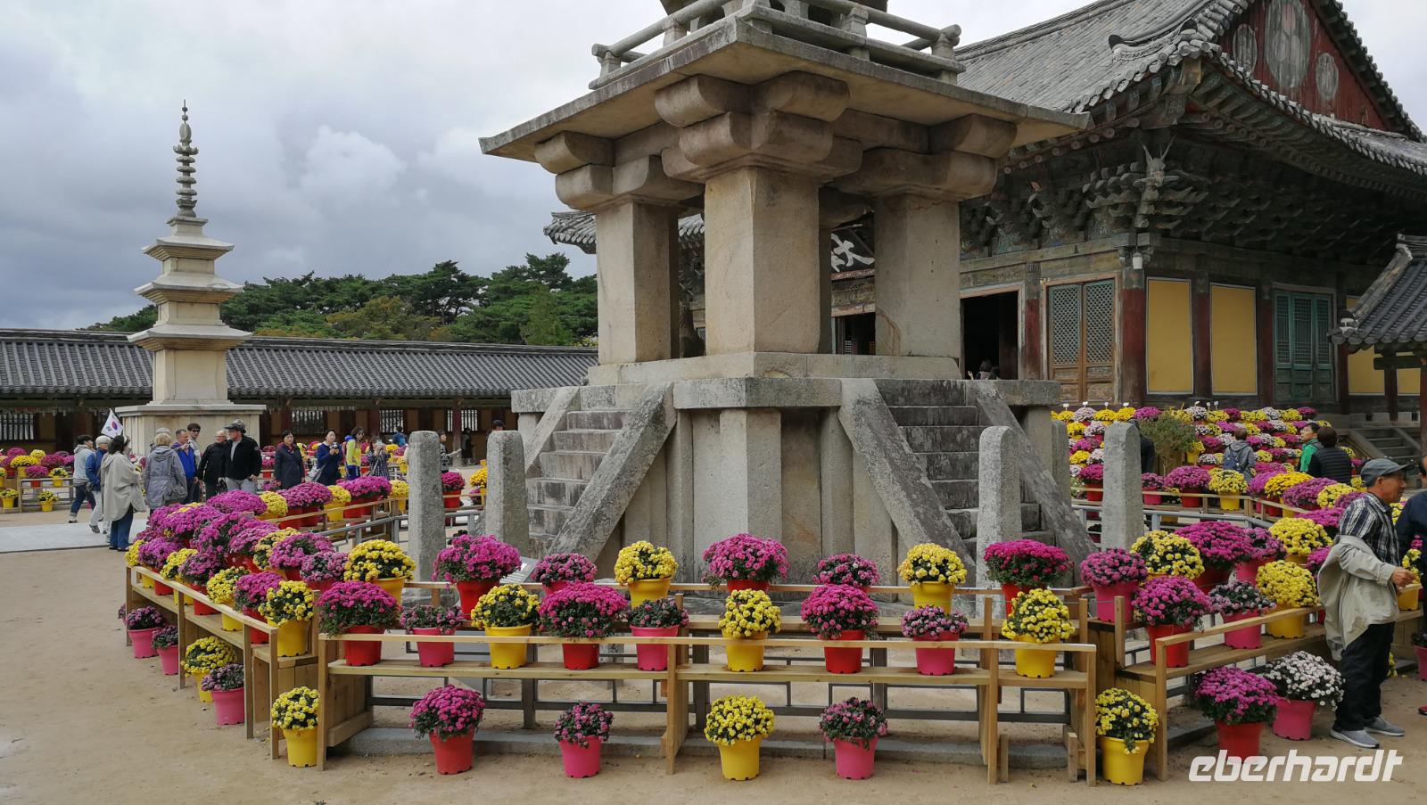 Am nächsten Morgen führt uns unsere Reise weiter nach Gyeongju, in die alte Hauptstadt des Silla Königreiches, welches nach langen Jahren der kriegerischen Auseinandersetzungen schlussendlich die koreanische Halbinsel im 7. Jahrhundert unter einem Banner vereinen konnte. Das Silla Reich war bekannt für seine Hingabe zum Buddhismus und so besuchen wir zunächst eines der buddhistischen Heiligtümer der Periode den Bulguksa Tempel. Der Tempel liegt außerhalb der Stadt in den umliegenden Bergen - die Nähe zur Natur ist ein wichtiger Bestandteil des Glaubens. Die Steinpagoden, reich verzierten Treppen sowie die vergoldeten Buddha Statuen machen diesen Ort zu einem der wichtigsten koreanischen Nationalschätze. Wir gehen über das Tempel-Gelände und hören Sonja zu wie Sie über die Anlage und die Geschichte des Buddhismus in der Region spricht. Vom Tempel aus ist es nicht weit zu einem weiteren Heiligtum der Seokguram Grotte. Der künstlich angelegte Schrein befindet sich wenige hundert Meter entfernt am Berg und beinhaltet eine weitere vergoldete Buddha Statue die wir andächtig besuchen. Die kunstvollen Anlagen und symmetrisch aufgebauten Gebäude versetzen uns in Staunen. Weiter geht es in die Innenstadt Gyeongjus zum alten Observatorium. Der unscheinbare Steinturm ist eines der letzten Zeugnisse für die koreanischen Bemühungen das Universum zu beobachten und die Sternenkunde voranzutreiben. Umgeben ist das Observatorium von Hügelgräbern und einem Feld von lila gefärbten Gräsern - ein tolles Fotomotiv für unsere Gruppe. Nach einer kleinen Mittagspause schlendern wir anschließend durch den Tumuli Park - eine Parkanlage die um die antiken Hügelgräber errichtet wurde. Die symmetrischen Hügel mit Gras überwachsen bieten einen einzigartigen Anblick und sind teilweise noch ungeöffnet und mit zahlreichen Reichtümern bestickt. Eines der geöffneten Gräber am Ende des Parks wurde zum Ausstellungsgebäude umgebaut und beherbergt Repliken der dort gefundenen Juwelen und Kunstschätze der alten Silla Herrscher. Materialien aus der ganzen bekannten Welt wurden hier zu wertvollem Schmuck verarbeitet und als Grabbeigabe für das Leben im Jenseits dargeboten. Unsere Gruppe fährt weiter zum Gelände des alten Palasts der Dynastie. Die Mauerreste geben die Grundstruktur des alten Palastes noch preis - nur drei Gebäude der alten Anlage sind bis heute erhalten und werden als Pavillon benutzt. Der Palast wird umgeben von einem künstlich angelegten Wasserbecken dem Anapji oder Wolji Teich. An dessen Ufer entlang windet sich ein schöner Pfad den wir entlang laufen um so einen malerischen Blick auf die Palastanlagen im Licht der untergehenden Sonne zu bekommen. Man bekommt einen kleinen Eindruck davon, wie hier die alten adeligen entlang schlenderten und sich in den Gartenanlagen vom Stress des Alltags erholt haben mussten. Nach diesem Erlebnis beziehen wir unser Hotel und genießen das heute amerikanische Abendessen vom reichen Buffet.