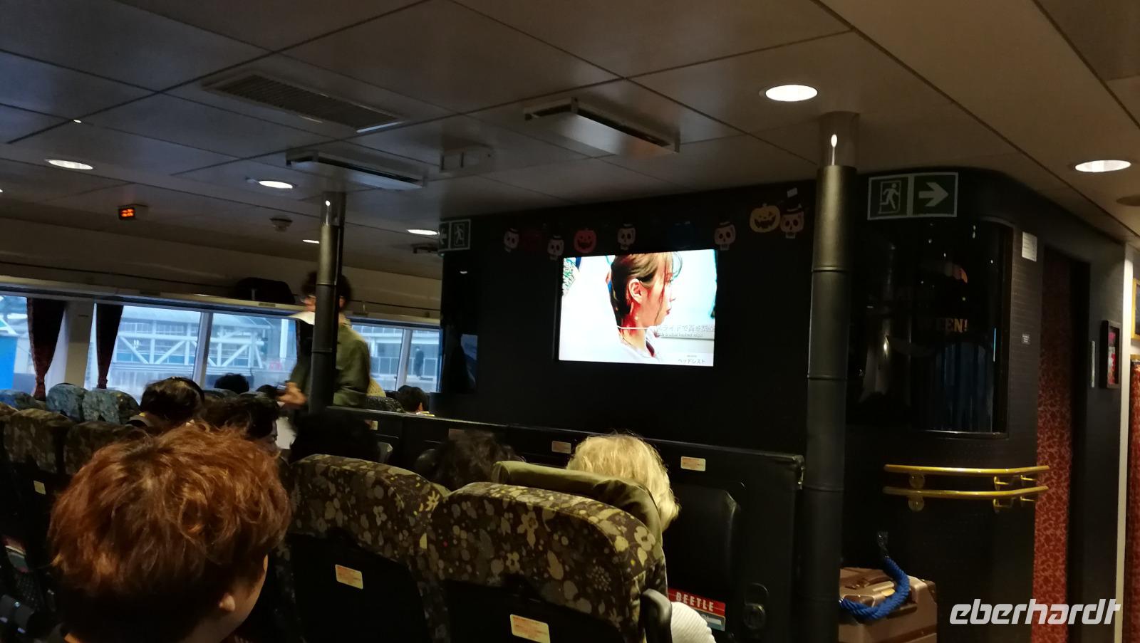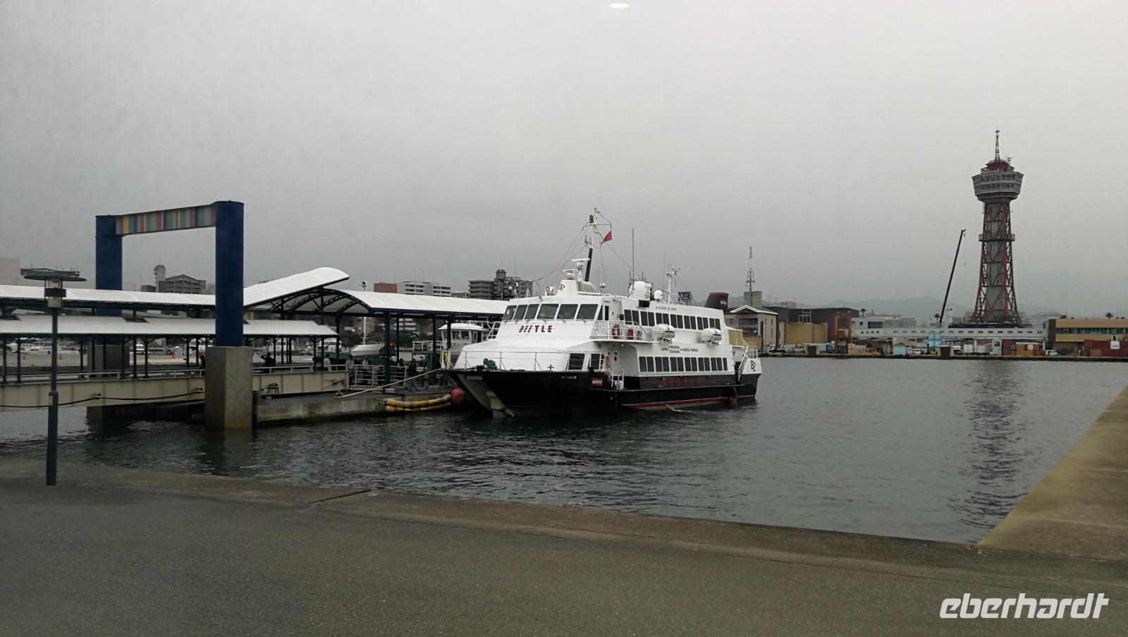 Erneut steht uns heute ein früher Aufbruch bevor - wir verabschieden uns von der koreanischen Halbinsel und setzen am Morgen mit der Fähre von Busan nach Japan über. Nach knapp 4 Stunden mit Zwischenstopp in Tsushima erreichen wir das regnerische und bewölkte Fukuoka auf der Japanischen Insel Kyushu. Im Hafengebäude empfängt uns unsere Reisebegleitung für die nächsten Tage in Japan: Angelika. Sie ist vor 30 Jahren nach Japan ausgewandert und seitdem mit Land und Leuten eng verbunden. Wir tauschen unsere restlichen koreanischen Geldscheine zu den japanischen Yen und geben unsere Koffer ab, die dann nach Hiroshima in unser Hotel gebracht werden. Unsere Gruppe macht sich dann auf zum Bahnhof von Fukuoka wo wir die restliche Zeit nutzen um die ersten Erfahrungen mit der japanischen Küche zu sammeln. Nudelsuppe und Gebratenes Fleisch sind hier ebenso beliebt wie Sushi und Fischgerichte. Nachdem wir uns gestärkt haben erleben wir gleich ein weiteres Highlight der Reise: die erste von einigen Fahrten mit dem berühmten japanischen Schnellzug dem Shinkansen. Die Züge sind ein exzellentes Beispiel für Pünktlichkeit und Effizienz und so sind wir nicht erstaunt, dass unser Zug der uns nach Hiroshima bringen sollte auf die Sekunde genau im Bahnhof einfährt. Wir nehmen unsere Plätze ein und erreichen nach knapp eineinhalb Stunden Hiroshima. Im Hotel angekommen entdecken wir bereits sofort unsere Koffer und beziehen die Zimmer. Das Hotel liegt direkt am Friedenspark sodass vor dem Abendessen noch Gelegenheit bestand bei einem kleinen Spaziergang die berühmte Kuppel des Friedensdoms anzuschauen - die berühmte Kuppel der Industrie und Handelskammer Hiroshimas die nach dem Atombombenabwurf 1945 als Mahnmal für Frieden in der Welt im zerstörten Zustand erhalten blieb. Angelika führt uns dann durch die nächtlichen Straßen Hiroshimas zu einem Restaurant, wo wir japanisches Okonomiyaki probieren: auf einer Teigbasis werden Nudeln, Kohl, wahlweise Fisch oder Fleisch sowie Gemüse angebraten und mit Käse überbacken serviert. Zurück im Hotel erholen wir uns noch von der langen Fahrt heute und sind gespannt auf die Tage im dritten Land der Reise Japan.