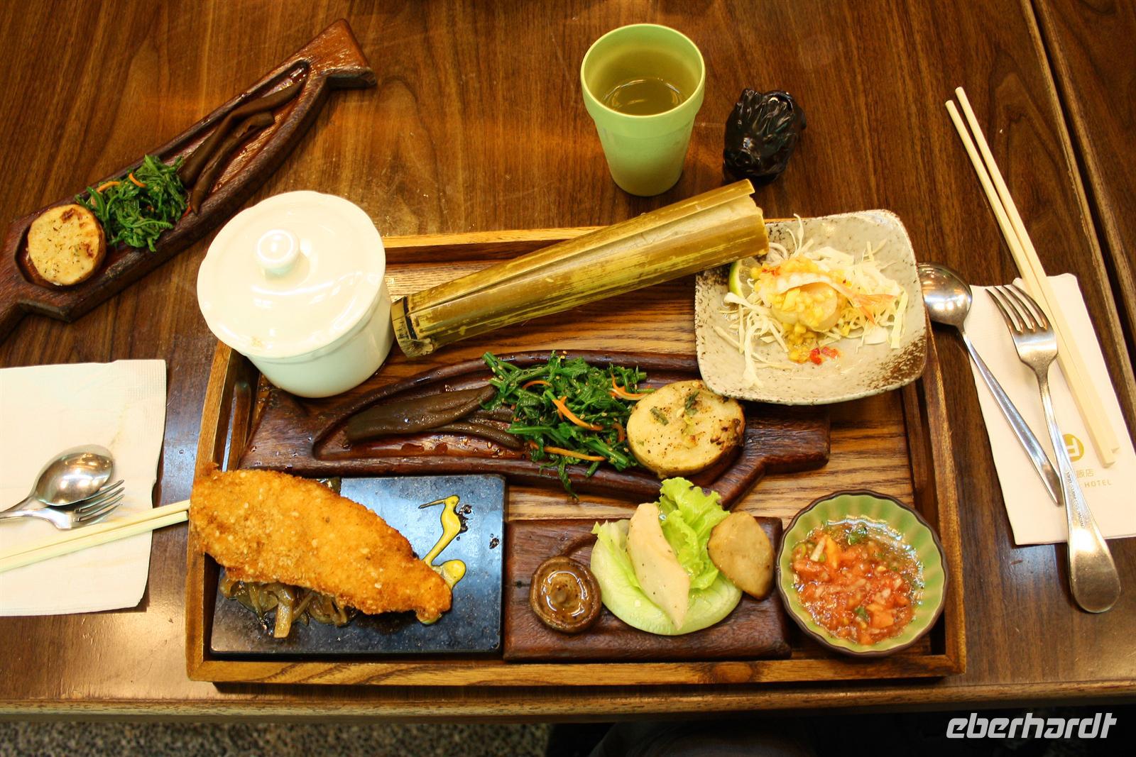 Der nächste Tag brachte uns mehr in die Natur. Mit dem Zug und zwei Umstiegen später (einer davon geplant) kamen wir in Taroko an. Ein großer Bus empfing uns - sehr kitschig, mit Spitzen-Kopfdeckchen und Rüschen-Gardinen an den Fenstern - fanden wir alle lustig. Nach einer Fahrt über etliche Serpentinen gab es 12.30 Uhr Mittagessen bei den Ureinwohnern Taiwans im Restaurant Malusu, sehr lecker und abwechslungsreich!!!