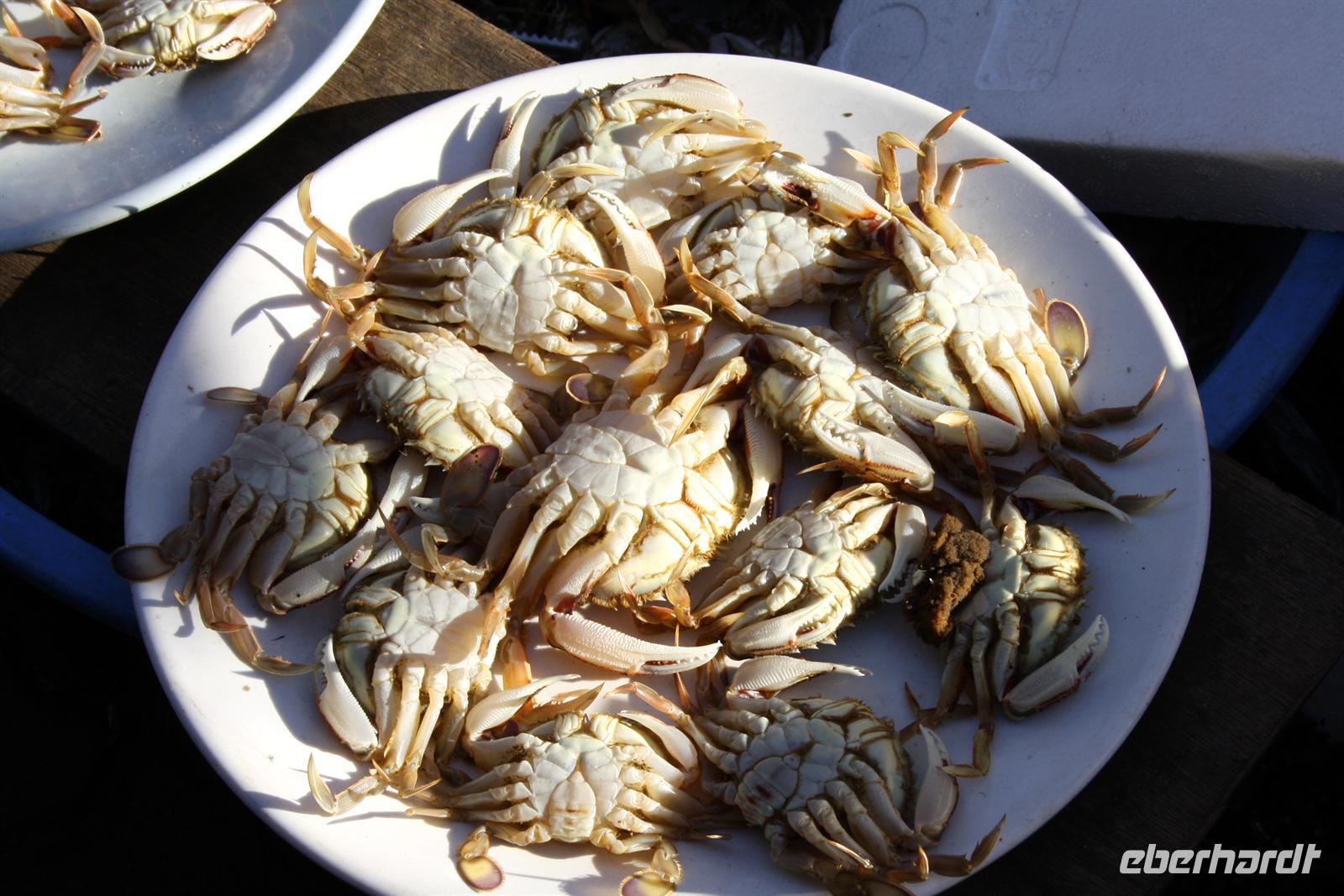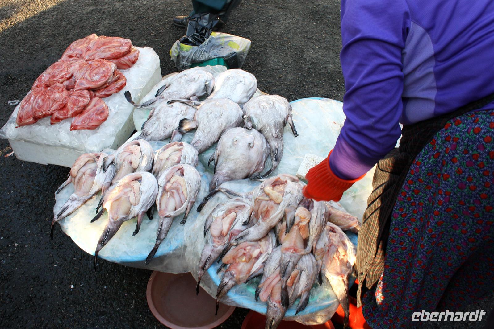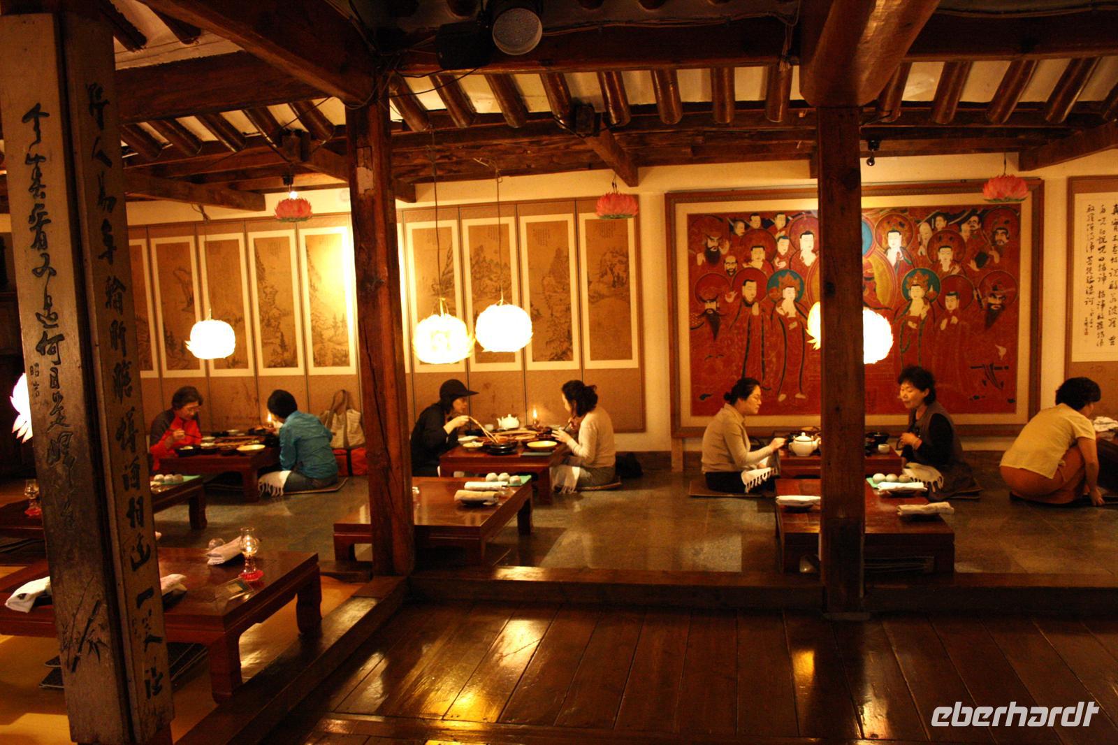 Wir trafen uns zum Abendessen, das fünf Minuten zu Fuß entfernt lag. Es gab ein ganzes Huhn für jeden!!, das in einem Kessel mit Reis und Suppe gereicht wurde. Wir probierten auch Ginseng und Maria bestellte noch Schnaps für alle.