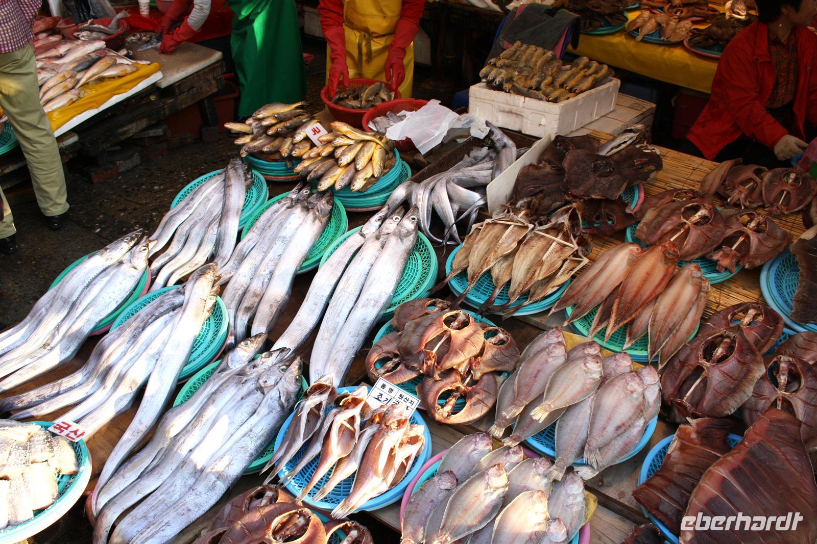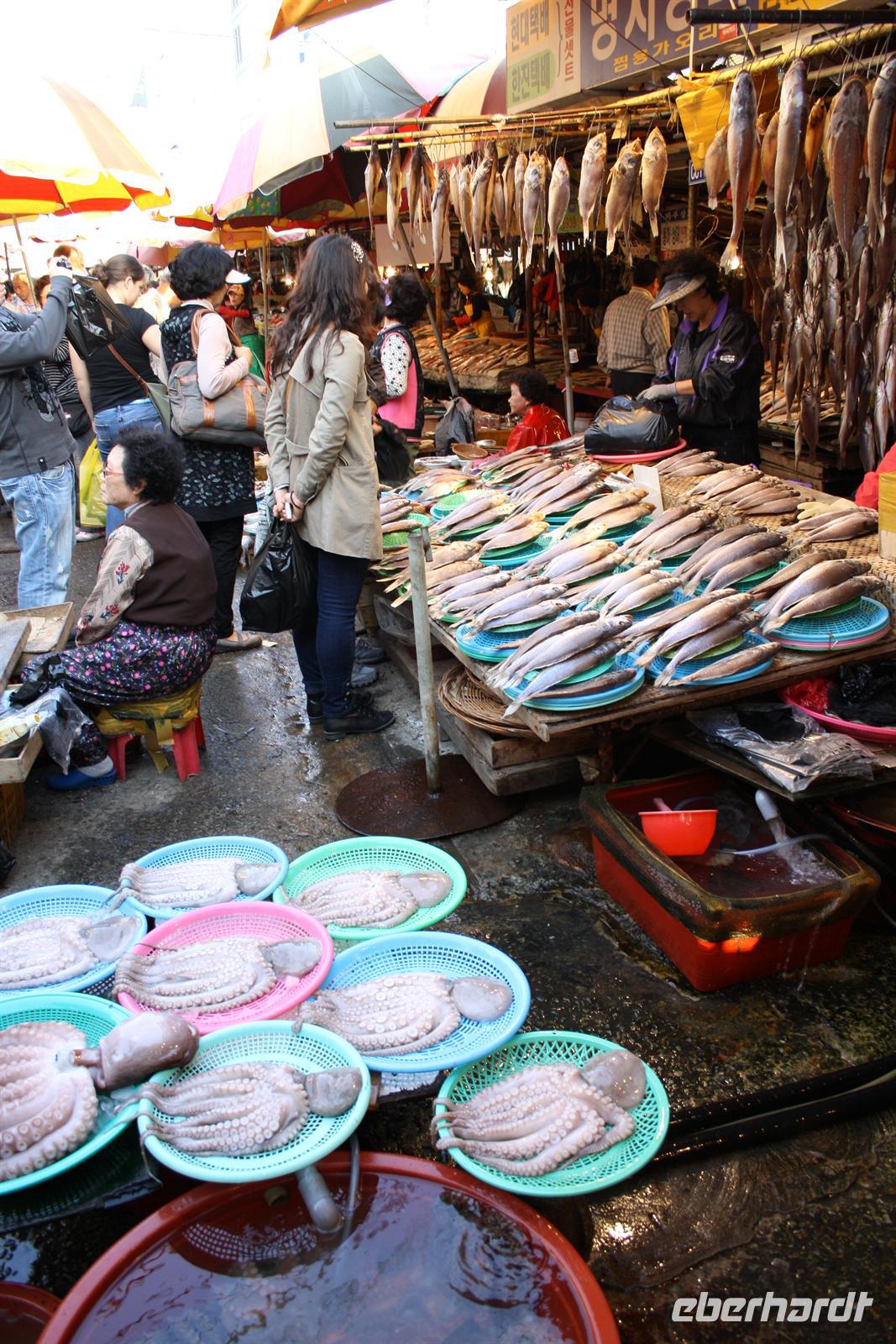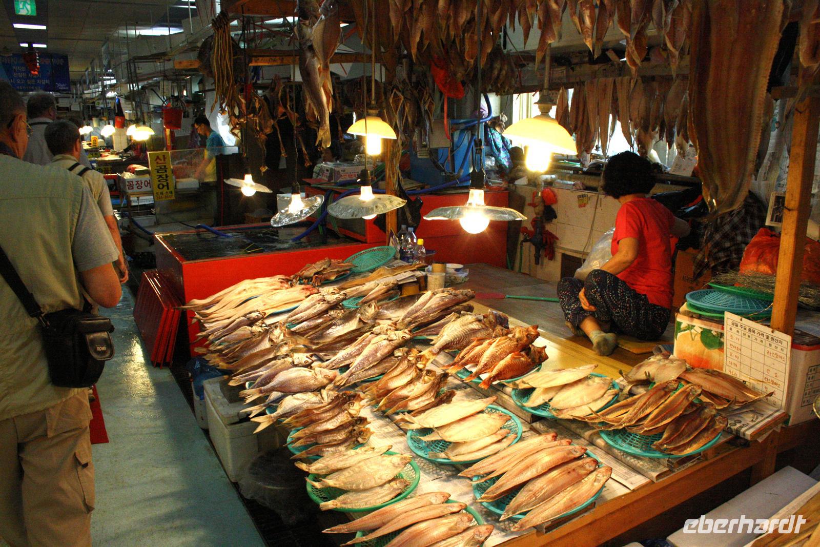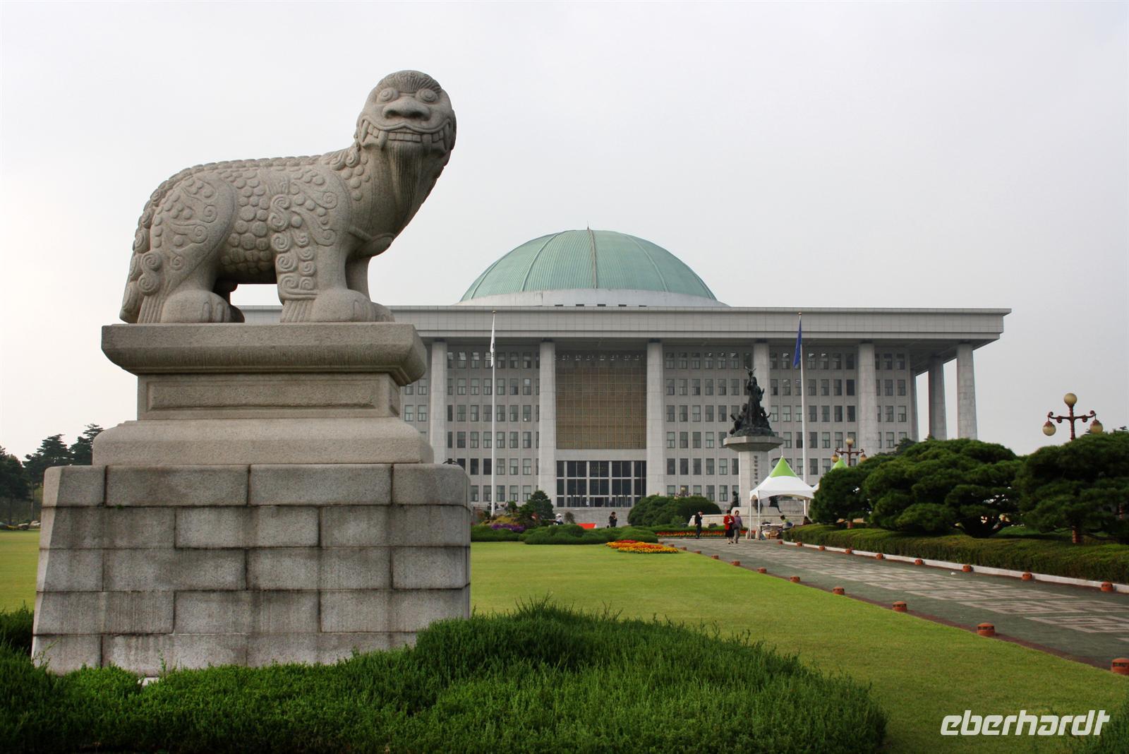 Am nächsten Morgen starteten wir zur Stadtrundfahrt in Seoul: Stopp am Fluss und am 12.23-Brunnen, Blue House, Gyeongbok-Palast mit Wachablösung (bunte Kostüme und Musik präsentierten sich uns) und das Nationale Volksmuseum standen auf unserem Programm. 13.00 Uhr aßen wir zu Mittag bei einem ehemaligen Mönch, im Restaurant „Korean Temple Cooking Sanchon“ in einer hinteren kleinen Gasse. Die Atmosphäre fanden alle toll, das Essen war uns dann aber doch ein wenig zu exotisch. Die Südkoreaner sind berühmt für ihre vegetarische Küche, essen sehr gern Seetang und Kimchi. Wir besuchten anschließend den Namdaemun-Markt und das Parlament sowie die Myeongdong-Kathedrale.