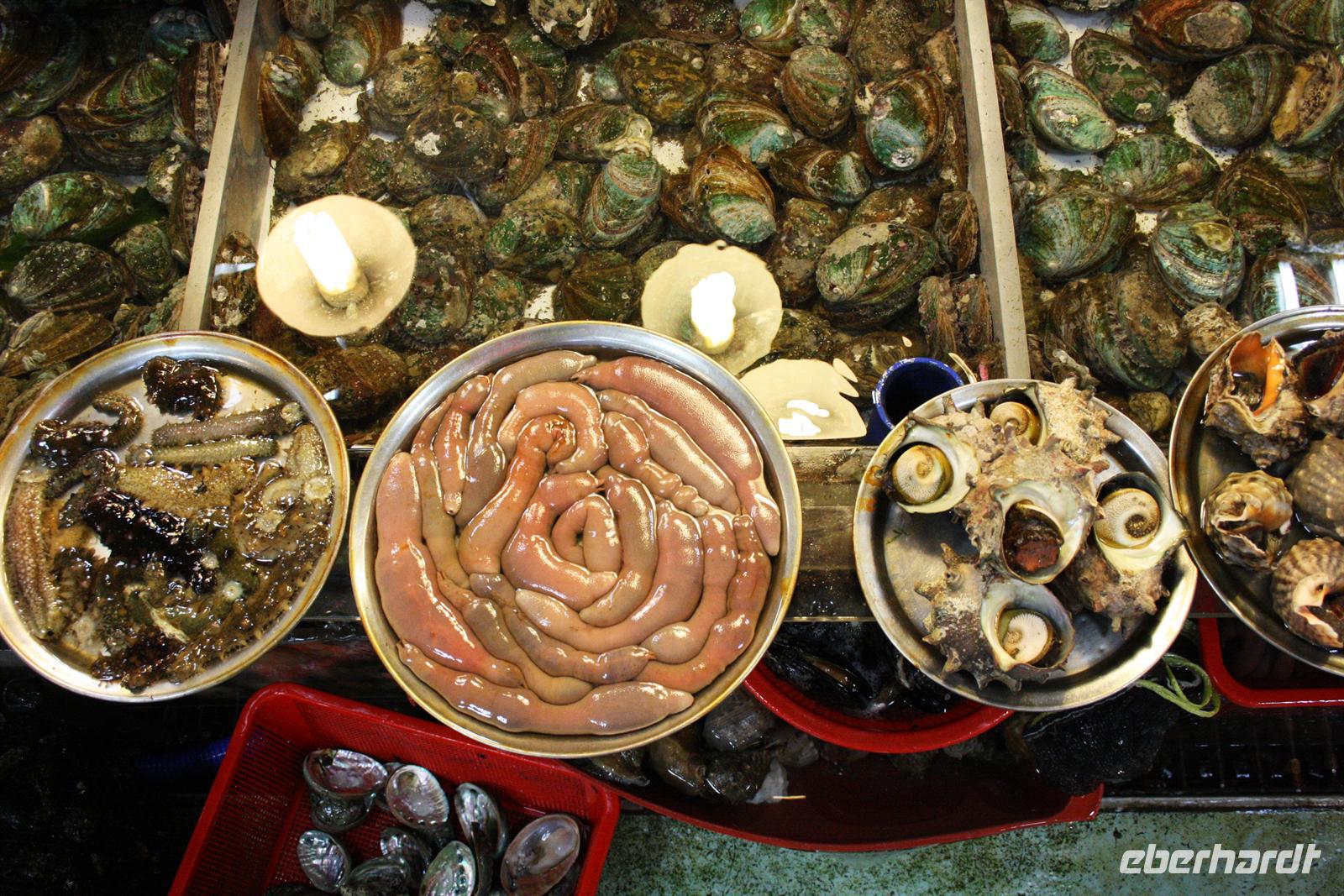 Danach fuhren wir aufgeregt zum Taipei 101, in der 89. Etage genossen wir die teils neblige, aber dennoch schöne Aussicht. In der 88. Etage gab es noch ein kleines Korallenmuseum und Souvenirs. Auch die unteren Etagen des zweithöchsten Gebäudes der Welt waren sehenswert, eine große Shoppingmall ist dort zu finden. Anschließend ging es zum Nachtmarkt, ein Bummel über den Obst- und Gemüsemarkt brachte uns Wissenswertes zu sehr exotischen Früchten, wir probierten Zuckerapfel, auch Süßsack oder Annone genannt. In einem kleinen Lokal aßen wir kleine Probierhäppchen Dim Sum, schmeckte gar nicht schlecht!