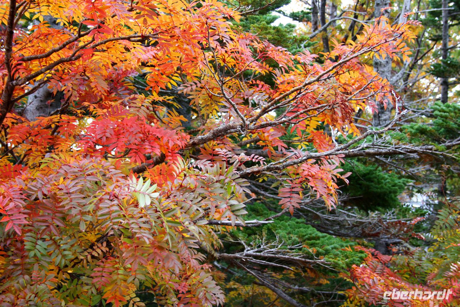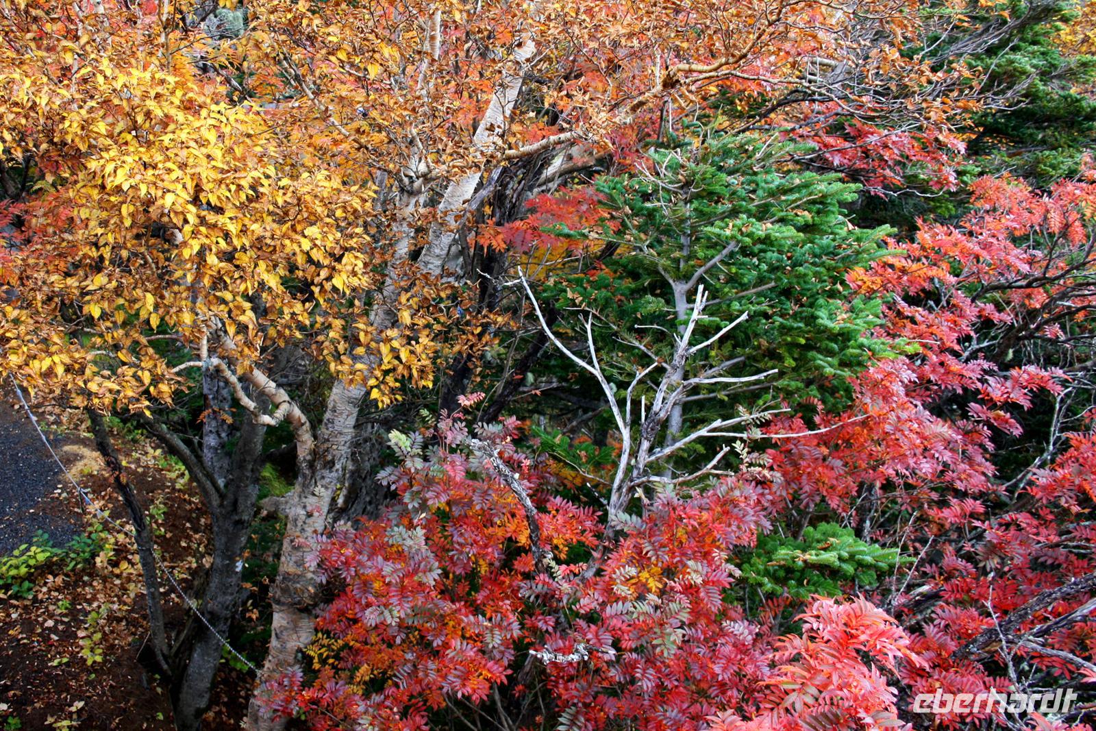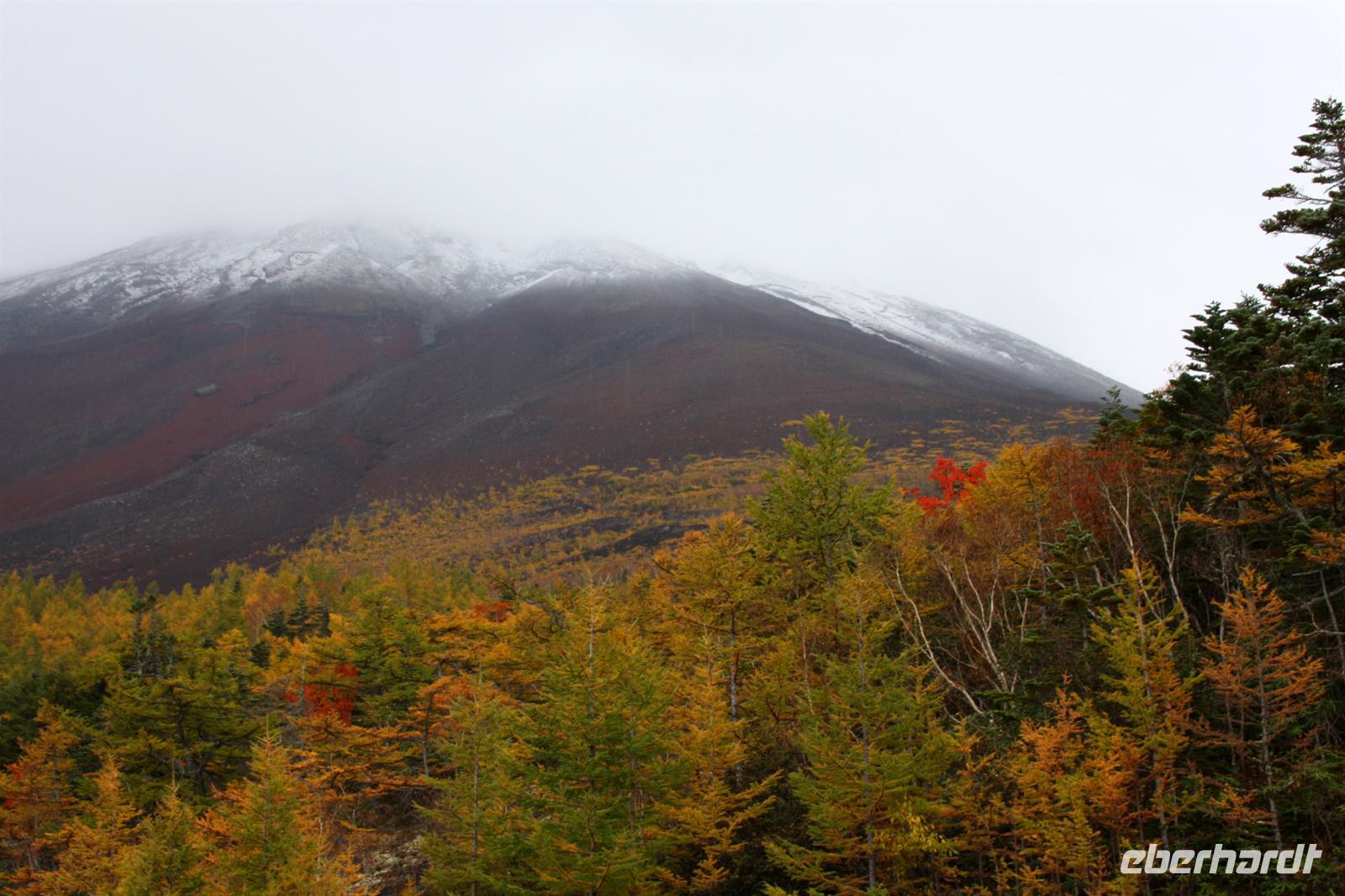 Morgens ging es nun ab auf den Fujisan oder auch Fujijama genannt, nach einem kurzen Stopp an der 4. Station (weil der Nebel immer mal kurz weggezogen war und man ein Stück des Berges sehen konnte und wir nichts verpassen wollten!) fuhren wir weiter zur 5. und letzten Station. Es waren nur 5 °C und es nieselte, aber das störte niemanden, denn die Wolken und der Nebel zogen immer mehr weg. Wir sahen zwar die Spitze nicht ganz, aber immerhin haben wir einen guten Eindruck von dem heiligen Berg bekommen! Schöne Fotomotive ergaben sich auch mit den bunten Herbstbäumen - Indian Summer in Japan!