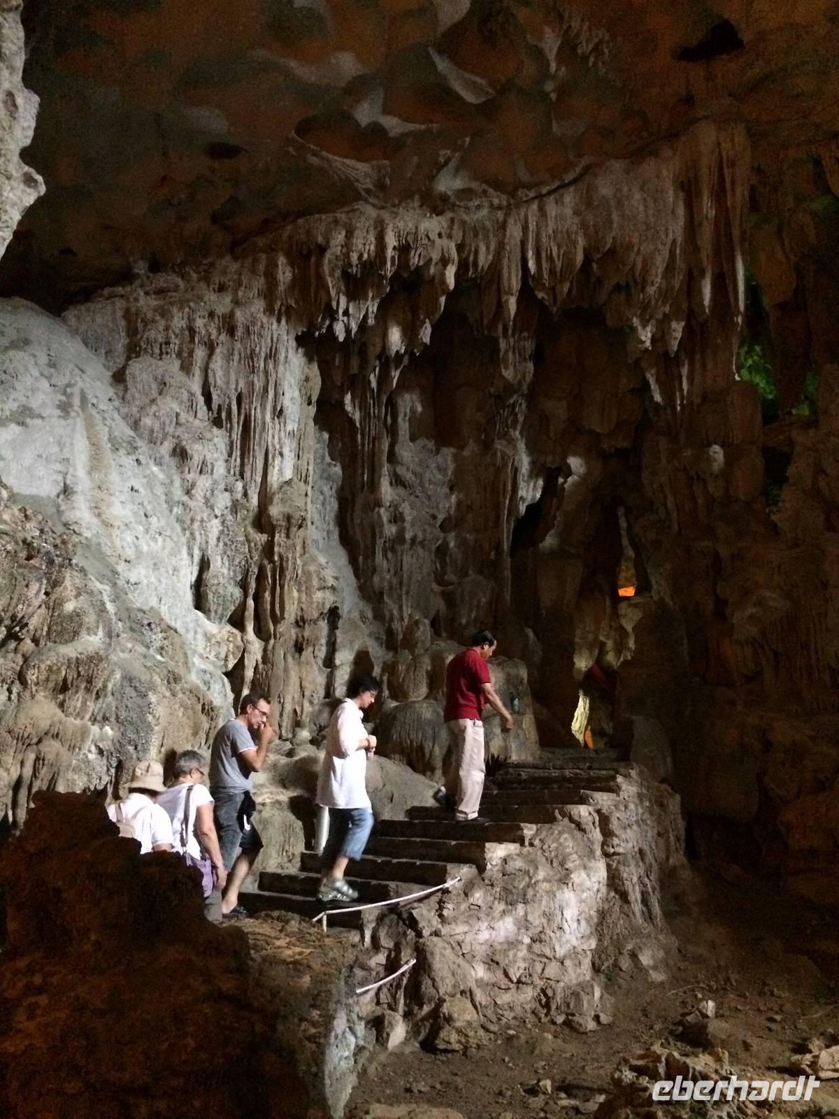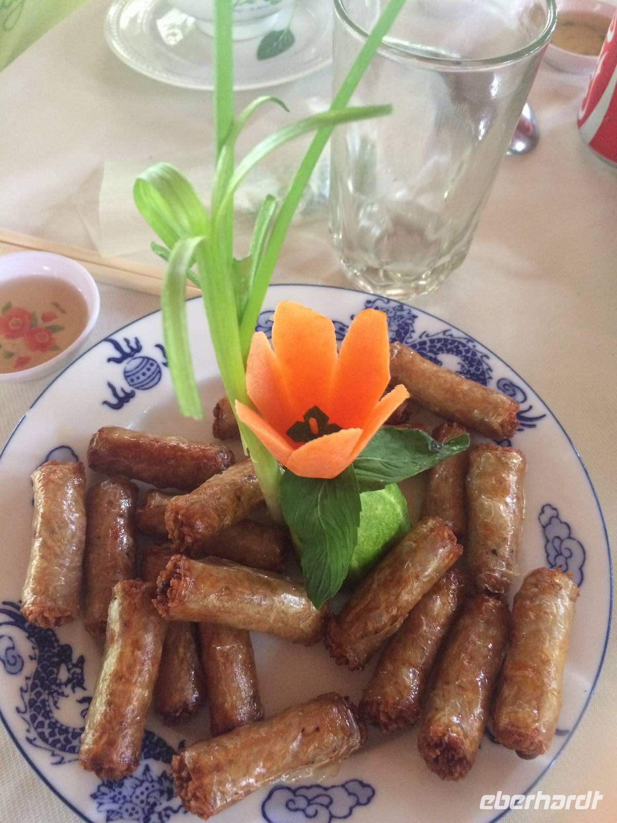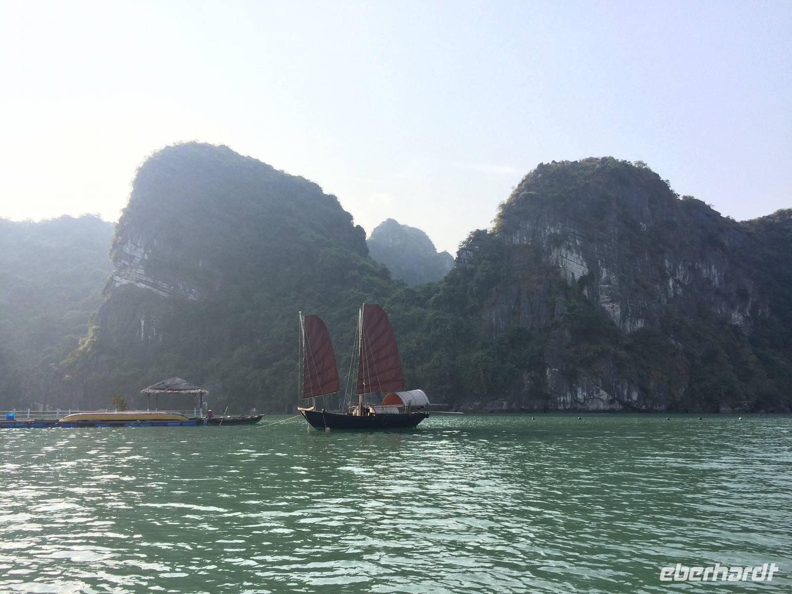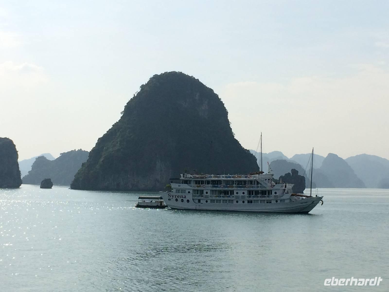 Nach dem Frühstück heißt es Standortwechsel; Koffer identifizieren und verladen. Ca. 180 Kilometer trennen uns von unserem Tagesziel Ha Long, die bizarre Welt aus 1969 emporragenden Karstfelsen. Wir gewöhnen uns schnell an den Umstand, dass es auf den vietnamesischen Straßen nicht so schnell vorwärts geht wie in Europa, hier und da gibt es ein paar Schlaglöcher. Dennoch wird die Fahrt nicht langweilig. Wir beobachten den regen Verkehr, viele Szenerien, die uns das tägliche Leben auf eigene Art und Weise näher bringen. Gegen Mittag erreichen wir den Hafen von Tuan Chau und setzen einheitlich in gelben Schwimmwesten gekleidet mit einem Tender zu unserer eigenen Dschunke Syrena über. Jetzt kann unsere Kreuzfahrt auf der atemberaubenden Landschaft beginnen. Schon bei einem leckeren Mittagsbuffet im Panoramarestaurant sind wir alle beeindruckt von der romantischen Wasserlandschaft, zahlreiche Felsen mit unterschiedlichen Formen wie Riesen, Papagei und Schildkröten ragen aus dem Wasser hervor.In der Gegend der Halong-Bucht gab es anfangs nur drei Metallschiffe vom Staat. Inzwischen fahren bereits ca. 400 Schiffe, fast alle werden privat finanziert. Von 1965 bis 1973 Kriegsschauplatz, ist sie heute Touristenmagnet Nummer Eins und gehört seit dem 11.11.2011 zu einem der neuen Sieben Naturweltwunder. Unser Schiff gleitet sanft über das Wasser, langsam schaut auch die Sonne wieder hinter den Wolken hervor. Am Nachmittag bietet sich die Möglichkeit, die große Tropfsteinhöhle Sung Sot (zu Deutsch Überraschungshöhle) zu besuchen. Sie ist wahrscheinlich ein Wunderwerk von Skulpturen in Form von Tropfsteingebilden und Auswaschungen, welches die Natur über Zeiträume von Jahrhunderten erschaffen hat. Auf der halbmondförmigen Titow-Insel legen wir einen Badestopp ein. Der Sandstrand war einer der Lieblingsorte von Onkel Ho. Er traf sich dort 1962 mit dem sowjetischen Kosmonauten German Titow; seitdem trägt die Insel dessen Namen. Wer an dieser prominenten Stelle kein Bad nehmen möchte, überwinden ca. 450 Stufen aufwärts zum Aussichtspunkt. Die Anstrengung wird mit einem sagenhaften 360-Grad-Panoramablick über die Halong-Bucht belohnt. Die hochaufragenden Karstinseln sowie die drachenförmigen Segeln der Dschunken bilden eine fantastische Kulisse in der Abendsonne.Zurück an Bord werden wir in die Grundlagen der vietnamesischen Kochkunst eingeführt. Alle dürfen dabei mitmachen und Frühlingsrollen rollen. Daumen hoch! Unsere Crew richtet zwischenzeitlich ein delikates Abendessen mit tollen Meeresfrüchten her. Den Abend lassen wir gemütlich mit einem Cocktail und Reisschnaps auf dem Sonnendeck ausklingen.