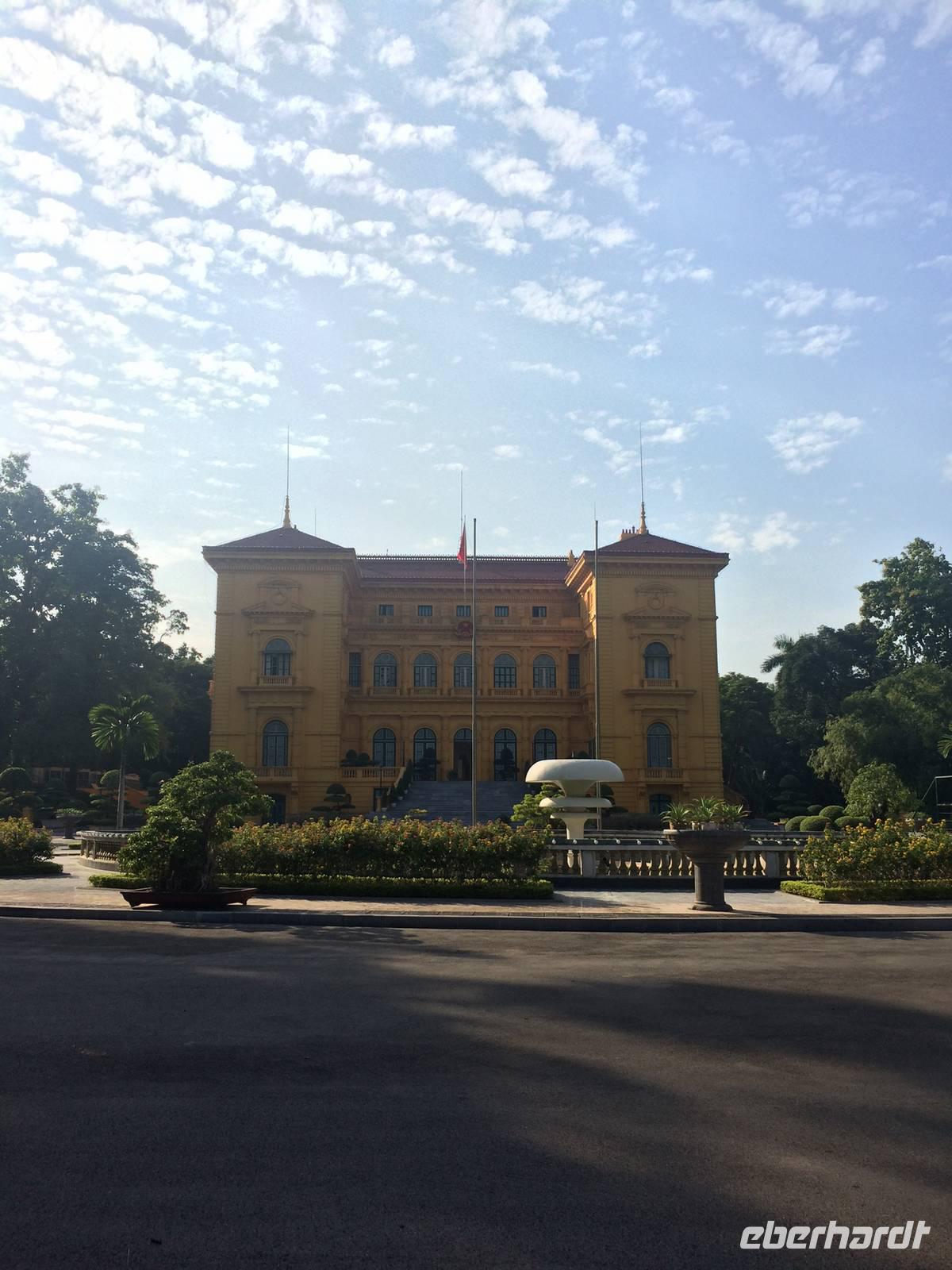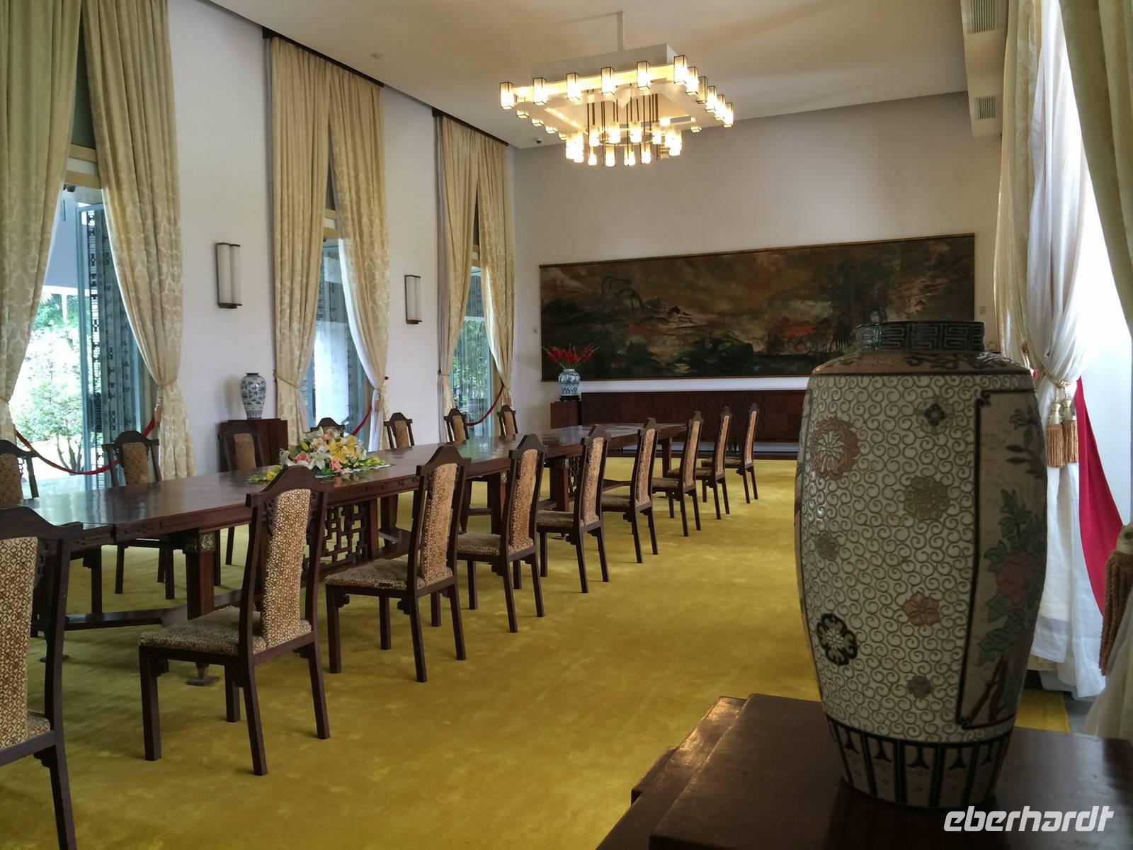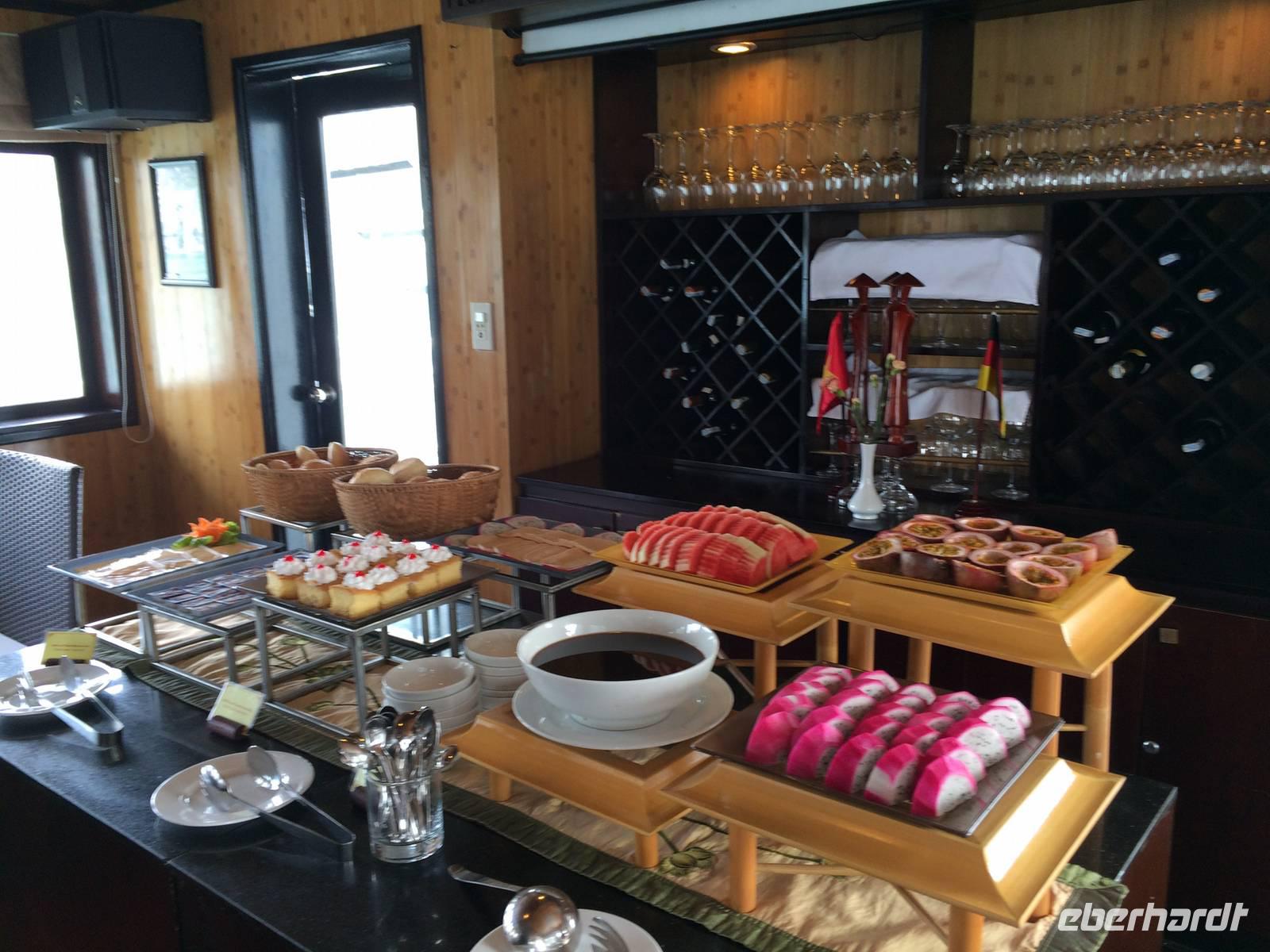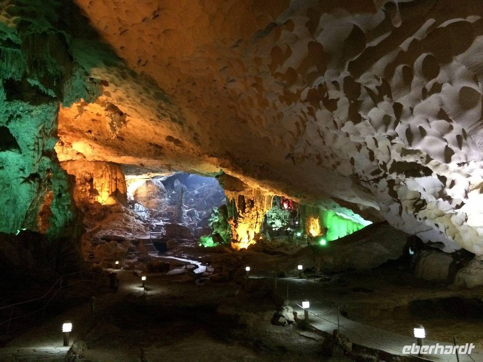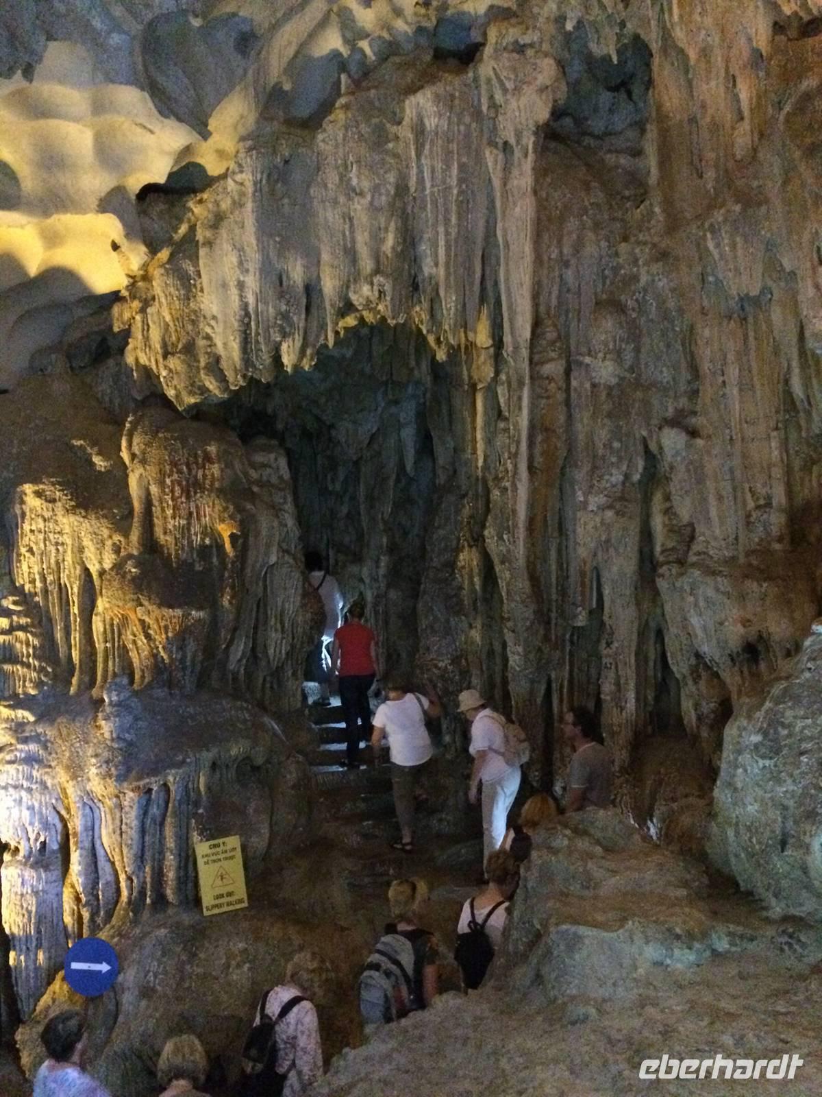 Nach dem Frühstück heißt es Standortwechsel; Koffer identifizieren und verladen. Ca. 180 Kilometer trennen uns von unserem Tagesziel Ha Long, die bizarre Welt aus 1969 emporragenden Karstfelsen. Wir gewöhnen uns schnell an den Umstand, dass es auf den vietnamesischen Straßen nicht so schnell vorwärts geht wie in Europa, hier und da gibt es ein paar Schlaglöcher. Dennoch wird die Fahrt nicht langweilig. Wir beobachten den regen Verkehr, viele Szenerien, die uns das tägliche Leben auf eigene Art und Weise näher bringen. Gegen Mittag erreichen wir den Hafen von Tuan Chau und setzen einheitlich in gelben Schwimmwesten gekleidet mit einem Tender zu unserer eigenen Dschunke Syrena über. Jetzt kann unsere Kreuzfahrt auf der atemberaubenden Landschaft beginnen. Schon bei einem leckeren Mittagsbuffet im Panoramarestaurant sind wir alle beeindruckt von der romantischen Wasserlandschaft, zahlreiche Felsen mit unterschiedlichen Formen wie Riesen, Papagei und Schildkröten ragen aus dem Wasser hervor.In der Gegend der Halong-Bucht gab es anfangs nur drei Metallschiffe vom Staat. Inzwischen fahren bereits ca. 400 Schiffe, fast alle werden privat finanziert. Von 1965 bis 1973 Kriegsschauplatz, ist sie heute Touristenmagnet Nummer Eins und gehört seit dem 11.11.2011 zu einem der neuen Sieben Naturweltwunder. Unser Schiff gleitet sanft über das Wasser, langsam schaut auch die Sonne wieder hinter den Wolken hervor. Am Nachmittag bietet sich die Möglichkeit, die große Tropfsteinhöhle Sung Sot (zu Deutsch Überraschungshöhle) zu besuchen. Sie ist wahrscheinlich ein Wunderwerk von Skulpturen in Form von Tropfsteingebilden und Auswaschungen, welches die Natur über Zeiträume von Jahrhunderten erschaffen hat. Auf der halbmondförmigen Titow-Insel legen wir einen Badestopp ein. Der Sandstrand war einer der Lieblingsorte von Onkel Ho. Er traf sich dort 1962 mit dem sowjetischen Kosmonauten German Titow; seitdem trägt die Insel dessen Namen. Wer an dieser prominenten Stelle kein Bad nehmen möchte, überwinden ca. 450 Stufen aufwärts zum Aussichtspunkt. Die Anstrengung wird mit einem sagenhaften 360-Grad-Panoramablick über die Halong-Bucht belohnt. Die hochaufragenden Karstinseln sowie die drachenförmigen Segeln der Dschunken bilden eine fantastische Kulisse in der Abendsonne.Zurück an Bord werden wir in die Grundlagen der vietnamesischen Kochkunst eingeführt. Alle dürfen dabei mitmachen und Frühlingsrollen rollen. Daumen hoch! Unsere Crew richtet zwischenzeitlich ein delikates Abendessen mit tollen Meeresfrüchten her. Den Abend lassen wir gemütlich mit einem Cocktail und Reisschnaps auf dem Sonnendeck ausklingen.