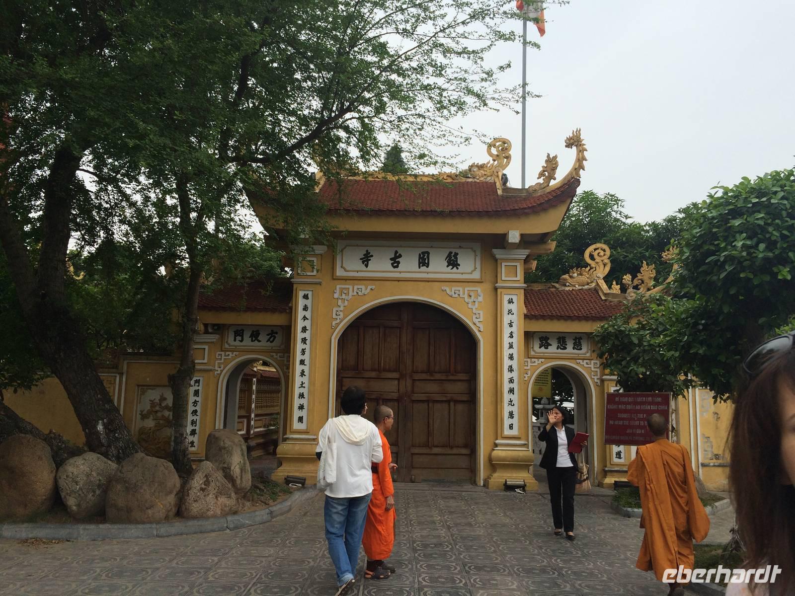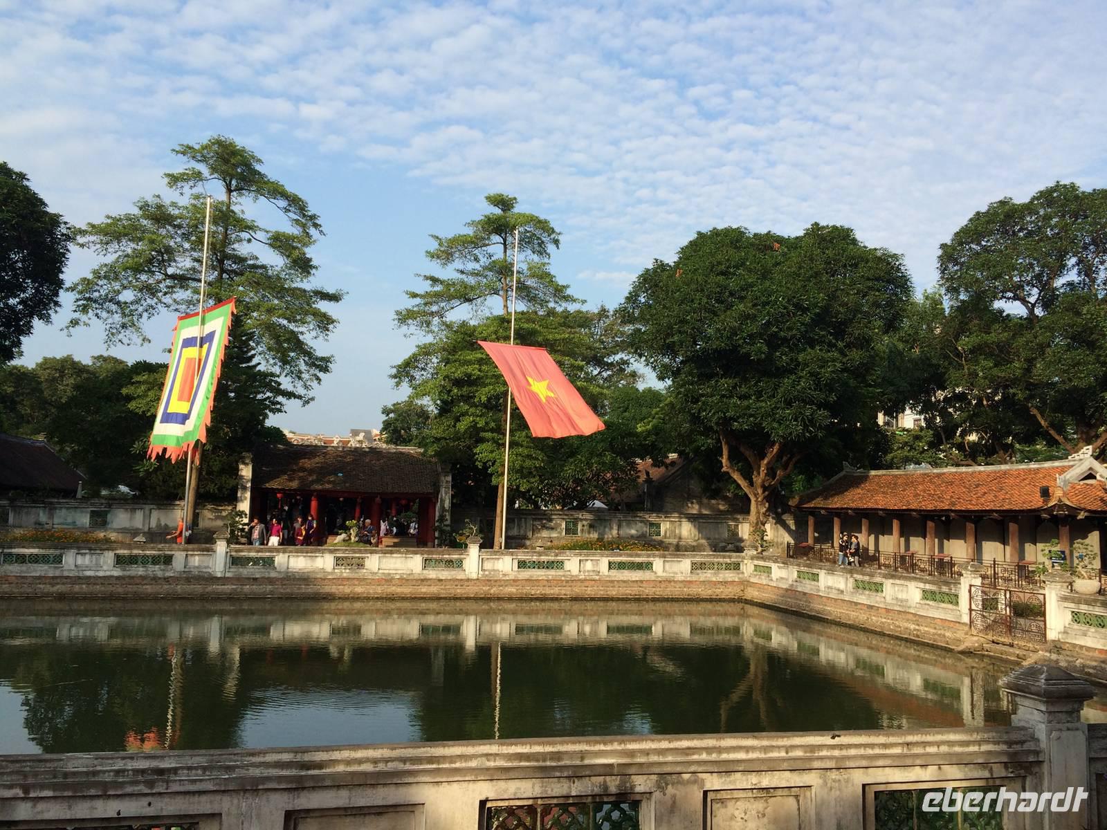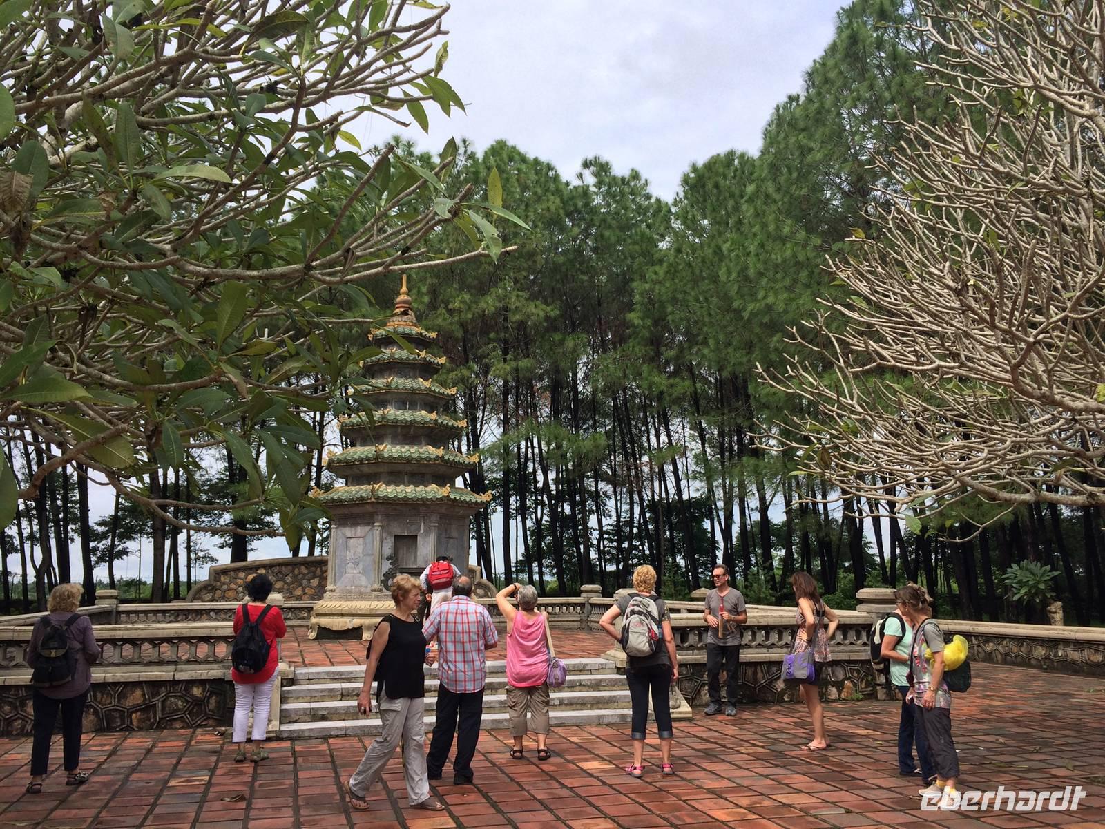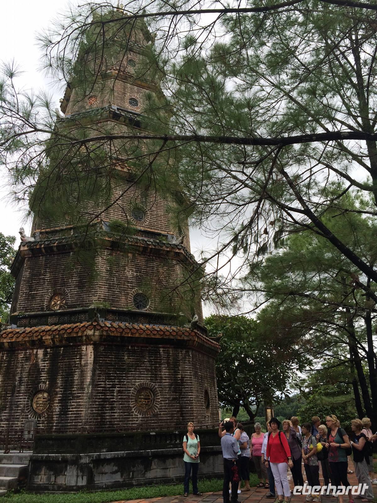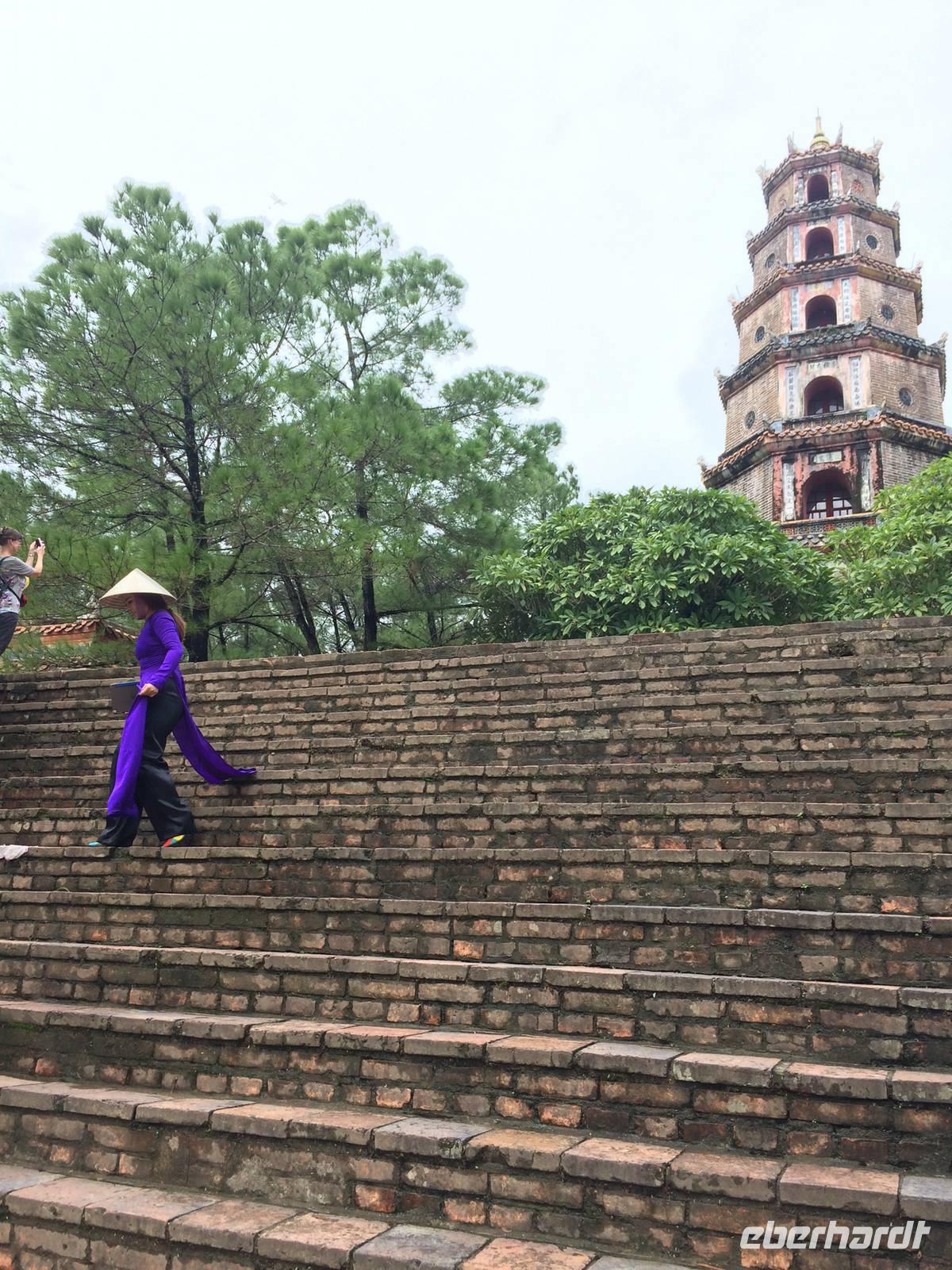 Am Heutigen Tag steht das Ethnologische Museum auf dem Programm. Das Museum gibt uns einen Einblick in die 54 verschiedenen ethnischen Gruppen, welche sich in Vietnam angesiedelt haben. Die Mehrheit mit 86 % der Gesamtbevölkerung machen die Kinh Viet aus. Das sind alle, die in den Städten wohnen. Kleinere Gruppen wurden über die Jahrhunderte in die Bergregionen verdrängt. Sie leben heute weiterhin vom Jagen, Reisanbau und ihren Handarbeiten wie das Weben etc. Auf dem Gelände um das Museum herum befinden sich traditionelle Häuser der ethnischen Minderheiten, wie beispielsweise Rong-Haus der Volksgruppen im Hochland Tay Nguyen, das Tonhaus der ethnischen Minderheit Ha Nhi oder das Hochhaus der Bhanar-Minderheiten, auf dessen Treppen wir ein lustiges Gruppenfoto von uns schießen lassen.Weiter erreichen wir den Tempel der Literatur. Er war das konfuzianische Hauptheiligtum und die erste Universität von Vietnam. Vor fast 1000 Jahren (1070) ließ Kaiser Ly Thanh Tong diese Van Mieu-Pagode erbauen. In der Ly-Dynastie begann die konfuzianische Glaubenslehre den Buddhismus zu verdrängen und Van Mieu entwickelte sich zum intellektuellen sowie spirituellen Zentrum des Königreiches. Im Stehlenhof finden wir die 82 verbliebenen Steinstehlen, getragen auf den Panzern von steinernen Riesenschildkröten. Schildkröten symbolisieren ein langes Leben. Auf den Steintafeln sind die Examina, die Namen der 1036 erfolgreichen Absolventen und deren Lebenslauf eingemeißelt. Es ist nicht verwunderlich, dass dieser Platz ein würdiger Ort ist, den man zu besonderen Anlässen aufsucht. Und so werden wir Zeugen eines farbenfrohen Ereignisses: Eine Gruppe von Absolventen feiern den Abschluss ihrer Abiturausbildung in der festlichen Kleidung Ao Dai (Zu Deutsch lange Bluse). Zur Anerkennung werden sie auch von uns x-Mal fotografiert.Nach der Mittagspause bei einer bürgerlichen Garküche gibt es Pho-Nudeln in allen Varianten: gebraten, gerollt, frittiert oder gedämpft. Der letzte Punkt in Hanoi ist das älteste Heiligtum von Hanoi. Die Tran Quoc-Pagode liegt auf einer kleinen Insel auf dem West-See, der größte See von über zwanzig Seen der Stadt. Es wird angenommen, dass die Pagode bereits im 6. Jahrhundert errichtet wurde. Am Eingang wird auf einer steinernen Platte festgehalten, dass sie im frühen 17. Jahrhundert vom Roten Fluss hierher verlegt wurde.Wir fliegen am Nachmittag mit einer leichten Verspätung nach Hue. Gerade im Hotel angekommen, bekommen wir den heftigen Tropenregen zu hören. Beim Abendessen auf der Dachterrasse, zum Glück überdacht, sehen wir die riesigen Wassermassen hinunterstürzen... Ja, herzlich Willkommen in Asien!