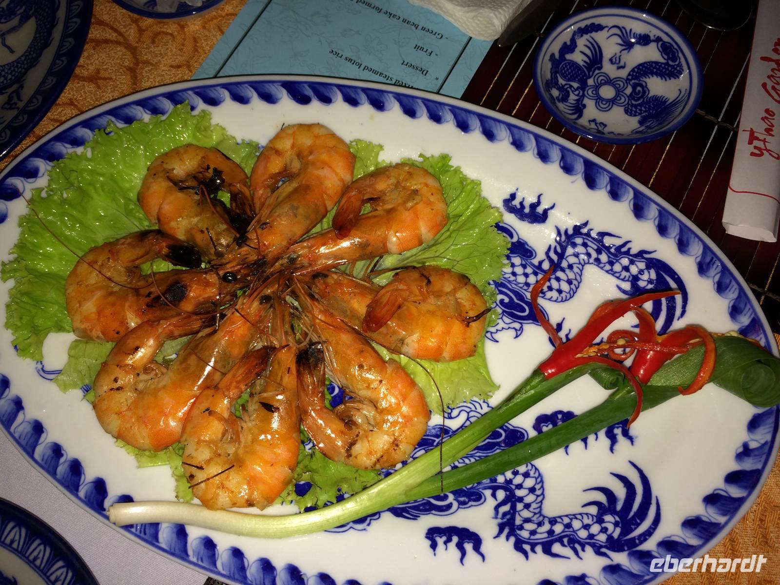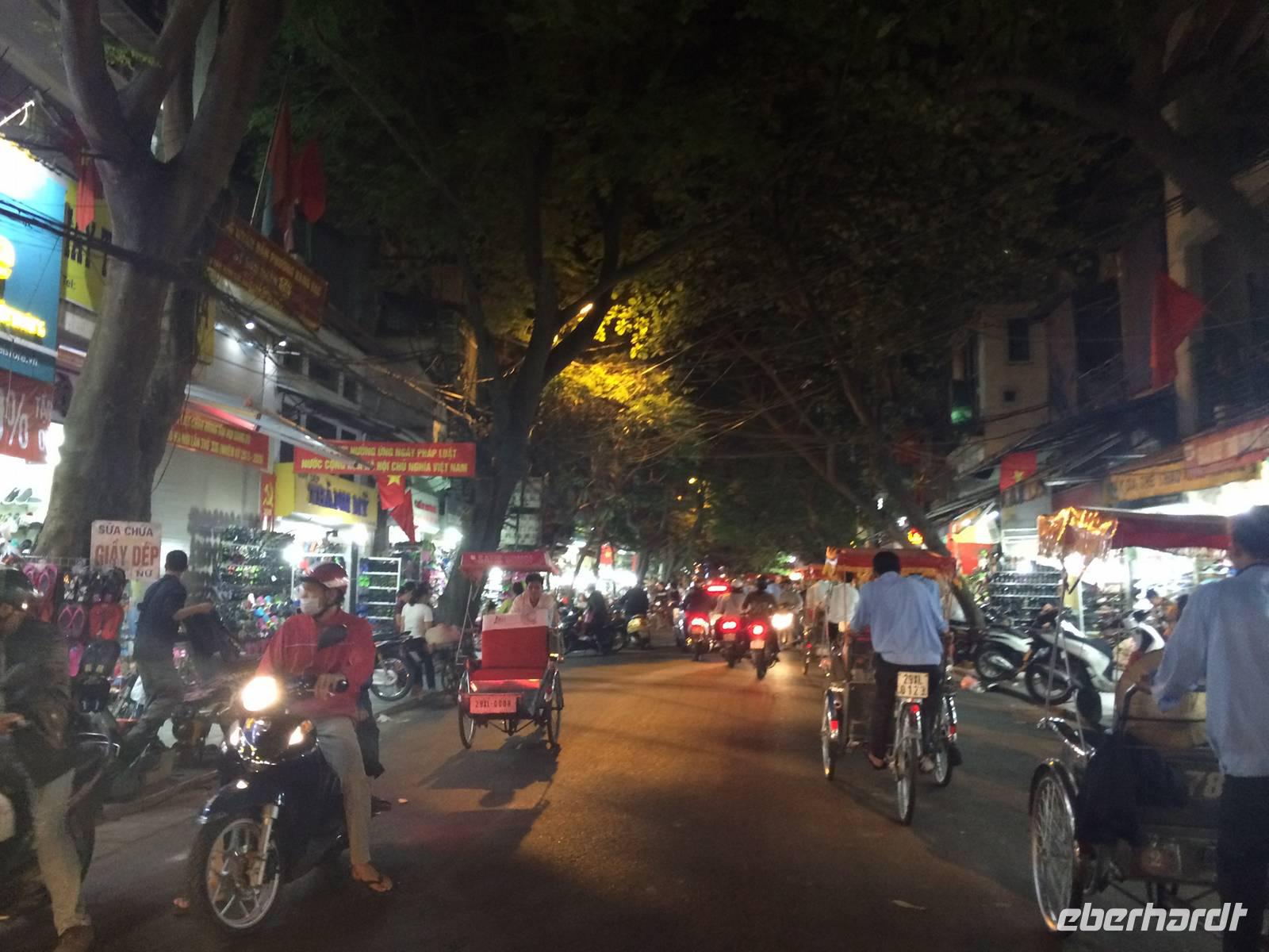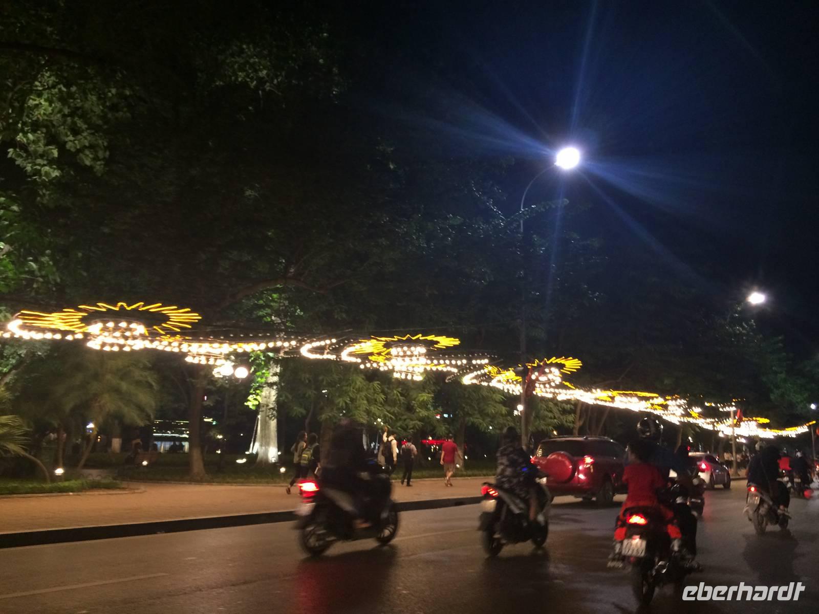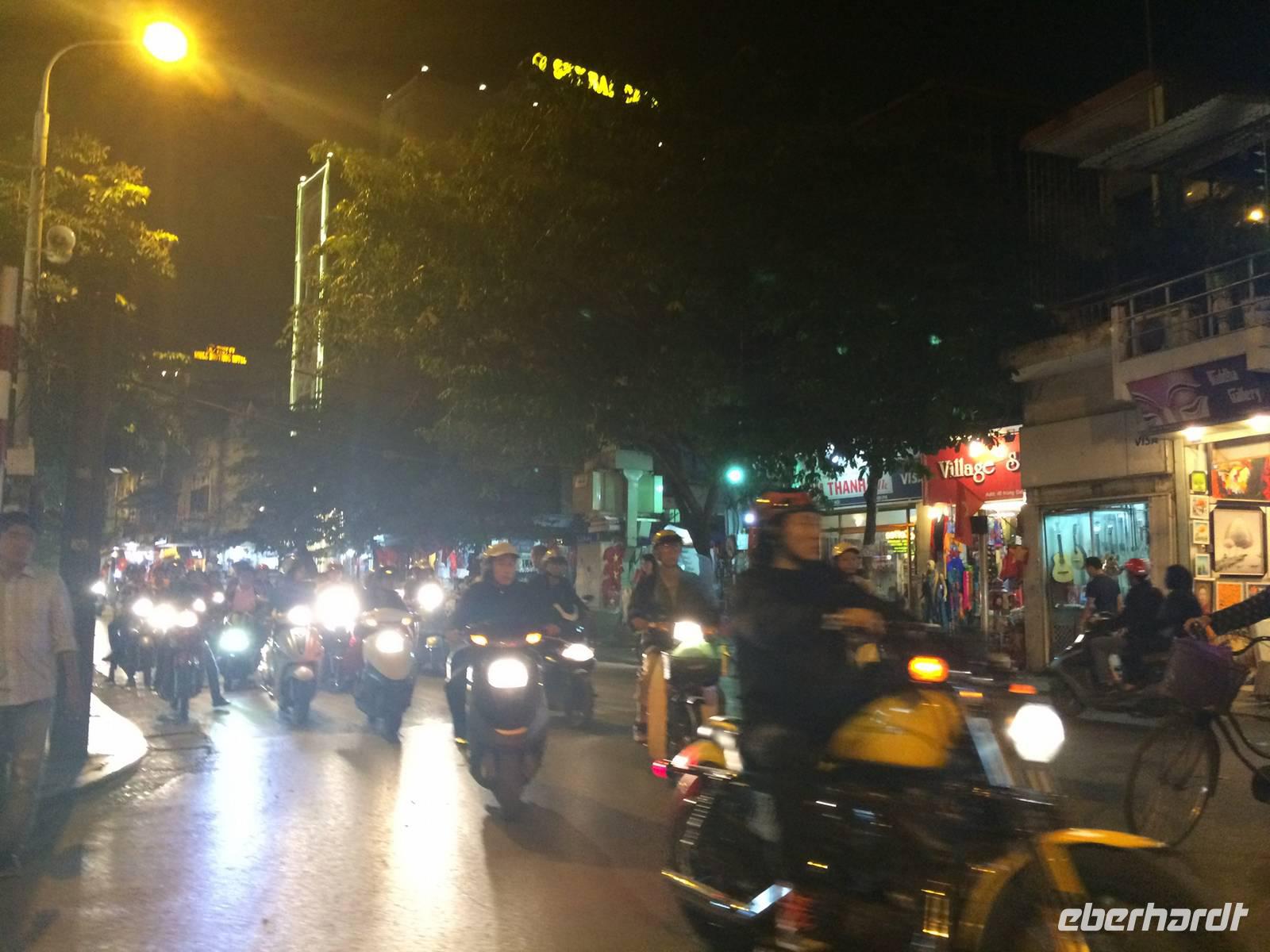 Danach begleiten uns meine Großeltern mütterlicherseits zum Abendessen. Wir speisen in einem Restaurant in der fünften Etage und haben einen großartigen Blick über Hanoi und den Hoan Kiem-See. Es gibt eine uralte Spezialität Hanois: Cha Ca La Vong (Zu Deutsch Fischpastete). Diese Speise zählt sogar zu einen der tausend Dinge, die man vor dem Tod erleben sollte. Der einzige Haken an der Sache ist, dass wir die Fischpastete mit dem Gemüse selbst am Tisch garen sollen. Meine Großeltern sind vertraut mit den Speisen und zeigen uns, wie das funktioniert. Wäre das Personal damit auch so vertraut... Sie machen uns das Feuer auf den einzelnen 19 Gasplatten an und präsentieren uns das schöne lodernde Feuer. Oah... Machen wir alle und sind noch sehr gespannt. Dann kommt eine Pfanne drauf, es wird ein wenig! Öl dazugegeben, den Fisch aus dem Roten Fluss und das Gemüse. Nach wenigen Minuten stehen wir alle plötzlich im Rauchnebel, alles Personal und Anh eilen zur Hilfe. Hilfe, wir werden fast geräuchert und flambiert! Irgendwie bekommen wir dennoch die Kurve gekratzt und lachen über den aufregenden, amüsanten Abend, als wir mit kleinen Hanoi-Taxis zurück ins Hotel fahren.