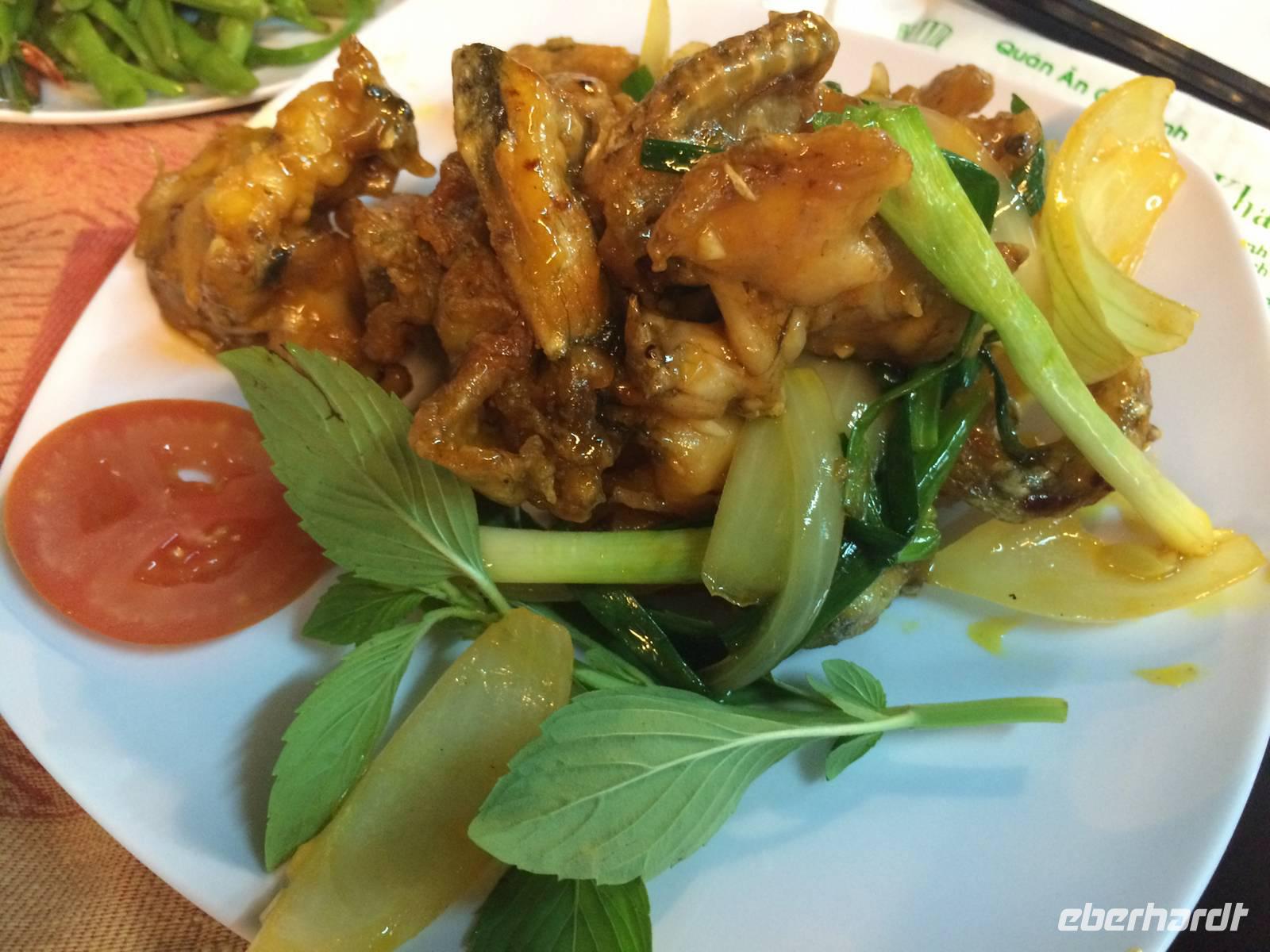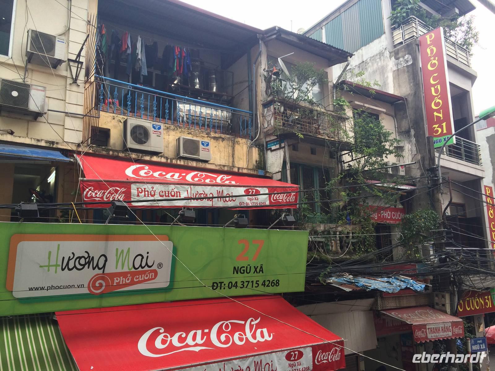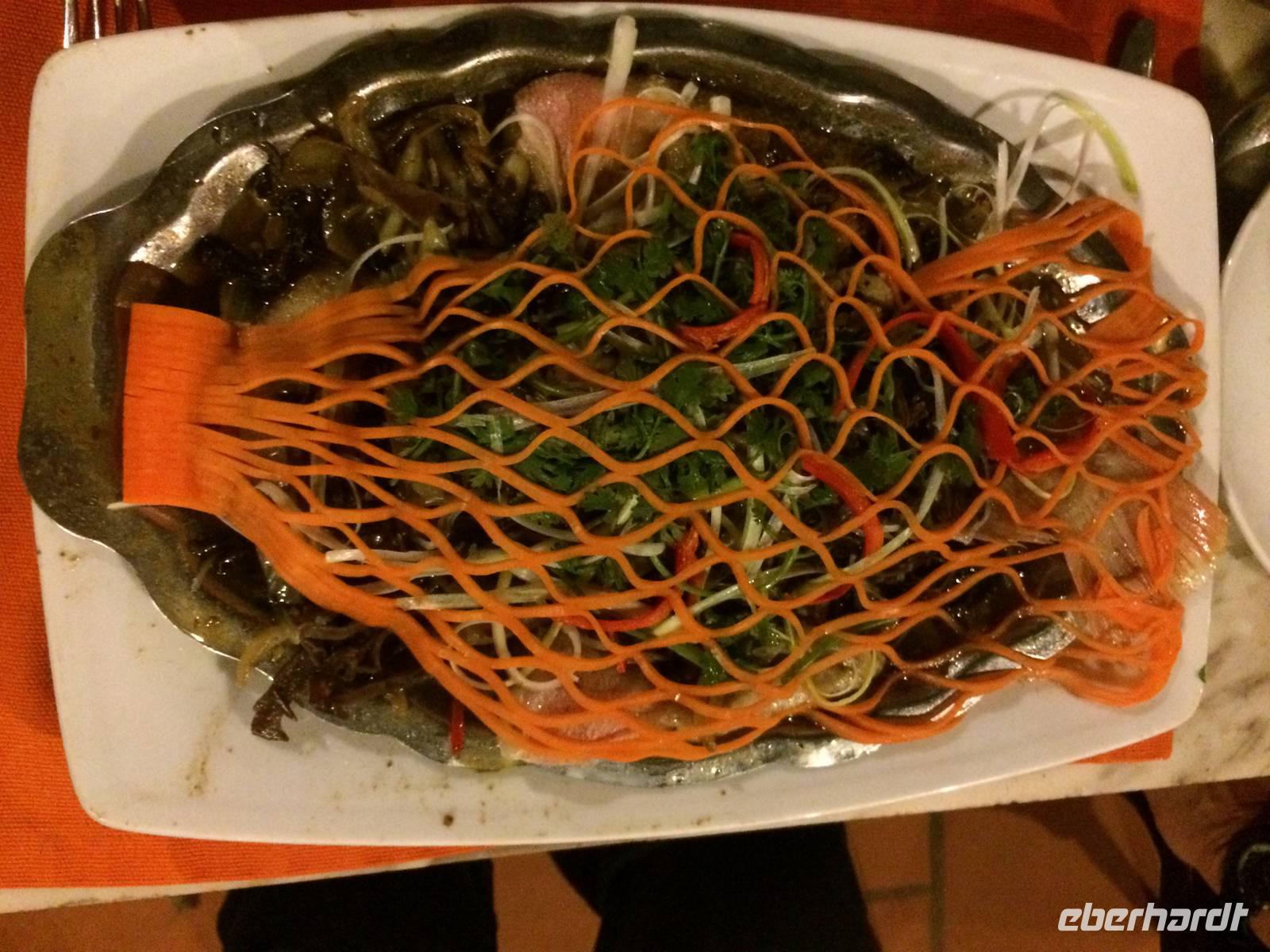 Danach begleiten uns meine Großeltern mütterlicherseits zum Abendessen. Wir speisen in einem Restaurant in der fünften Etage und haben einen großartigen Blick über Hanoi und den Hoan Kiem-See. Es gibt eine uralte Spezialität Hanois: Cha Ca La Vong (Zu Deutsch Fischpastete). Diese Speise zählt sogar zu einen der tausend Dinge, die man vor dem Tod erleben sollte. Der einzige Haken an der Sache ist, dass wir die Fischpastete mit dem Gemüse selbst am Tisch garen sollen. Meine Großeltern sind vertraut mit den Speisen und zeigen uns, wie das funktioniert. Wäre das Personal damit auch so vertraut... Sie machen uns das Feuer auf den einzelnen 19 Gasplatten an und präsentieren uns das schöne lodernde Feuer. Oah... Machen wir alle und sind noch sehr gespannt. Dann kommt eine Pfanne drauf, es wird ein wenig! Öl dazugegeben, den Fisch aus dem Roten Fluss und das Gemüse. Nach wenigen Minuten stehen wir alle plötzlich im Rauchnebel, alles Personal und Anh eilen zur Hilfe. Hilfe, wir werden fast geräuchert und flambiert! Irgendwie bekommen wir dennoch die Kurve gekratzt und lachen über den aufregenden, amüsanten Abend, als wir mit kleinen Hanoi-Taxis zurück ins Hotel fahren.