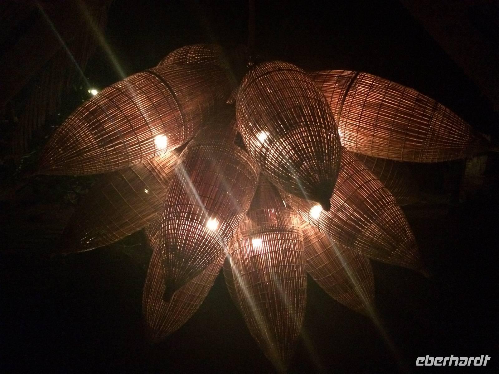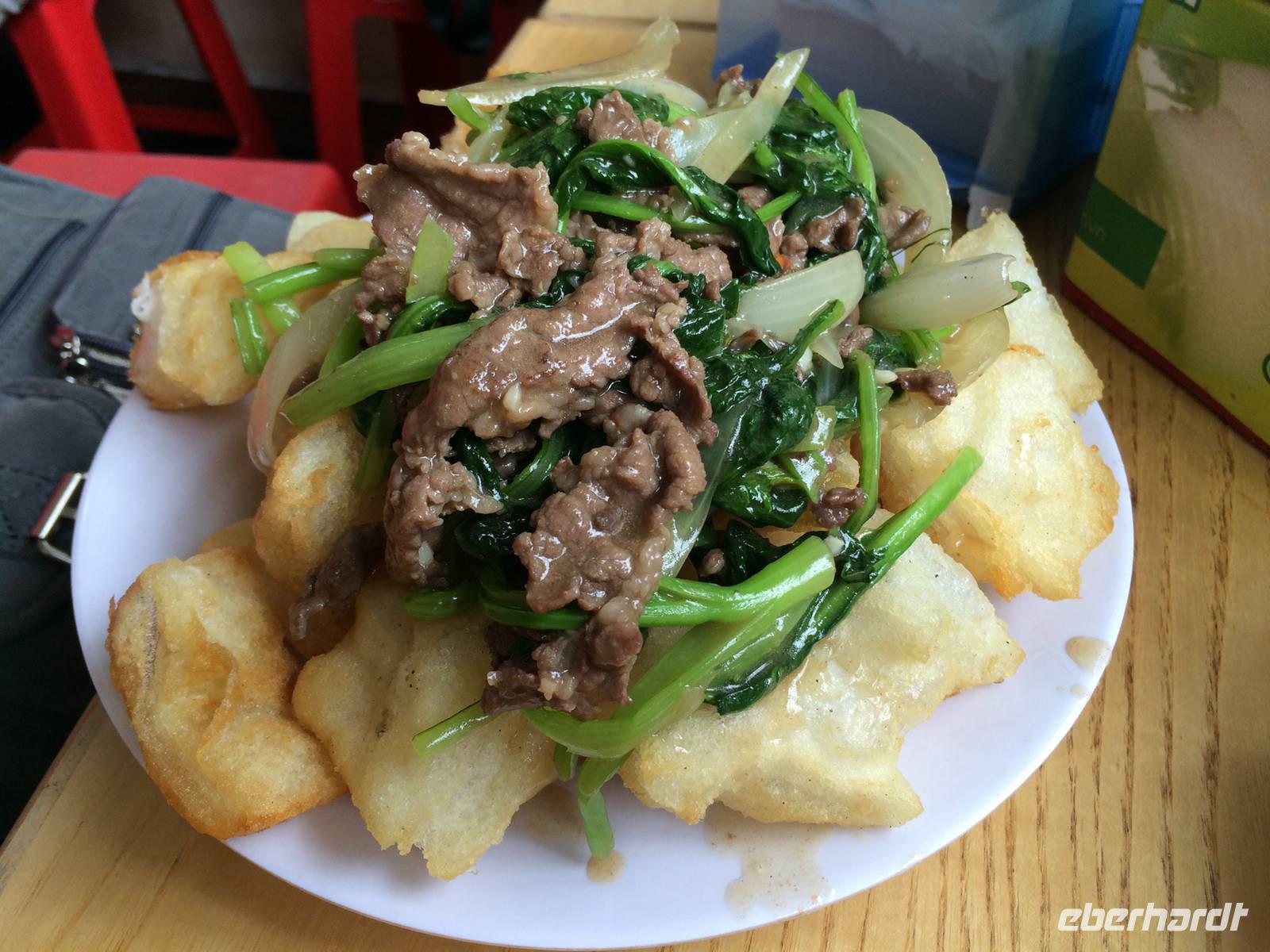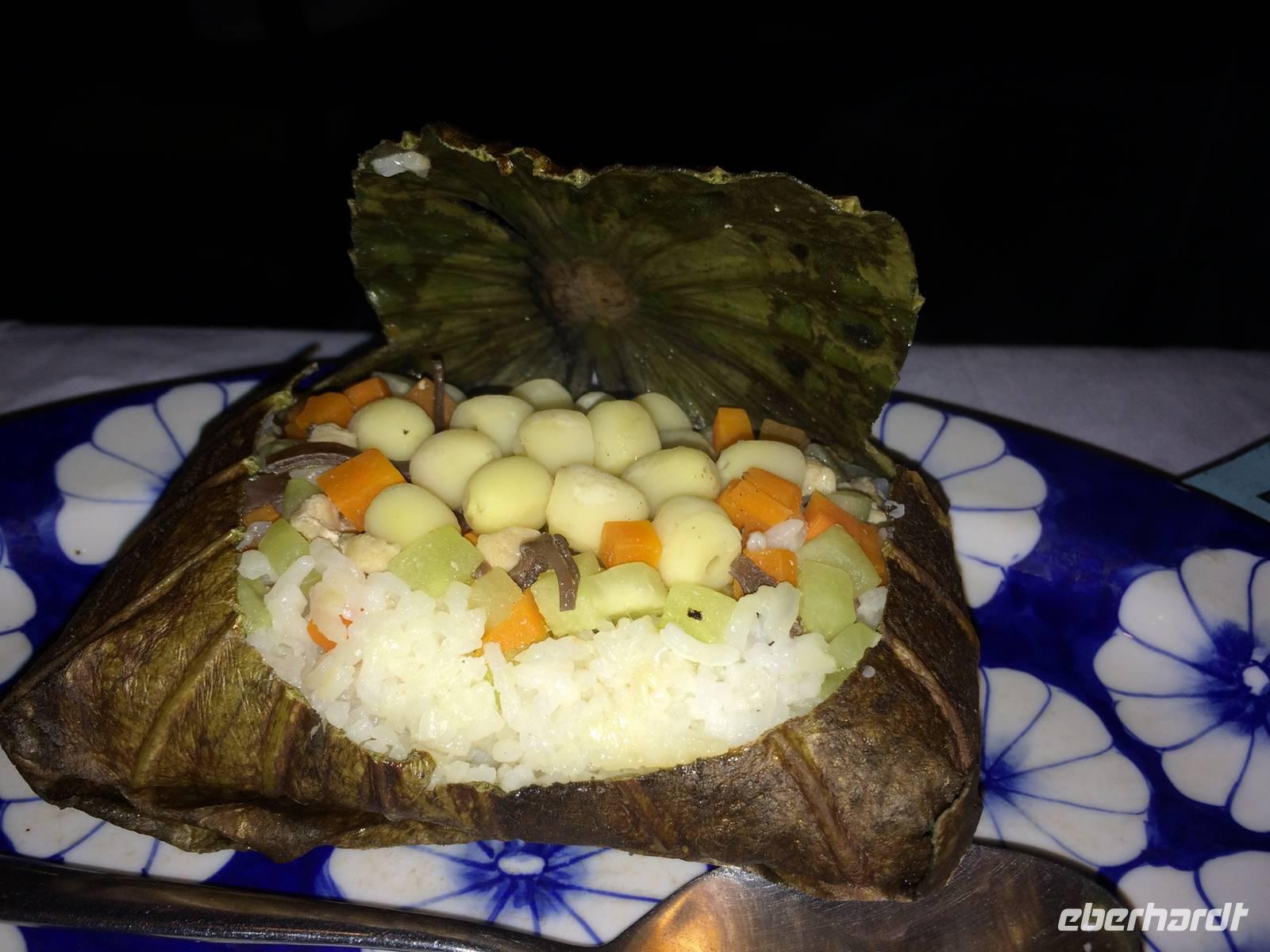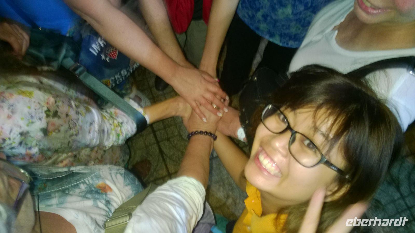 Danach begleiten uns meine Großeltern mütterlicherseits zum Abendessen. Wir speisen in einem Restaurant in der fünften Etage und haben einen großartigen Blick über Hanoi und den Hoan Kiem-See. Es gibt eine uralte Spezialität Hanois: Cha Ca La Vong (Zu Deutsch Fischpastete). Diese Speise zählt sogar zu einen der tausend Dinge, die man vor dem Tod erleben sollte. Der einzige Haken an der Sache ist, dass wir die Fischpastete mit dem Gemüse selbst am Tisch garen sollen. Meine Großeltern sind vertraut mit den Speisen und zeigen uns, wie das funktioniert. Wäre das Personal damit auch so vertraut... Sie machen uns das Feuer auf den einzelnen 19 Gasplatten an und präsentieren uns das schöne lodernde Feuer. Oah... Machen wir alle und sind noch sehr gespannt. Dann kommt eine Pfanne drauf, es wird ein wenig! Öl dazugegeben, den Fisch aus dem Roten Fluss und das Gemüse. Nach wenigen Minuten stehen wir alle plötzlich im Rauchnebel, alles Personal und Anh eilen zur Hilfe. Hilfe, wir werden fast geräuchert und flambiert! Irgendwie bekommen wir dennoch die Kurve gekratzt und lachen über den aufregenden, amüsanten Abend, als wir mit kleinen Hanoi-Taxis zurück ins Hotel fahren.