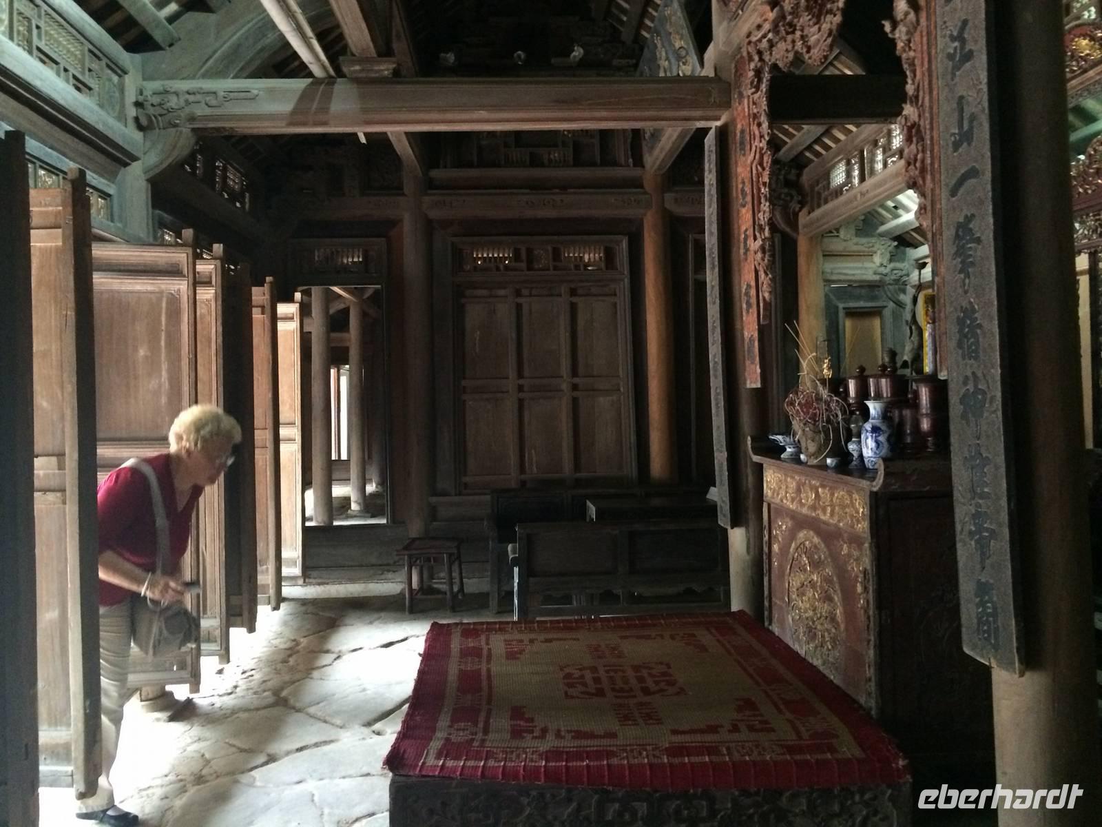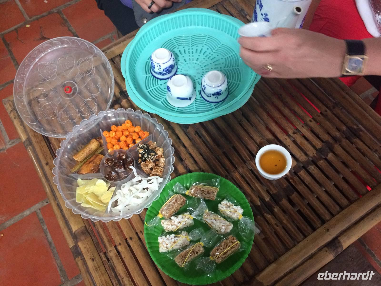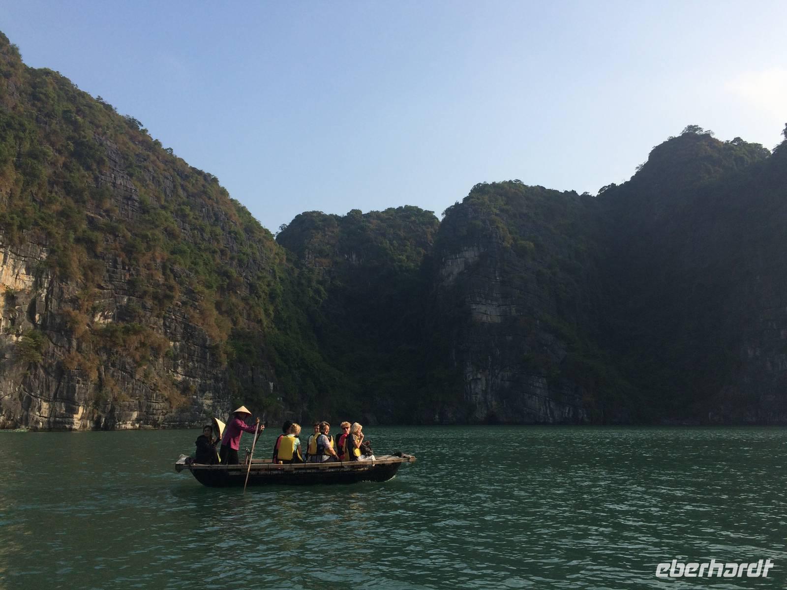 Die Anker sind gelichtet, wir kreuzen schon in der Bucht. Unser heutiger Morgen auf See beginnt weiter mit dem Schauspiel der Natur. Zum Sonnenaufgang begrüßen wir den neuen Tag mit sanften Bewegungen der Tai Chi-Lehre auf dem Außendeck und genießen die angenehme Ruhe. Gemütlich starten auch die anderen Gäste mit einem französischen Frühstück in den Tag. Auf kleinen Bambusbooten werden wir durch das Schwimmende Dorf Vong Vieng gepaddelt. Früher lebten hier viele Familien, heute sind es nur noch vierzehn. Die Häuser schwimmen auf leeren Fässern und die Menschen leben ausschließlich vom Fischfang. Strom gibt es hier nur über Dieselgeneratoren, aber die Menschen hängen an ihrer Art zu leben.Es bleibt noch etwas Zeit zum Schlemmen und Schauen auf der Dschunke, bis wir zum Ausgangspunkt zurückkehren. Wir verabschieden uns von dieser schönen Kulisse und kehren nach Hanoi zurück. Unterwegs besuchen wir einen alten Friedhof, wo uns unser Reiseleiter Ot über die Bestattungsrituale aufklärt. Hier und da haben wir schon oft kleine Bauten inmitten der Reisfelder gesehen. Wir erfahren: in diesen Grabstätten gönnt man den verstorbenen Angehörigen die letzte Ruhe. Das war bisher auf dem Land Normalfall, jedoch ist es nunmehr verboten. Jetzt werden Grabstätten auf Friedhöfen in Eigenregie errichtet und gepflegt. Eine Verwaltung, die das Umfeld und die Infrastruktur betreut, ist noch im Entwickeln begriffen. In Hanoi drehen wir noch eine Runde um den Hoan Kiem-See, dem See des zurückgegebenen Schwertes mit dem Jadeberg-Tempel, der über die rote Brücke der aufgehenden Sonne erreichbar ist. Am Abend genießen wir eine imposante Darbietung des Wasserpuppentheaters. Schwere Holzpuppen zeigen uns Episoden aus dem bäuerlichen Leben und der Sagen- und Geschichtenwelt Vietnams. Das Rätsel: wie funktioniert das - die Künstler unsichtbar, bewegen die Puppen, lassen sie Feuer speien. Der Vorhang geht hoch und das Geheimnis wird gelüftet: die Puppenspieler stehen dabei hüfttief im Wasser. Es wird reichlich Beifall gespendet.