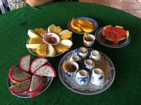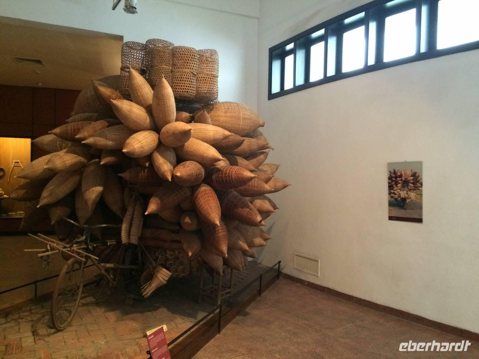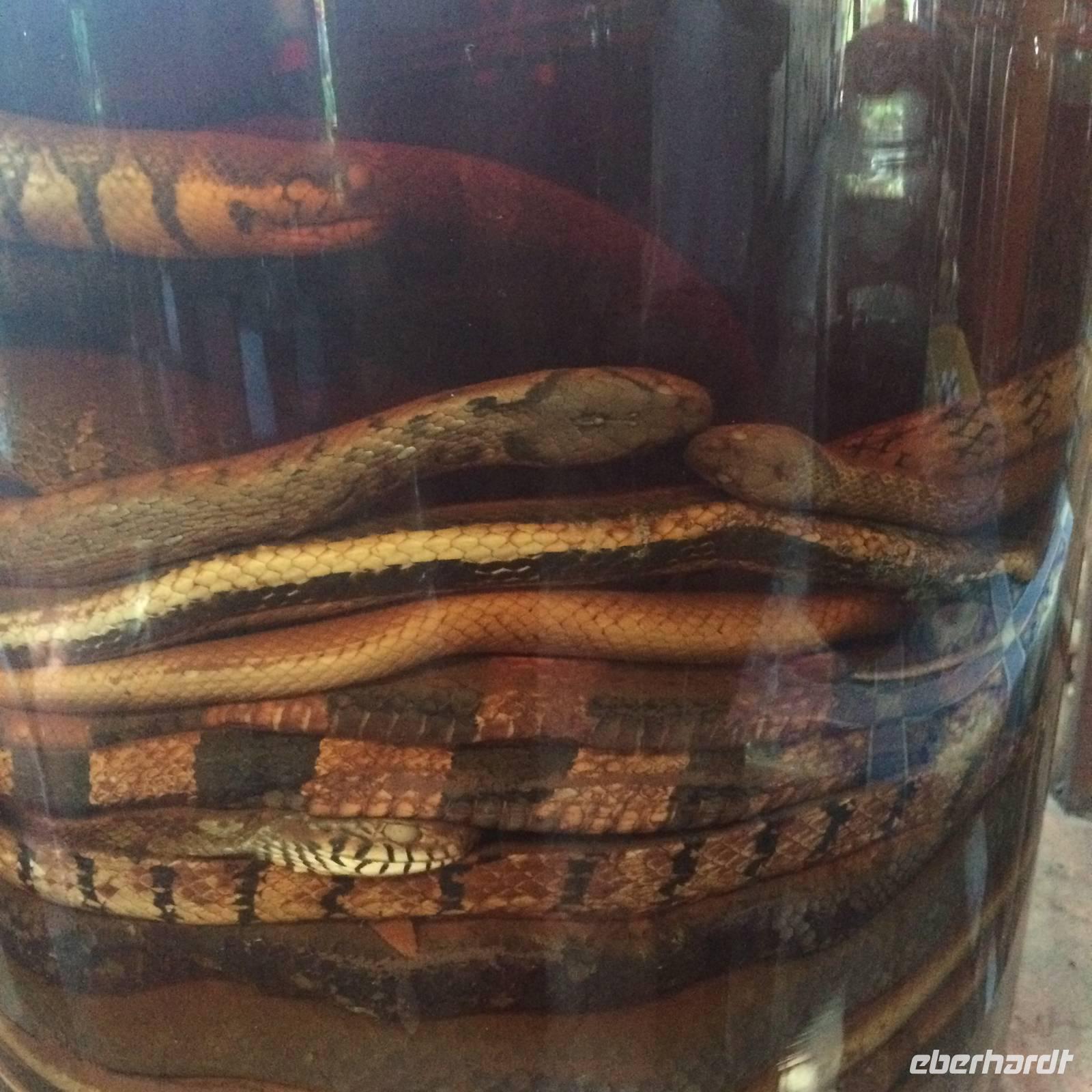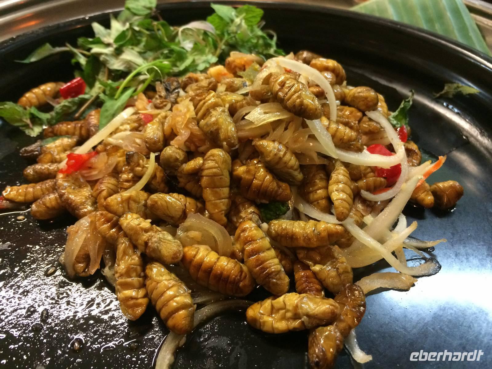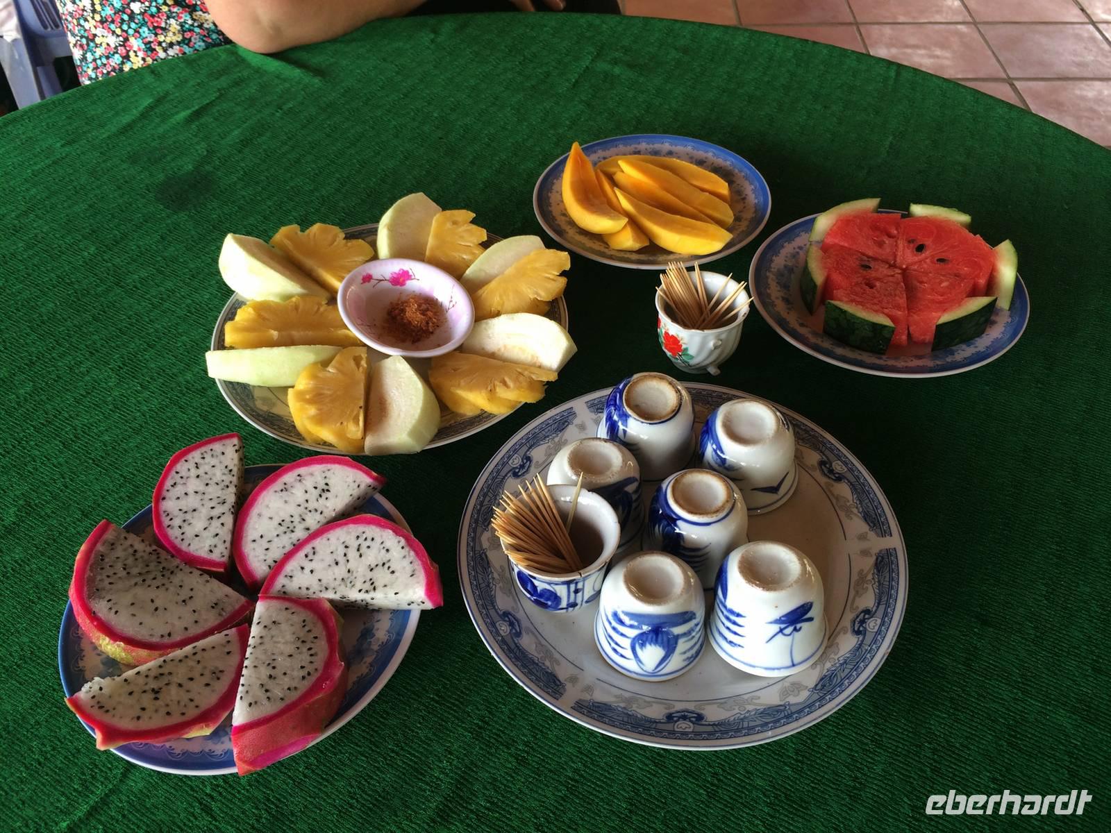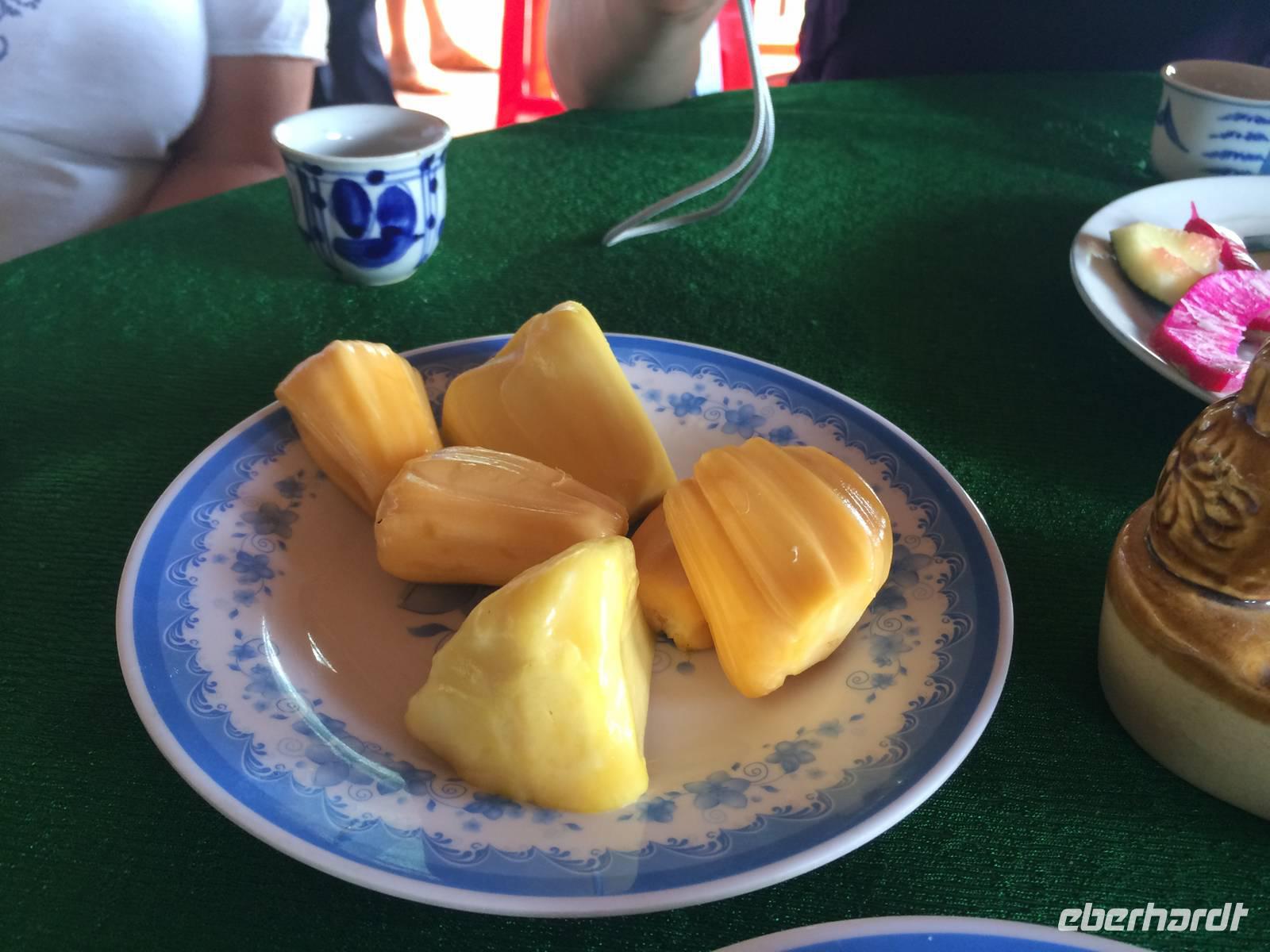 Anfangs ist der Himmel noch grau, doch als wir aus Saigon in Richtung Cai Be fahren, erwartet uns das perfekte Sonnen-Wetter für unseren Ausflug in das Mekong-Delta. Wir wechseln das Verkehrsmittel und fahren nun mit dem Boot über den Mekong. Über den ersten schwimmenden Markt erreichen wir eine Anlegestelle. Bei einem Bauern probieren wir die hier angebauten exotischen Früchte wie Guave, aromatische Mangos, süße Miniananas, Drachenfruchtbaum sowie die fremd, aber leckere Jackfrucht. Wir dürfen sogar durch seinen Garten gehen, um uns die Bäume mit Blüten und Früchten näher anzusehen. Die schwere Frucht mit den Stacheln, die an dem Baumstämmen herunterhängt und an eine Waffe erinnert, ist die Jackfrucht. Ungeöffnet geht ein intensiver, unangenehmer Geruch hervor, der an verfaulte Eier erinnert, von ihr aus. Jedoch riecht sie innen sehr aromatisch nach Ananas, Apfel und Banane. - Eine wirklich exotische Mischung!Es geht zurück auf das Boot. Die Wasserlandschaft wird immer enger, der tropische Wald scheint über uns zuzuwachsen. bis wir den Umstieg in die Sampas meistern. Das sind kleine Boote, die von Frauen durch die Fließe gestakt werden, wie im Spreewald, nur VÖLLIG ANDERS! Mangroven, Palmen... Unterschiedliche Wasserstände formen aus dem lehmhaltigen Boden bizarre Uferzonen, ausgespülte Wurzeln. Vom Himalaya kommt er, der Mekong und hier breitet er sich als Deltalandschaft ins Meer aus. Wir legen wieder an, die Frauen leisten nicht nur Kraftarbeit, sondern außerordentliches Geschick im Steuern, vor allem in den engen Stellen beim Begegnen. Zum Mittag besuchen wir ein kleines Gartenrestaurant. Sie haben eine Spezialität für uns angekündigt: Elefantenohrfisch! Eine nächste Herausforderung steht uns bevor. Damit es allen leichter fällt, lädt uns der Gastgeber zu einem selbstgebrannten Reisschnaps, speziell gekocht mit Anis, Zimt und Kardamom. Reiseleiter Hien zeigt uns das etwas andere Haustier: eine Schlange. Die Mutigen legen Sie einmal um den Nacken an und lassen sich von ihr beschnuppern.Dann geht es weiter zu einer Familienfabrik: Kokosnüsse und Honig; beides, Honig und Kokos sowie Reis, sind Grundlage für die Bonbonherstellung, die wir gleich beobachten können. Alles ist Handarbeit, nur die Rührmaschine ersetzt das Manuelle. Es wird geknetet, gerollt, geschnitten aufgereiht und akribisch einzeln eingewickelt. Die Außenhülle mit lackiertem Bonbonpapier, die innere aber kann man mit essen, sie zergeht im Munde; Reismehlpapier, verschiedene Geschmacksrichtungen von Schokolade bis hin zur Durian (die sogeannte Stinkfrucht)... Der Popreis oder das gegrillte Reispapier haben uns auch ziemlich gut geschmeckt *schwärm*Oh, es gibt etwas Neues zu probieren. Unsere Mekong-Führer bereiten Kokosnüsse vor, wir schlürfen die Milch und löffeln danach das weiche Fruchtfleisch - lecker!