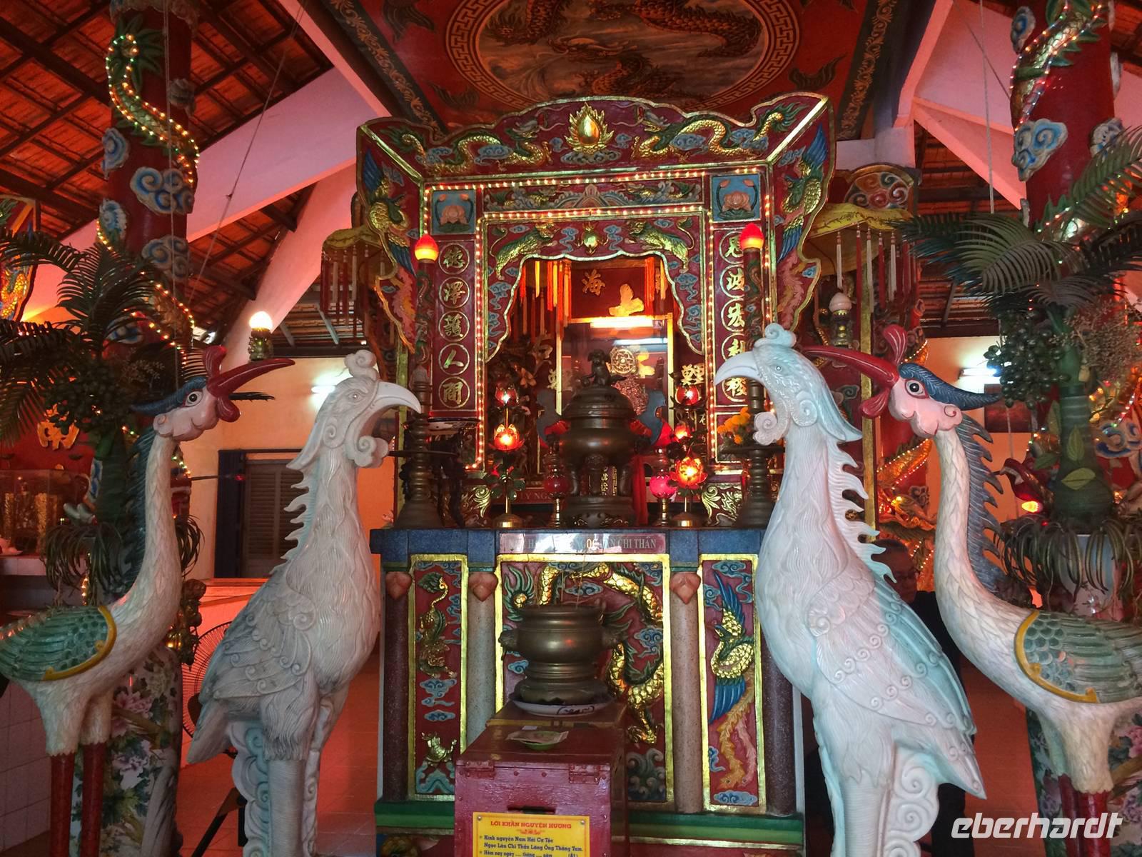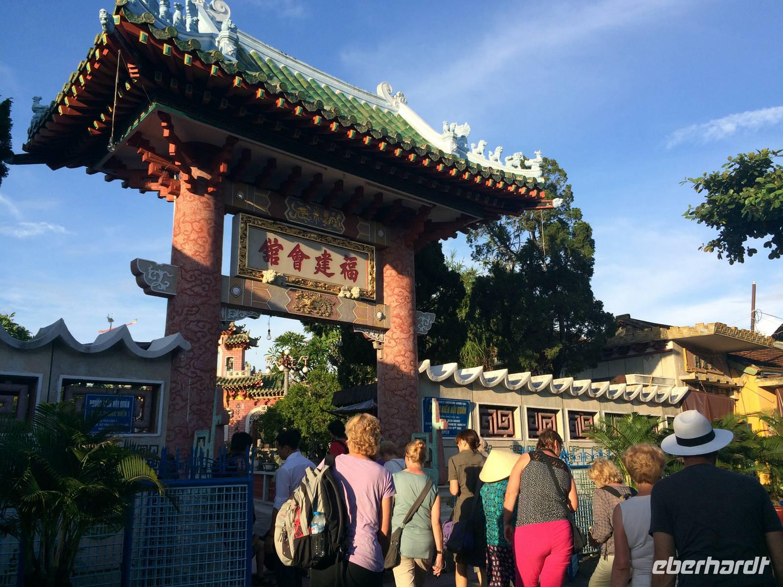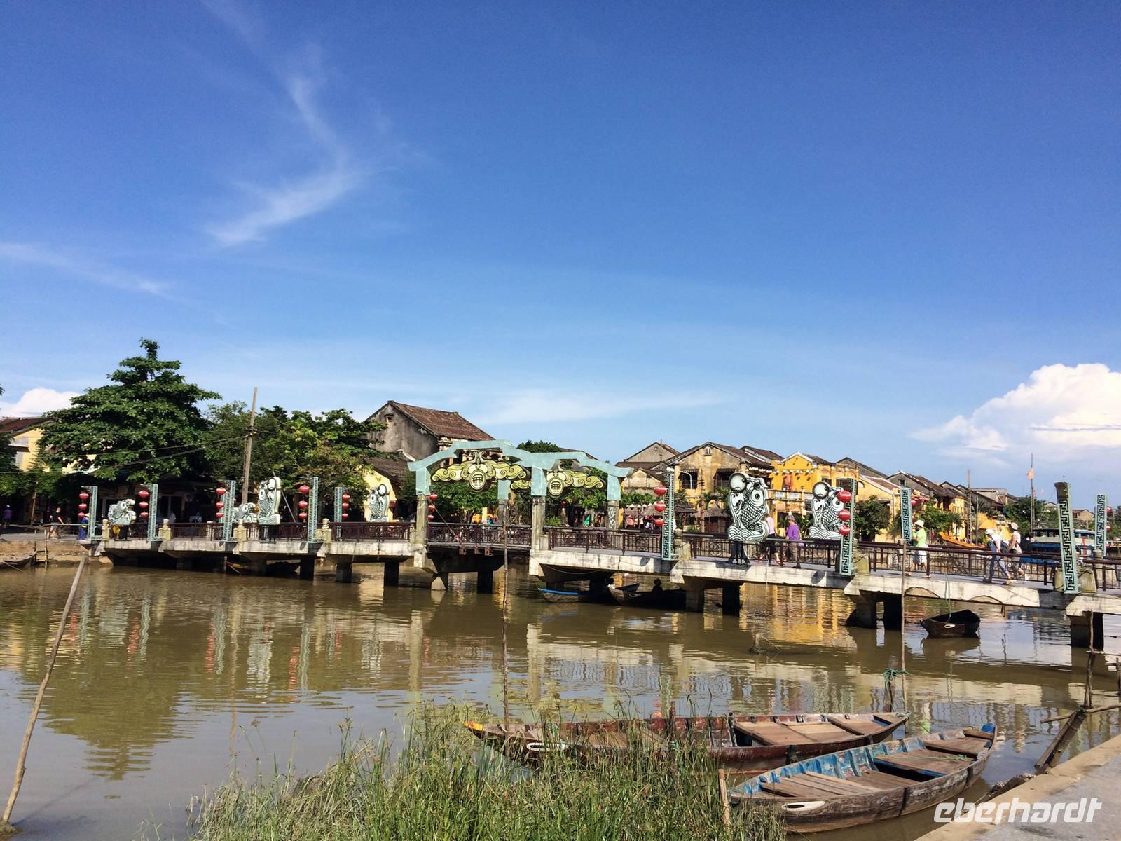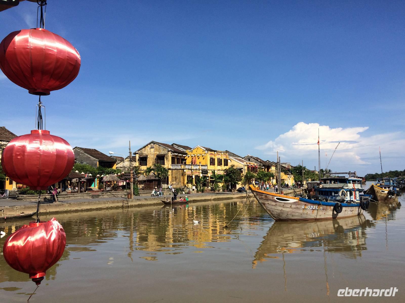 Auf unserer Agenda steht für heute die Hafenstadt Hoi An. Auf der Nationalstraße 1 fahren wir in Richtung Süden. Der Wolkenpass, Da Nang und die mittelalterliche Stadt Hoi An sind die Etappen. Der Wasser-Wolkenpass Hai Van bildet die natürliche Grenze und Wetterscheide zwischen Nord- und Süd-Vietnam. Er ist etwa 20 Kilometer lang und erreicht 496 Meter Höhe. Auf der Passhöhe angekommen, gibt es natürlich einen Halt für dies und jenes. Foto, Vietnamesischer Allzweckbalsam, Eukalyptusöl, Perlenschmuck...Wir kommen wieder in die Ebene und erreichen Da Nang. Wie umgewandelt erscheint uns hier die Gegend: die Küste, gepflegte Straßen und Promenaden mit verzierten Bäumchen am Straßenrand. Da Nang ist die viertgrößte Stadt Vietnams und durch seinen Naturhafen zum Pazifischen Ozean auch eine wichtige Handelsstadt. Am schönen Lang Co Strand pausieren wir zum Mittag und lassen unsere Füße noch kurz das Wasser den feinen Sand sowie das warme Südchinesischen Meeres spüren.In Hoi An angekommen verabschieden wir uns von unserem Bus und laufen zu Fuß durch das kleine Hafenstädtchen. Hoi An wurde im 4. Jahrhundert von den Cham als Hafenstadt am Südchinesischen Meer gegründet. Allerdings haben wir gelernt, dass wir nicht (mehr) in China sind. Obwohl offiziell in allen aktuellen europäischen Karten (und sogar auf dem Smartphone-Navi so bezeichnet) ist es hier nicht das Südchinesische Meer, sondern das Ost-Meer. Und richtig: auf der original vietnamesischen Karte steht „Bien Ðông" und das heißt übersetzt „Ost-Meer". Die gesamte Altstadt gehört inzwischen zum Weltkulturerbe. Sofort zieht uns das liebliche, bunte Städtchen in seinen Bann. Wir schlendern durch die kleinen Gassen mit ihren gemütlichen Läden, die allesamt mit bunten Lampions geschmückt sind. An der Japanischen Brücke berichtet uns Tuan über die Teilung der Stadt in einen japanischen und einen chinesischen Teil im 16. Jahrhundert. Der Legende nach baute man die Brücke, als Japan mehrfach von verheerenden Erdbeben heimgesucht wurde, für die man ein Ungeheuer verantwortlich machte. Man glaubte, dass dessen Kopf in Indien, dessen Schwanz in Japan und dessen Herz in Hoi An lag. Mit dem Bau einer Brücke bezweckte man, dass sich Steinpfeiler wie ein "Schwert" in das Herz rammen sollten und so das Ungeheuer bezwingen. Wir spazieren am Ufer des Thu Bon Flusses entlang, bis wir unser Ausflugsboot erreichen. Gemütlich schippern wir über den Fluss, um am kühlen Wasser der Hitze zu entfliehen. Zurück an Land besuchen wir die Versammlungshalle der Chinesen aus Kanton. Ursprünglich diente diese Anlage als Treffpunkt der eingewanderten Chinesen und manchmal auch als religiöses Zentrum. Im Inneren steigt uns sofort Weihrauchduft in die Nasen. Viele Räucherspiralen mit Wunschzetteln hängen an der Decke der Pagode. Man glaubt, dass der Weihrauch die Wünsche hinauf zur Himmelsgöttin trägt und so in Erfüllung gehen. Am Nachmittag genießen wir die freie Zeit. Ob man am Fluss entlang schlendert, nach Souvenirs Ausschau hält, einen Kaffee schlürft oder den Markt besucht, hier es ist für jeden was dabei!