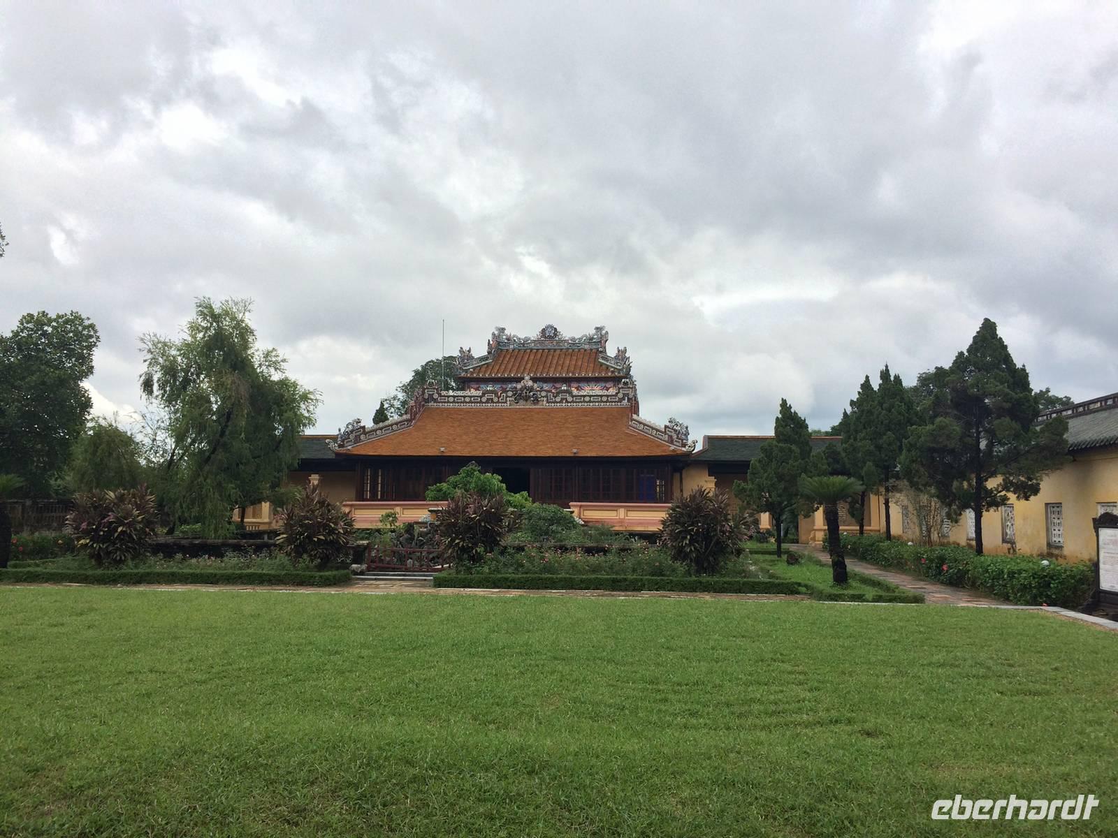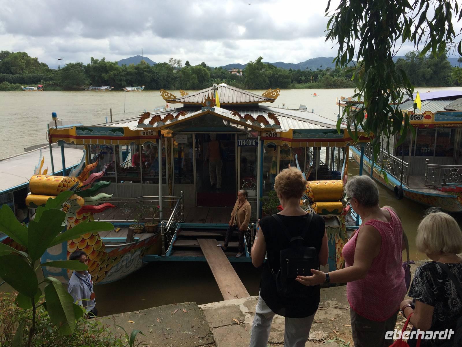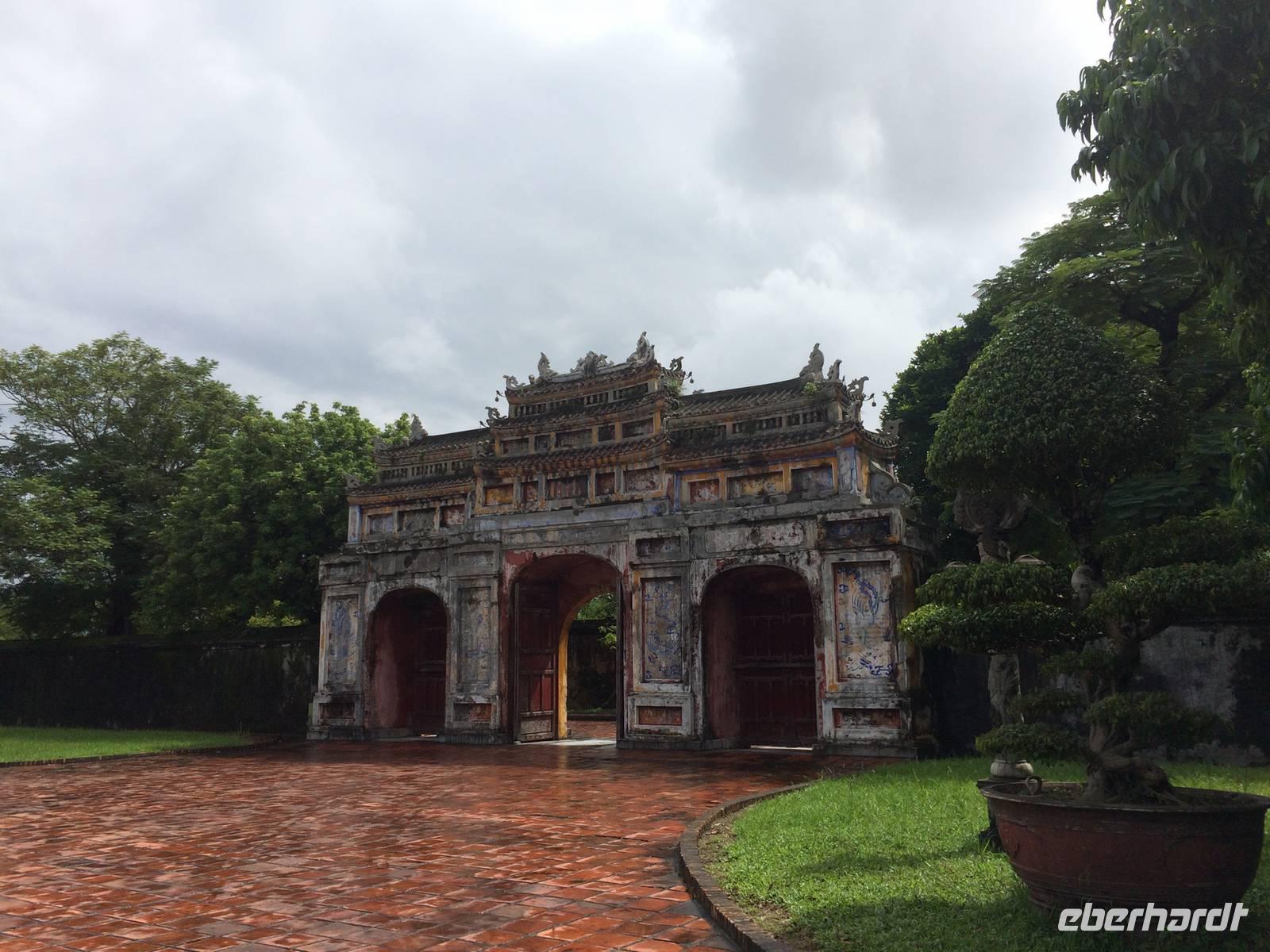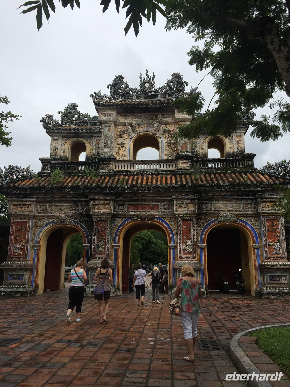 Wir wollen die erhabene alte Hauptstadt und Kaiserstadt Hue erkunden. Ein neuer Reiseleiter begrüßt uns: Herr Tuan kümmert sich professionell um alles. Unser erster Anlaufpunkt ist der Königspalast. Vor dem Palast steht der Flaggenturm mit der Königsflagge, die auf drei Stufen steht. Die Stufen symbolisieren die drei wichtigen Bedingungen für ein König: Volk, Erde und Himmel.Hue erlebte eine der blutigsten und längsten Schlachten im letzten Vietnamkrieg, der kaum vorstellbar aber bekanntermaßen länger als der 2. Weltkrieg andauerte. Wenigstens aufgrund des religiösen und kulturhistorischen Status verbot es sich für die Amerikaner, die Stadt zu bombardierenden, so wurde im Häuserkampf vorgegangen. Die Zitadelle konnte jedoch nicht eingenommen werden; nun setzten sie doch gezielte Bomben-und Napalm-Abwürfe gegen Zitadelle und Kaiserpalast ein.Die Zitadelle sollte nicht nur eine Festung sein, sondern eine Stadt mit Wohnbereichen für die kaiserliche Familie und die Beamten. Achtzig der ehemals dreihundert Gebäude kann man heute noch sehen. Wir sehen nicht nur in den Ausmaßen überwältigende Anlagen, wir sind Zeugen des im Gange befindlichen und noch lang währenden Prozesses des Wiederaufbaus und der Restauration, mit staunenswerten Resultaten.... In den Anlagen des Palastes zeigt er uns die Charakteristiken des Baustils, die sich größtenteils an die Feng-Shui-Prinzipien richten und weiht uns in die interessanten Geschichten des Kaiserlebens ein. Es gibt viel zu hören, was kaum einer schriftlichen Lektüre nachzulesen ist. Mit dem Bau der Zitadelle 1802, veranlasst von Kaiser Gia Long, begannen die glorreichen Tage von Hue.Unsere Erkundungsfahrt setzten wir fort mit der Besichtigung der Thien Mu-Pagode aus dem Jahr 1601, das Gebäude in Gestalt eines überdimensionalen Kegelhutes annimmt. Die prächtige Pagode besteht aus sieben Etagen mit einer goldenen Buddhastatue auf der obersten Etage. Im Haupttempel sind drei Buddhafiguren zu finden, die für Wissen, Weisheit und Glück stehen. Fasziniert sind wir ebenfalls von der ca. 2 Tonnen schweren Bronzeglocke, deren Klang über 10 km weit zu hören sein soll. Die grimmig schauenden Wächter am Eingang bereiten uns keine Angst und so betreten wir die gepflegte Anlage mit anhängendem aktivem Kloster. Weiterhin entdecken wir ein altes Auto (es ist ein Austin). Dieser erinnert an den Mönch Thicj Quang Duc, der 1963 mit diesem Auto nach Saigon fuhr und sich dort öffentlich selbst verbrannte. Er protestierte damit gegen die Verfolgung der Buddhisten und fand, trauriger Weise, auch einige Nachfolger, die seinem Beispiel folgten. Zum Glück ist das alles lange her und wir können heute die Fahrt mit unserem schönen Drachenboot durch das romantische Flusstal in Frieden genießen.143 Jahre lang regierten dreizehn Kaiser der Nguyen-Dynastie in Hue, umgeben von einem feudalistischen Hofstaat chinesischer Prägung, zuerst in glanzvoller Pracht, dann in Dekadenz und letztendlich in Unterwerfung unter die Kolonialmacht Frankreichs. Tu Duc, der vierte Kaiser von Hue war kaum einen Meter fünfzig groß, von sanfter Art, hochgebildet, kränklich, kinderlos. Er hat viertausend Verse und sechshundert Prosastücke hinterlassen, ein guter Poet, aber ein schwacher Kaiser. Unter ihm nahmen sich die Franzosen das Land. Von großer Schuld geprägt, flüchtete sich der Kaiser in seine, schon vor seinem Tod angelegte, Grabanlage. Dort saß er dichtend und rezitierend in einem Pavillon am Lotusteich, über den er sich in Vollmondnächten rudern ließ. Aus Morgentau ließ er sich Tee bereiten. Musik und Poesie begleiteten opulente Bankette, die ihm jedoch nicht über seine Schwermut hinweg halfen. Für seine Mutter und seine 104 Konkubinen ließ er eigene Tempel und Quartiere bauen. Seine Grabanlage hat er selbst entworfen. Ein Vorhof mit steinernen Mandarinen befindet sich vor dem Stehlenpavillon, hinter dem sich das eigentliche Grab befindet.Nach so viel Geschichte haben wir uns heute einen schönen Abend verdient. Mit der Rikscha werden wir bis zum Eingang des Restaurant Y Thao Garden kutschiert. Unser kaiserliches Abendessen heute wird mit folkloristischer Livemusik untermalt und wir lernen traditionelle Instrumente kennen wie zweisaitige Gitarren, 16-Saiten Dan Tranh sowie das berühmte Instrument Dan Bau mit nur einer Saite.