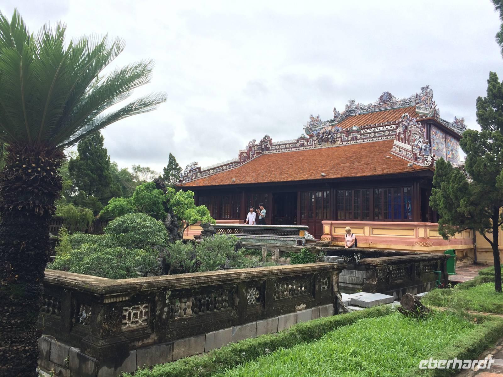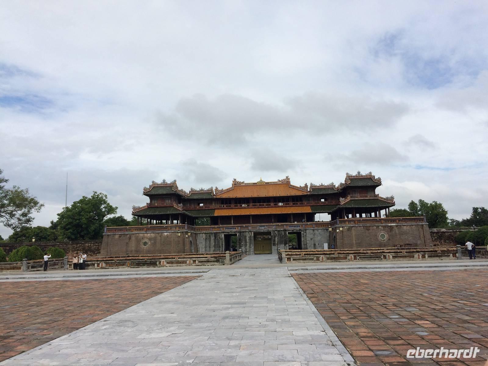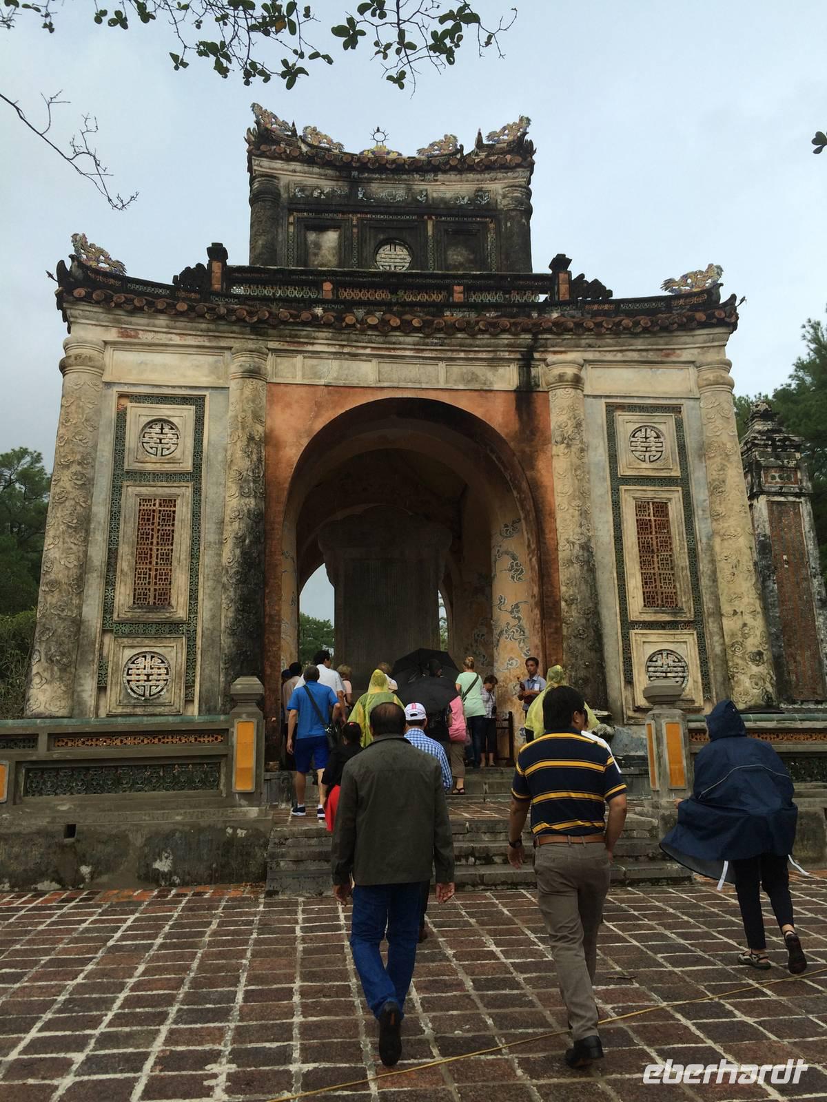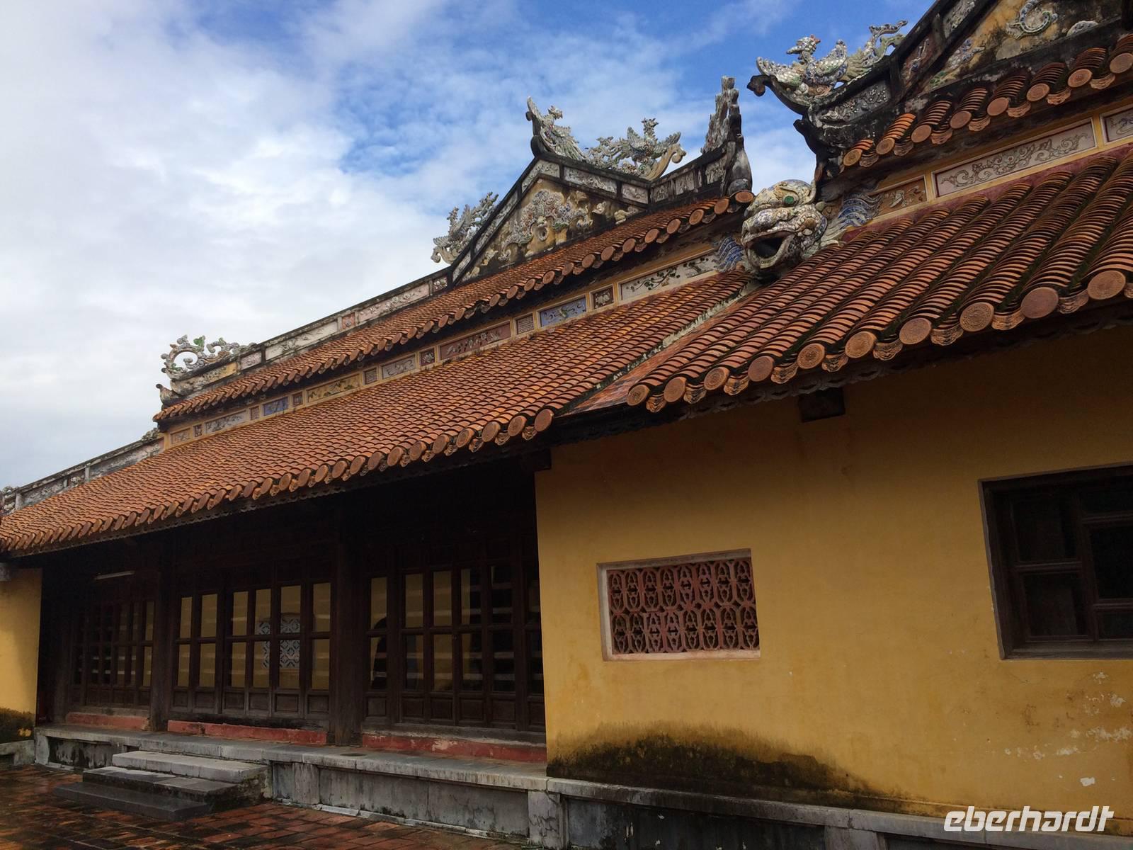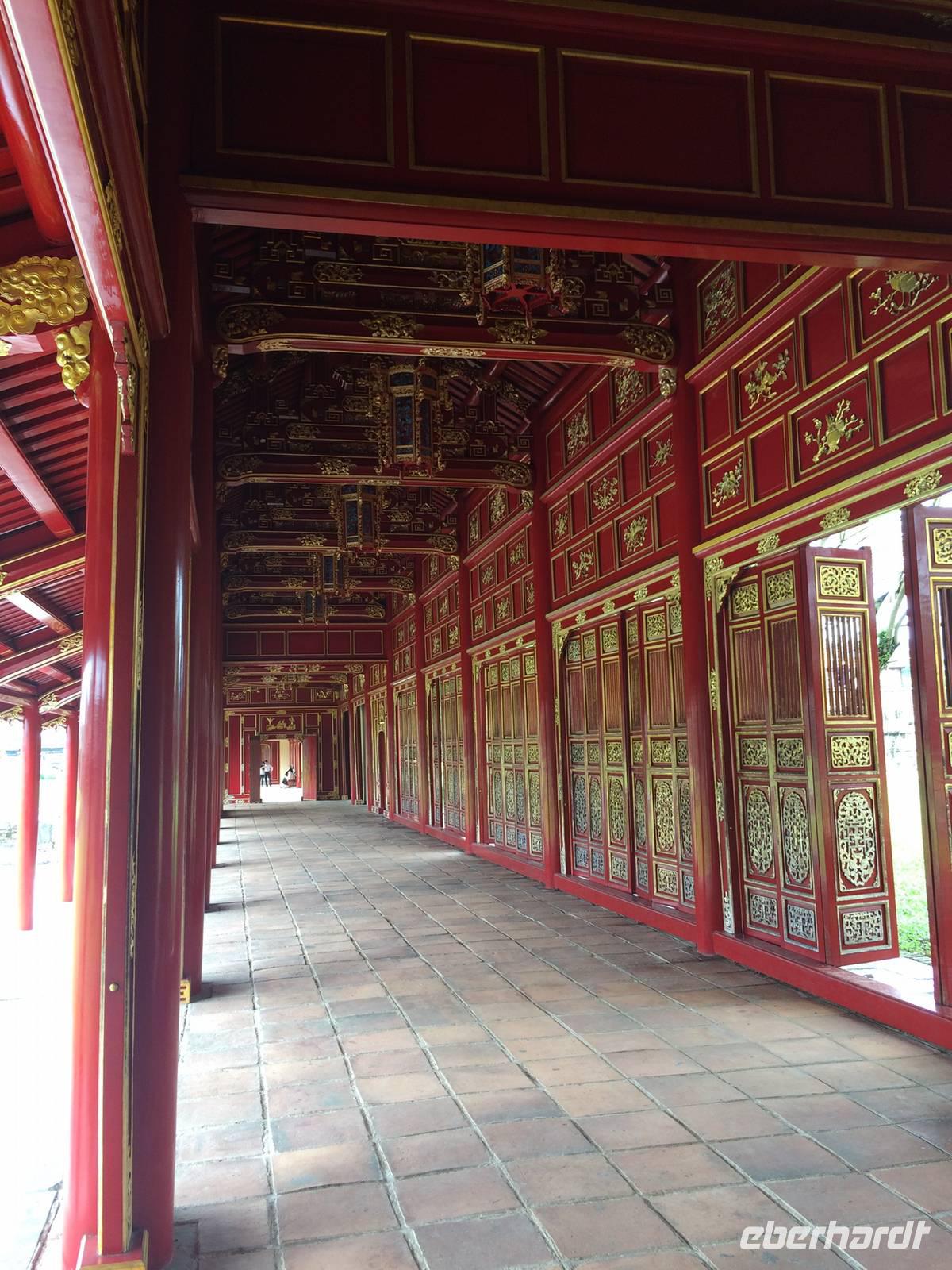 Wir wollen die erhabene alte Hauptstadt und Kaiserstadt Hue erkunden. Ein neuer Reiseleiter begrüßt uns: Herr Tuan kümmert sich professionell um alles. Unser erster Anlaufpunkt ist der Königspalast. Vor dem Palast steht der Flaggenturm mit der Königsflagge, die auf drei Stufen steht. Die Stufen symbolisieren die drei wichtigen Bedingungen für ein König: Volk, Erde und Himmel.Hue erlebte eine der blutigsten und längsten Schlachten im letzten Vietnamkrieg, der kaum vorstellbar aber bekanntermaßen länger als der 2. Weltkrieg andauerte. Wenigstens aufgrund des religiösen und kulturhistorischen Status verbot es sich für die Amerikaner, die Stadt zu bombardierenden, so wurde im Häuserkampf vorgegangen. Die Zitadelle konnte jedoch nicht eingenommen werden; nun setzten sie doch gezielte Bomben-und Napalm-Abwürfe gegen Zitadelle und Kaiserpalast ein.Die Zitadelle sollte nicht nur eine Festung sein, sondern eine Stadt mit Wohnbereichen für die kaiserliche Familie und die Beamten. Achtzig der ehemals dreihundert Gebäude kann man heute noch sehen. Wir sehen nicht nur in den Ausmaßen überwältigende Anlagen, wir sind Zeugen des im Gange befindlichen und noch lang währenden Prozesses des Wiederaufbaus und der Restauration, mit staunenswerten Resultaten.... In den Anlagen des Palastes zeigt er uns die Charakteristiken des Baustils, die sich größtenteils an die Feng-Shui-Prinzipien richten und weiht uns in die interessanten Geschichten des Kaiserlebens ein. Es gibt viel zu hören, was kaum einer schriftlichen Lektüre nachzulesen ist. Mit dem Bau der Zitadelle 1802, veranlasst von Kaiser Gia Long, begannen die glorreichen Tage von Hue.Unsere Erkundungsfahrt setzten wir fort mit der Besichtigung der Thien Mu-Pagode aus dem Jahr 1601, das Gebäude in Gestalt eines überdimensionalen Kegelhutes annimmt. Die prächtige Pagode besteht aus sieben Etagen mit einer goldenen Buddhastatue auf der obersten Etage. Im Haupttempel sind drei Buddhafiguren zu finden, die für Wissen, Weisheit und Glück stehen. Fasziniert sind wir ebenfalls von der ca. 2 Tonnen schweren Bronzeglocke, deren Klang über 10 km weit zu hören sein soll. Die grimmig schauenden Wächter am Eingang bereiten uns keine Angst und so betreten wir die gepflegte Anlage mit anhängendem aktivem Kloster. Weiterhin entdecken wir ein altes Auto (es ist ein Austin). Dieser erinnert an den Mönch Thicj Quang Duc, der 1963 mit diesem Auto nach Saigon fuhr und sich dort öffentlich selbst verbrannte. Er protestierte damit gegen die Verfolgung der Buddhisten und fand, trauriger Weise, auch einige Nachfolger, die seinem Beispiel folgten. Zum Glück ist das alles lange her und wir können heute die Fahrt mit unserem schönen Drachenboot durch das romantische Flusstal in Frieden genießen.143 Jahre lang regierten dreizehn Kaiser der Nguyen-Dynastie in Hue, umgeben von einem feudalistischen Hofstaat chinesischer Prägung, zuerst in glanzvoller Pracht, dann in Dekadenz und letztendlich in Unterwerfung unter die Kolonialmacht Frankreichs. Tu Duc, der vierte Kaiser von Hue war kaum einen Meter fünfzig groß, von sanfter Art, hochgebildet, kränklich, kinderlos. Er hat viertausend Verse und sechshundert Prosastücke hinterlassen, ein guter Poet, aber ein schwacher Kaiser. Unter ihm nahmen sich die Franzosen das Land. Von großer Schuld geprägt, flüchtete sich der Kaiser in seine, schon vor seinem Tod angelegte, Grabanlage. Dort saß er dichtend und rezitierend in einem Pavillon am Lotusteich, über den er sich in Vollmondnächten rudern ließ. Aus Morgentau ließ er sich Tee bereiten. Musik und Poesie begleiteten opulente Bankette, die ihm jedoch nicht über seine Schwermut hinweg halfen. Für seine Mutter und seine 104 Konkubinen ließ er eigene Tempel und Quartiere bauen. Seine Grabanlage hat er selbst entworfen. Ein Vorhof mit steinernen Mandarinen befindet sich vor dem Stehlenpavillon, hinter dem sich das eigentliche Grab befindet.Nach so viel Geschichte haben wir uns heute einen schönen Abend verdient. Mit der Rikscha werden wir bis zum Eingang des Restaurant Y Thao Garden kutschiert. Unser kaiserliches Abendessen heute wird mit folkloristischer Livemusik untermalt und wir lernen traditionelle Instrumente kennen wie zweisaitige Gitarren, 16-Saiten Dan Tranh sowie das berühmte Instrument Dan Bau mit nur einer Saite.