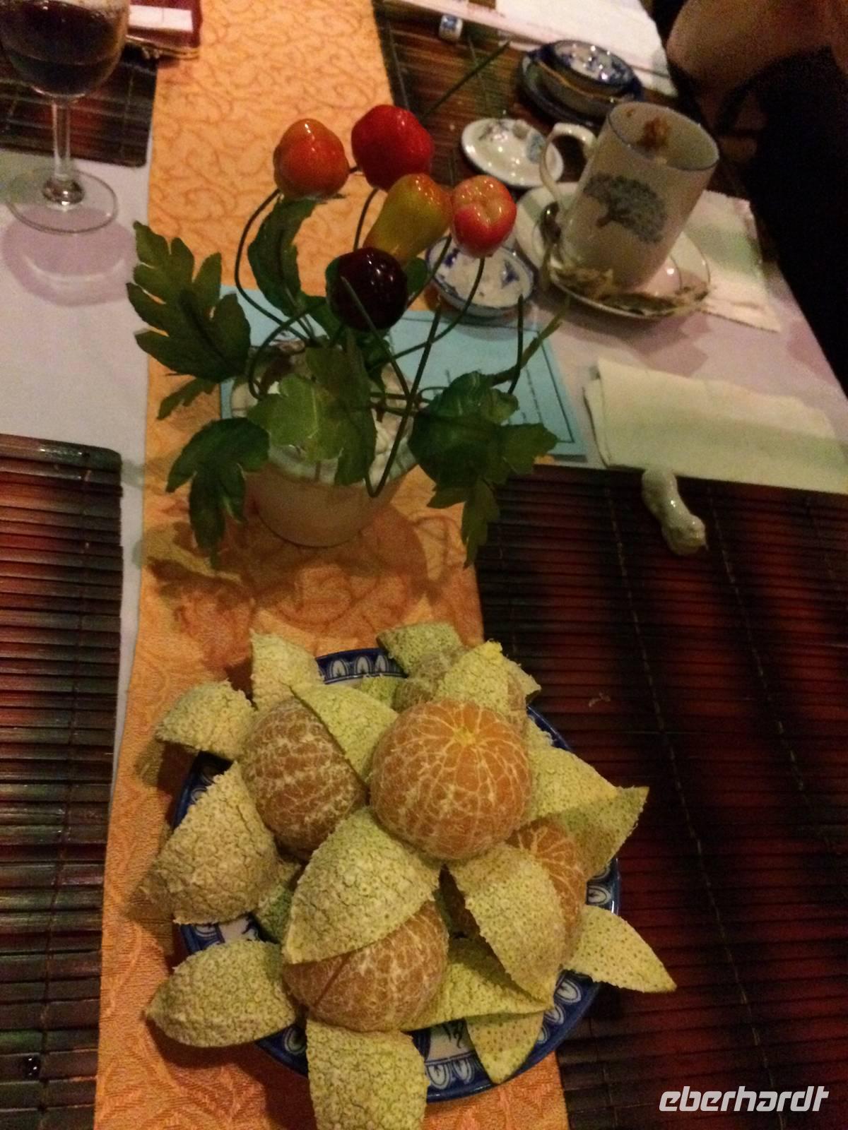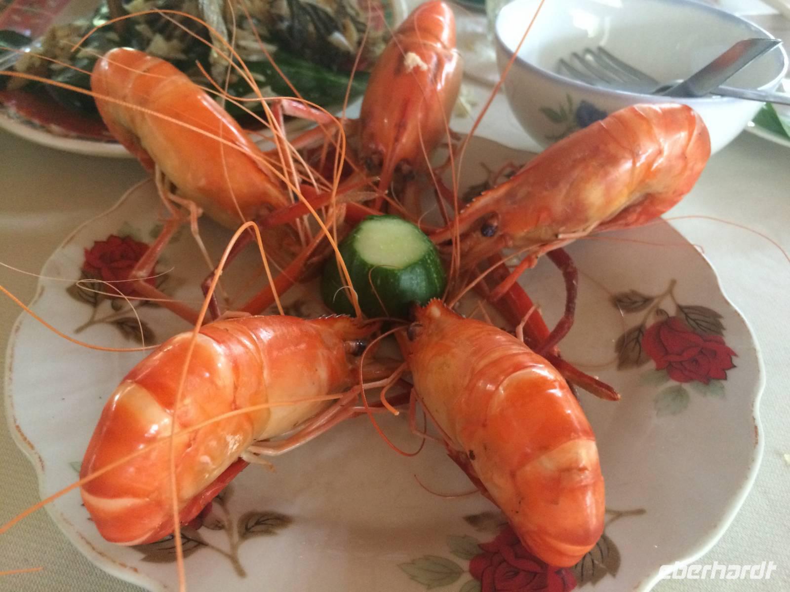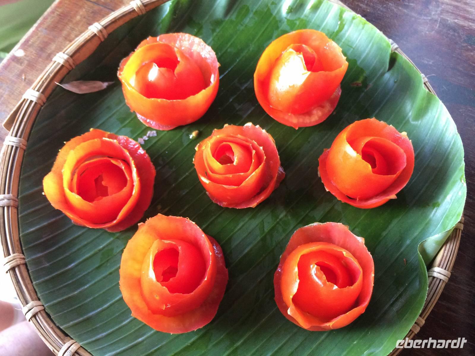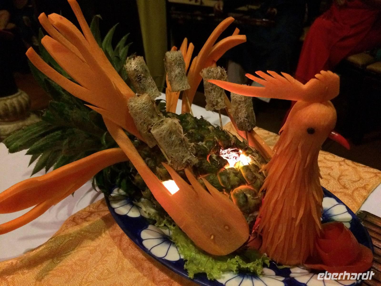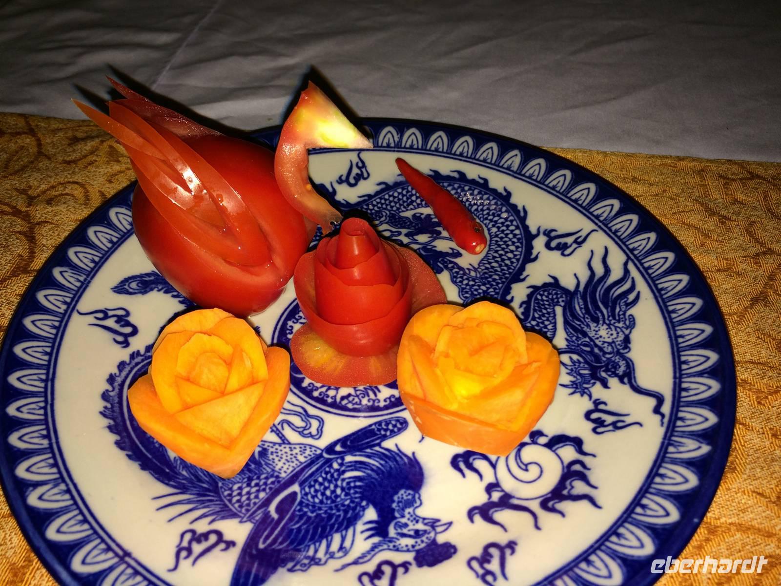Anh lädt zu einem kurzen Ausflug in ein kleines Fischerdorf und in die Provinzhauptstadt Vung Tau ein, in der wir eine Christusstatue auf dem Berg sehen, die an den Zuckerhut erinnert. Bei einem Schnitzkurs lernen wir das Handwerk Knoblauch, Tomaten, Gurken und Karotten zu verzieren. Das Ergebnis wird entsprechend unseren Bemühungen auch von den anderen Reisegästen zum Abendessen gelobt. Am Abend feieren wir bei Schokotorte und Reisschnaps Beatrix' Geburtstag, Ingeborg beschenkt uns mit einem Gedicht zu unserer Reise und wir legen die Füße auf der Strandcouch hoch, während wir unter dem Sternenhimmel einen Cocktail schlürfen. Paradies pur! Am dritten Abend fliegen wir nach Siem Reap. Relative zügig geht es vorbei an charmante Grenzbeamte und den Sicherheitskontrollen. Nun heißt es: Surseday Campuchea!