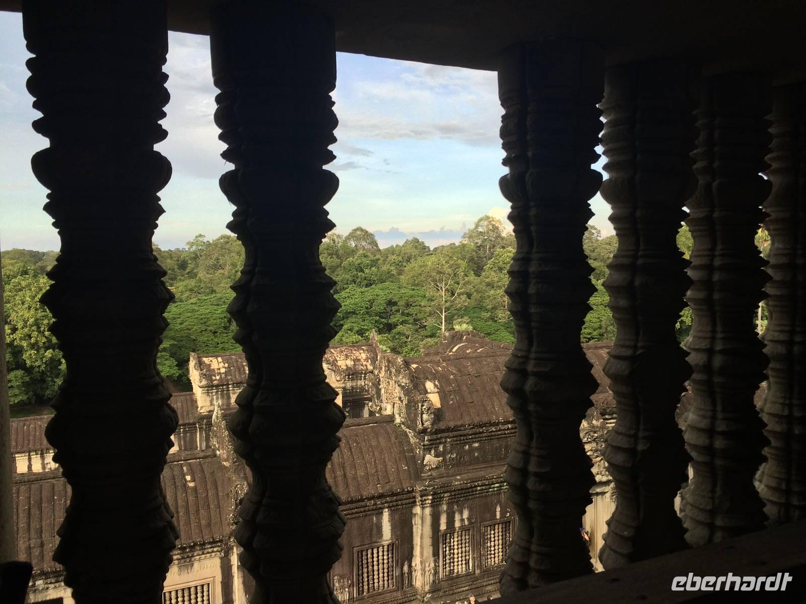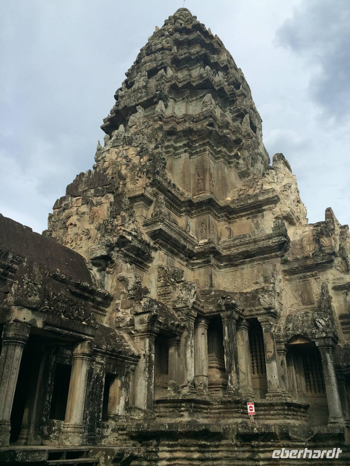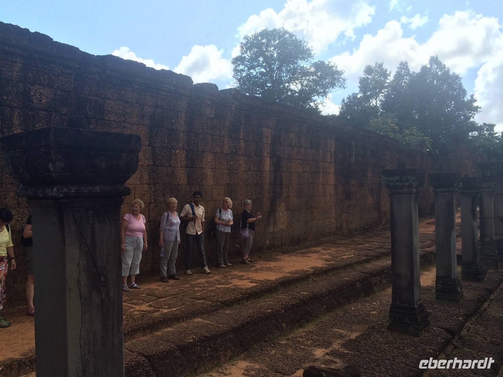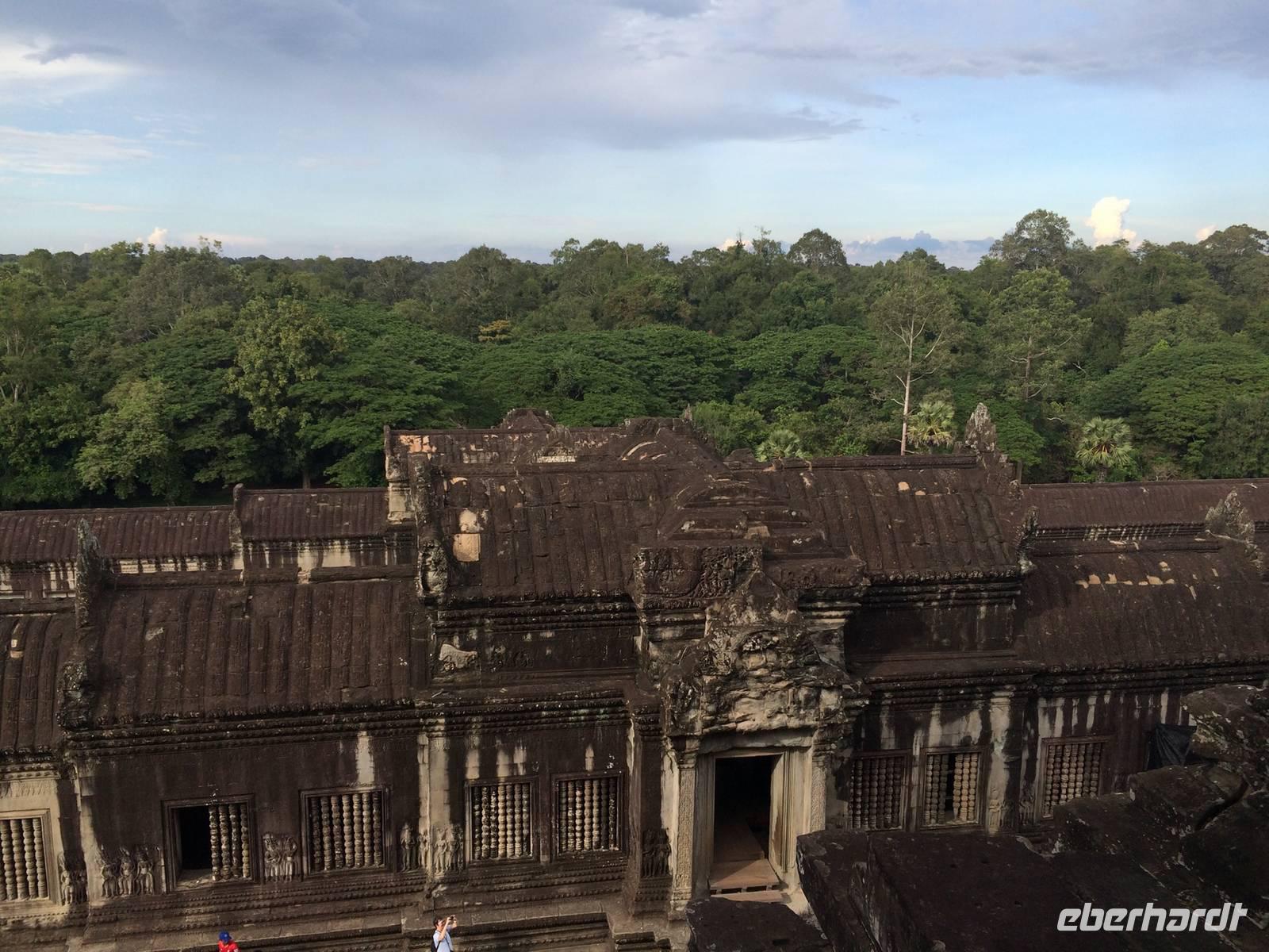 Vom Bayon gehen wir dann weiter zur Elefantenterrasse, die ihren Namen durch die Reliefdarstellung von Elefanten bekommen hat. Sie hat eine Länge von 300 Metern, hier nahm der Herrscher früher Paraden ab. San führt uns zu kleineren Tempeln und dem Königspalast, von dem leider nur noch Ruinen vorhanden sind. Die Könige und Mönche haben damals nie in den Tempeln gelebt, sondern in Holzkonstruktionen außerhalb der Tempel.Nach einem leckeren Mirtagessen, bei dem wir Spezialitäten wie Lok Lak-Rindfleisch oder Amok mit Kokosmilch probieren dürfen, geht es zum berühmten unter König Suryavarmann II. erbaute Angkor Wat. Da es sich hier um eine weltberühmte UNESCO-Kulturerbestätte handelt, sind wir nicht die einzigen Besucher. Ca. 6.000 Menschen besuchen jeden Tag das Herz des Khmer-Reiches.Angkor Wat ist das Symbol des kambodschanischen Nationalstolzes. Über eine steinerne Brücke überqueren wir den erstaunlich riesigen Wassergraben und durchschritten den Innenhof. Tuan teilt uns mit viel Enthusiasmus sein großes Fachwissen und erklärte uns die opulenten Reliefs und Lotusornamente der drei Ebenen. "Die wahre Schönheit liegt in den Details.", so unser Reiseleiter. Er erzählt uns von der Legende des Quirlen des Milchmeeres und erklärt das architektonische Prinzip der Turmbauten, das sich die Lotusblüte als Vorbild nahm und auch die immer wiederkehrenden Motive in den Wandverzierungen. Es gibt fast keinen Stein in der Gallerie, der nicht mit Verzierungen versehen ist. Immer wiederkehrendes Motiv sind auch Apsara-Tänzerinnen, sowie Statuen von Vishnu und Shiva. Nach unseren Tagen in Angkor werden wir wahrscheinlich zwei Worte nie vergessen: Apsara, Vishnu, Shiva und Lotusblüte.San lässt uns noch weitere Höhen im wahrsten Sinne des Wortes erklimmen, hinauf auf den Tempel. Die dritte Ebene zu erreichen, ist nicht ganz einfach: Trotz der vorhergesagten heißen Tropentemperaturen war es Pflicht, knie-und schulterbedeckte Kleidung zu tragen und es war eine recht steile Treppe zu erklimmen - doch die ganze Mühe lohnt sich! Aus über fünfzig Meter Höhe bieten sich fantastische Ausblicke auf die Angkor-Anlage. Die Meditationsräume hier oben sind allerdings nicht mehr so dicht verziert wie in den Gallerien im unteren Bereich.Dennoch fasziniert und tief beeindruckt von den großartigen Meisterwerken kehren wir zu unserem Hotel zurück.