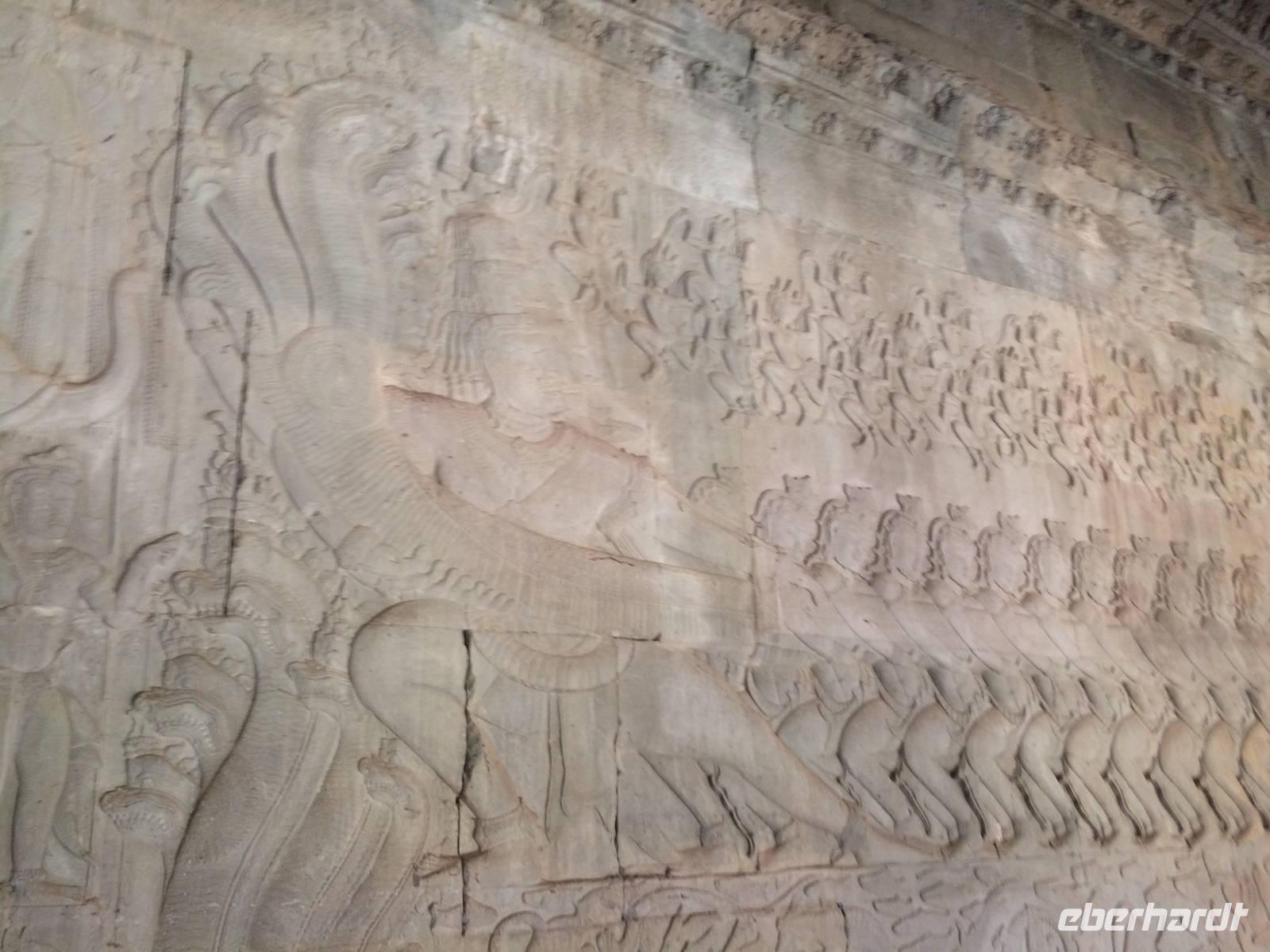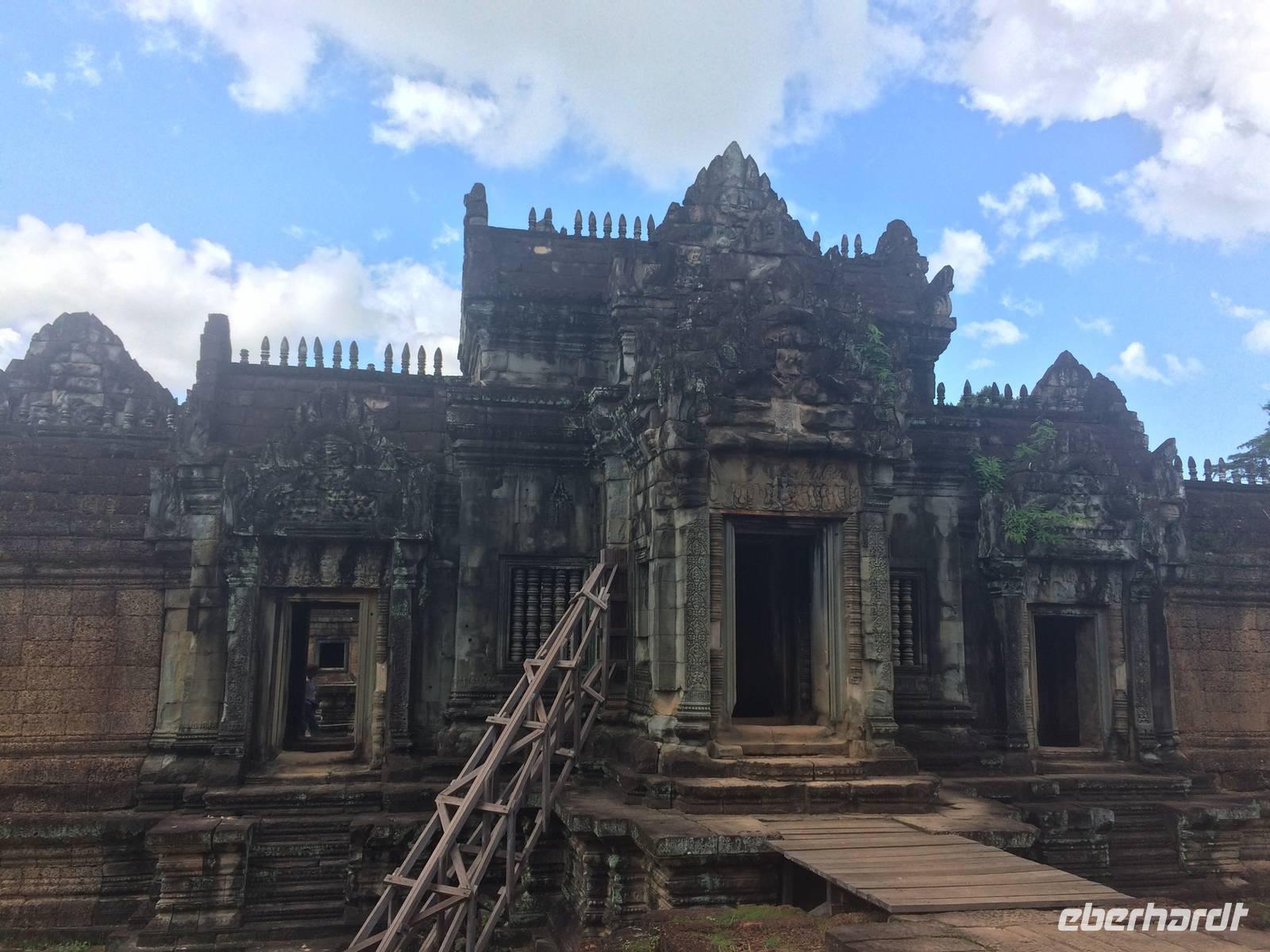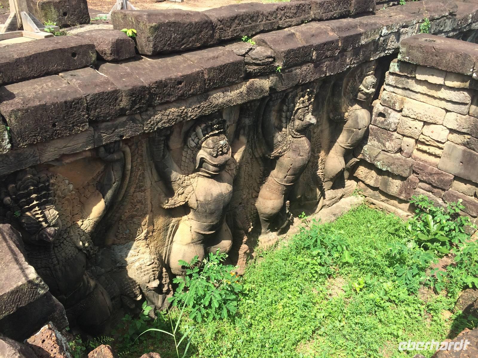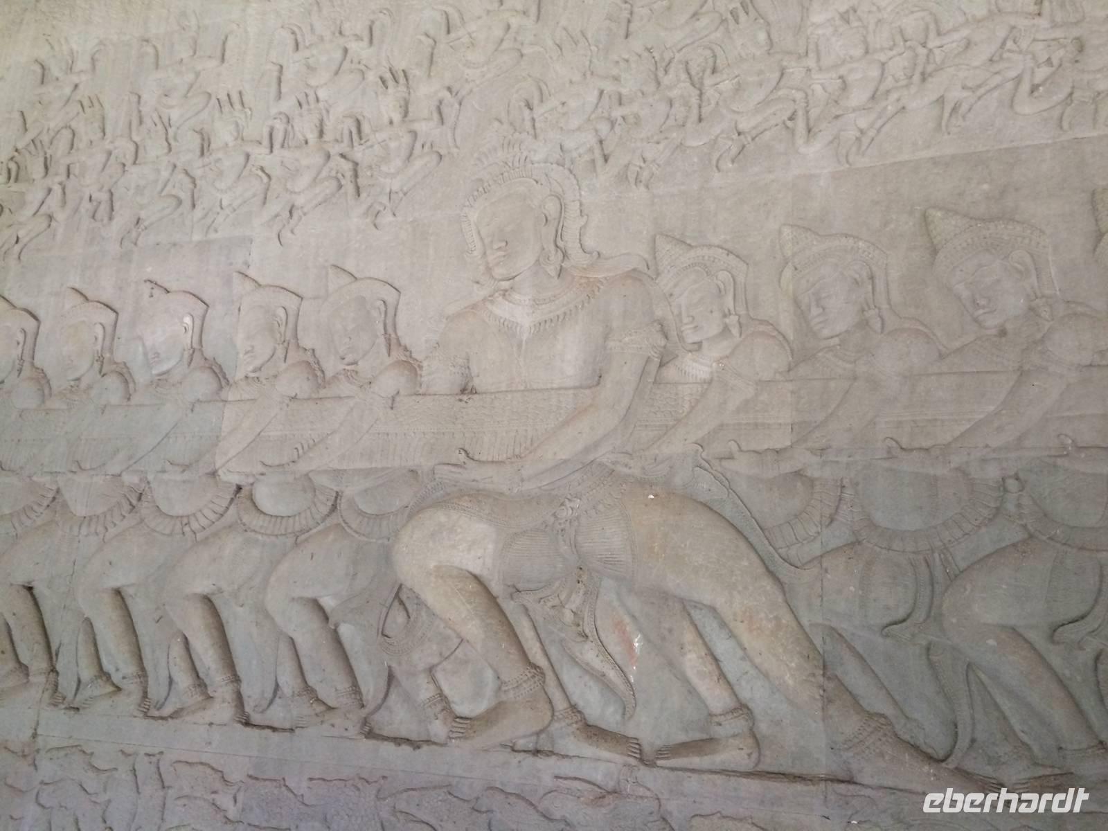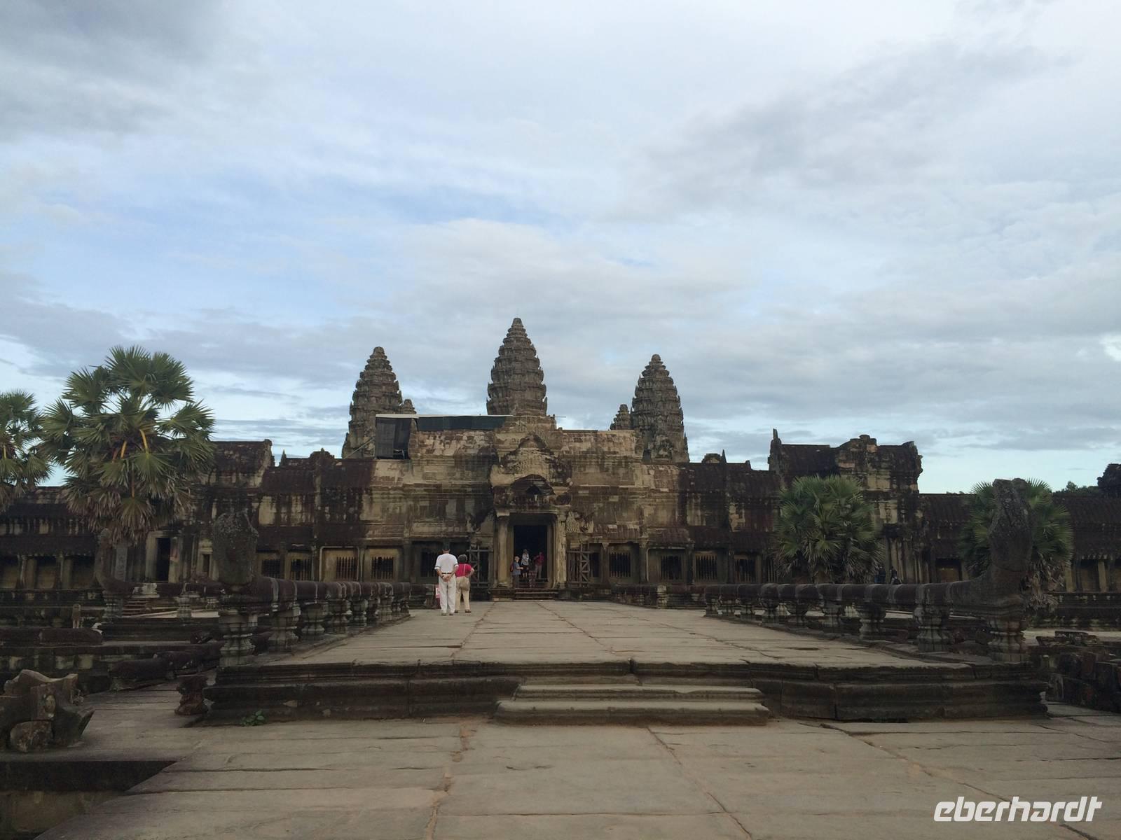 Vom Bayon gehen wir dann weiter zur Elefantenterrasse, die ihren Namen durch die Reliefdarstellung von Elefanten bekommen hat. Sie hat eine Länge von 300 Metern, hier nahm der Herrscher früher Paraden ab. San führt uns zu kleineren Tempeln und dem Königspalast, von dem leider nur noch Ruinen vorhanden sind. Die Könige und Mönche haben damals nie in den Tempeln gelebt, sondern in Holzkonstruktionen außerhalb der Tempel.Nach einem leckeren Mirtagessen, bei dem wir Spezialitäten wie Lok Lak-Rindfleisch oder Amok mit Kokosmilch probieren dürfen, geht es zum berühmten unter König Suryavarmann II. erbaute Angkor Wat. Da es sich hier um eine weltberühmte UNESCO-Kulturerbestätte handelt, sind wir nicht die einzigen Besucher. Ca. 6.000 Menschen besuchen jeden Tag das Herz des Khmer-Reiches.Angkor Wat ist das Symbol des kambodschanischen Nationalstolzes. Über eine steinerne Brücke überqueren wir den erstaunlich riesigen Wassergraben und durchschritten den Innenhof. Tuan teilt uns mit viel Enthusiasmus sein großes Fachwissen und erklärte uns die opulenten Reliefs und Lotusornamente der drei Ebenen. "Die wahre Schönheit liegt in den Details.", so unser Reiseleiter. Er erzählt uns von der Legende des Quirlen des Milchmeeres und erklärt das architektonische Prinzip der Turmbauten, das sich die Lotusblüte als Vorbild nahm und auch die immer wiederkehrenden Motive in den Wandverzierungen. Es gibt fast keinen Stein in der Gallerie, der nicht mit Verzierungen versehen ist. Immer wiederkehrendes Motiv sind auch Apsara-Tänzerinnen, sowie Statuen von Vishnu und Shiva. Nach unseren Tagen in Angkor werden wir wahrscheinlich zwei Worte nie vergessen: Apsara, Vishnu, Shiva und Lotusblüte.San lässt uns noch weitere Höhen im wahrsten Sinne des Wortes erklimmen, hinauf auf den Tempel. Die dritte Ebene zu erreichen, ist nicht ganz einfach: Trotz der vorhergesagten heißen Tropentemperaturen war es Pflicht, knie-und schulterbedeckte Kleidung zu tragen und es war eine recht steile Treppe zu erklimmen - doch die ganze Mühe lohnt sich! Aus über fünfzig Meter Höhe bieten sich fantastische Ausblicke auf die Angkor-Anlage. Die Meditationsräume hier oben sind allerdings nicht mehr so dicht verziert wie in den Gallerien im unteren Bereich.Dennoch fasziniert und tief beeindruckt von den großartigen Meisterwerken kehren wir zu unserem Hotel zurück.