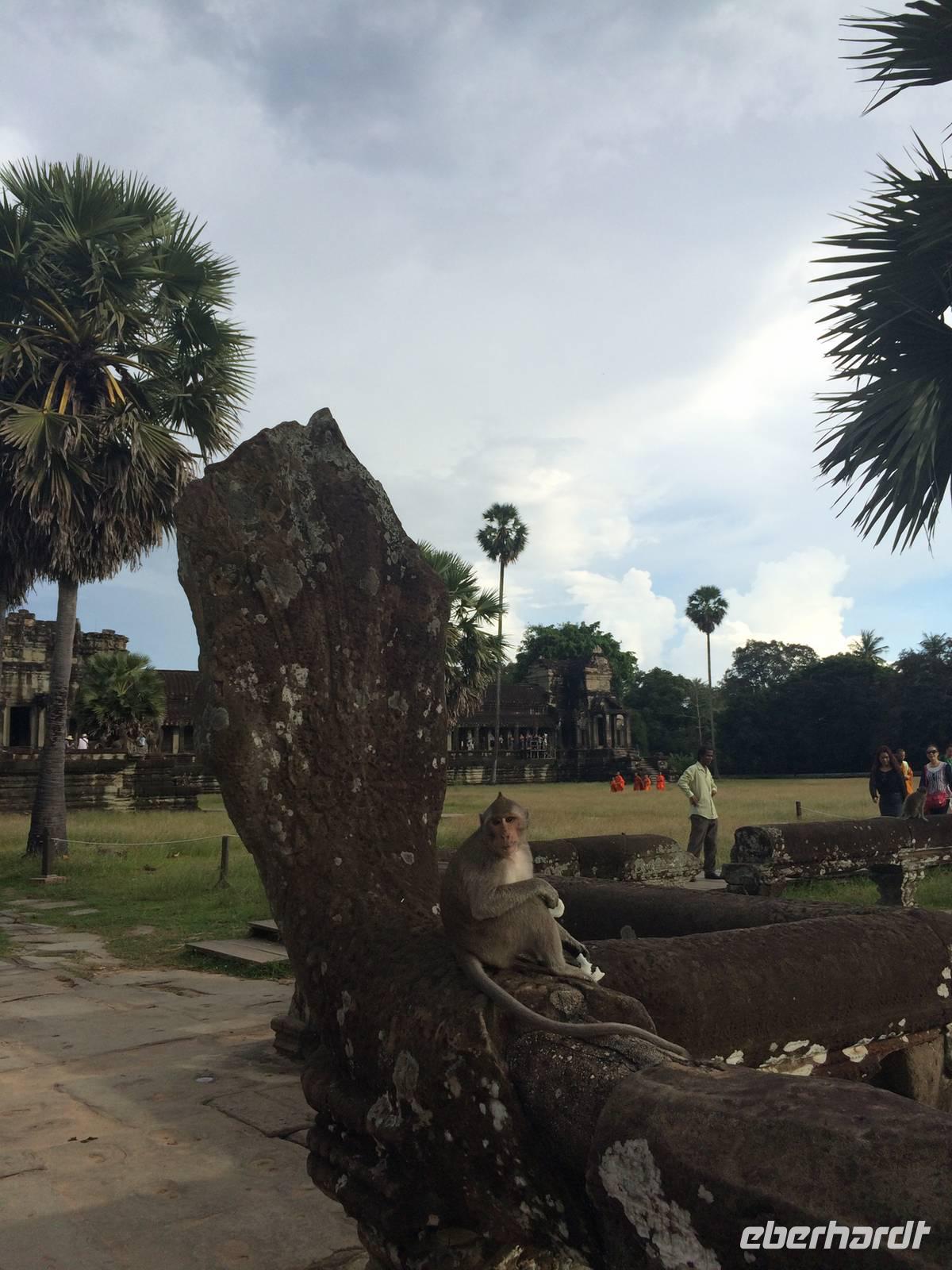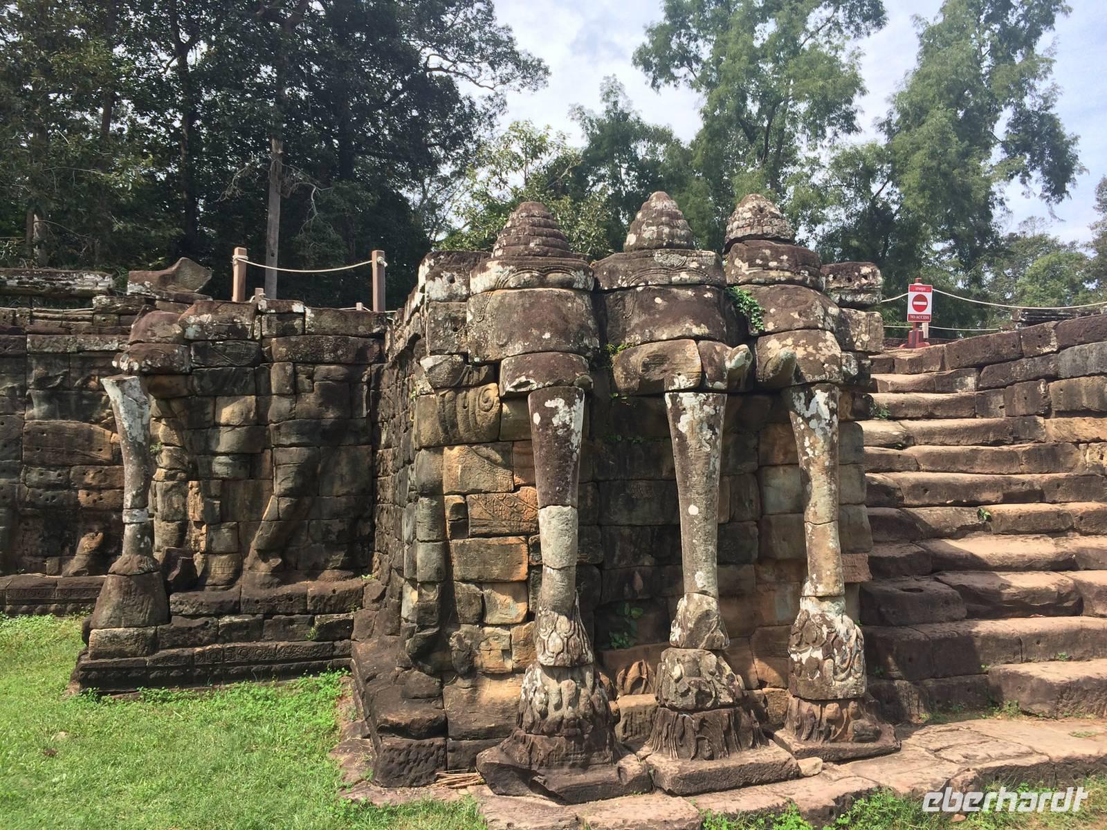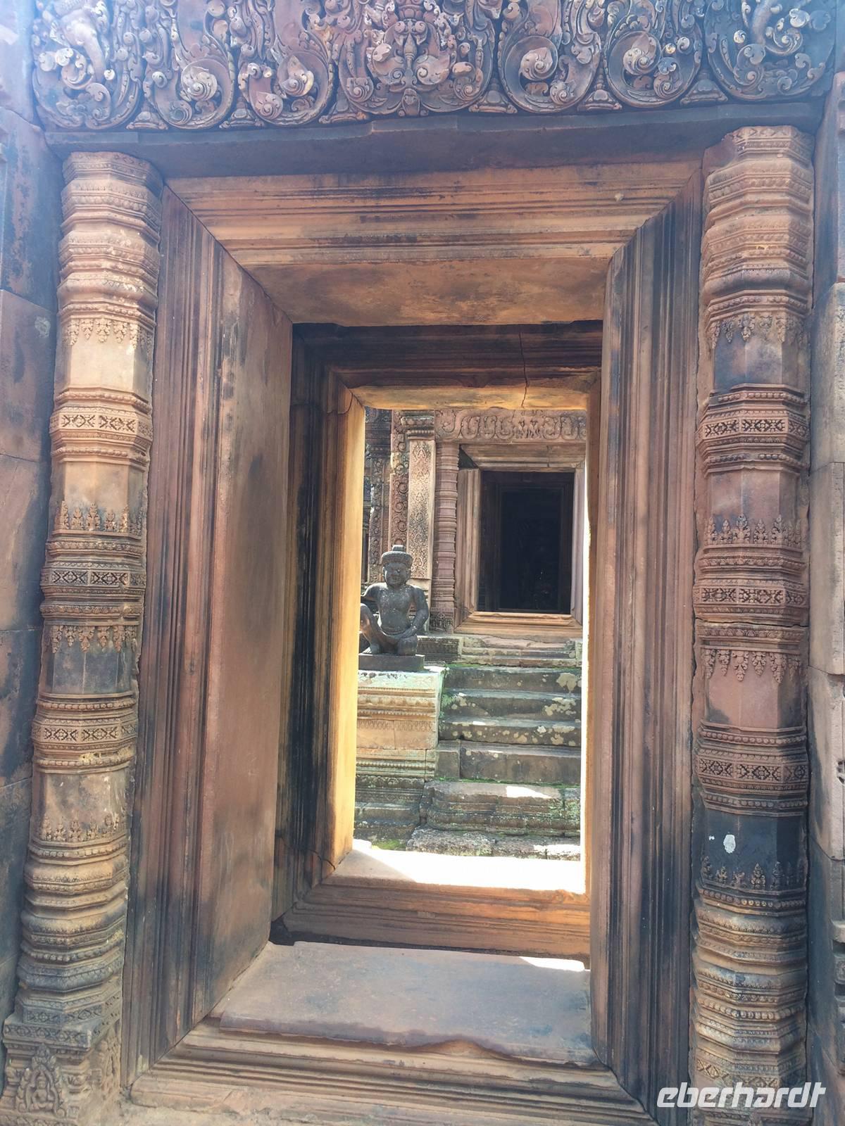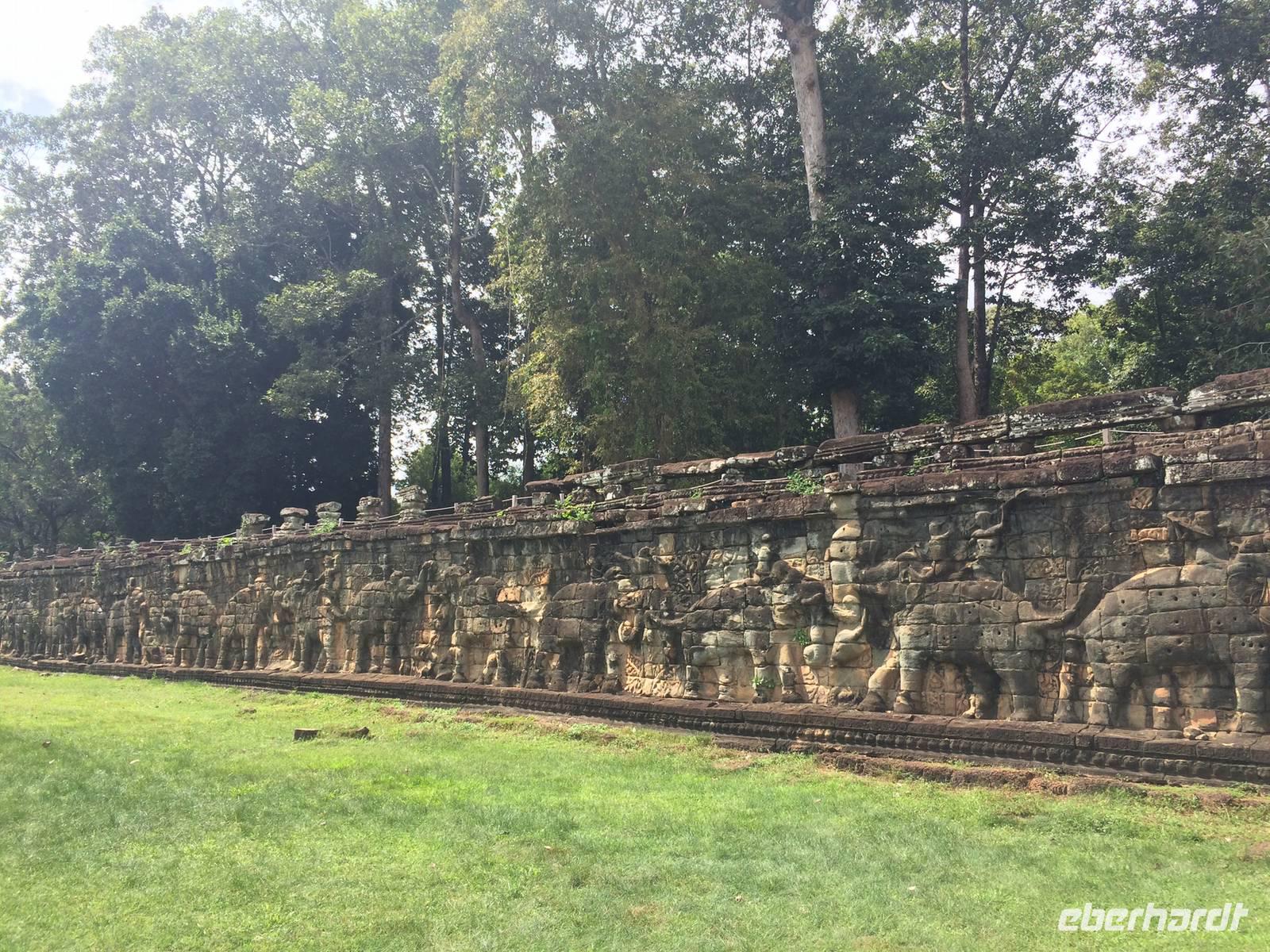 Vom Bayon gehen wir dann weiter zur Elefantenterrasse, die ihren Namen durch die Reliefdarstellung von Elefanten bekommen hat. Sie hat eine Länge von 300 Metern, hier nahm der Herrscher früher Paraden ab. San führt uns zu kleineren Tempeln und dem Königspalast, von dem leider nur noch Ruinen vorhanden sind. Die Könige und Mönche haben damals nie in den Tempeln gelebt, sondern in Holzkonstruktionen außerhalb der Tempel.Nach einem leckeren Mirtagessen, bei dem wir Spezialitäten wie Lok Lak-Rindfleisch oder Amok mit Kokosmilch probieren dürfen, geht es zum berühmten unter König Suryavarmann II. erbaute Angkor Wat. Da es sich hier um eine weltberühmte UNESCO-Kulturerbestätte handelt, sind wir nicht die einzigen Besucher. Ca. 6.000 Menschen besuchen jeden Tag das Herz des Khmer-Reiches.Angkor Wat ist das Symbol des kambodschanischen Nationalstolzes. Über eine steinerne Brücke überqueren wir den erstaunlich riesigen Wassergraben und durchschritten den Innenhof. Tuan teilt uns mit viel Enthusiasmus sein großes Fachwissen und erklärte uns die opulenten Reliefs und Lotusornamente der drei Ebenen. "Die wahre Schönheit liegt in den Details.", so unser Reiseleiter. Er erzählt uns von der Legende des Quirlen des Milchmeeres und erklärt das architektonische Prinzip der Turmbauten, das sich die Lotusblüte als Vorbild nahm und auch die immer wiederkehrenden Motive in den Wandverzierungen. Es gibt fast keinen Stein in der Gallerie, der nicht mit Verzierungen versehen ist. Immer wiederkehrendes Motiv sind auch Apsara-Tänzerinnen, sowie Statuen von Vishnu und Shiva. Nach unseren Tagen in Angkor werden wir wahrscheinlich zwei Worte nie vergessen: Apsara, Vishnu, Shiva und Lotusblüte.San lässt uns noch weitere Höhen im wahrsten Sinne des Wortes erklimmen, hinauf auf den Tempel. Die dritte Ebene zu erreichen, ist nicht ganz einfach: Trotz der vorhergesagten heißen Tropentemperaturen war es Pflicht, knie-und schulterbedeckte Kleidung zu tragen und es war eine recht steile Treppe zu erklimmen - doch die ganze Mühe lohnt sich! Aus über fünfzig Meter Höhe bieten sich fantastische Ausblicke auf die Angkor-Anlage. Die Meditationsräume hier oben sind allerdings nicht mehr so dicht verziert wie in den Gallerien im unteren Bereich.Dennoch fasziniert und tief beeindruckt von den großartigen Meisterwerken kehren wir zu unserem Hotel zurück.