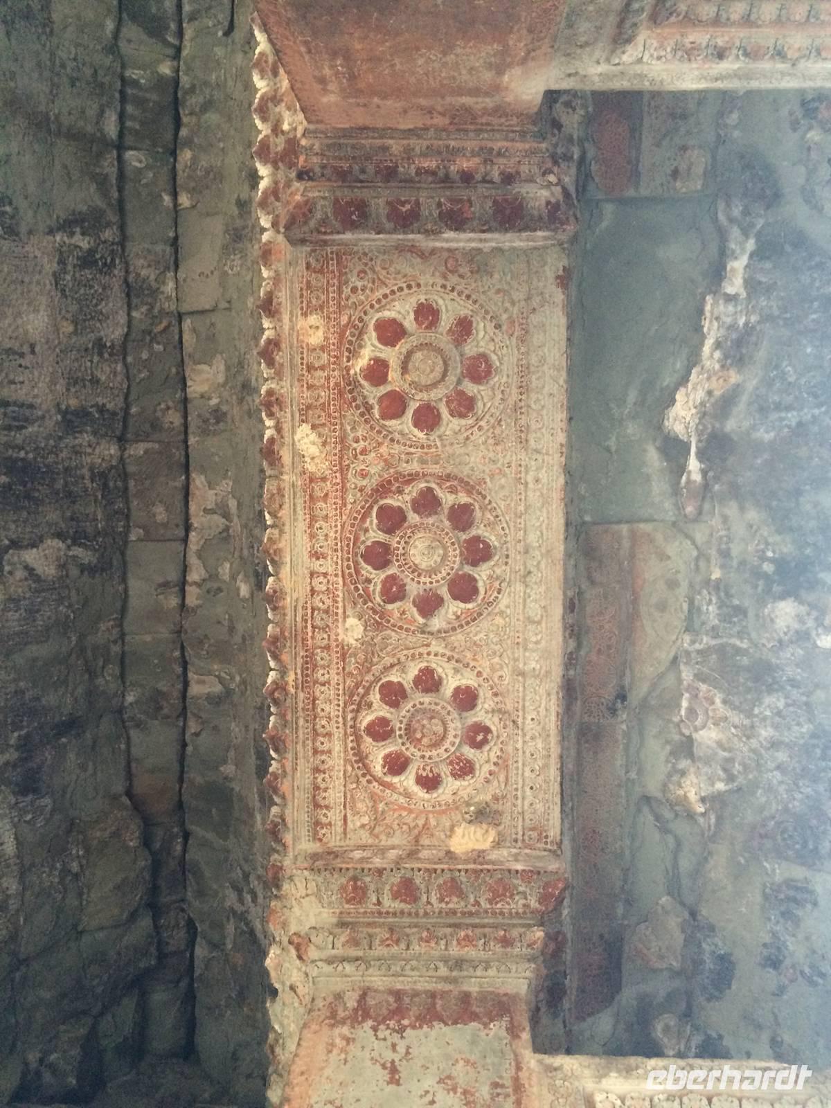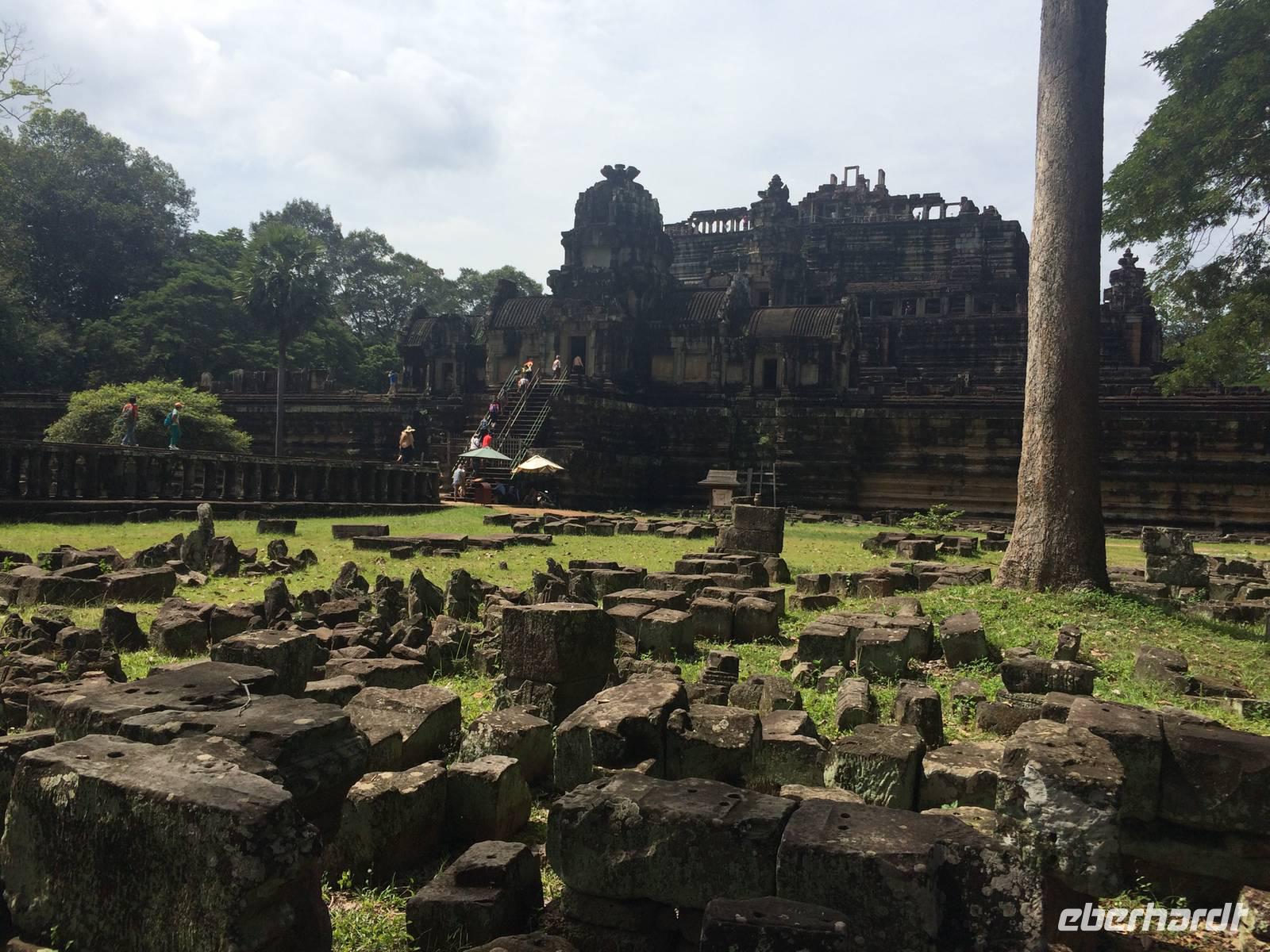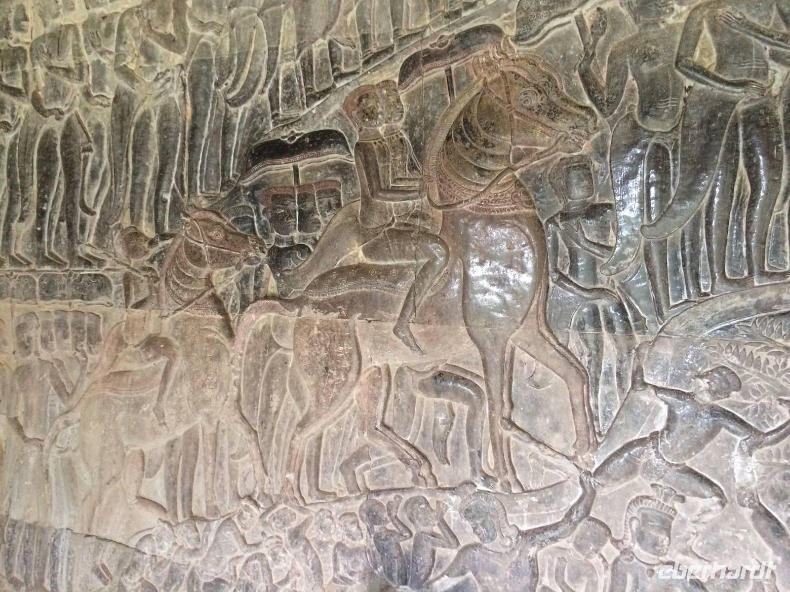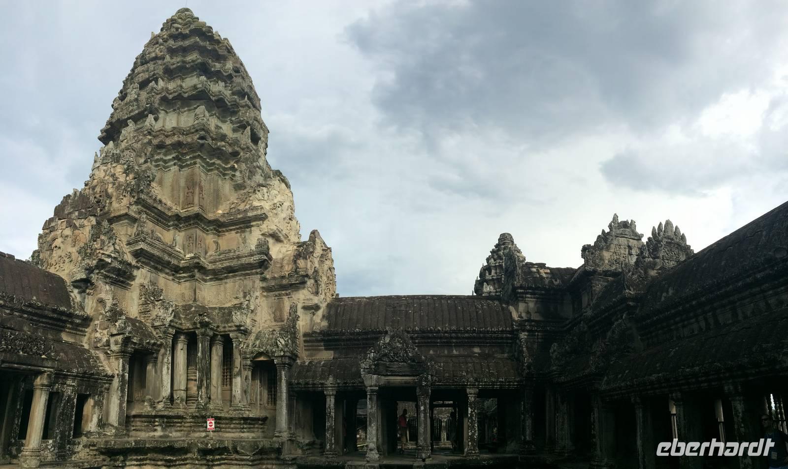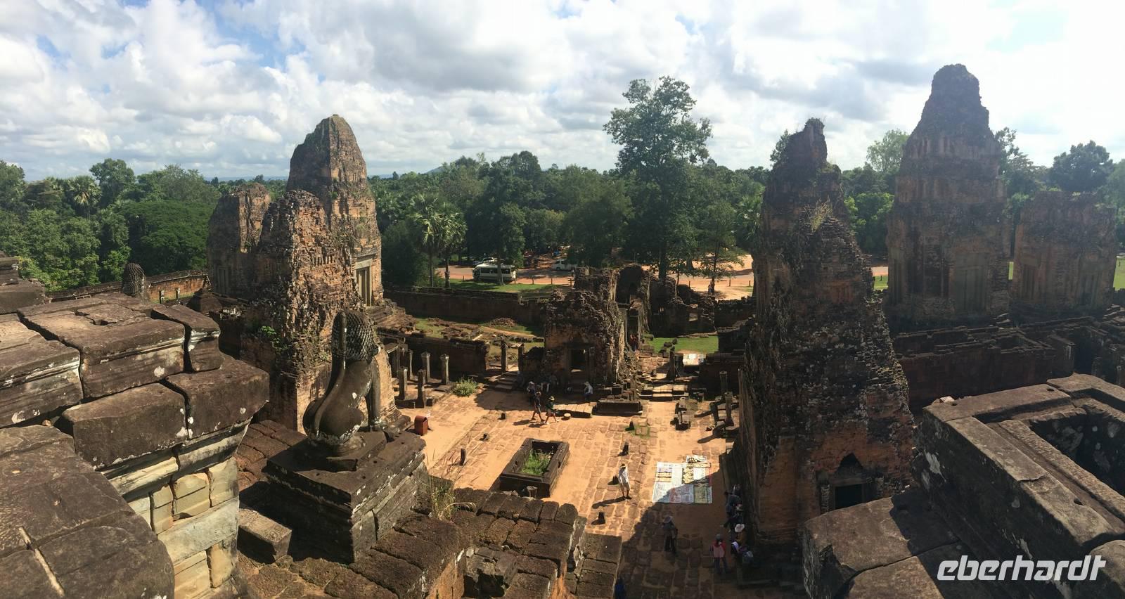 Vom Bayon gehen wir dann weiter zur Elefantenterrasse, die ihren Namen durch die Reliefdarstellung von Elefanten bekommen hat. Sie hat eine Länge von 300 Metern, hier nahm der Herrscher früher Paraden ab. San führt uns zu kleineren Tempeln und dem Königspalast, von dem leider nur noch Ruinen vorhanden sind. Die Könige und Mönche haben damals nie in den Tempeln gelebt, sondern in Holzkonstruktionen außerhalb der Tempel.Nach einem leckeren Mirtagessen, bei dem wir Spezialitäten wie Lok Lak-Rindfleisch oder Amok mit Kokosmilch probieren dürfen, geht es zum berühmten unter König Suryavarmann II. erbaute Angkor Wat. Da es sich hier um eine weltberühmte UNESCO-Kulturerbestätte handelt, sind wir nicht die einzigen Besucher. Ca. 6.000 Menschen besuchen jeden Tag das Herz des Khmer-Reiches.Angkor Wat ist das Symbol des kambodschanischen Nationalstolzes. Über eine steinerne Brücke überqueren wir den erstaunlich riesigen Wassergraben und durchschritten den Innenhof. Tuan teilt uns mit viel Enthusiasmus sein großes Fachwissen und erklärte uns die opulenten Reliefs und Lotusornamente der drei Ebenen. "Die wahre Schönheit liegt in den Details.", so unser Reiseleiter. Er erzählt uns von der Legende des Quirlen des Milchmeeres und erklärt das architektonische Prinzip der Turmbauten, das sich die Lotusblüte als Vorbild nahm und auch die immer wiederkehrenden Motive in den Wandverzierungen. Es gibt fast keinen Stein in der Gallerie, der nicht mit Verzierungen versehen ist. Immer wiederkehrendes Motiv sind auch Apsara-Tänzerinnen, sowie Statuen von Vishnu und Shiva. Nach unseren Tagen in Angkor werden wir wahrscheinlich zwei Worte nie vergessen: Apsara, Vishnu, Shiva und Lotusblüte.San lässt uns noch weitere Höhen im wahrsten Sinne des Wortes erklimmen, hinauf auf den Tempel. Die dritte Ebene zu erreichen, ist nicht ganz einfach: Trotz der vorhergesagten heißen Tropentemperaturen war es Pflicht, knie-und schulterbedeckte Kleidung zu tragen und es war eine recht steile Treppe zu erklimmen - doch die ganze Mühe lohnt sich! Aus über fünfzig Meter Höhe bieten sich fantastische Ausblicke auf die Angkor-Anlage. Die Meditationsräume hier oben sind allerdings nicht mehr so dicht verziert wie in den Gallerien im unteren Bereich.Dennoch fasziniert und tief beeindruckt von den großartigen Meisterwerken kehren wir zu unserem Hotel zurück.