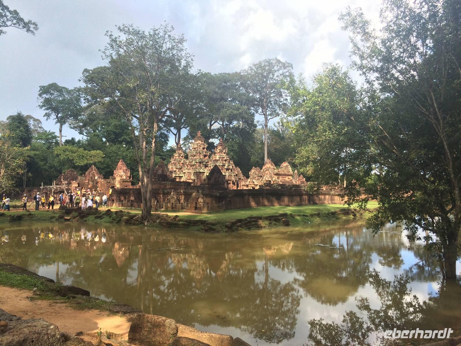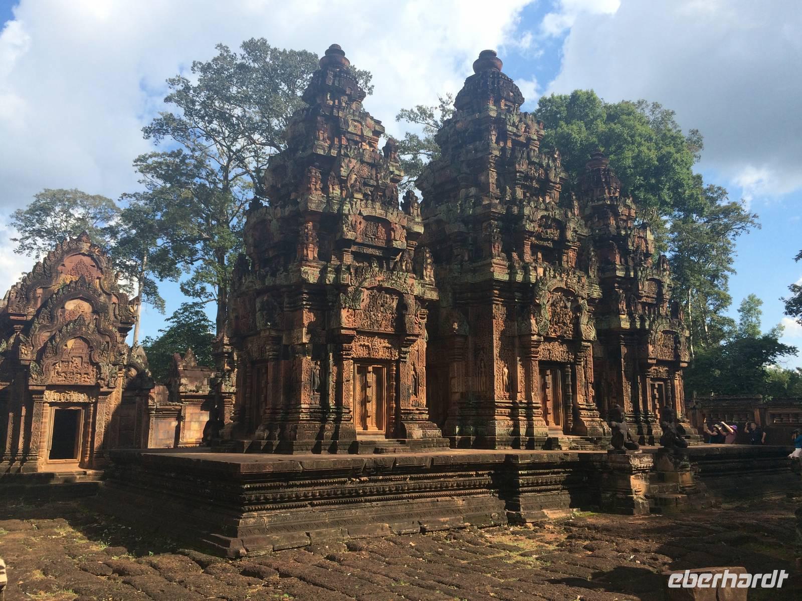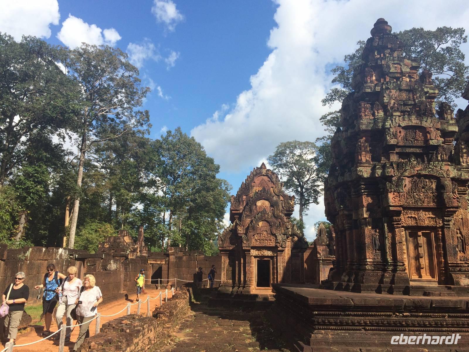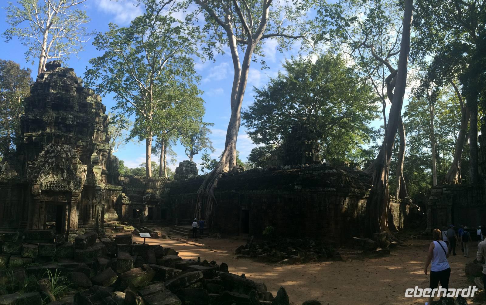 Frisch und munter sind wir am Morgen bereit für die nächste Etappe. Der Tempel Ta Prohm (auch Dschungeltempel genannt) steht bevor und wir können es kaum erwarten. Errichtet wurde Ta Prohm vom späten 12. bis hinein ins 13. Jahrhundert. Majestätisch stehen die Bäume über den Ruinen, haben sie sich einverleibt. Über den Mauern der wuchtigen Reste des Tempels schlingen sich die Wurzeln noch riesigerer Bäume wie Schlangen bis zum Boden hinab und bilden ein irreales Bild. Die Natur holt sich mit brachialer Gewalt das zurück, was ihr einst genommen wurde: Lebensraum der Urgewächse. Sie gestaltet das von Menschen Geschaffene und Verbliebene um, nach Lust und Laune. Der Mensch lässt gewähren oder greift ein. Was hier richtig ist, vermag keiner der Betrachter zu entscheiden. Dieser Anblick hat etwas von Einmaligkeit. Wir sehen Konservierungsmaßnahmen im inneren Bereich des Tempels, dort wo die Riesen noch nicht wirksam wurden. Und richtig: der Entschluss der Verantwortlichen lautet: der Tempel ist aufgegeben; er ist, so wie er ist, Besuchermagnet und wird es bleiben, die Vegetation und die herabgefallenen Mauersteine werden nur soweit entfernt und gesichert, dass es Besuchern möglich ist, die Anlage zu begehen. Besonders eindrucksvoll sind eben die Würgefeigen, riesigen Fikus und die noch größeren "Tetrameles nudiflora", deren Wurzeln sichtlich ganze Gebäude überwachsen und mehrere 10m hoch aufragen können. Das Holz ist weich und die Blätter leicht flaumig. Ein deutscher Name für das Gewächs aus der Ordnung der Kürbisartigen ist unbekannt, allerdings gibt es Trivialnamen in den Verbreitungsgebieten. Die indische Entsprechung lautet Thitpok, das klingt am bekanntesten, einigen wir uns darauf.Gute 20 Kilometer fahren wir weiter hinaus ins Land, denn wir wollen uns dem nächsten Temepl widmen: Banteay Sambre (zu Deutschg Festung von Sambre), ist wie eine kleine Miniatur von Angkor Wat und den Tempel Pre Rup mit seinen ziegelroten Steinen. Er war der Haupttempel von König Rajendravarman II. und zu Ehren von den drei großen Hinduistischen Göttern Shiva, Vishnu und Brahma errichtet.Unterwegs halten wir in einem kleinen Dorf, dessen Bewohner sich mit der Herstellung von Palmzucker ihren Lebensunterhalt verdienen. San ist auch hier wieder mit seinen Erklärungen und vollem Körpereinsatz dabei. Schnell werden die letzten Andenken gekauft und es geht wieder in den Bus.Trotz der heißen 34 Grad und der unbarmherzig brennenden Sonne setzen wir unsere Erkundung mit dem Tempel Banteay Srei tapfer fort. Die Anlage stammt aus der Mitte des 10. Jh. und ist ein Juwel unter den Tempeln. Die Faszination stammt zweifellos vom Variantenreichtum seines Dekors. Die filigran gearbeiteten Ornamentverzierungen auf dem roten Sandstein - meist Blumen und Rankenwerk - überziehen die wichtigsten Gebäudeteile. Unwahrscheinlich viele Details gibt es zu entdecken, daher wird dieser auch Frauentempel genannt. Die Tempel von Angkor sind unglaublich faszinierend und es scheint, als hätten sie selbst nach tausend Jahren nichts von ihrer Schönheit eingebüßt.Wir dinieren heute in einer kambodschanischen Bierbrauerei. Aber es gibt nicht nur frisches Bier: Der Mekong Whisky aus Maniok muss noch dezimiert werden, bis zum Abflug morgen Abend nach Deutschland wird er Geschichte sein. Also stoßen wir auf eine gelungen Reise an und wünschen uns eine gute Heimreise für den nächsten Tag.