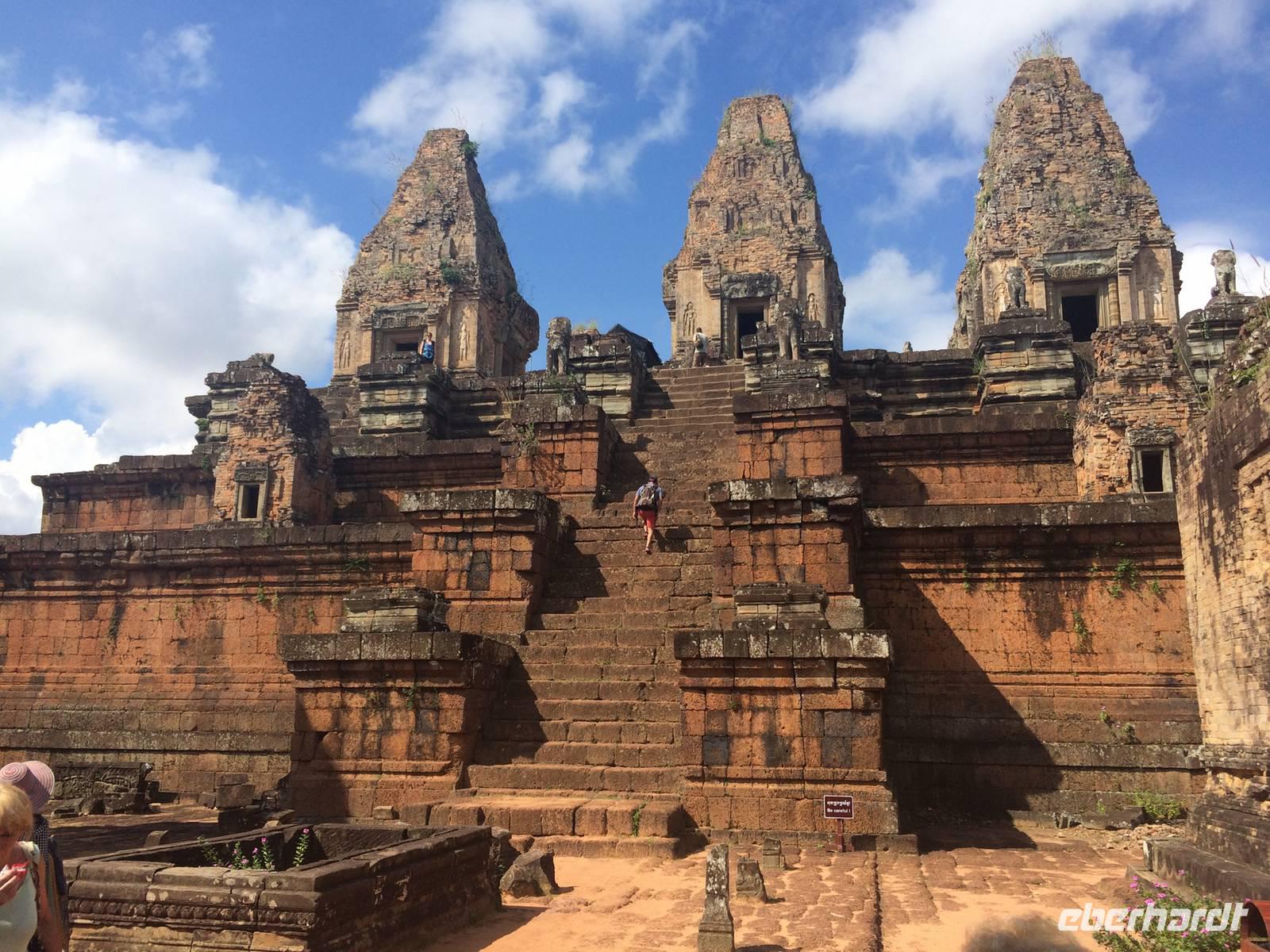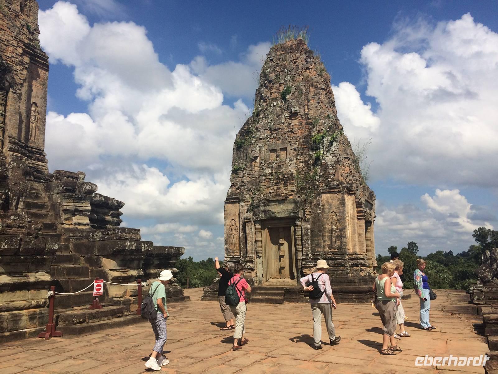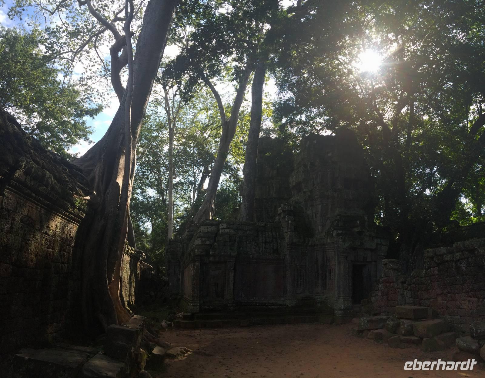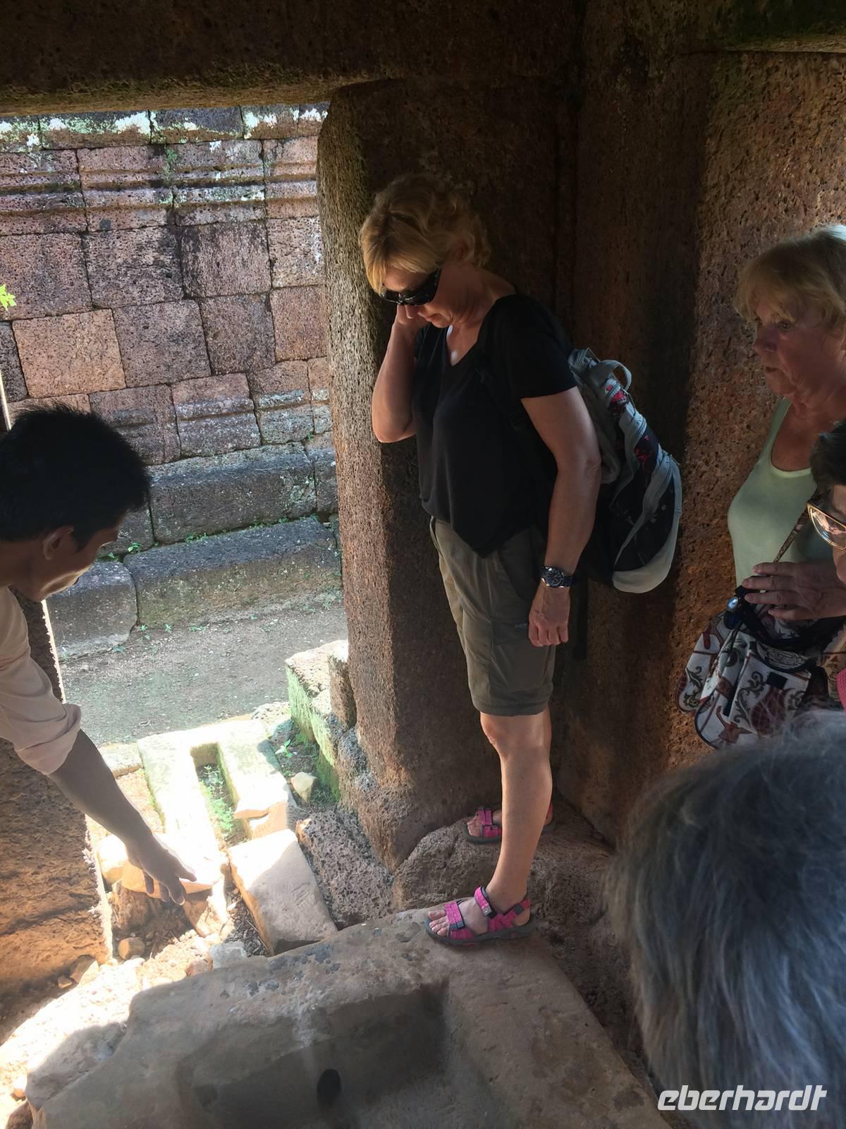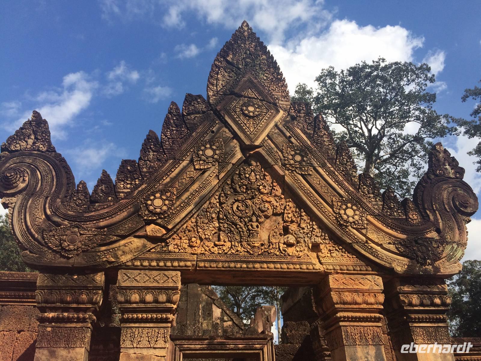 Frisch und munter sind wir am Morgen bereit für die nächste Etappe. Der Tempel Ta Prohm (auch Dschungeltempel genannt) steht bevor und wir können es kaum erwarten. Errichtet wurde Ta Prohm vom späten 12. bis hinein ins 13. Jahrhundert. Majestätisch stehen die Bäume über den Ruinen, haben sie sich einverleibt. Über den Mauern der wuchtigen Reste des Tempels schlingen sich die Wurzeln noch riesigerer Bäume wie Schlangen bis zum Boden hinab und bilden ein irreales Bild. Die Natur holt sich mit brachialer Gewalt das zurück, was ihr einst genommen wurde: Lebensraum der Urgewächse. Sie gestaltet das von Menschen Geschaffene und Verbliebene um, nach Lust und Laune. Der Mensch lässt gewähren oder greift ein. Was hier richtig ist, vermag keiner der Betrachter zu entscheiden. Dieser Anblick hat etwas von Einmaligkeit. Wir sehen Konservierungsmaßnahmen im inneren Bereich des Tempels, dort wo die Riesen noch nicht wirksam wurden. Und richtig: der Entschluss der Verantwortlichen lautet: der Tempel ist aufgegeben; er ist, so wie er ist, Besuchermagnet und wird es bleiben, die Vegetation und die herabgefallenen Mauersteine werden nur soweit entfernt und gesichert, dass es Besuchern möglich ist, die Anlage zu begehen. Besonders eindrucksvoll sind eben die Würgefeigen, riesigen Fikus und die noch größeren "Tetrameles nudiflora", deren Wurzeln sichtlich ganze Gebäude überwachsen und mehrere 10m hoch aufragen können. Das Holz ist weich und die Blätter leicht flaumig. Ein deutscher Name für das Gewächs aus der Ordnung der Kürbisartigen ist unbekannt, allerdings gibt es Trivialnamen in den Verbreitungsgebieten. Die indische Entsprechung lautet Thitpok, das klingt am bekanntesten, einigen wir uns darauf.Gute 20 Kilometer fahren wir weiter hinaus ins Land, denn wir wollen uns dem nächsten Temepl widmen: Banteay Sambre (zu Deutschg Festung von Sambre), ist wie eine kleine Miniatur von Angkor Wat und den Tempel Pre Rup mit seinen ziegelroten Steinen. Er war der Haupttempel von König Rajendravarman II. und zu Ehren von den drei großen Hinduistischen Göttern Shiva, Vishnu und Brahma errichtet.Unterwegs halten wir in einem kleinen Dorf, dessen Bewohner sich mit der Herstellung von Palmzucker ihren Lebensunterhalt verdienen. San ist auch hier wieder mit seinen Erklärungen und vollem Körpereinsatz dabei. Schnell werden die letzten Andenken gekauft und es geht wieder in den Bus.Trotz der heißen 34 Grad und der unbarmherzig brennenden Sonne setzen wir unsere Erkundung mit dem Tempel Banteay Srei tapfer fort. Die Anlage stammt aus der Mitte des 10. Jh. und ist ein Juwel unter den Tempeln. Die Faszination stammt zweifellos vom Variantenreichtum seines Dekors. Die filigran gearbeiteten Ornamentverzierungen auf dem roten Sandstein - meist Blumen und Rankenwerk - überziehen die wichtigsten Gebäudeteile. Unwahrscheinlich viele Details gibt es zu entdecken, daher wird dieser auch Frauentempel genannt. Die Tempel von Angkor sind unglaublich faszinierend und es scheint, als hätten sie selbst nach tausend Jahren nichts von ihrer Schönheit eingebüßt.Wir dinieren heute in einer kambodschanischen Bierbrauerei. Aber es gibt nicht nur frisches Bier: Der Mekong Whisky aus Maniok muss noch dezimiert werden, bis zum Abflug morgen Abend nach Deutschland wird er Geschichte sein. Also stoßen wir auf eine gelungen Reise an und wünschen uns eine gute Heimreise für den nächsten Tag.