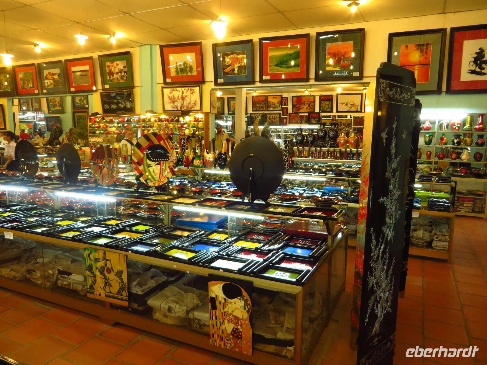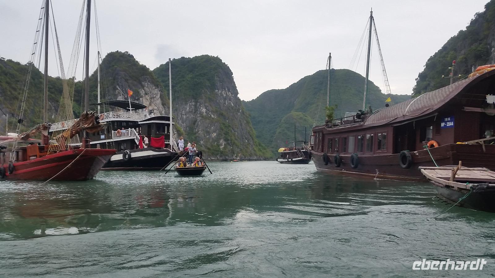 Unser Wecker klingelte heute ein wenig zeitiger, da wir eine längere Fahrt in die schöne Halong Bucht vor uns hatten. Auf dem Weg dorthin schauten wir wieder gespannt dem asiatischen Straßentreiben zu und amüsierten uns über das ein oder andere spektakuläre Aufsehen. Auch legten wir einen Stopp an einer großen Fabrikhalle ein, welche allerhand Schmuckstücke für uns zu bieten hatte. Neugierig betrachteten wir die Einzelstücke, probierten ein paar außergewöhnliche Kleidungsstücke an oder kauften bereits die ein oder andere Kleinigkeit für unsere Liebsten zuhause.
