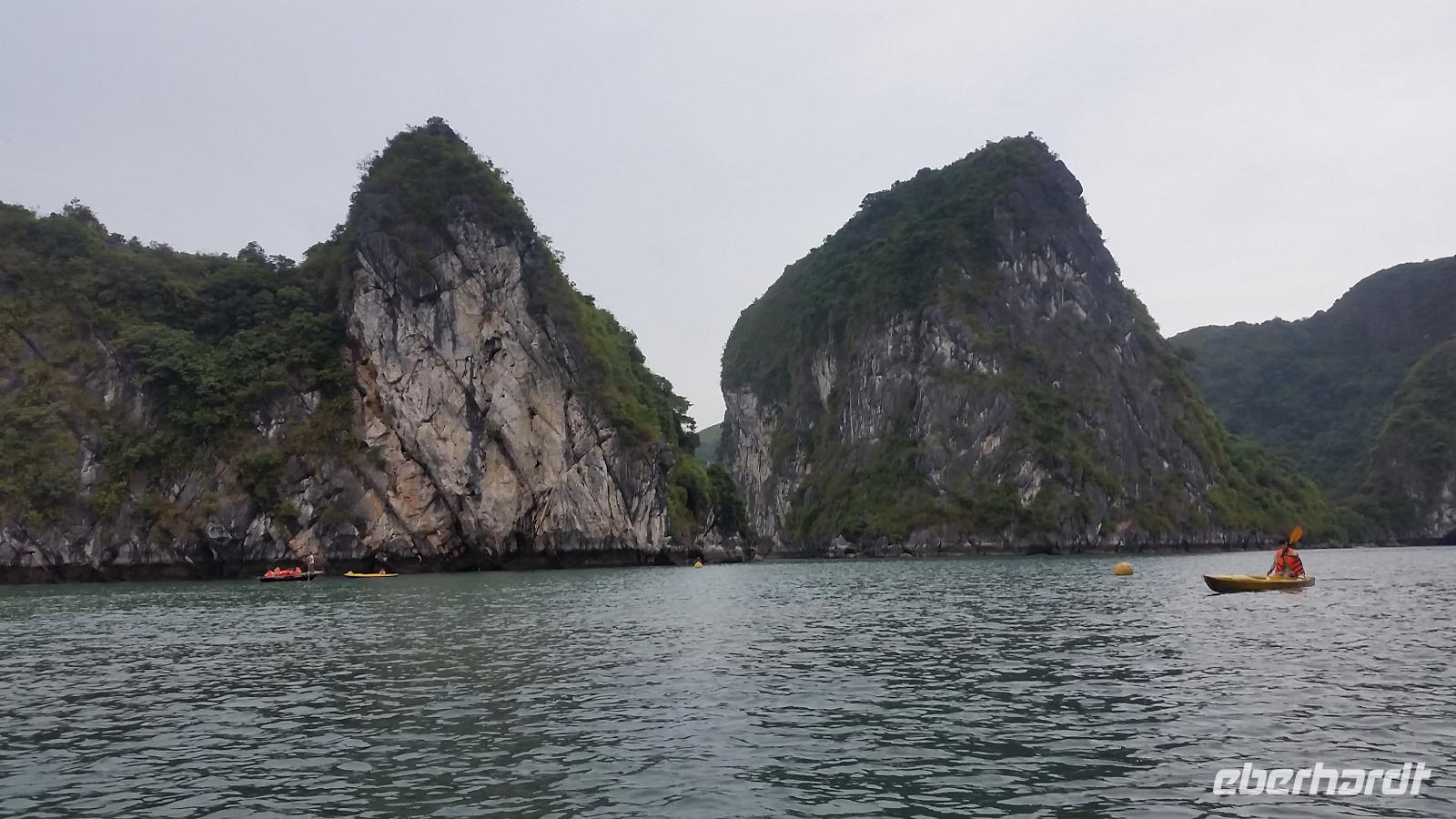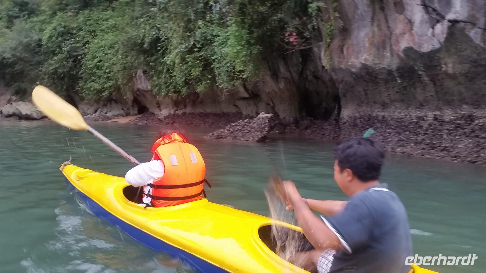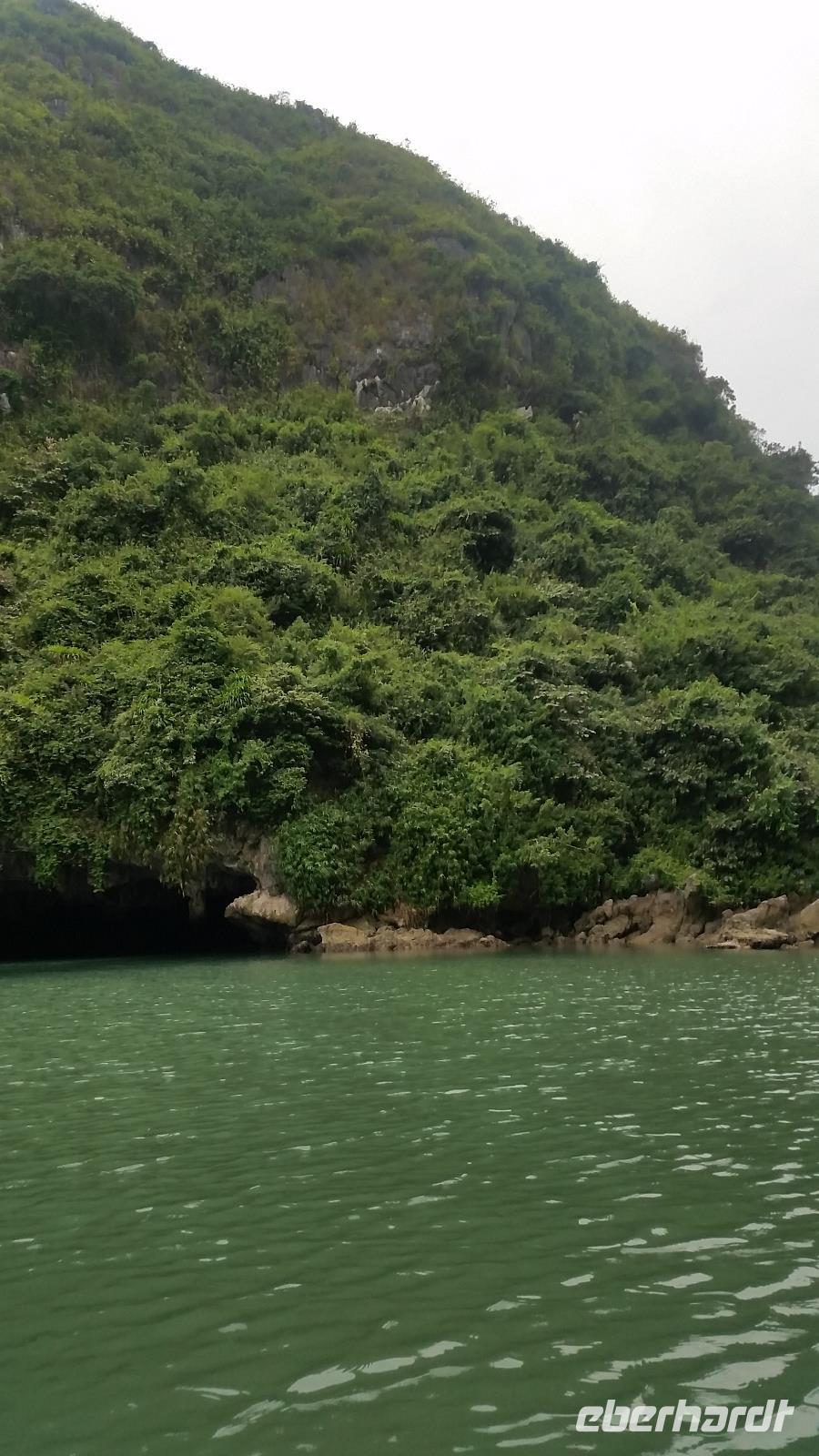 Es folgte ein Ausflug, der uns noch näher an die riesigen grünen Felsen brachte: In zwei schönen, kleinen Holzbooten fuhr uns jeweils ein sportlicher junger Mann durch die unberührte Bucht. Die dumpfen Naturgeräusche sorgten hierbei für ein ganz besonderes Flair!