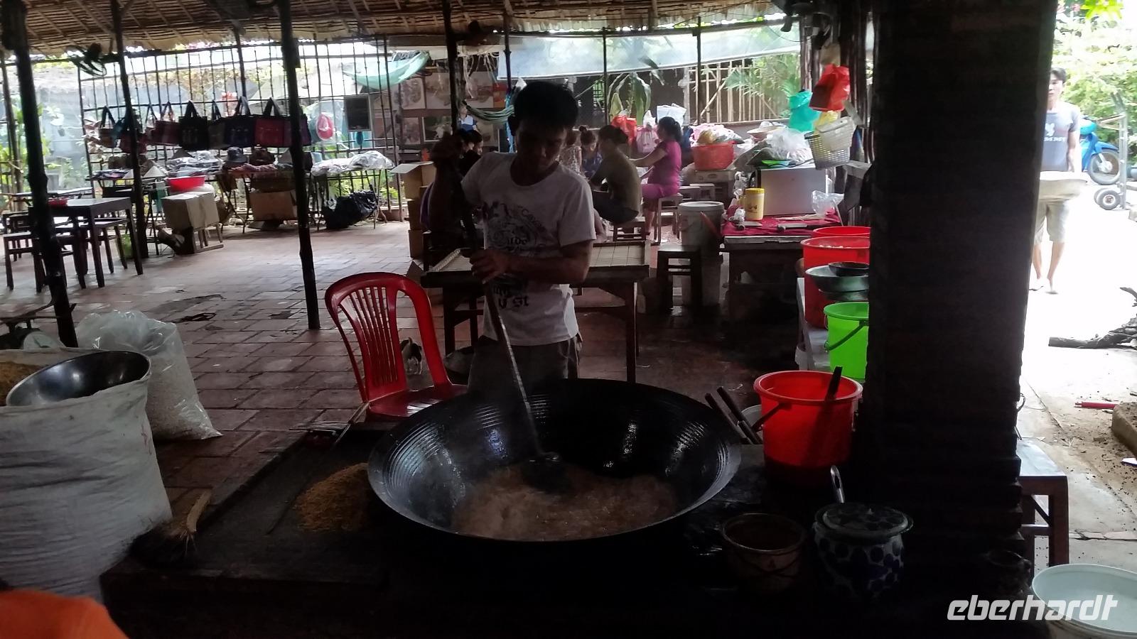 Heute tauchten wir in die fabelhafte Naturkulisse des Mekong Deltas ein. Auf einem Motorboot fuhren wir vorbei an den schwimmenden Märkten bis hin zu unberührten Flussbetten, wo wir in kleinere Ruderboote umstiegen. Entspannt genossen wir nicht nur das traumhaft schöne Wetter, sondern auch die malerische Umgebung bei saftig süßem Obst, Tee, Kaffee UND frischer Kokosnussmilch. Auch lernten wir die Arbeitsweise in einer vietnamesischen Süßwarenfabrik kennen. Hier zeigte man uns, wie man aus nur wenigen Zutaten Popcorn, Kokosbonbons und karamellisierte Erdnusstaler produzierte. Nach einer kleinen Kostprobe konnten wir einfach nicht widerstehen und versorgten uns mit ein paar Spezialitäten als Mitbringsel.