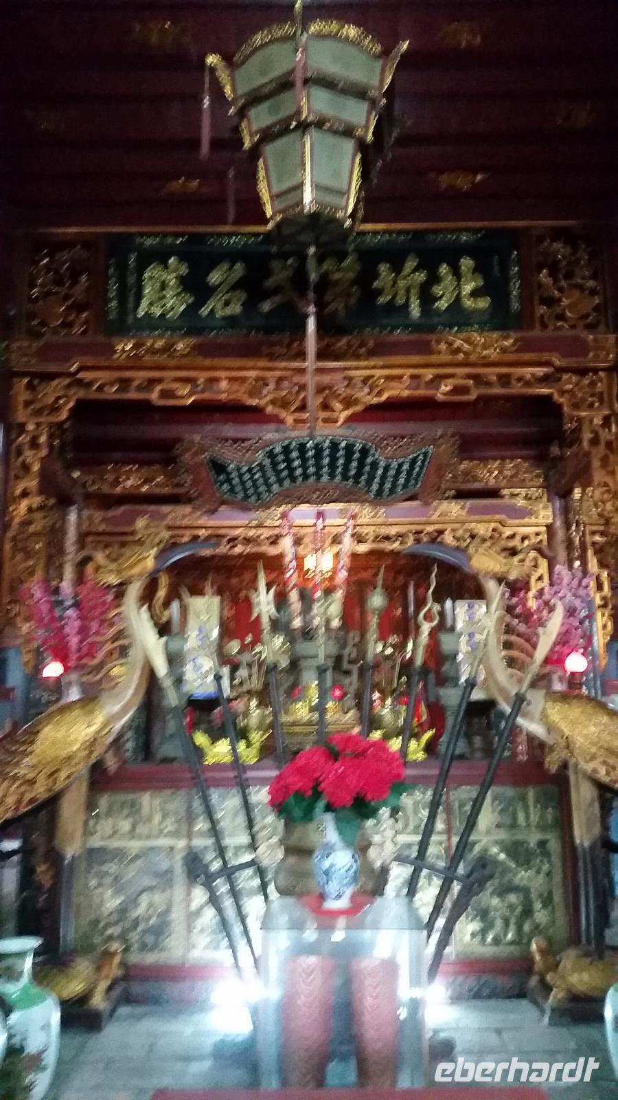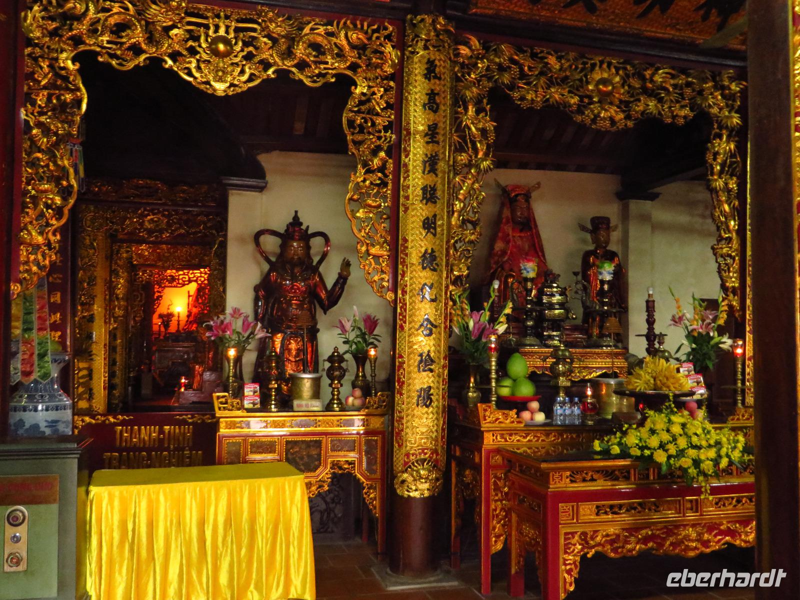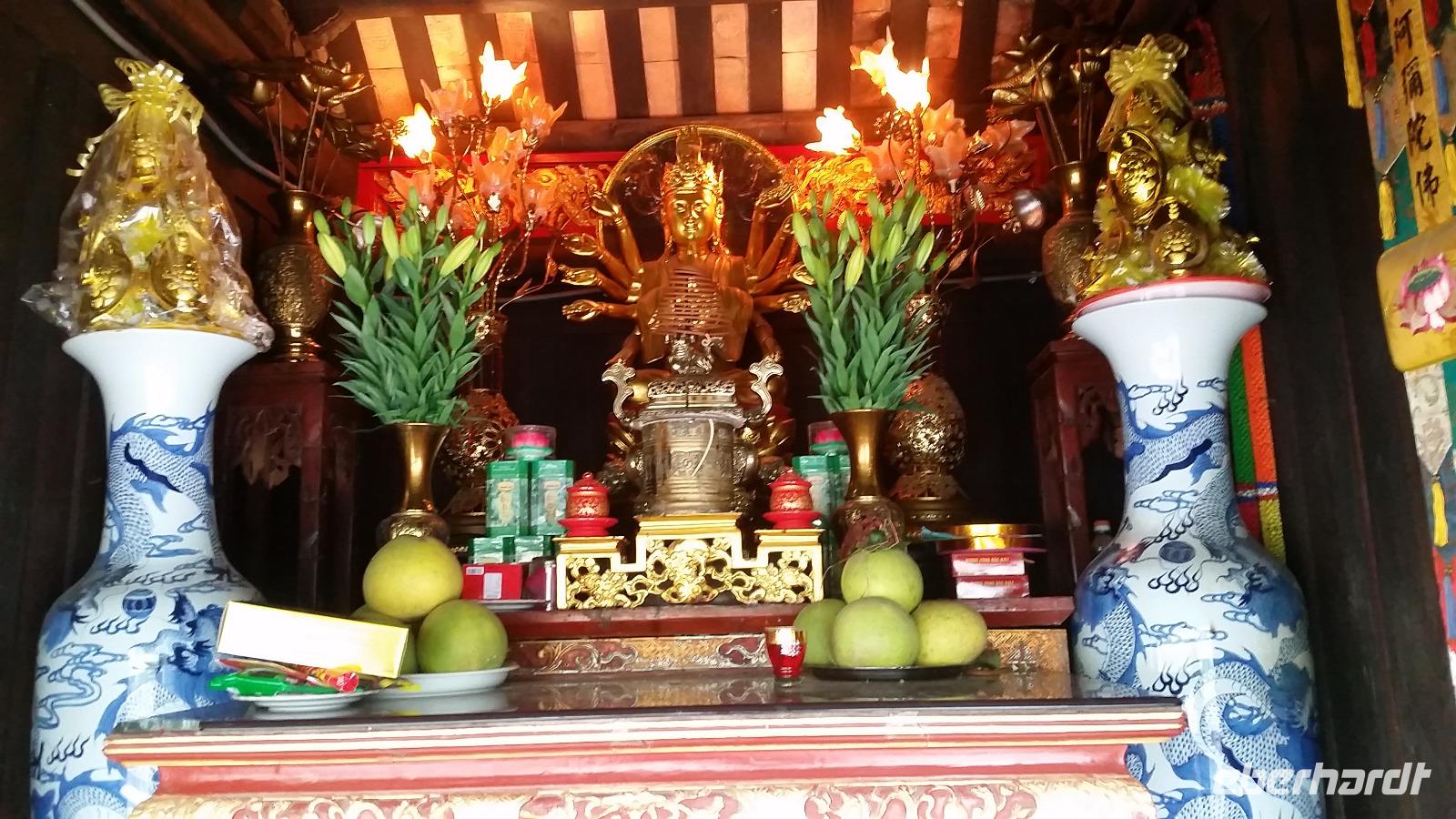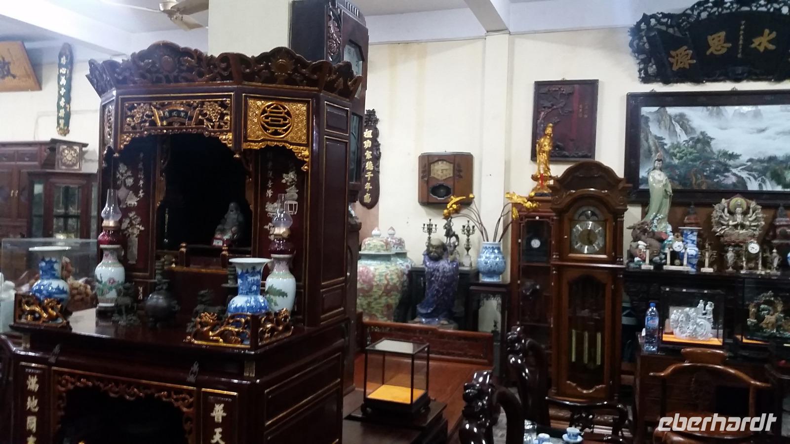 Unsere Fahrt endete bei einer vietnamesischen Holzwerkstatt, wo wir sogleich liebevoll mit Tee und landestypischen Süßigkeiten begrüßt wurden. Neugierig betrachteten wir die wunderschönen Einzelstücke und hatten sogar die Gelegenheit einen Blick in den Wohnraum mit dem Familienaltar zu werfen.