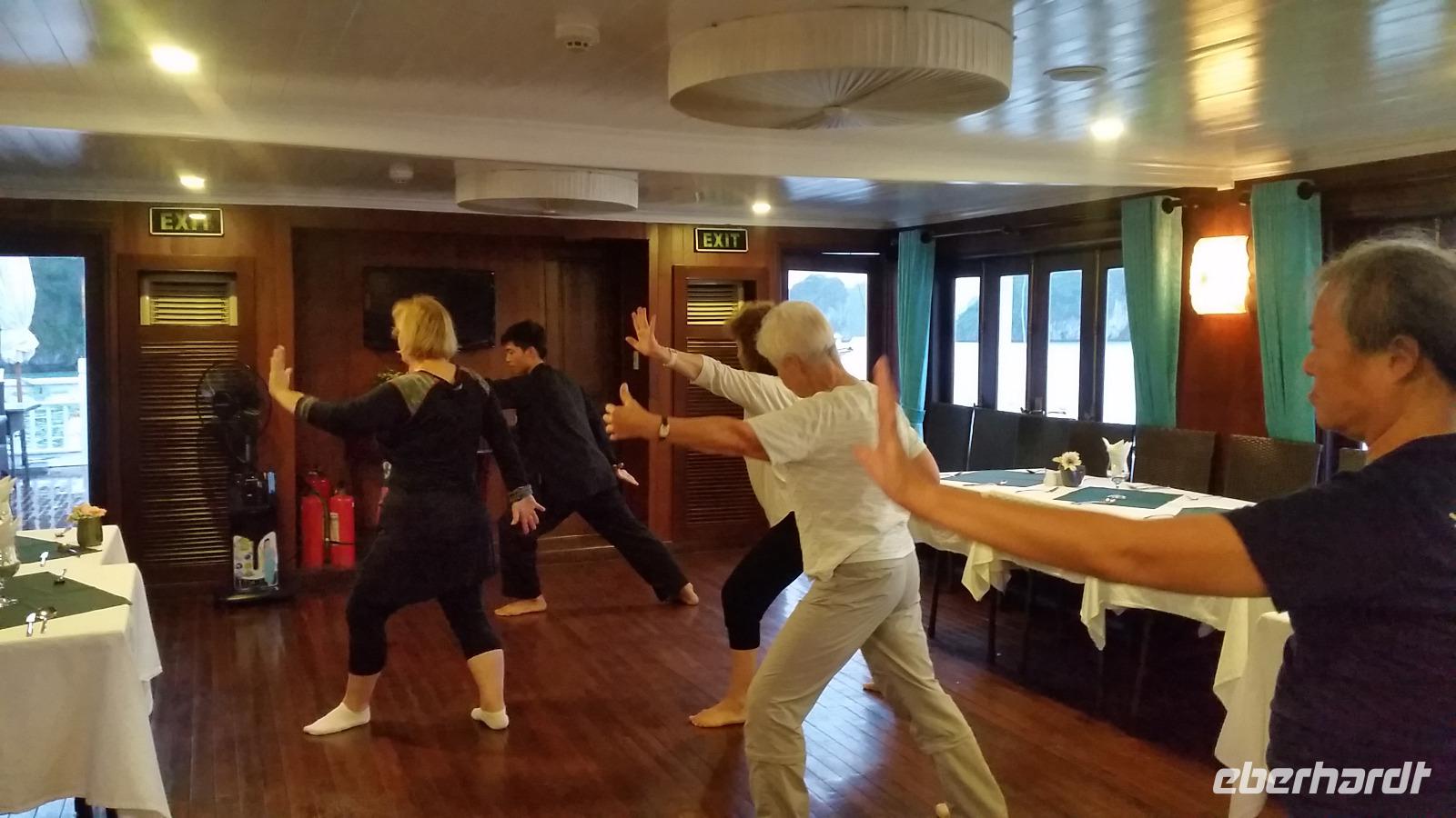 Den heutigen Tag starteten wir mal ein wenig anders als gewohnt, nämlich mit einem traditionellen Thai Chi Kurs. Auch wenn wir auf Grund des leichten Regens diesen leider nicht auf dem Sonnendeck abhielten, waren die Übungen dafür umso wirksam für uns.