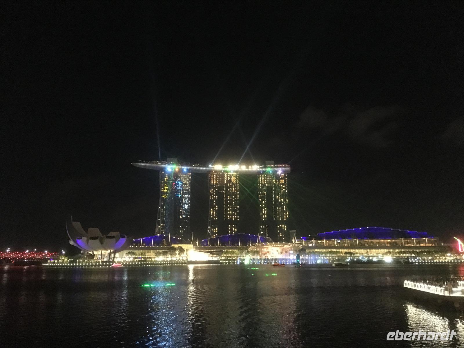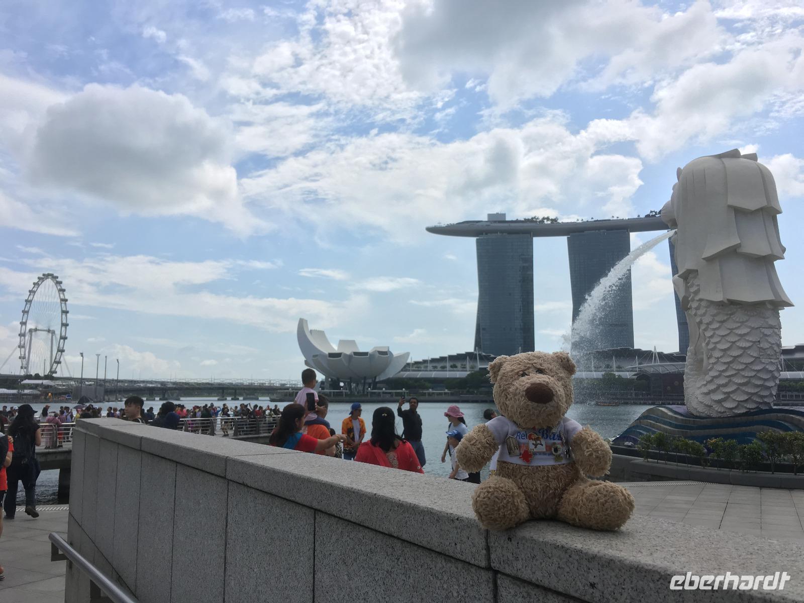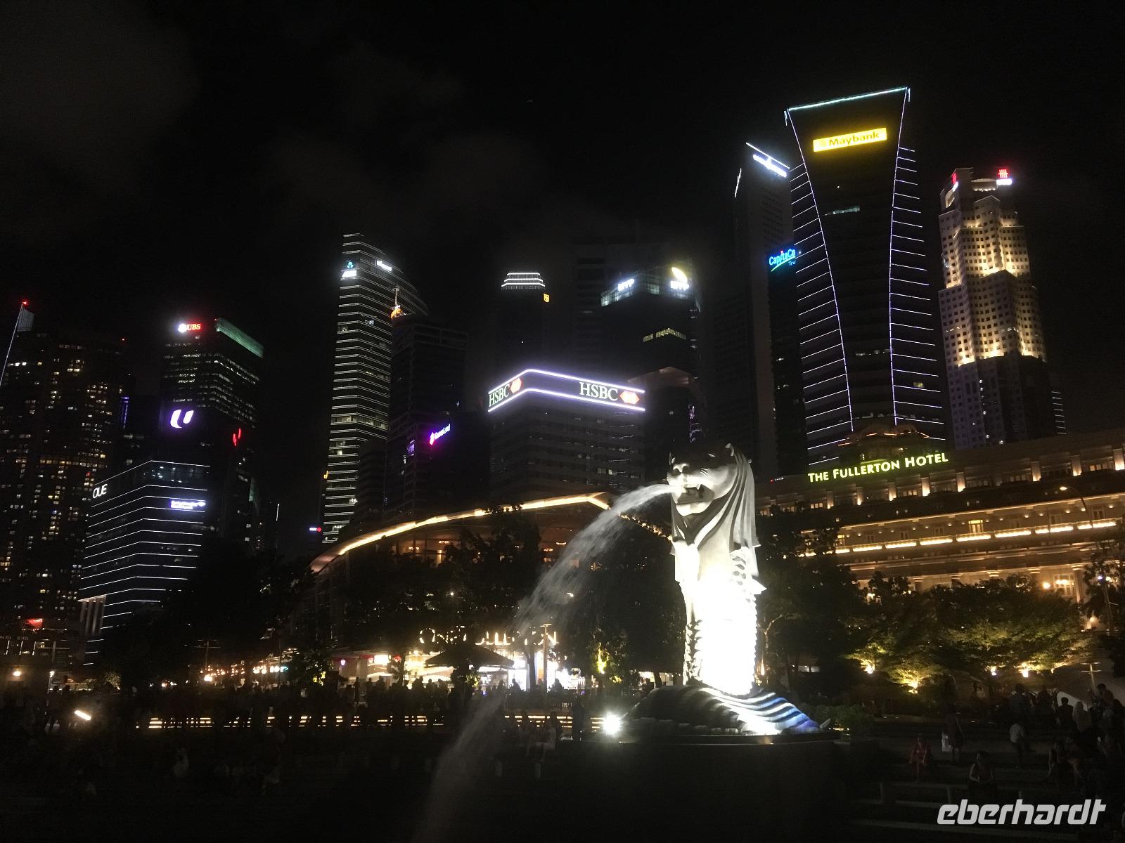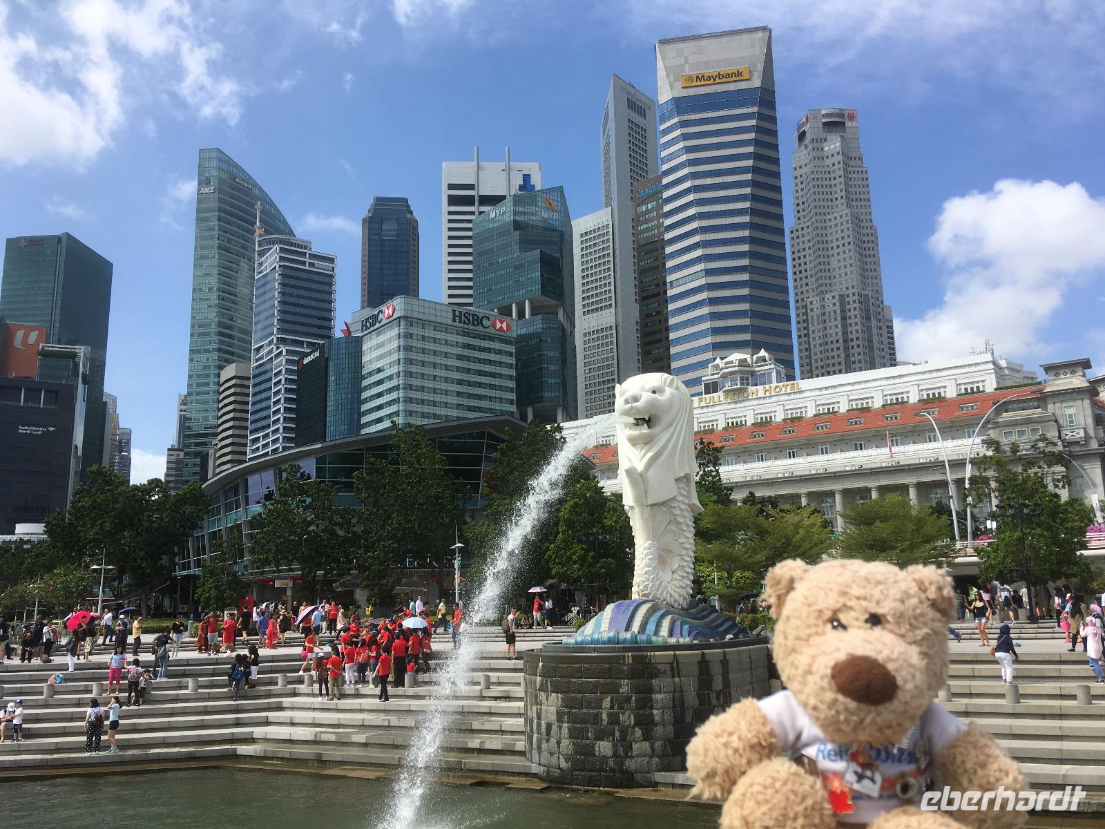Bei dieser schönen Traumreise nach Australien und in die Südsee treffe ich fast alle meine Gäste auf dem Flughafen in Frankfurt. Das Zusammenfinden ist sehr leicht, da wir uns am Abfluggate alle instinktiv nicht weit voneinander entfernt gesetzt haben. In Singapur legen wir eine Zwischenübernachtung ein, damit wir uns schrittweise an den großen Zeitunterschied gewöhnen können. Außerdem hat die ehemalige britische Kolonie, die 1963 unabhängig wurde, wahrlich genug Sehenswürdigkeiten zu bieten, was allein schon den Aufenthalt rechtfertigt. Als wir nach gut 11,5 Stunden Flugzeit in Singapur ankommen, ist es dort schon fast Abend. Von unserem örtlichen Reiseleiter Vincent werden wir nach der problemlosen Einreise auf dem Changi Airport herzlich in Empfang genommen und zum Hotel begleitet. Dieses liegt zentral in der Innenstadt, nicht weit von der Nationalgalerie entfernt. Es ist natürlich für uns ein ganz schöner Temperaturunterschied - vom Winter in Deutschland mit Temperaturen etwas über null Grad auf noch immer 30 Grad am Abend bei hoher Luftfeuchtigkeit. Bereits auf der Fahrt zum Hotel können wir den für mich immer wieder beeindruckenden Mix aus alten Kolonialbauten und moderner Architektur bewundern. Fast alle meine Gäste auf dieser Reise waren schon einmal in Singapur und haben daher schon eigene Pläne für den Abend geschmiedet. Ein Spaziergang am Ufer des Singapore River zum Merlion, dem Wahrzeichen der Stadt, und zur Lichter-/Lasershow vor dem Marina Bay Sands Hotel gehört aber für die Mehrheit dazu. Mit Einbruch der Dunkelheit scheint der Inselstaat zu neuem Leben zu erwachen. Es ist Sonntagabend, die Leute sind auf den Straßen und stürzen sich ins Nachtleben. Wir machen aber nicht durch bis morgen früh, denn es war für uns alle doch ein anstrengender Tag mit einem langen Flug. So freuen wir uns auf unsere Hotelbetten und die Stadtrundfahrt am nächsten Vormittag.