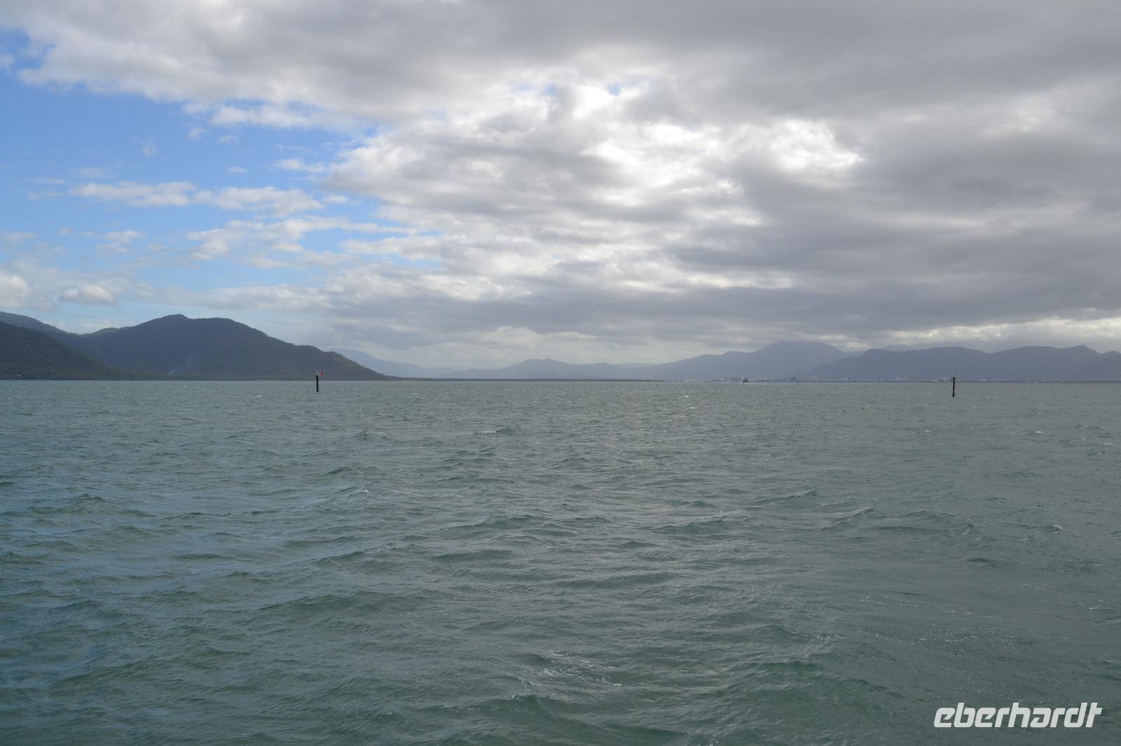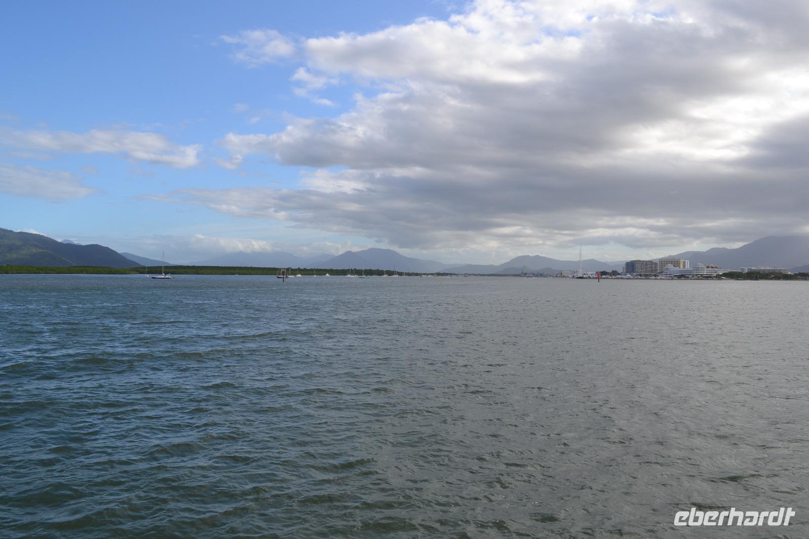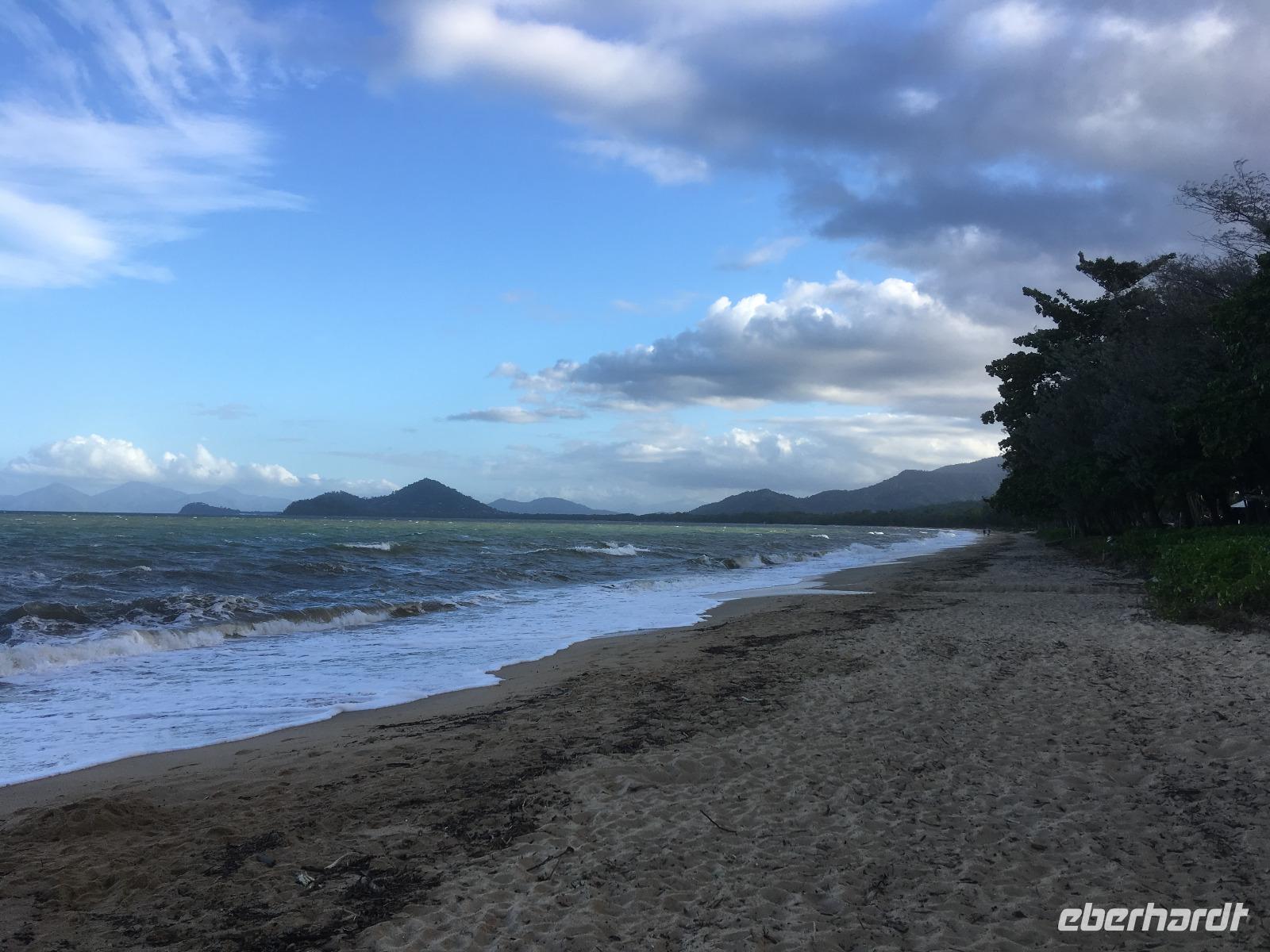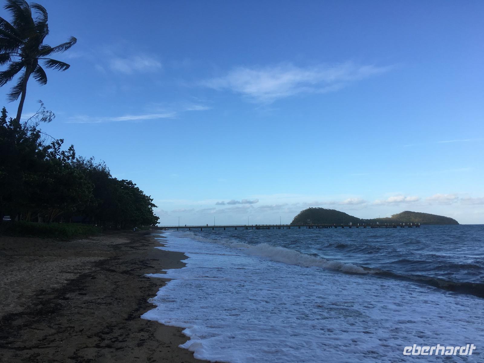 Am nächsten Morgen landen wir auf dem Flughafen von Brisbane und reisen damit nach Australien ein. Passkontrolle, Gepäckkontrolle - am Ende wird es etwas knapp, aber wir erreichen unseren Anschlussflug nach Cairns noch vor unserem Gepäck, das erst vom internationalen zum Inlandsterminal transferiert werden muss. In Cairns werden wir von unserer örtlichen Reiseleiterin Jutta noch einmal herzlich in Australien begrüßt. Da wir bis zum Check-In in unserem Hotel noch Zeit haben, macht sie mit uns eine kleine Rundfahrt durch die fünftgrößte Stadt des australischen Bundesstaates Queensland. Sie wurde Ende des 19. Jahrhunderts während des Goldrauschs in den Atherton Tablelands als Exporthafen gegründet und dient heute vor allem als Ausgangspunkt für Ausflüge zum Great Barrier Reef. In den letzten Tagen hat es teils heftige Regenfälle gegeben, und auch während unserer Stadtrundfahrt schüttet es vom Himmel. So werfen wir vom Bus aus einen Blick auf die Uferpromenade und die Lagune, das öffentliche Schwimmbad. An den Stränden um Cairns herum kann man nur selten im Meer baden, denn die berüchtigten Box Jellyfish (Feuerquallen) stellen eine nicht zu unterschätzende Gefahr dar. Unser erstes Hotel in Australien liegt im kleinen Urlaubsort Palm Cove, ca. 20 Autominuten nördlich von Cairns. Nun können wir uns für ein paar Stunden erholen, duschen, ein kleines Nickerchen machen. Am Abend laufen wir 5-10 min hinunter zur Strandpromenade, wo ich für uns schon in einem schönen Restaurant einen Tisch reserviert habe. Wir erreichen es kurz bevor der nächste Wolkenbruch beginnt. Zumindest verspricht der Wetterbericht für die nächsten beiden Tage schönes Wetter. Wir entscheiden uns spontan fast alle für Spaghetti mit mediterranem Gemüse und Tomatensoße, und stoßen dann auf den Geburtstag eines Gastes an. Wer kann schon als Deutscher behaupten, einmal in Australien am Pazifik seinen Geburtstag gefeiert zu haben?