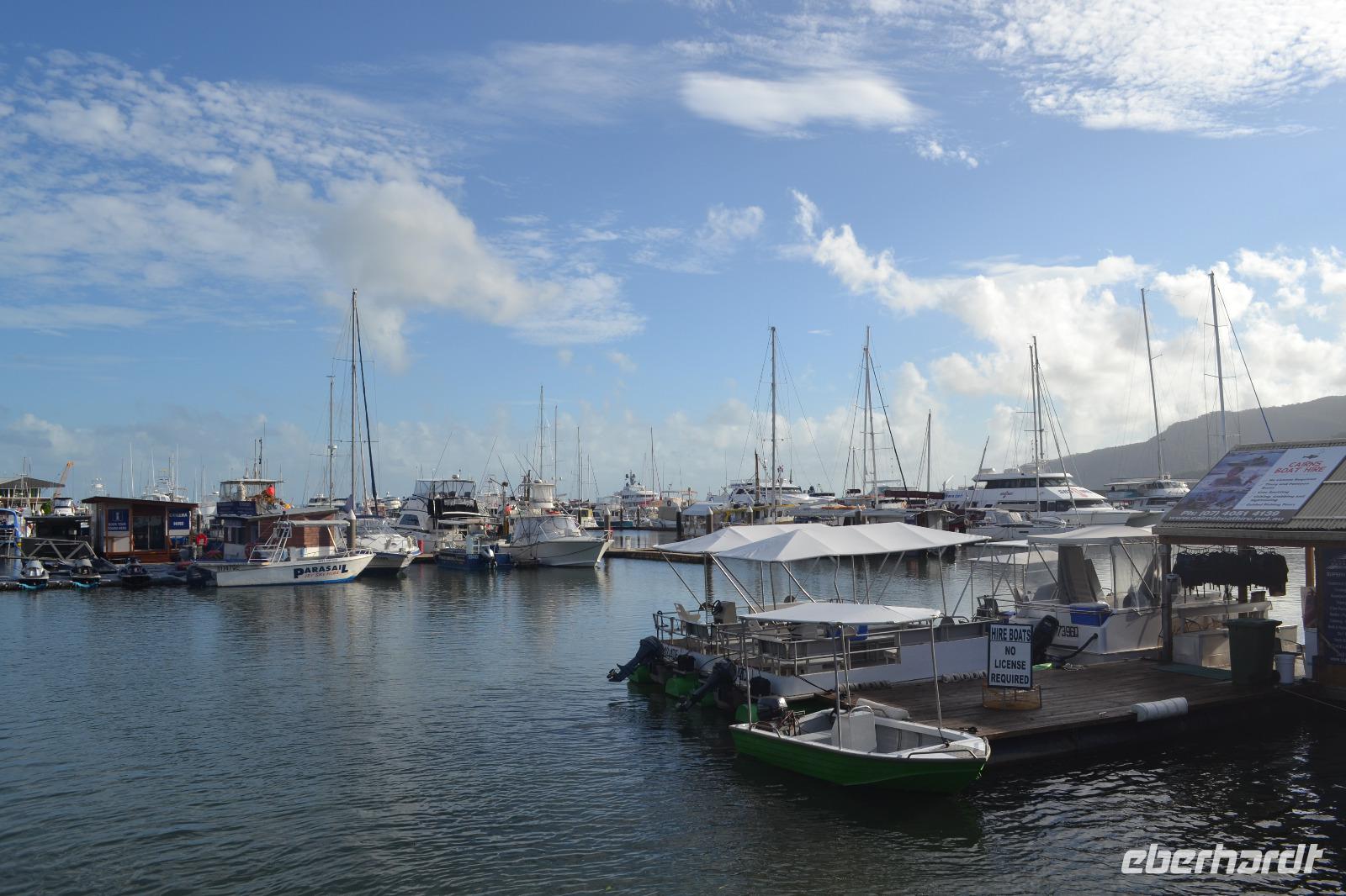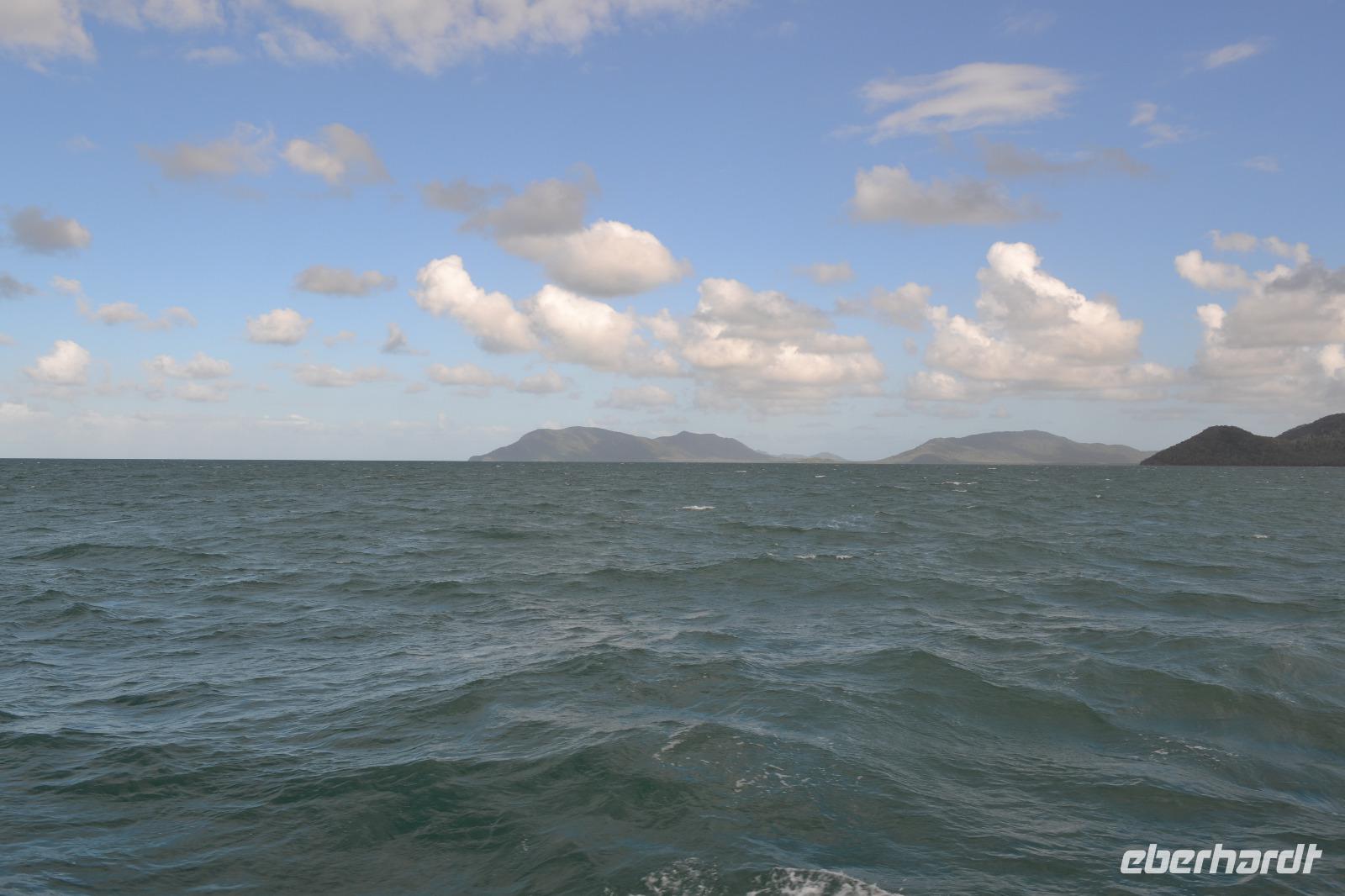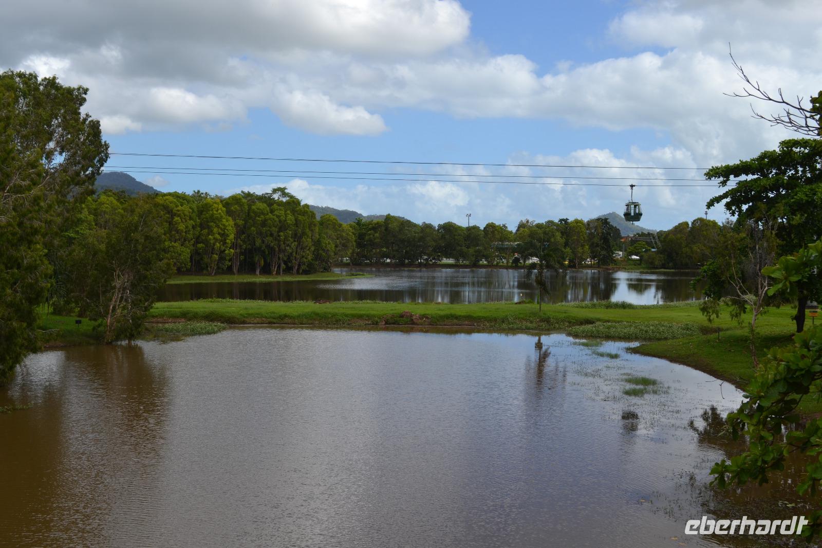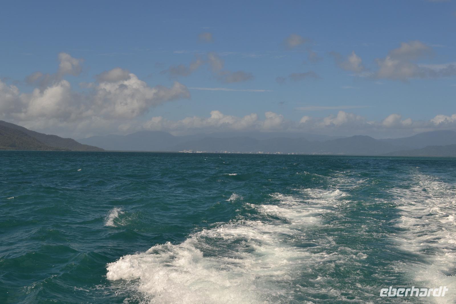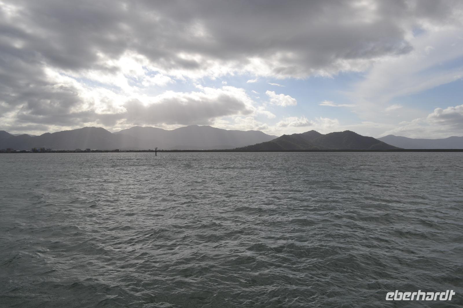 Am nächsten Morgen landen wir auf dem Flughafen von Brisbane und reisen damit nach Australien ein. Passkontrolle, Gepäckkontrolle - am Ende wird es etwas knapp, aber wir erreichen unseren Anschlussflug nach Cairns noch vor unserem Gepäck, das erst vom internationalen zum Inlandsterminal transferiert werden muss. In Cairns werden wir von unserer örtlichen Reiseleiterin Jutta noch einmal herzlich in Australien begrüßt. Da wir bis zum Check-In in unserem Hotel noch Zeit haben, macht sie mit uns eine kleine Rundfahrt durch die fünftgrößte Stadt des australischen Bundesstaates Queensland. Sie wurde Ende des 19. Jahrhunderts während des Goldrauschs in den Atherton Tablelands als Exporthafen gegründet und dient heute vor allem als Ausgangspunkt für Ausflüge zum Great Barrier Reef. In den letzten Tagen hat es teils heftige Regenfälle gegeben, und auch während unserer Stadtrundfahrt schüttet es vom Himmel. So werfen wir vom Bus aus einen Blick auf die Uferpromenade und die Lagune, das öffentliche Schwimmbad. An den Stränden um Cairns herum kann man nur selten im Meer baden, denn die berüchtigten Box Jellyfish (Feuerquallen) stellen eine nicht zu unterschätzende Gefahr dar. Unser erstes Hotel in Australien liegt im kleinen Urlaubsort Palm Cove, ca. 20 Autominuten nördlich von Cairns. Nun können wir uns für ein paar Stunden erholen, duschen, ein kleines Nickerchen machen. Am Abend laufen wir 5-10 min hinunter zur Strandpromenade, wo ich für uns schon in einem schönen Restaurant einen Tisch reserviert habe. Wir erreichen es kurz bevor der nächste Wolkenbruch beginnt. Zumindest verspricht der Wetterbericht für die nächsten beiden Tage schönes Wetter. Wir entscheiden uns spontan fast alle für Spaghetti mit mediterranem Gemüse und Tomatensoße, und stoßen dann auf den Geburtstag eines Gastes an. Wer kann schon als Deutscher behaupten, einmal in Australien am Pazifik seinen Geburtstag gefeiert zu haben?