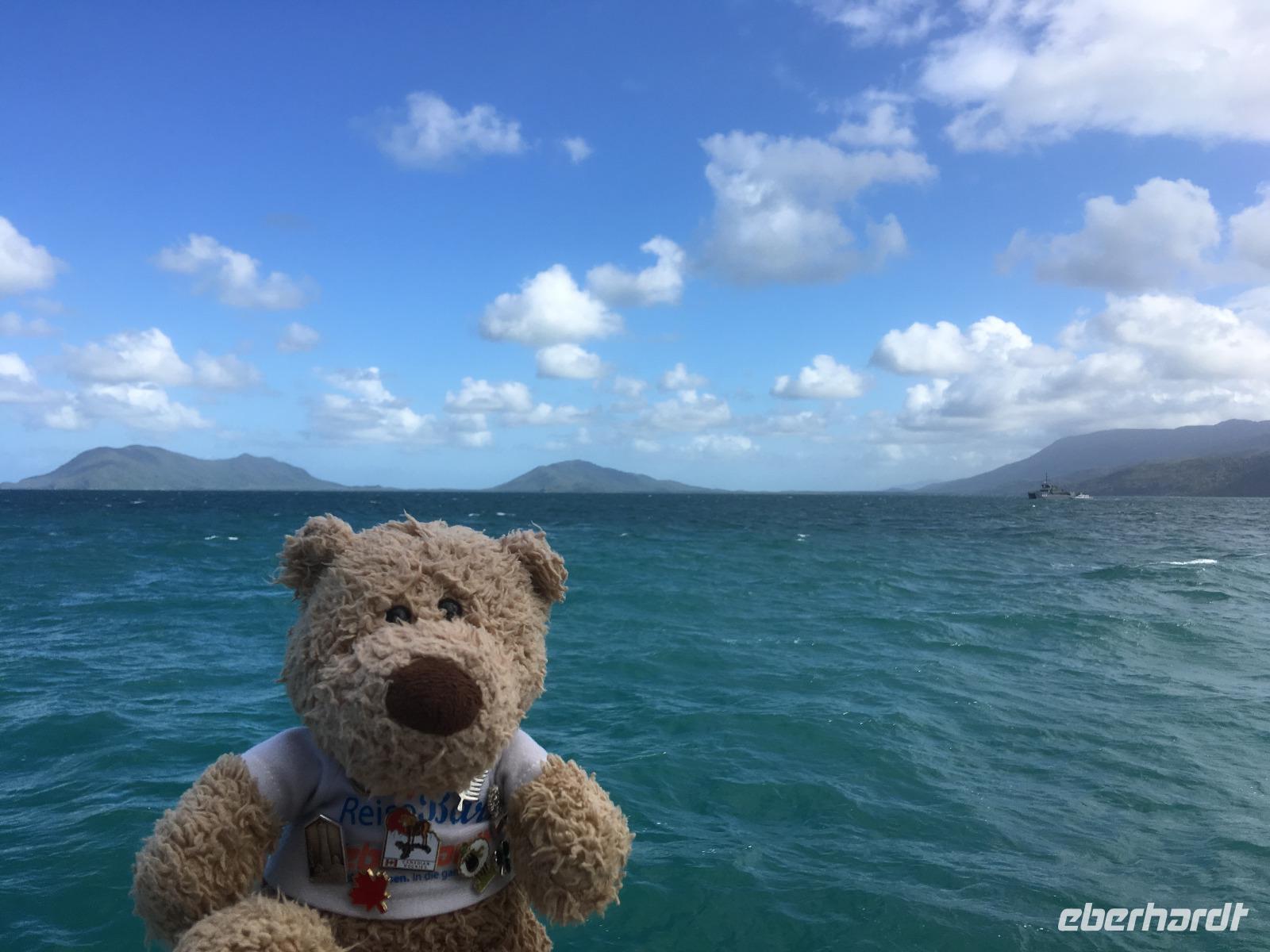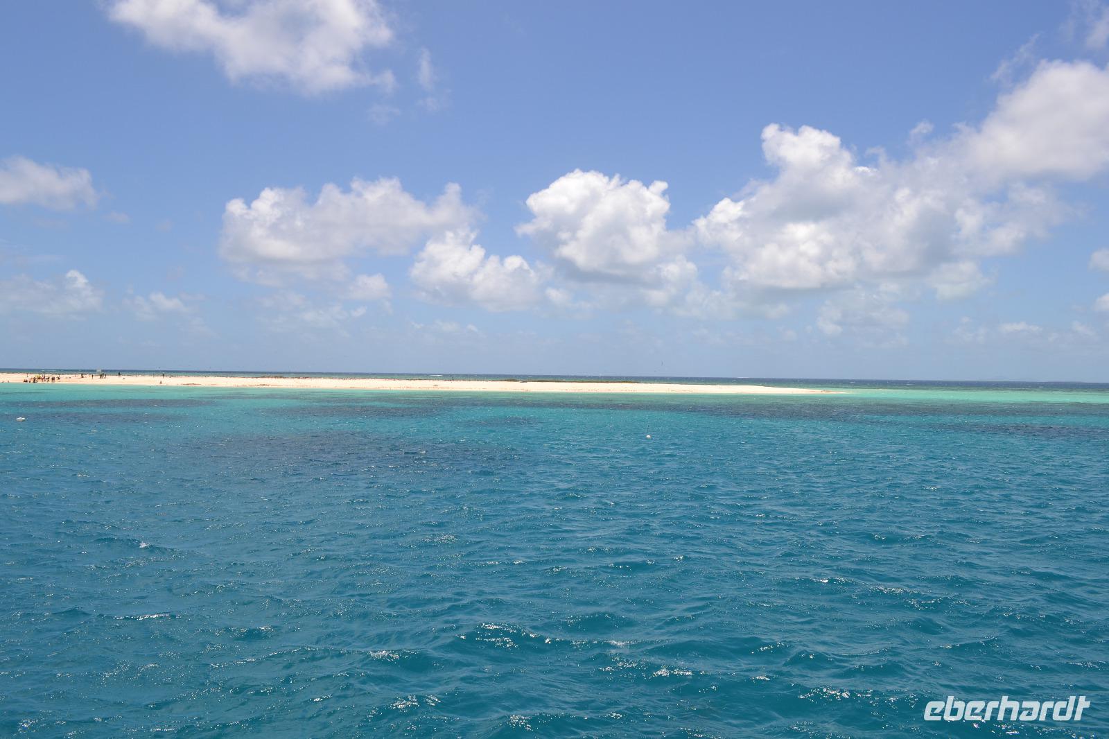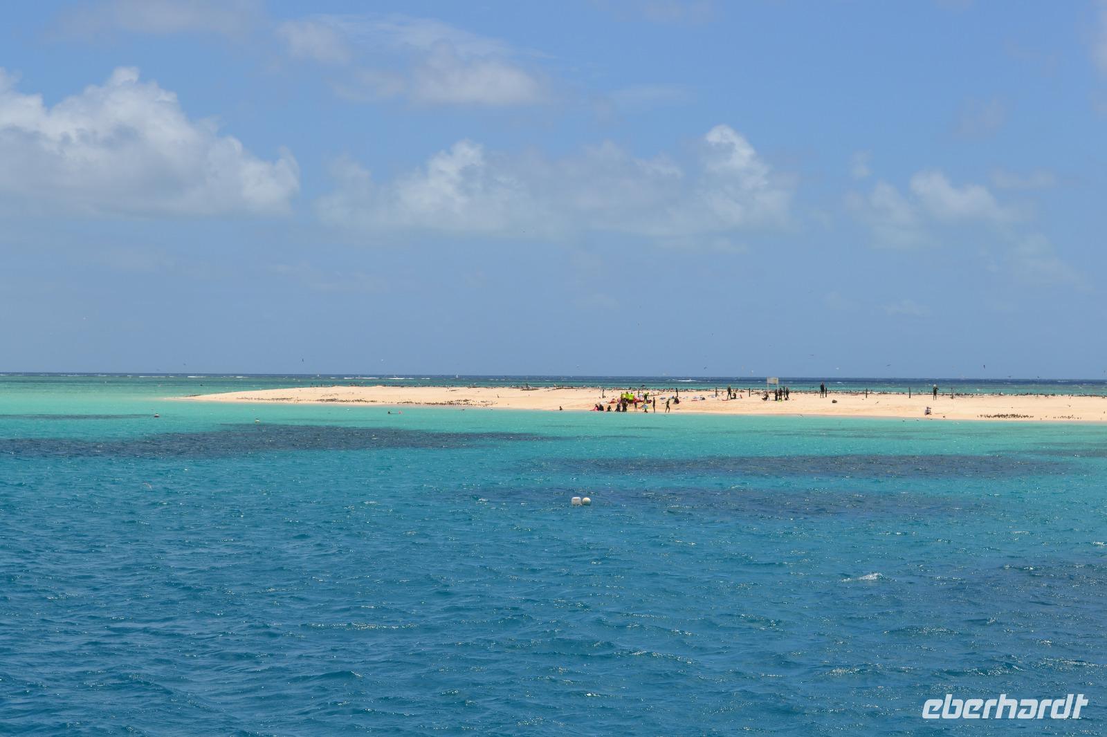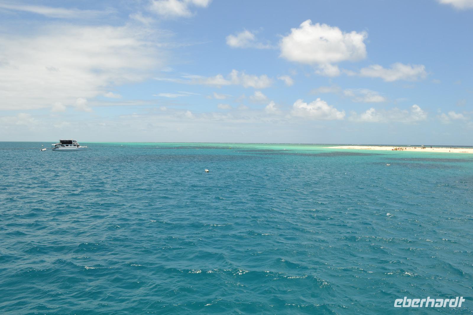 Zum Glück sind wir gestern Abend nicht allzu spät ins Bett, denn wir werden heute schon 07:30 Uhr vom Hotel abgeholt. Wir sind alle ganz aufgeregt, denn wir fahren mit dem Katamaran „Ocean Spirit" hinaus zum Great Barrier Reef! Genug Sonnencreme haben wir auch dabei, denn die Sonne brennt vom Himmel, und beim Schnorcheln und Baden wollen wir uns keinen Sonnenbrand holen. Michaelmas Cay heißt die kleine flache Insel, neben der unser Schiff an einer Boje festmacht. Ich habe uns gleich für die erste Fahrt mit dem Halbtauchboot angemeldet, damit wir anschließend viel Zeit zum Baden haben. Wir werden ganz nah an verschiedene Korallen herangefahren und können viele Fische und sogar ein paar Schildkröten bewundern. Nach dem sehr guten Mittagessen vom Buffet setzen die meisten von uns auf die Insel über. Sie ist gleichzeitig ein Vogelschutzgebiet, aber die meisten der vielen hundert Vögel respektieren netterweise die Absperrung und halten sich von uns fern. Für mich beginnt nun eines der schönsten Erlebnisse auf der ganzen Reise. Da ich mir nämlich an Bord eine Taucherbrille mit Sehstärke ausleihen durfte, kann ich beim Schnorcheln tatsächlich zum ersten Mal etwas sehen (und nicht nur erahnen). Um mich herum schwimmen viele kleine, fast durchsichtige Fische, ein Rochen schwebt über dem Meeresboden, ich kann Riesenmuscheln beim Atmen zuschauen! An diesen tollen Tag werde ich mich mein ganzes Leben lang erinnern! Beim Abendessen im Hotel schwärmen auch meine Gäste von diesem rundum gelungenen Ausflug.