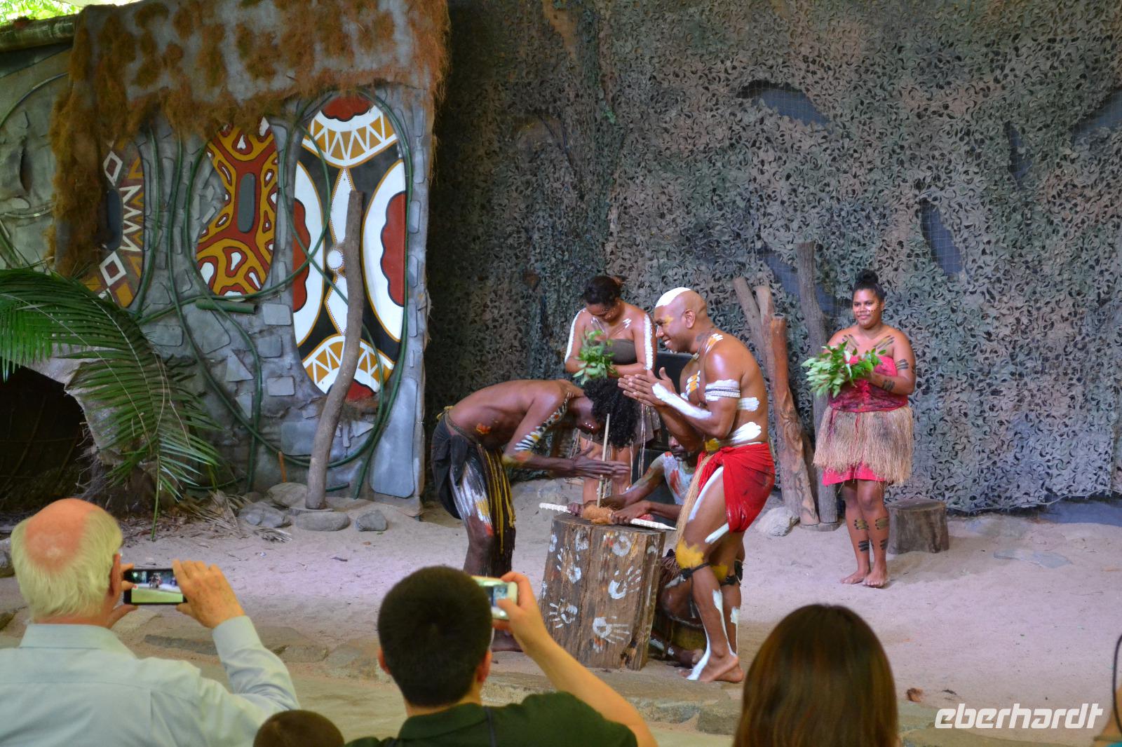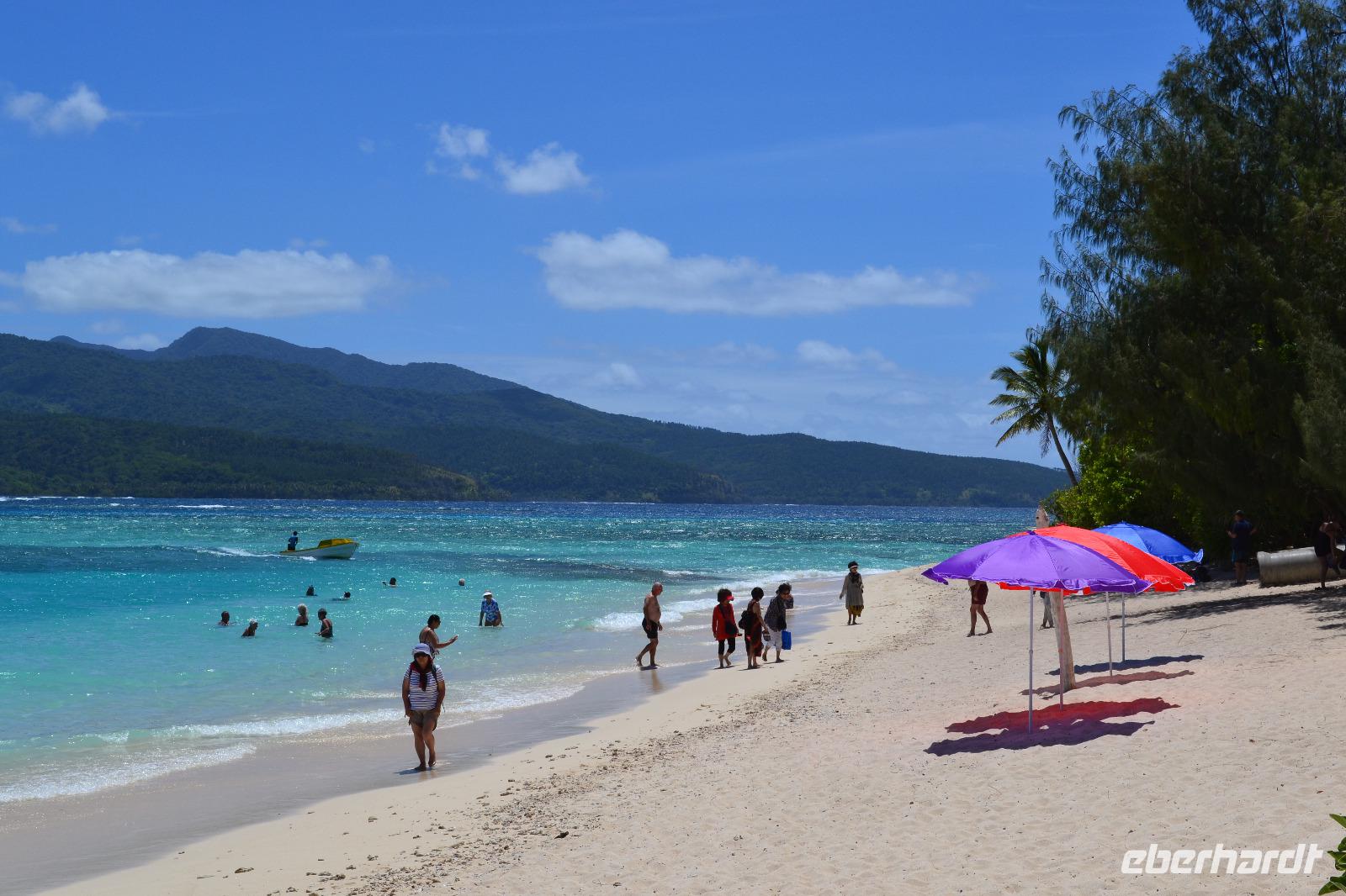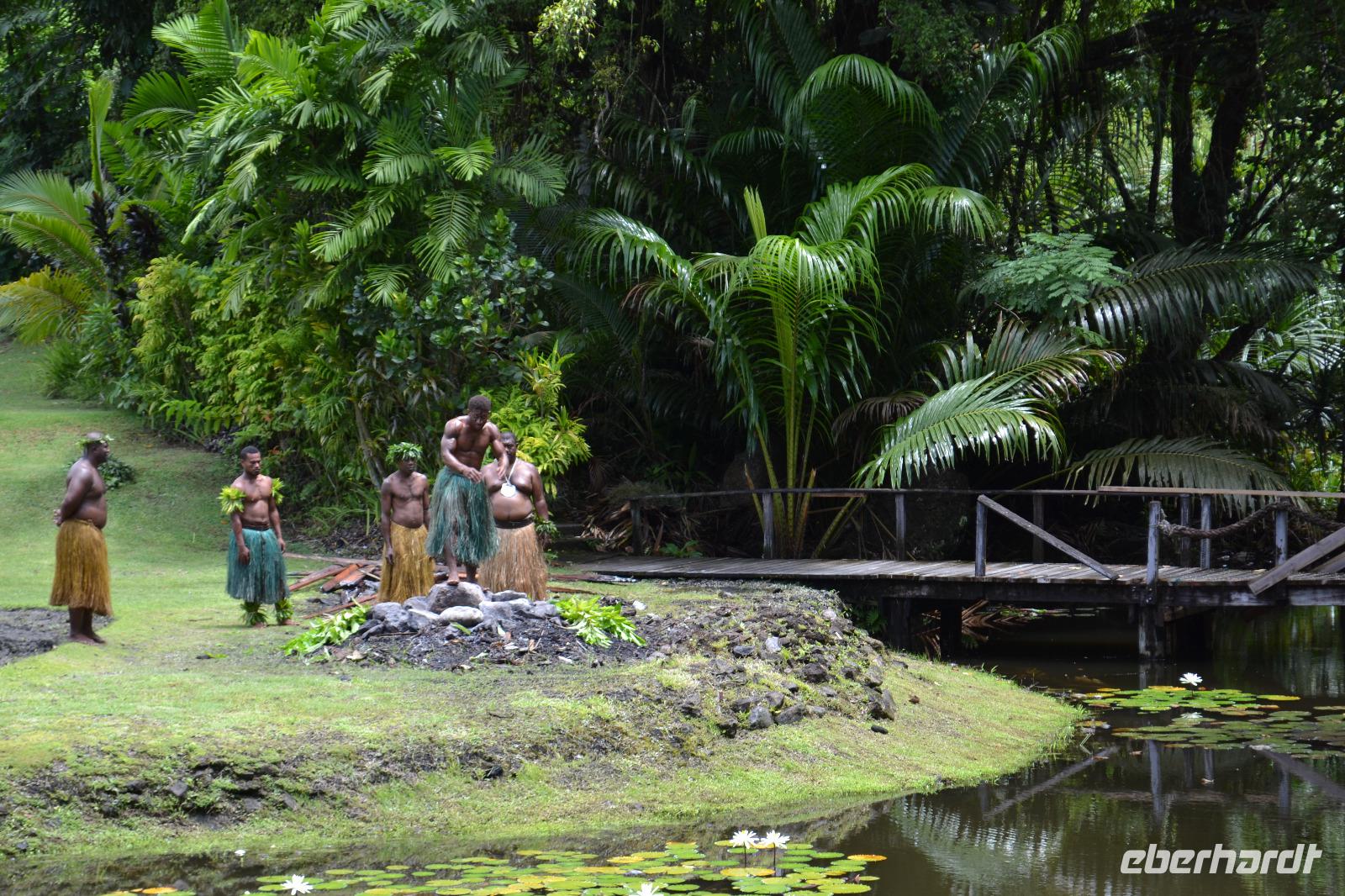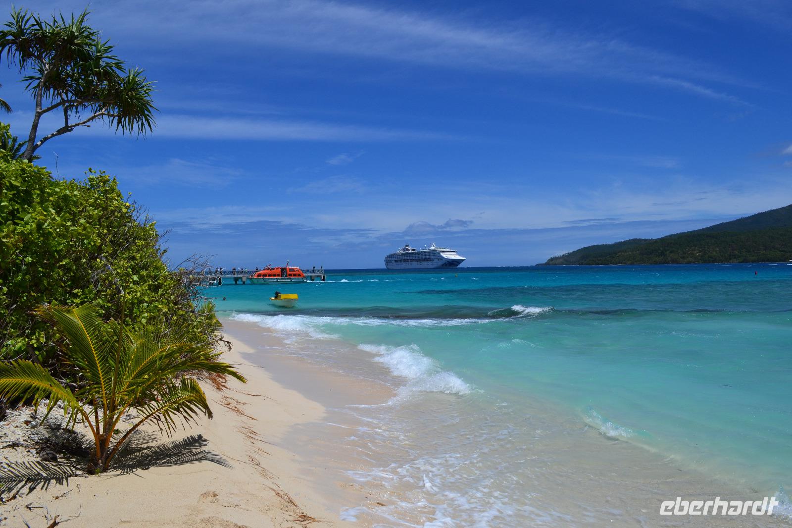 Was ist für Sie das Paradies? Kristallklares Wasser, ein feiner weißer Sandstrand, gesprenkelt mit Muschelstückchen und garniert mit Korallen, dazu im Wind wedelnde Palmen, dekorativ angerichtet? Gleichzeitig möchten Sie aber auf bestimmte Annehmlichkeiten der modernen Zivilisation nicht verzichten? Dann könnte die Mystery Island, die zum Inselstaat Vanuatu gehört, Ihren Vorstellungen sehr nahe kommen. Zum Baden, Planschen, Schnorcheln bieten sich hier ideale Bedingungen. Und bei einer Wassertemperatur von 27 Grad springt sogar der Eberhardt-Reisebegleiter hinein. Leben tut hier niemand, nur wenn ein Kreuzfahrtschiff vor Anker liegt, kommen die Einheimischen von der benachbarten und deutlich größeren Insel Aneytium herüber und besetzen ihre Stände. Keine Sorge, es gibt Bier, kleine Kostbarkeiten und Andenken, sie können sich massieren lassen und im Kannibalenkochtopf für ein Foto posieren. Auch Kanu- und Schnorcheltouren werden angeboten. Was aber ist nun das Mysterium, das Geheimnis? Während des Zweiten Weltkriegs konnten sich die Japaner nicht erklären, wie die Amerikaner von der hügeligen und dicht bewaldeten Insel Aneytium Flugzeuge starten konnten. Die kleine unscheinbare Insel Inyeug (eben jene „Mystery Island") direkt daneben war ihnen nicht bekannt. Den Flugplatz gibt es noch heute, und wir sehen sogar einige Chartermaschinen über unsere Köpfe hinweg starten. Während des anschließenden Seetags auf dem Weg zu den Fidschi-Inseln erwartet ein Paar aus unserer Mitte eine besondere Überraschung: Sie sind auf Hochzeitsreise und werden nun von unserem „Stammesältesten" im Südsee-Outfit noch einmal „vermählt".