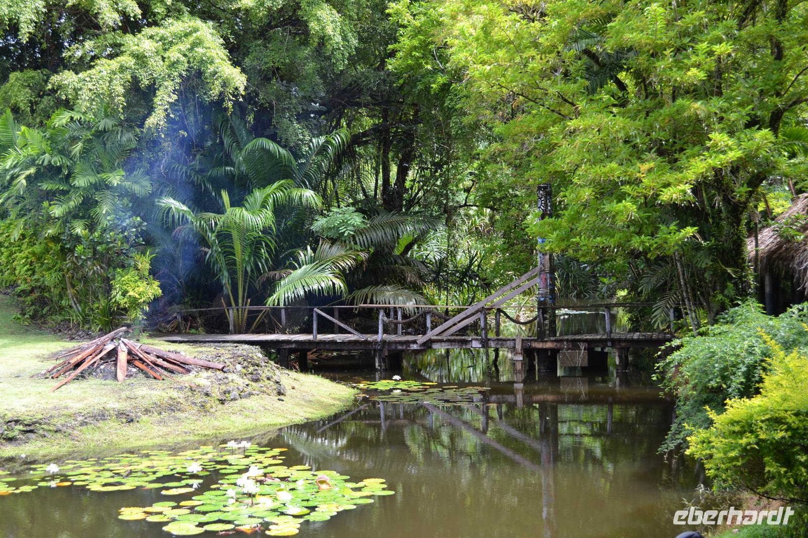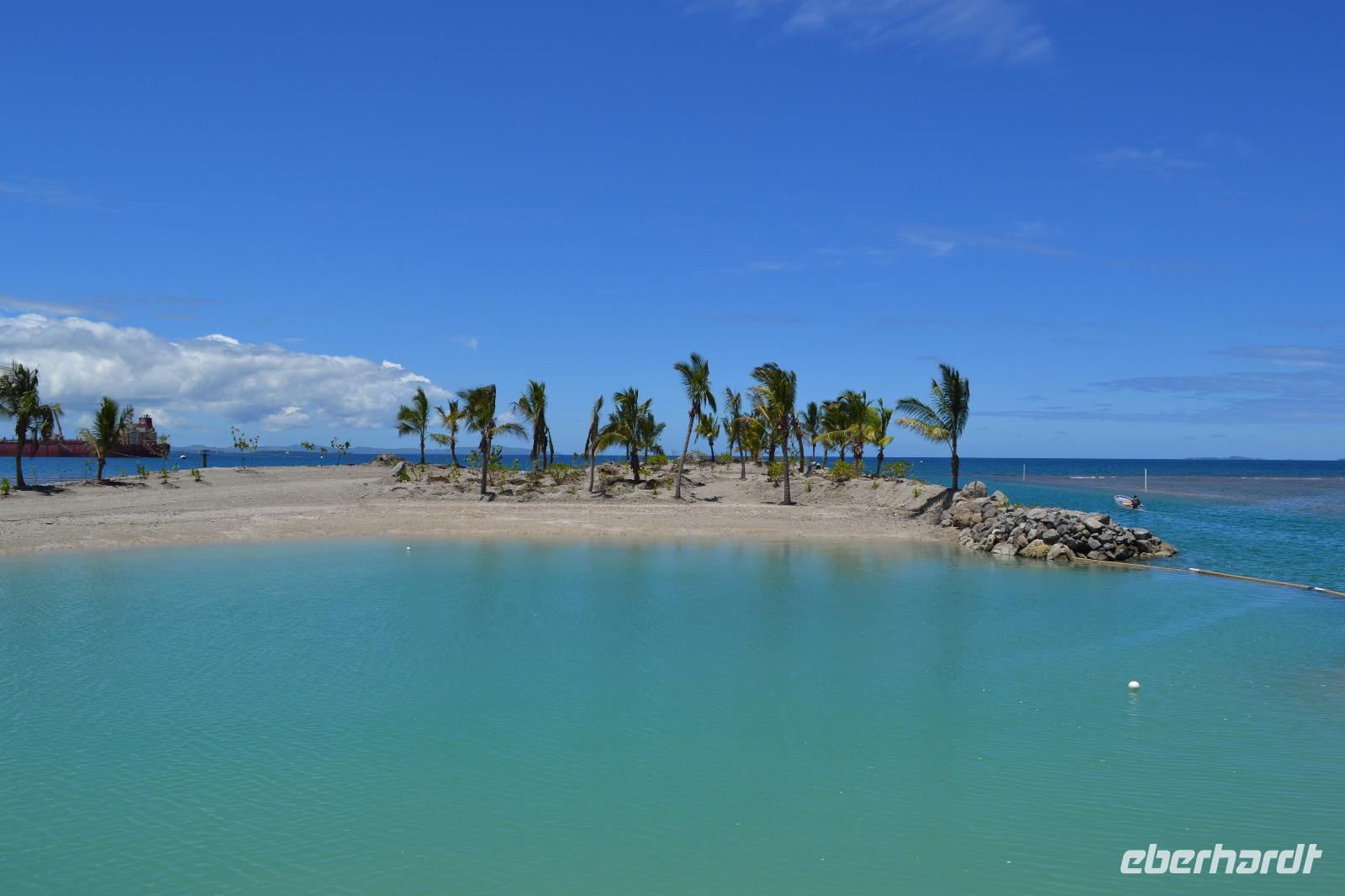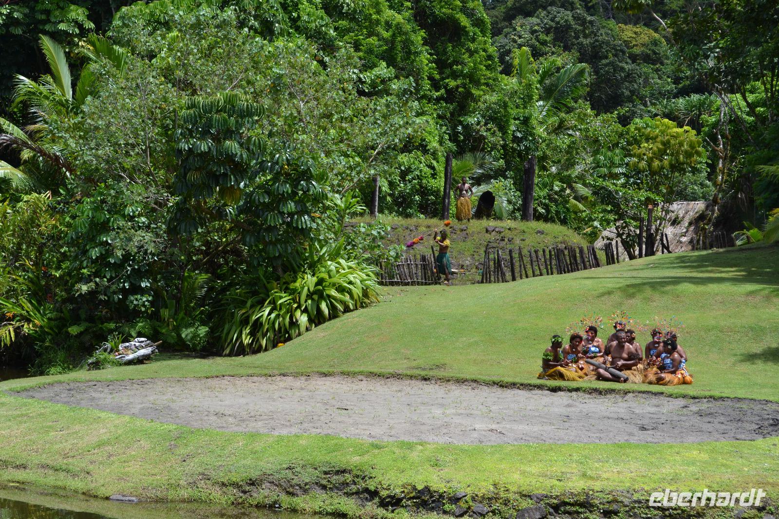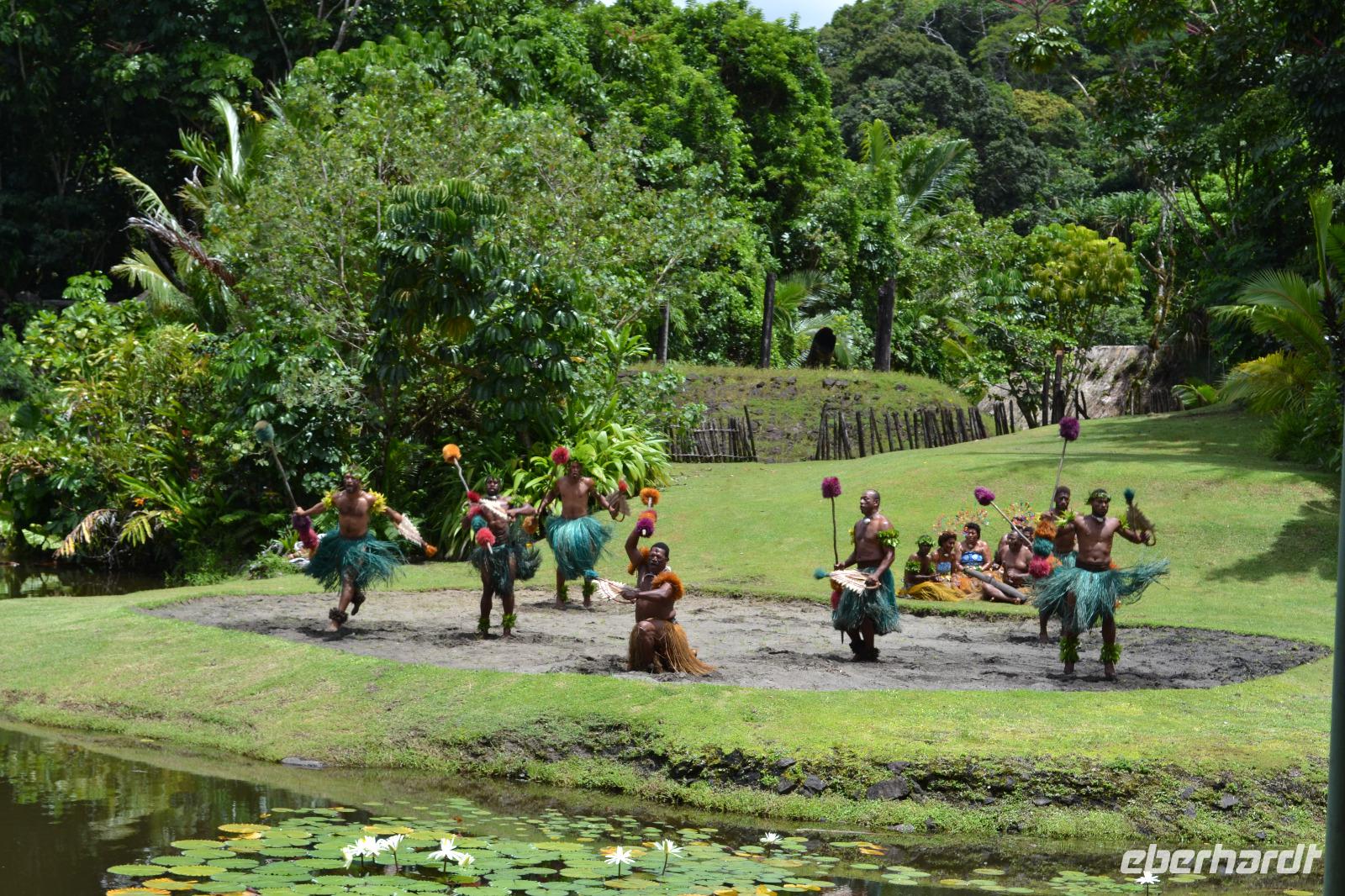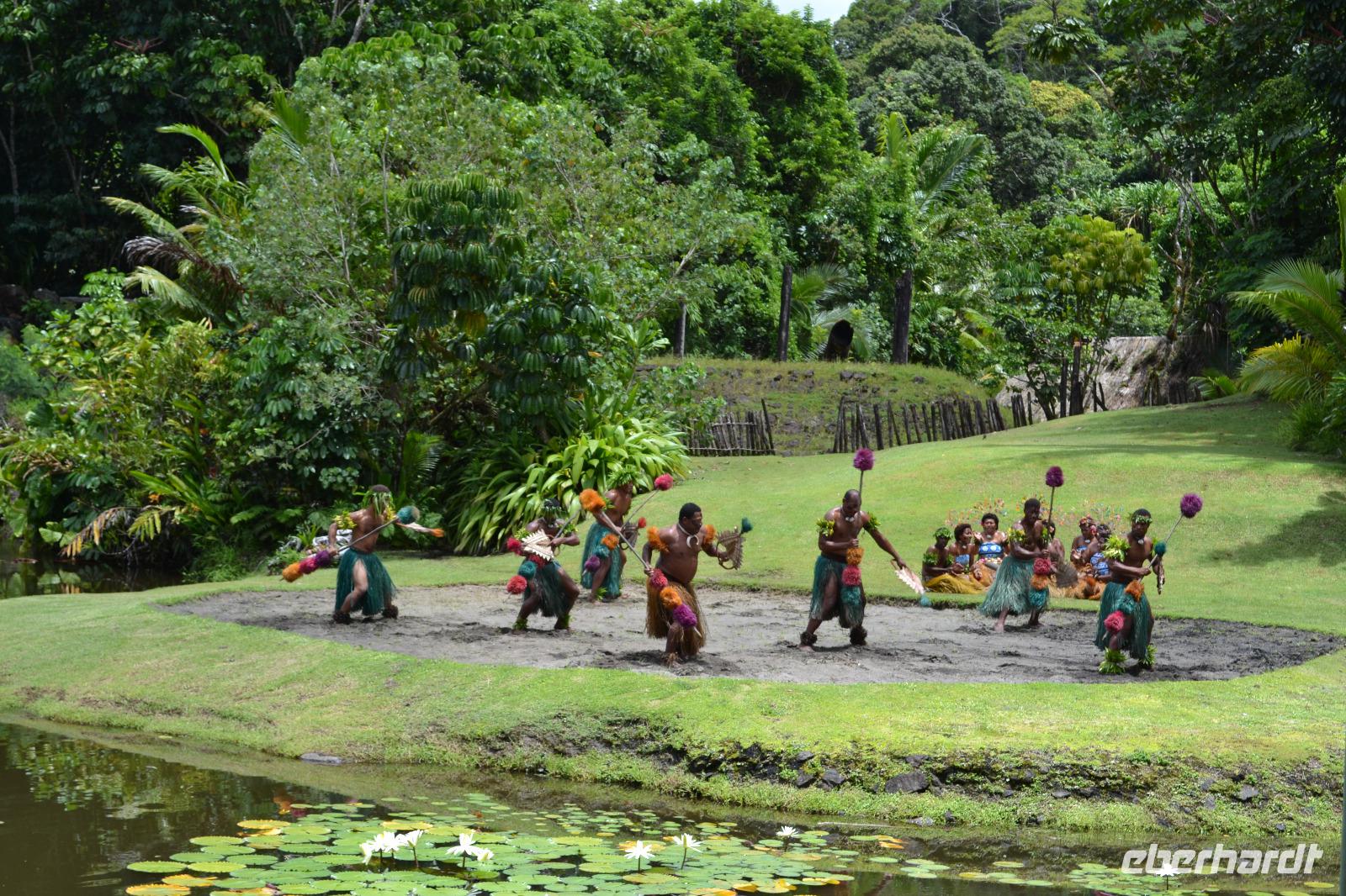 Was ist für Sie das Paradies? Kristallklares Wasser, ein feiner weißer Sandstrand, gesprenkelt mit Muschelstückchen und garniert mit Korallen, dazu im Wind wedelnde Palmen, dekorativ angerichtet? Gleichzeitig möchten Sie aber auf bestimmte Annehmlichkeiten der modernen Zivilisation nicht verzichten? Dann könnte die Mystery Island, die zum Inselstaat Vanuatu gehört, Ihren Vorstellungen sehr nahe kommen. Zum Baden, Planschen, Schnorcheln bieten sich hier ideale Bedingungen. Und bei einer Wassertemperatur von 27 Grad springt sogar der Eberhardt-Reisebegleiter hinein. Leben tut hier niemand, nur wenn ein Kreuzfahrtschiff vor Anker liegt, kommen die Einheimischen von der benachbarten und deutlich größeren Insel Aneytium herüber und besetzen ihre Stände. Keine Sorge, es gibt Bier, kleine Kostbarkeiten und Andenken, sie können sich massieren lassen und im Kannibalenkochtopf für ein Foto posieren. Auch Kanu- und Schnorcheltouren werden angeboten. Was aber ist nun das Mysterium, das Geheimnis? Während des Zweiten Weltkriegs konnten sich die Japaner nicht erklären, wie die Amerikaner von der hügeligen und dicht bewaldeten Insel Aneytium Flugzeuge starten konnten. Die kleine unscheinbare Insel Inyeug (eben jene „Mystery Island") direkt daneben war ihnen nicht bekannt. Den Flugplatz gibt es noch heute, und wir sehen sogar einige Chartermaschinen über unsere Köpfe hinweg starten. Während des anschließenden Seetags auf dem Weg zu den Fidschi-Inseln erwartet ein Paar aus unserer Mitte eine besondere Überraschung: Sie sind auf Hochzeitsreise und werden nun von unserem „Stammesältesten" im Südsee-Outfit noch einmal „vermählt".