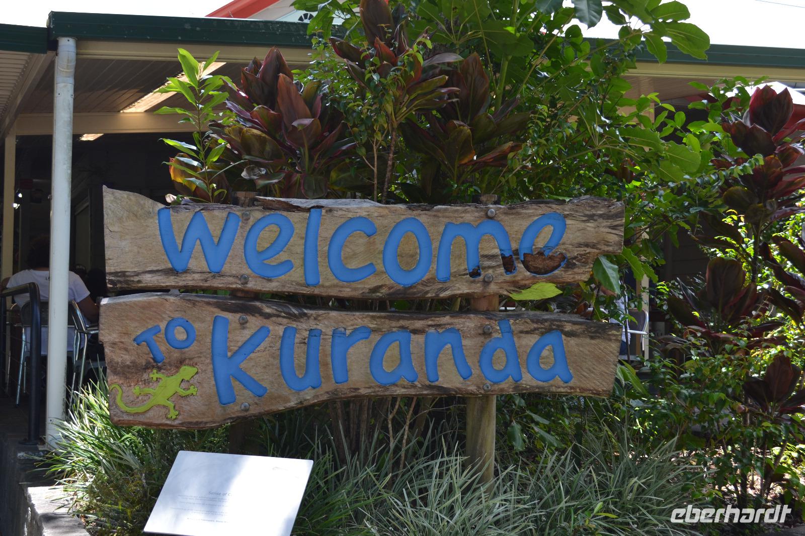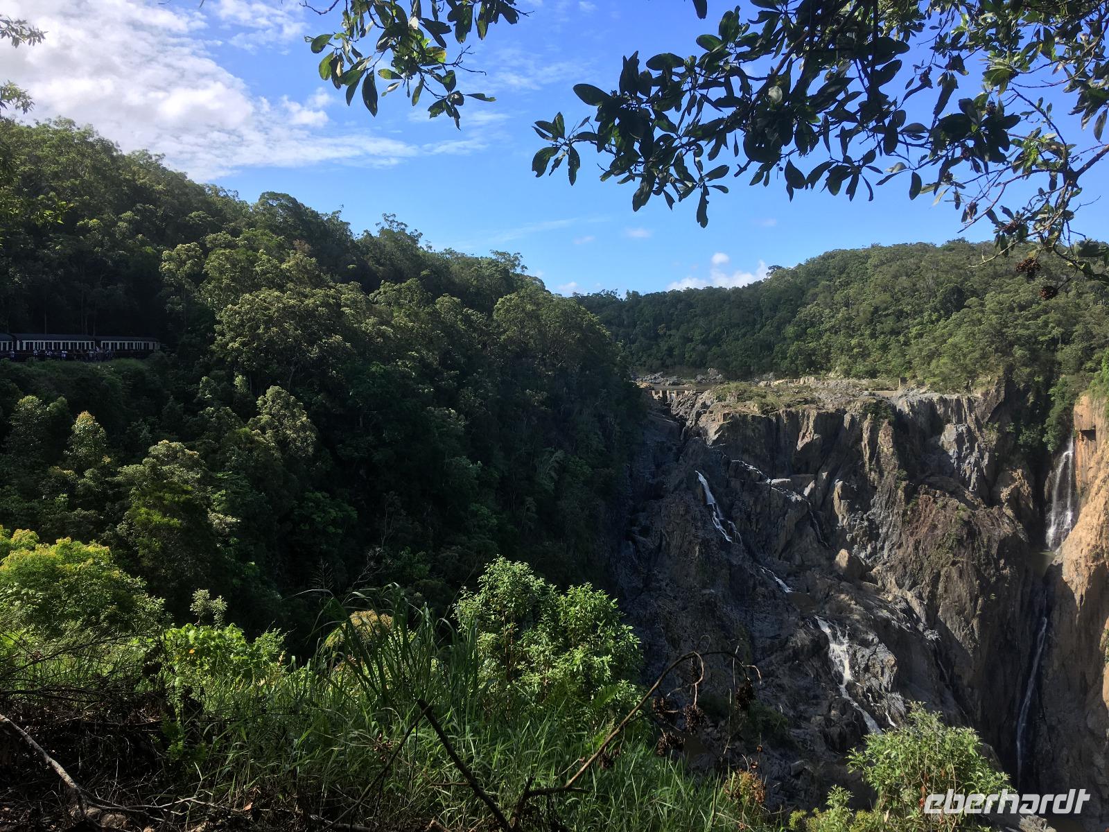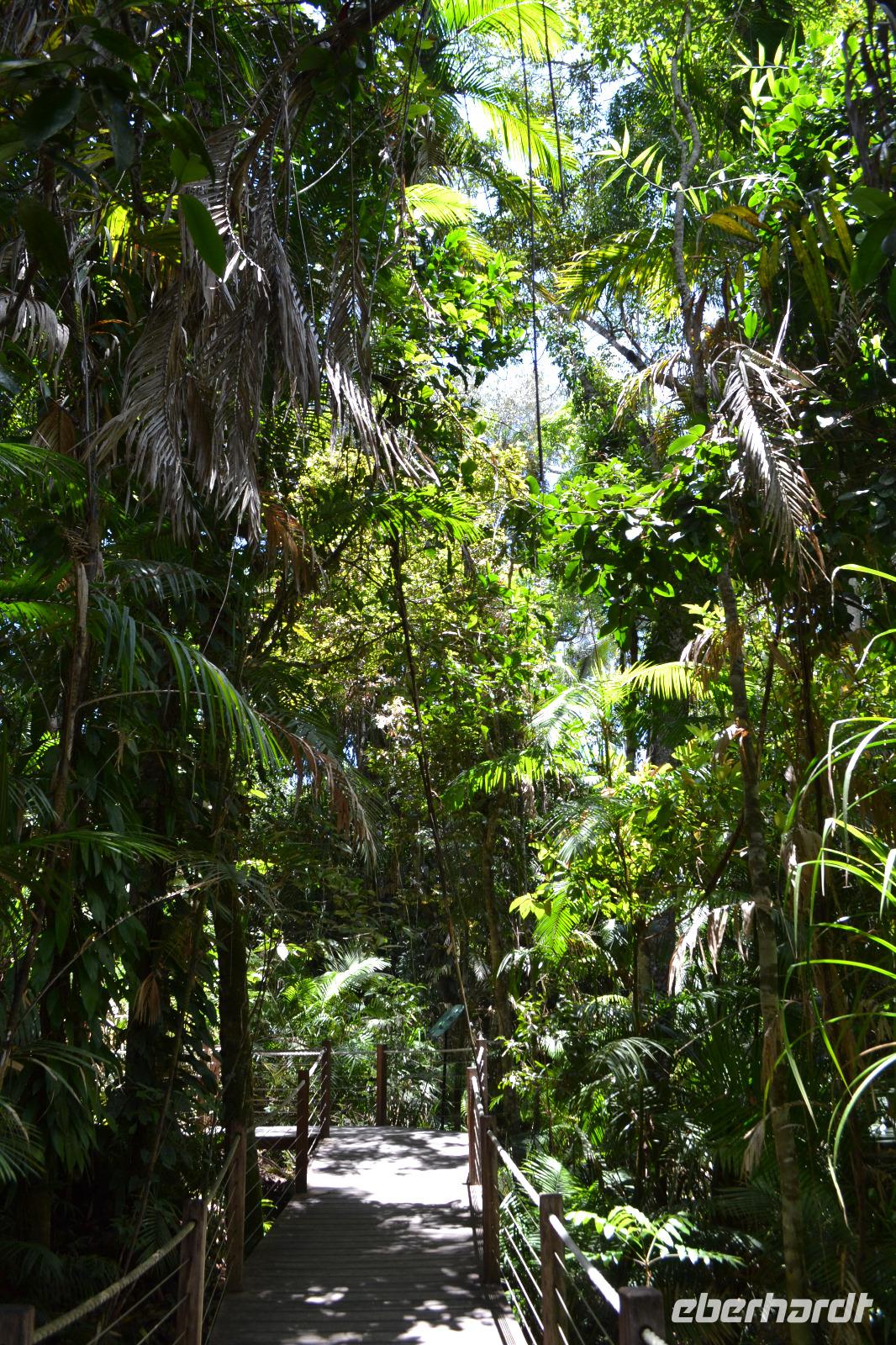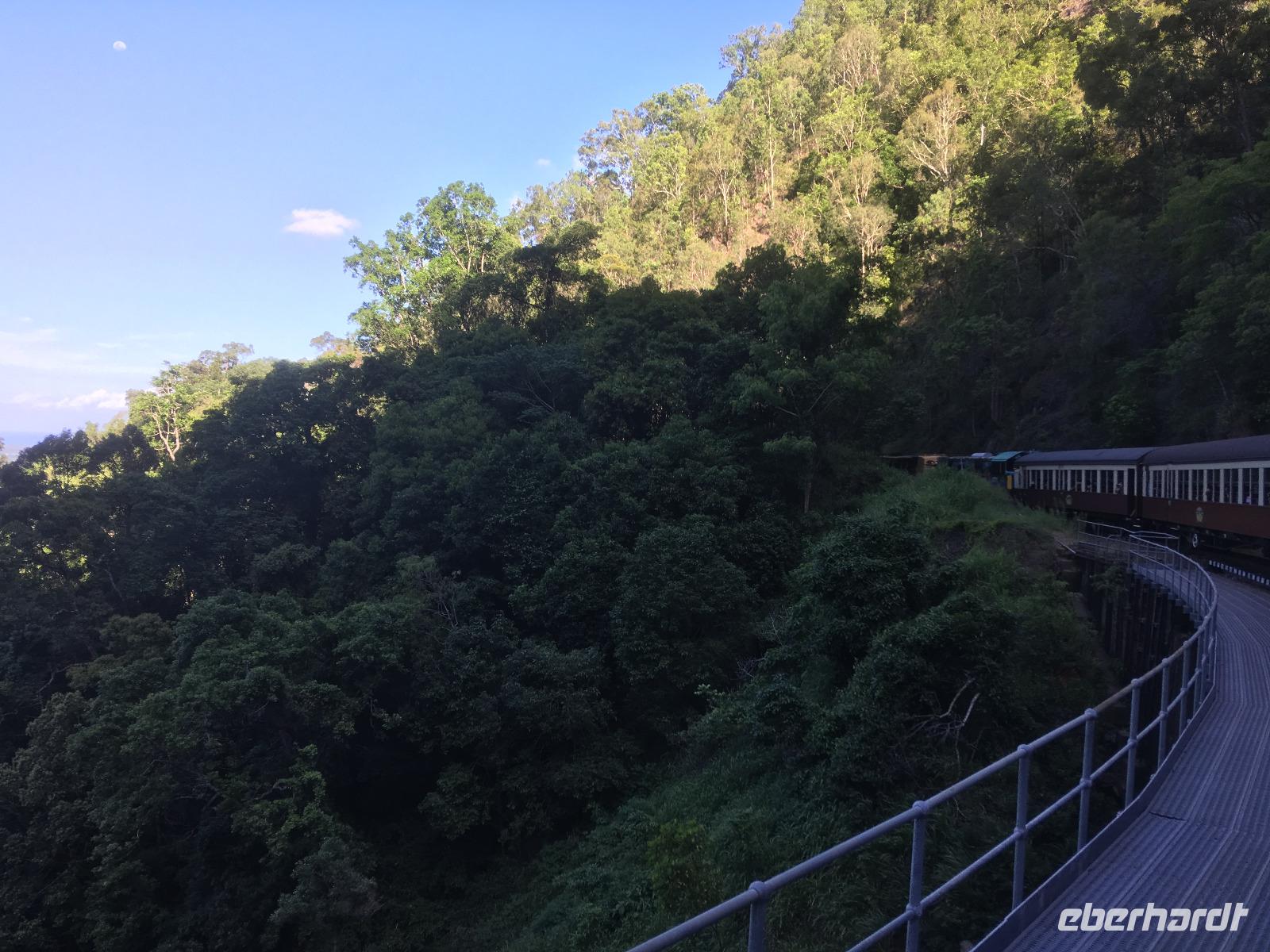 Obwohl ein Strandtag in Palm Cove verlockend klingt, haben sich alle meine Gäste für den fakultativen Ausflug in den Regenwald entschieden. Zuerst werden wir jedoch im Tjapukai Cultural Centre zu fähigen Jägern ausgebildet und im Umgang mit Wurfspeer und Boomerang geübt. Falls etwas schiefgeht, können wir nun im Regenwald überleben. Nach einer kleinen Show über die Traumzeit lernen wir auch die Imitationstänze des lokalen Stammes kennen und erfahren, mit Hilfe welcher Pflanzen wir uns theoretisch auch ernähren könnten. Ich finde es einfach nur unglaublich, dass diese Kultur schon 60.000 Jahre lang auf dem tödlichsten Kontinent der Erde überlebt hat! Nachdem ich mir noch meine „Kriegsbemalung" abgeholt habe, entschweben wir dann mit der Seilbahn über die grünen Dächer des Regenwalds nach Kuranda. An der Zwischenstation unternehmen wir sogar einen kleinen Regenwaldspaziergang und können weit über das Tafelland blicken. Aus der alten Holzfällerstadt Kuranda mitten im Regenwald hat sich ein Touristenmagnet und Künstlerdorf entwickelt, das mit einem großen Markt, einem Tierpark und einer Schmetterlingsaufzuchtstation lockt. Die vielen Hippies, die das Bild des Ortes lange dominierten, haben sich derweil in die Randgebiete zurückgezogen. Wir haben ungefähr zwei Stunden Freizeit, bevor wir mit der historischen Eisenbahn durch den Regenwald zurück nach Cairns fahren. Unterwegs halten wir an der Barron Gorge und fahren ganz dicht an einem Wasserfall vorbei.