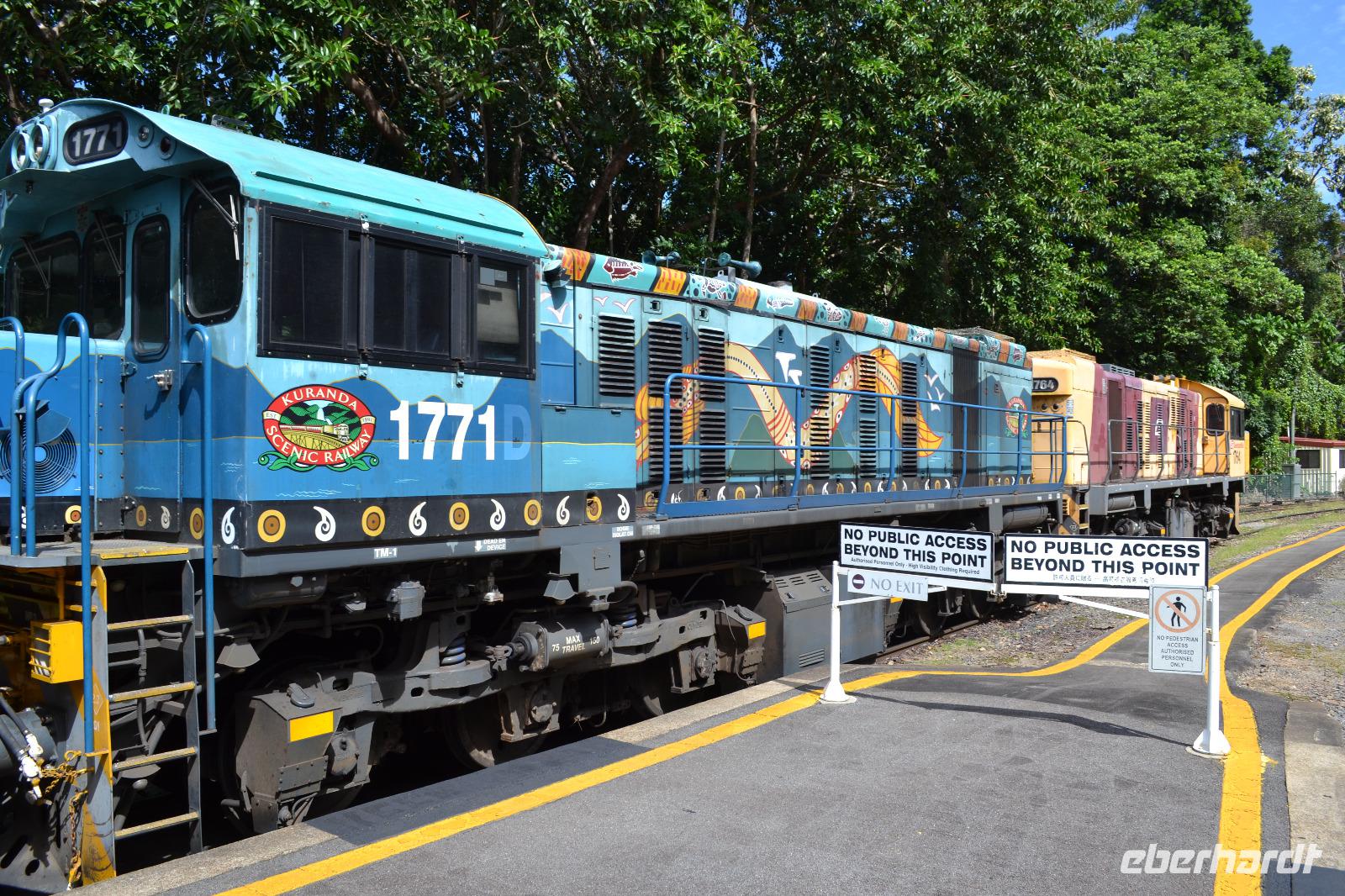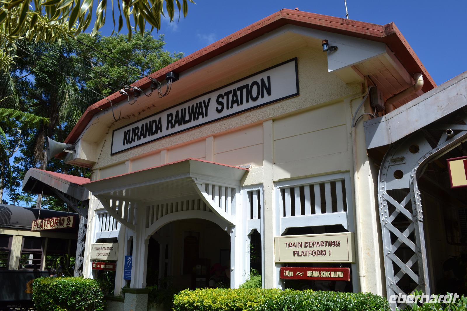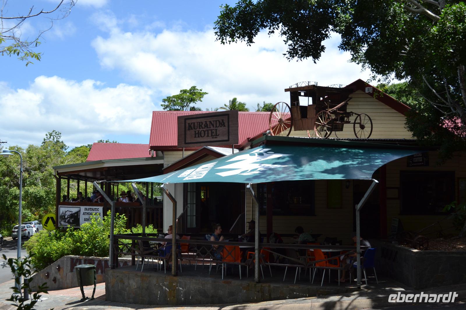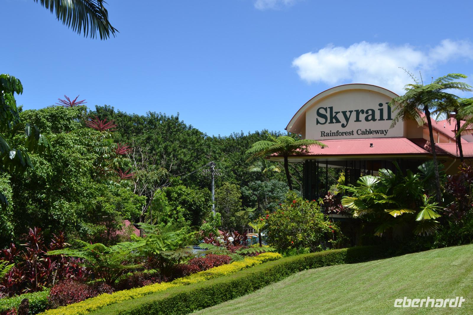 Obwohl ein Strandtag in Palm Cove verlockend klingt, haben sich alle meine Gäste für den fakultativen Ausflug in den Regenwald entschieden. Zuerst werden wir jedoch im Tjapukai Cultural Centre zu fähigen Jägern ausgebildet und im Umgang mit Wurfspeer und Boomerang geübt. Falls etwas schiefgeht, können wir nun im Regenwald überleben. Nach einer kleinen Show über die Traumzeit lernen wir auch die Imitationstänze des lokalen Stammes kennen und erfahren, mit Hilfe welcher Pflanzen wir uns theoretisch auch ernähren könnten. Ich finde es einfach nur unglaublich, dass diese Kultur schon 60.000 Jahre lang auf dem tödlichsten Kontinent der Erde überlebt hat! Nachdem ich mir noch meine „Kriegsbemalung" abgeholt habe, entschweben wir dann mit der Seilbahn über die grünen Dächer des Regenwalds nach Kuranda. An der Zwischenstation unternehmen wir sogar einen kleinen Regenwaldspaziergang und können weit über das Tafelland blicken. Aus der alten Holzfällerstadt Kuranda mitten im Regenwald hat sich ein Touristenmagnet und Künstlerdorf entwickelt, das mit einem großen Markt, einem Tierpark und einer Schmetterlingsaufzuchtstation lockt. Die vielen Hippies, die das Bild des Ortes lange dominierten, haben sich derweil in die Randgebiete zurückgezogen. Wir haben ungefähr zwei Stunden Freizeit, bevor wir mit der historischen Eisenbahn durch den Regenwald zurück nach Cairns fahren. Unterwegs halten wir an der Barron Gorge und fahren ganz dicht an einem Wasserfall vorbei.
