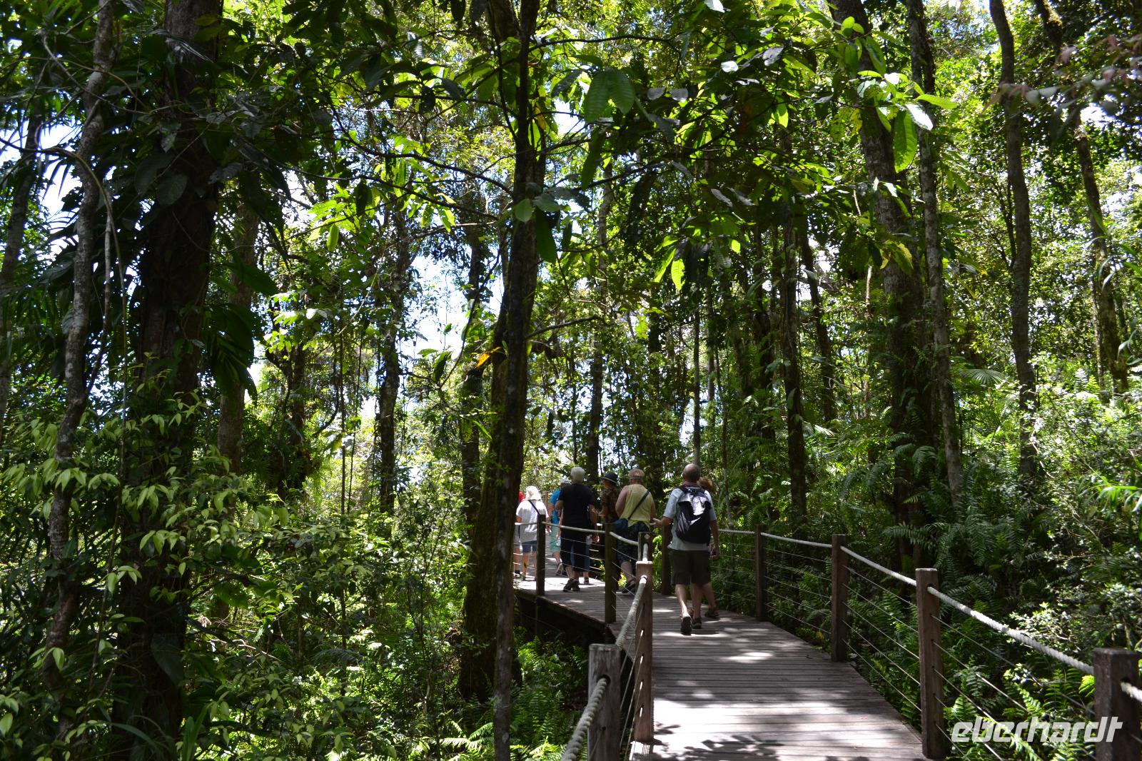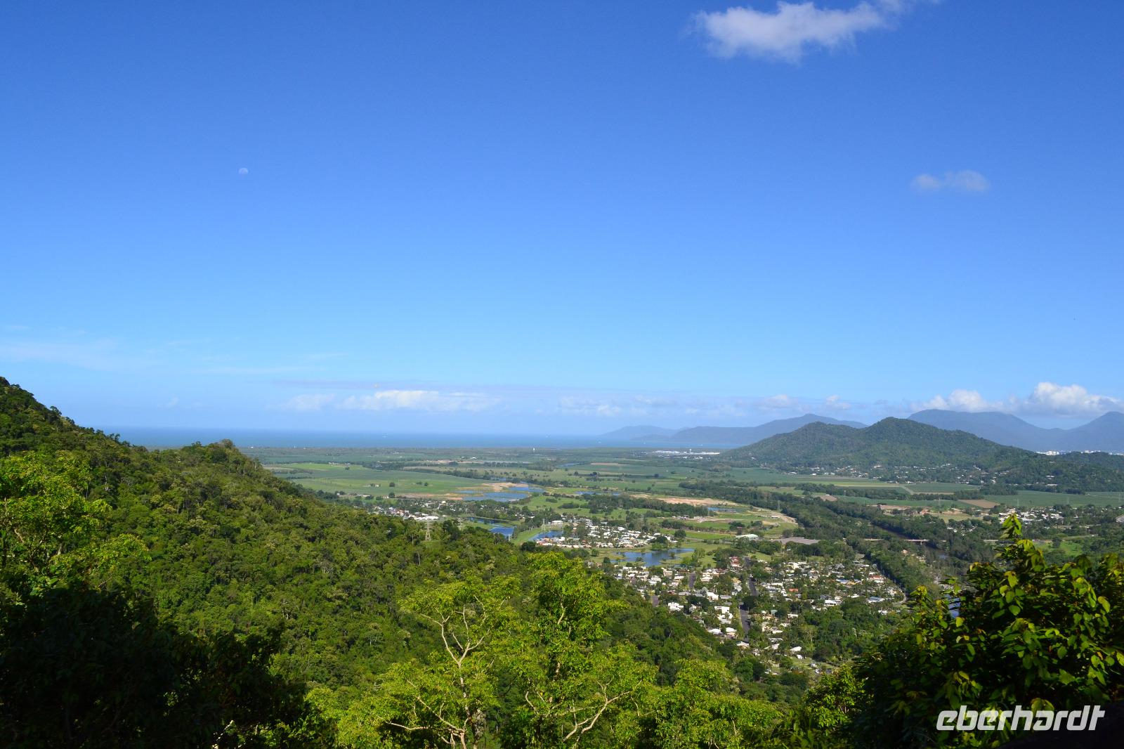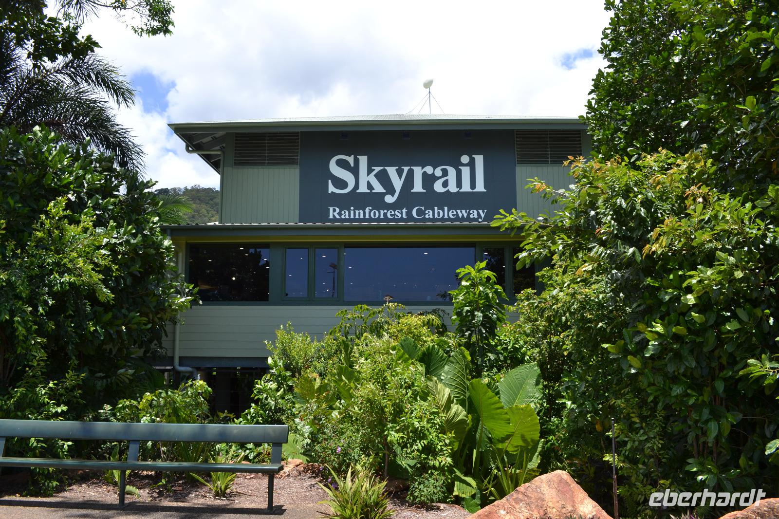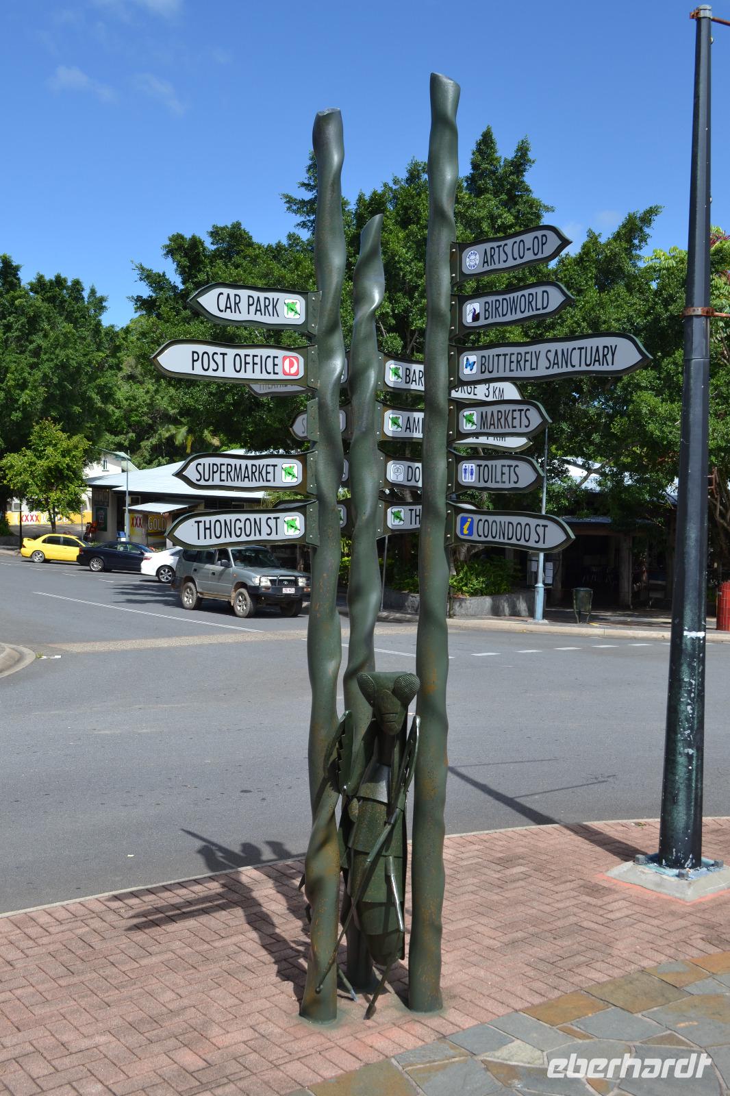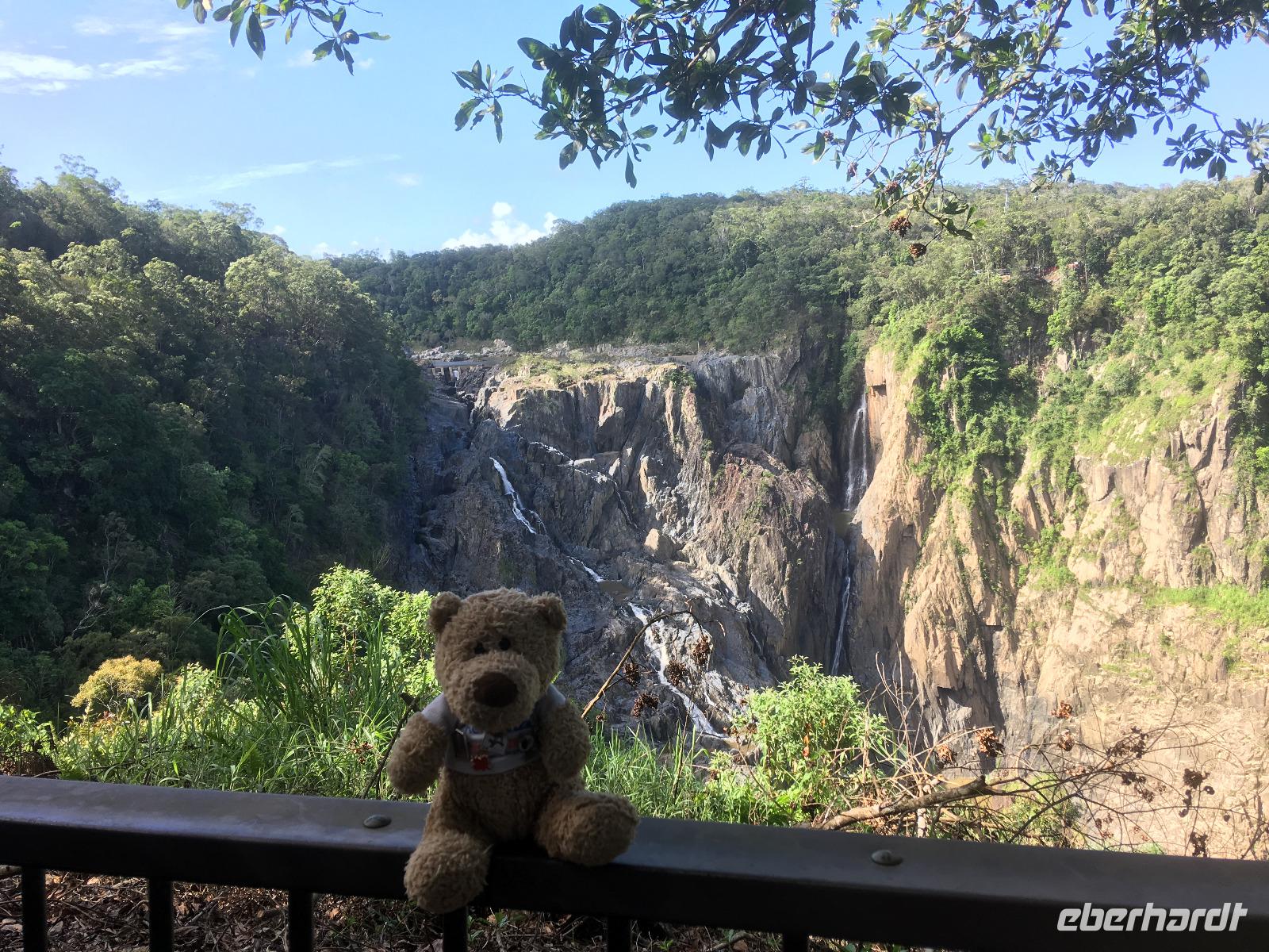 Obwohl ein Strandtag in Palm Cove verlockend klingt, haben sich alle meine Gäste für den fakultativen Ausflug in den Regenwald entschieden. Zuerst werden wir jedoch im Tjapukai Cultural Centre zu fähigen Jägern ausgebildet und im Umgang mit Wurfspeer und Boomerang geübt. Falls etwas schiefgeht, können wir nun im Regenwald überleben. Nach einer kleinen Show über die Traumzeit lernen wir auch die Imitationstänze des lokalen Stammes kennen und erfahren, mit Hilfe welcher Pflanzen wir uns theoretisch auch ernähren könnten. Ich finde es einfach nur unglaublich, dass diese Kultur schon 60.000 Jahre lang auf dem tödlichsten Kontinent der Erde überlebt hat! Nachdem ich mir noch meine „Kriegsbemalung" abgeholt habe, entschweben wir dann mit der Seilbahn über die grünen Dächer des Regenwalds nach Kuranda. An der Zwischenstation unternehmen wir sogar einen kleinen Regenwaldspaziergang und können weit über das Tafelland blicken. Aus der alten Holzfällerstadt Kuranda mitten im Regenwald hat sich ein Touristenmagnet und Künstlerdorf entwickelt, das mit einem großen Markt, einem Tierpark und einer Schmetterlingsaufzuchtstation lockt. Die vielen Hippies, die das Bild des Ortes lange dominierten, haben sich derweil in die Randgebiete zurückgezogen. Wir haben ungefähr zwei Stunden Freizeit, bevor wir mit der historischen Eisenbahn durch den Regenwald zurück nach Cairns fahren. Unterwegs halten wir an der Barron Gorge und fahren ganz dicht an einem Wasserfall vorbei.