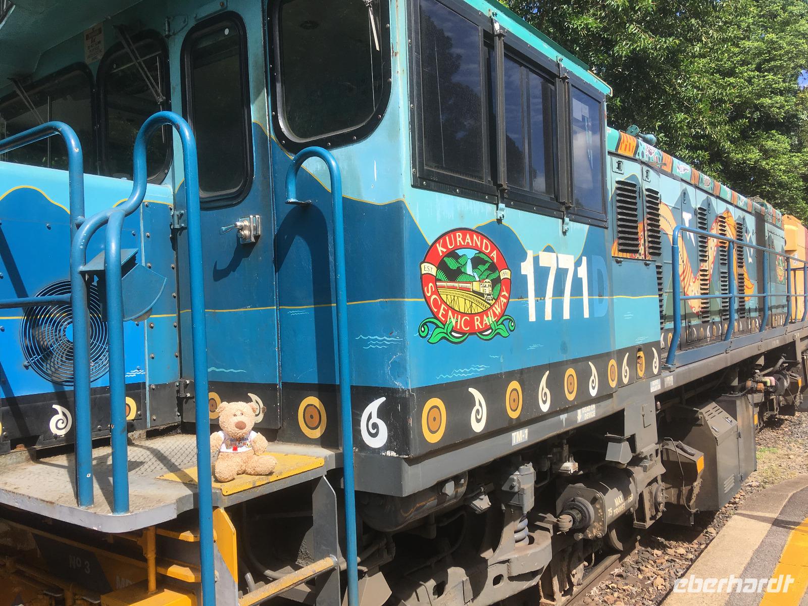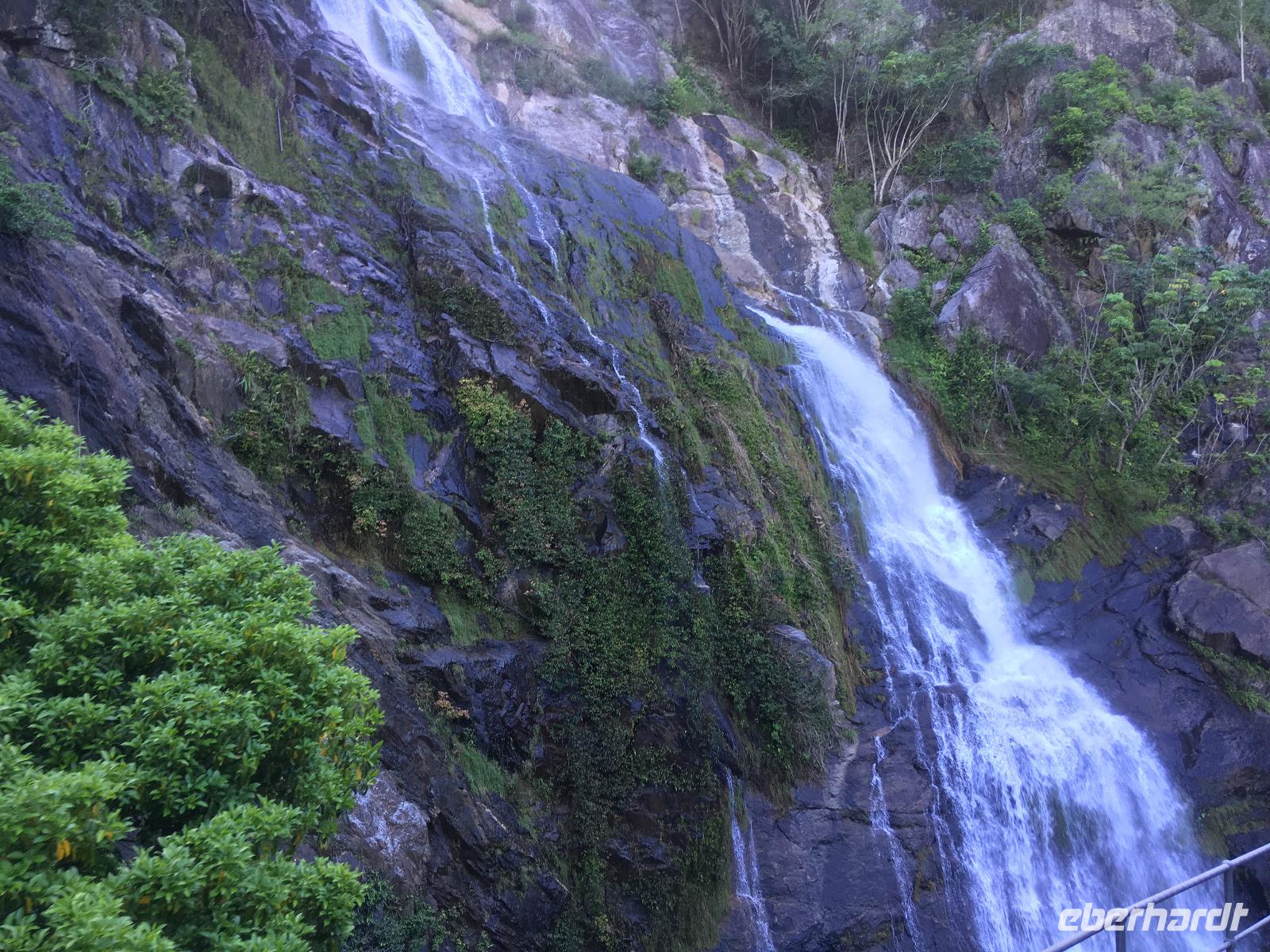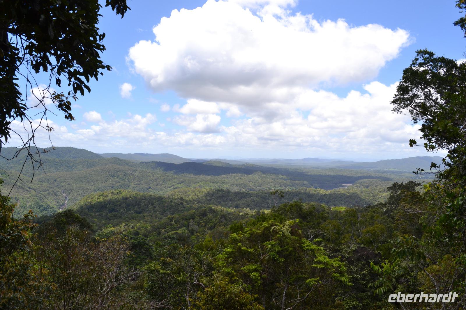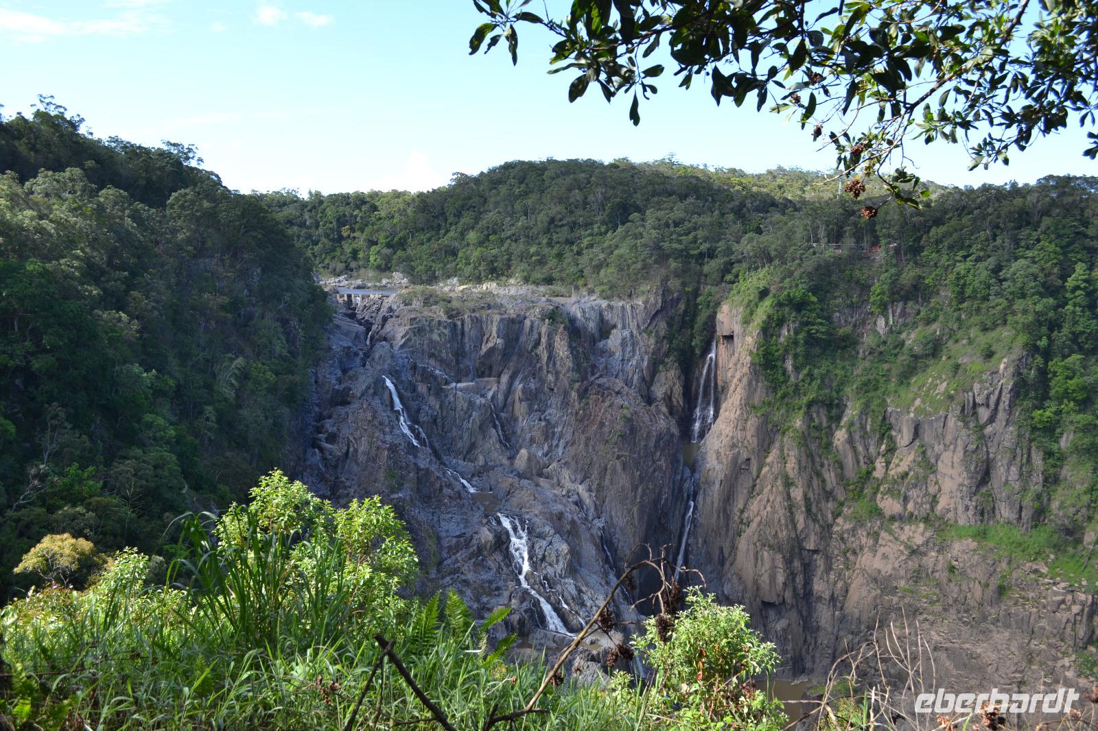 Obwohl ein Strandtag in Palm Cove verlockend klingt, haben sich alle meine Gäste für den fakultativen Ausflug in den Regenwald entschieden. Zuerst werden wir jedoch im Tjapukai Cultural Centre zu fähigen Jägern ausgebildet und im Umgang mit Wurfspeer und Boomerang geübt. Falls etwas schiefgeht, können wir nun im Regenwald überleben. Nach einer kleinen Show über die Traumzeit lernen wir auch die Imitationstänze des lokalen Stammes kennen und erfahren, mit Hilfe welcher Pflanzen wir uns theoretisch auch ernähren könnten. Ich finde es einfach nur unglaublich, dass diese Kultur schon 60.000 Jahre lang auf dem tödlichsten Kontinent der Erde überlebt hat! Nachdem ich mir noch meine „Kriegsbemalung" abgeholt habe, entschweben wir dann mit der Seilbahn über die grünen Dächer des Regenwalds nach Kuranda. An der Zwischenstation unternehmen wir sogar einen kleinen Regenwaldspaziergang und können weit über das Tafelland blicken. Aus der alten Holzfällerstadt Kuranda mitten im Regenwald hat sich ein Touristenmagnet und Künstlerdorf entwickelt, das mit einem großen Markt, einem Tierpark und einer Schmetterlingsaufzuchtstation lockt. Die vielen Hippies, die das Bild des Ortes lange dominierten, haben sich derweil in die Randgebiete zurückgezogen. Wir haben ungefähr zwei Stunden Freizeit, bevor wir mit der historischen Eisenbahn durch den Regenwald zurück nach Cairns fahren. Unterwegs halten wir an der Barron Gorge und fahren ganz dicht an einem Wasserfall vorbei.