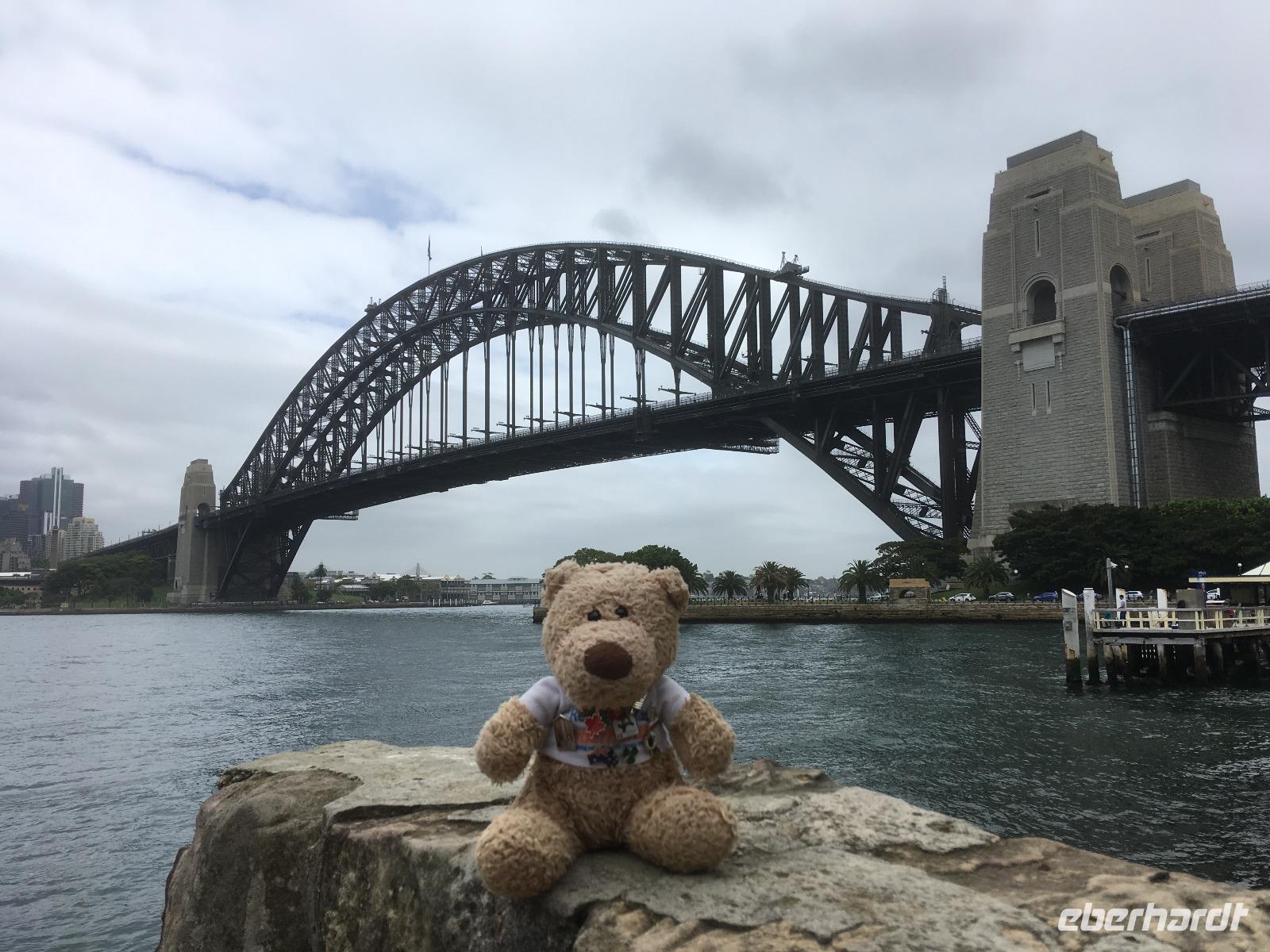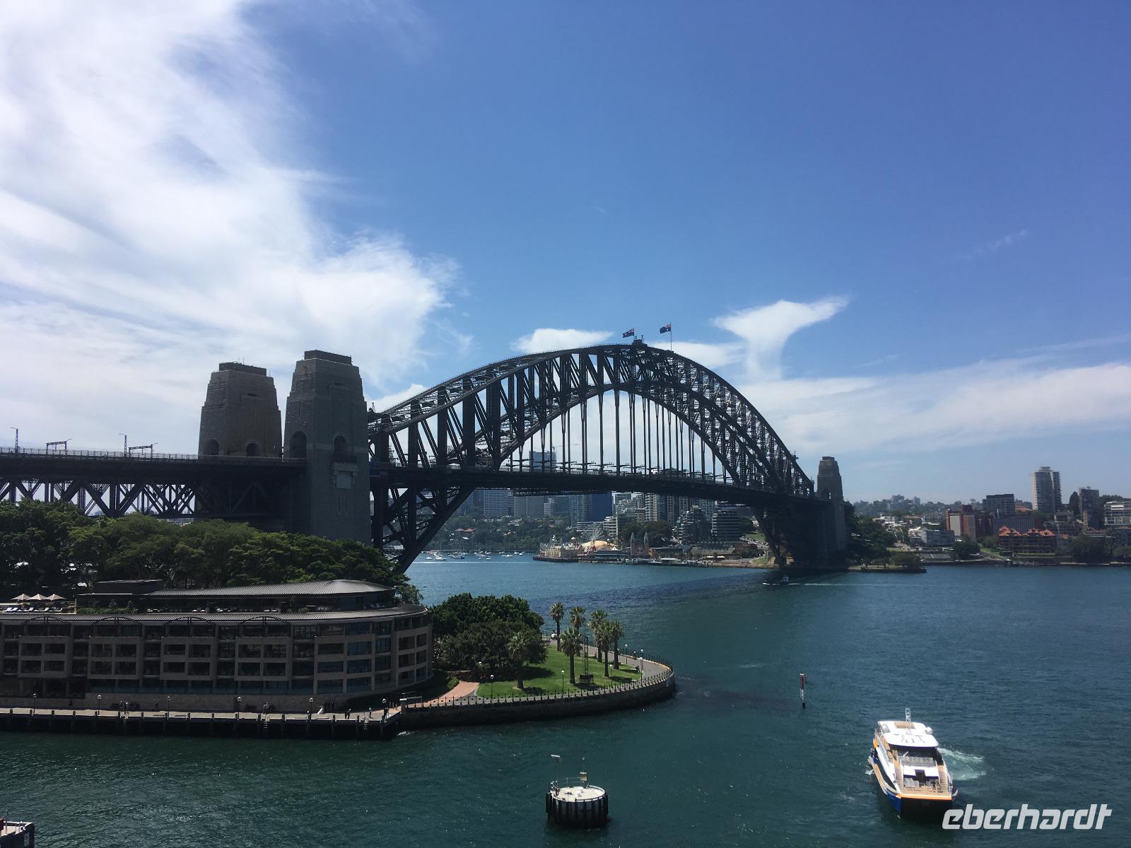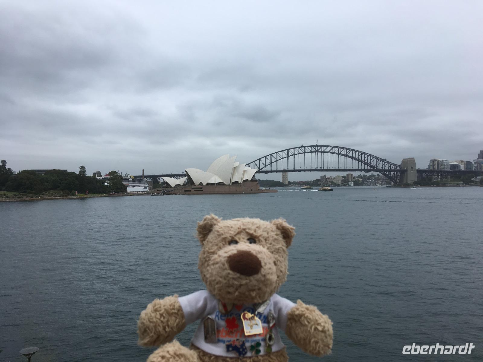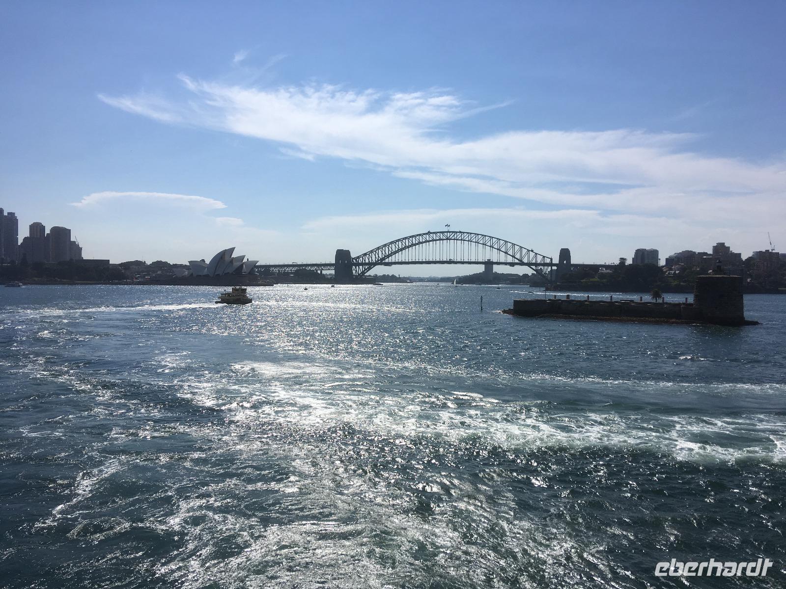 Unsere Uli erwartet uns am nächsten Morgen schon aufgeregt in der Lobby des Hotels, denn sie möchte uns natürlich auf der halbtägigen Stadtrundfahrt unbedingt ihre Wahlheimat am anderen Ende der Welt zeigen. Wir beginnen im ältesten Stadtviertel, The Rocks, in dem es noch viele historische Häuser und vor allem Pubs gibt. Dann halten wir mit dem Bus unter dem wohl berühmtesten „Kleiderbügel" der Welt, der Harbour Bridge, und gehen zu einem Aussichtspunkt, von dem aus wir das Opernhaus fotografieren können. Zwei so markante, auf ihre eigene Art wunderschöne Bauwerke, die gemeinsam einen Kontinent repräsentieren, das gibt es nur hier, in Sydney. Sie merken, ich gerate ins Schwärmen, denn ich erinnere mich auf dieser Stadtrundfahrt an meine eigene erstmalige Ankunft in Australien Ende Oktober 2012. Ungläubig habe ich damals beide Wahrzeichen angestarrt und bin traumwandlerisch über die Harbour Bridge spaziert. Mehr oder weniger entlang des Wassers arbeiten wir uns durch den Botanischen Garten bis zur Hafeneinfahrt, d. h. der Mündung des Port Jackson in den Pazifik vor. Hier werden wir übermorgen mit dem Schiff durchfahren und zu unserer Kreuzfahrt zu den Fidschi-Inseln aufbrechen. Am berühmten Bondi Beach machen wir eine kleine Kaffeepause und durchqueren dann mehrere historische Stadtviertel, bevor wir die Stadtrundfahrt in der Nähe des Kreuzfahrtterminals beenden. Während zwei Gäste einen Hubschrauberflug über Sydney unternehmen, überquere ich dann mit allen anderen Gästen tatsächlich die Harbour Bridge. 1932 wurde sie offiziell eröffnet, nach acht Jahren Bauzeit. Von der Brücke aus kann man das Opernhaus und auch das Stadtzentrum um den Circular Quay besonders gut fotografieren. Mit den Tickets, die wir von Uli erhalten haben, fahren wir mit der Fähre vom Luna Park zum Darling Harbour. Hier trennen sich unsere Wege vorerst, bevor wir uns am Abend wieder zusammenfinden, um über den Dächern von Sydney, auf der Dachterrasse des Glenmore Hotel, ein großes Ereignis zu feiern: Die Taufe meines kleinen Eberhardt-Reisebären. Von nun an trägt er denselben Namen wie unser Busfahrer - Max.