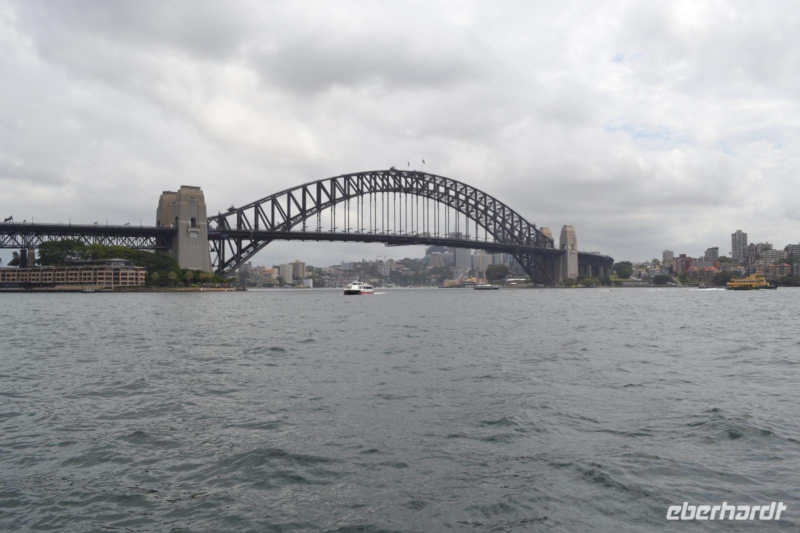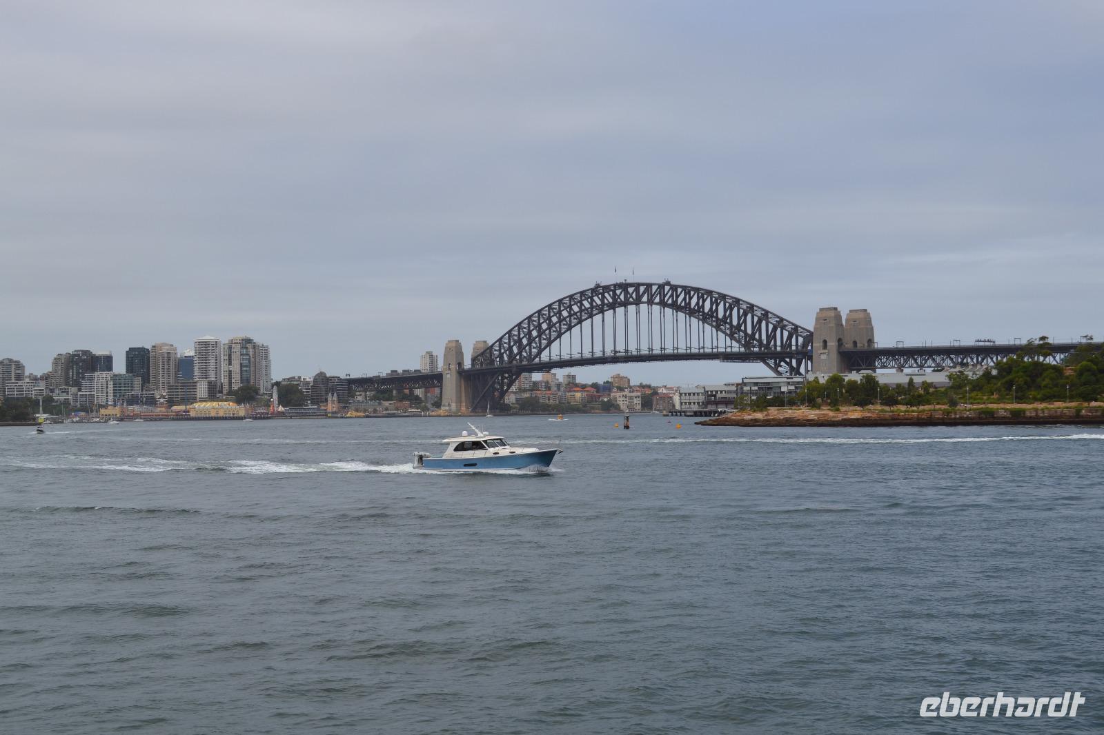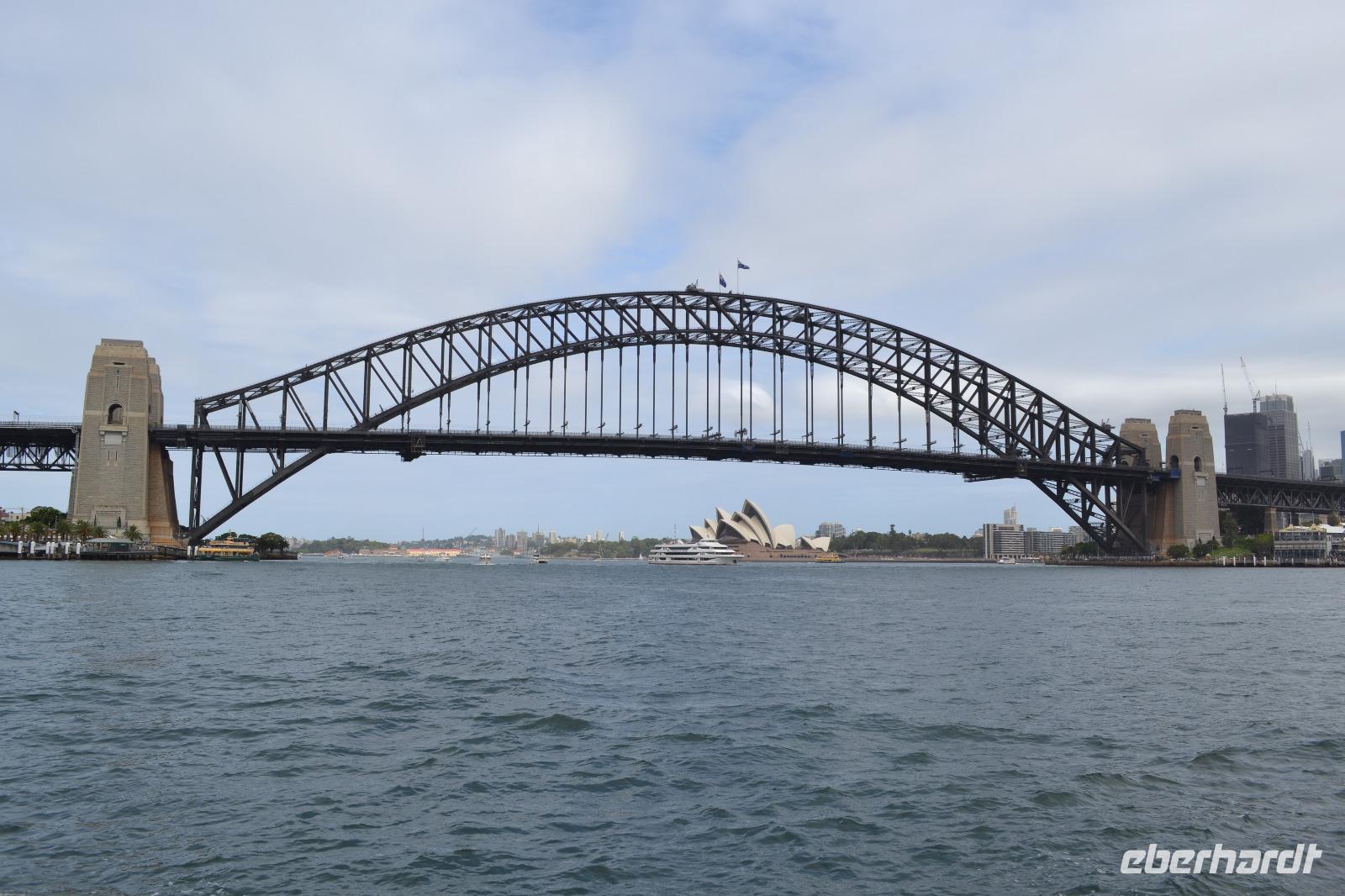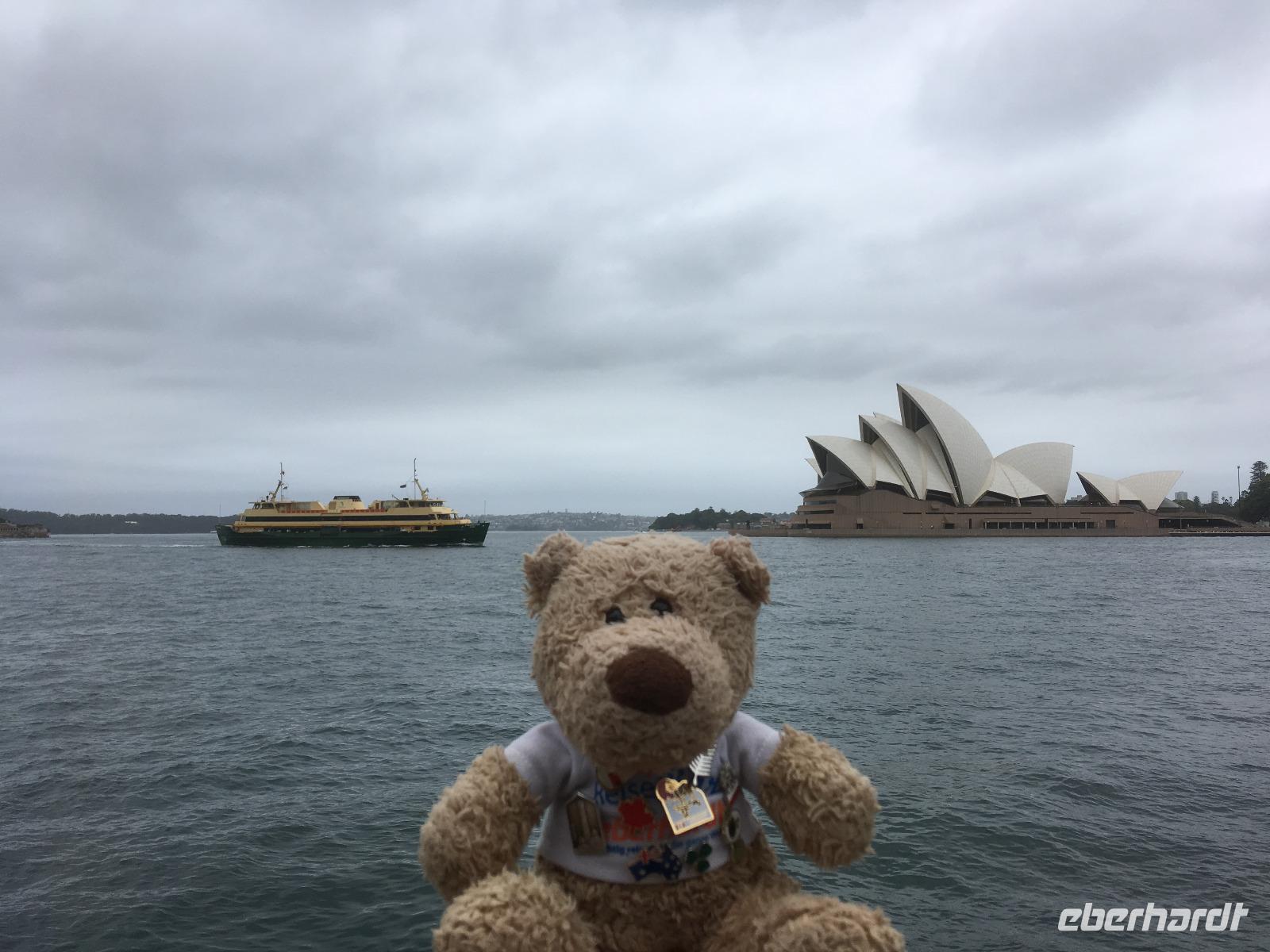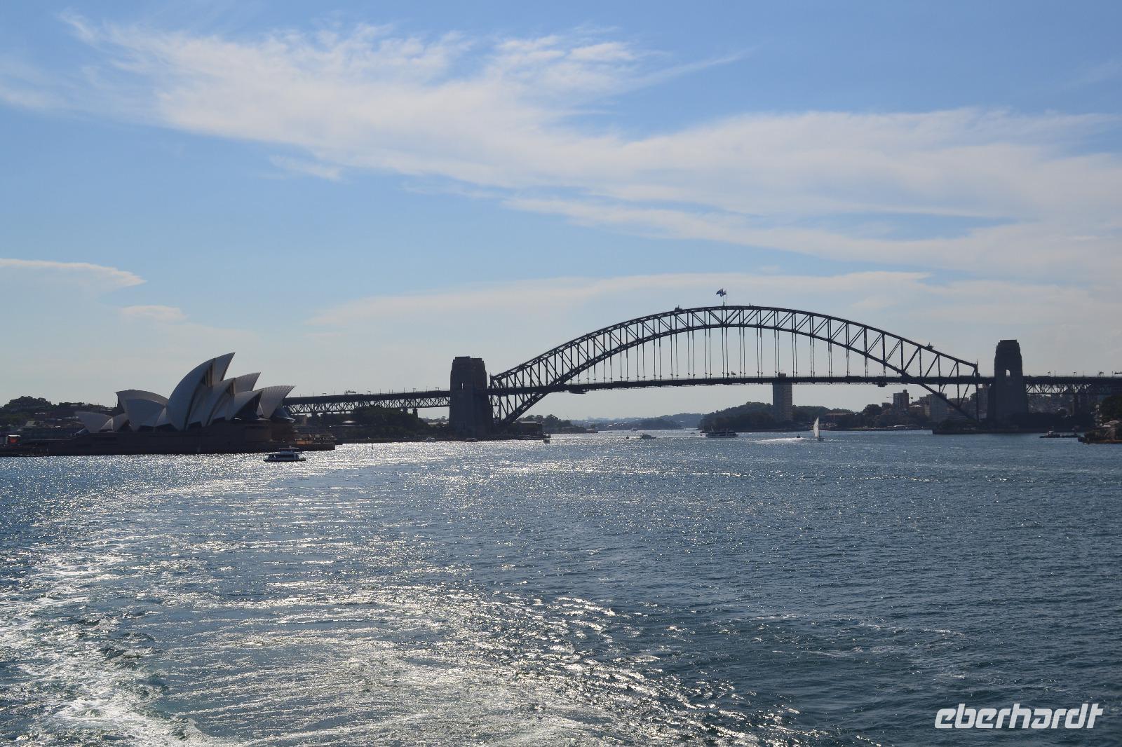 Unsere Uli erwartet uns am nächsten Morgen schon aufgeregt in der Lobby des Hotels, denn sie möchte uns natürlich auf der halbtägigen Stadtrundfahrt unbedingt ihre Wahlheimat am anderen Ende der Welt zeigen. Wir beginnen im ältesten Stadtviertel, The Rocks, in dem es noch viele historische Häuser und vor allem Pubs gibt. Dann halten wir mit dem Bus unter dem wohl berühmtesten „Kleiderbügel" der Welt, der Harbour Bridge, und gehen zu einem Aussichtspunkt, von dem aus wir das Opernhaus fotografieren können. Zwei so markante, auf ihre eigene Art wunderschöne Bauwerke, die gemeinsam einen Kontinent repräsentieren, das gibt es nur hier, in Sydney. Sie merken, ich gerate ins Schwärmen, denn ich erinnere mich auf dieser Stadtrundfahrt an meine eigene erstmalige Ankunft in Australien Ende Oktober 2012. Ungläubig habe ich damals beide Wahrzeichen angestarrt und bin traumwandlerisch über die Harbour Bridge spaziert. Mehr oder weniger entlang des Wassers arbeiten wir uns durch den Botanischen Garten bis zur Hafeneinfahrt, d. h. der Mündung des Port Jackson in den Pazifik vor. Hier werden wir übermorgen mit dem Schiff durchfahren und zu unserer Kreuzfahrt zu den Fidschi-Inseln aufbrechen. Am berühmten Bondi Beach machen wir eine kleine Kaffeepause und durchqueren dann mehrere historische Stadtviertel, bevor wir die Stadtrundfahrt in der Nähe des Kreuzfahrtterminals beenden. Während zwei Gäste einen Hubschrauberflug über Sydney unternehmen, überquere ich dann mit allen anderen Gästen tatsächlich die Harbour Bridge. 1932 wurde sie offiziell eröffnet, nach acht Jahren Bauzeit. Von der Brücke aus kann man das Opernhaus und auch das Stadtzentrum um den Circular Quay besonders gut fotografieren. Mit den Tickets, die wir von Uli erhalten haben, fahren wir mit der Fähre vom Luna Park zum Darling Harbour. Hier trennen sich unsere Wege vorerst, bevor wir uns am Abend wieder zusammenfinden, um über den Dächern von Sydney, auf der Dachterrasse des Glenmore Hotel, ein großes Ereignis zu feiern: Die Taufe meines kleinen Eberhardt-Reisebären. Von nun an trägt er denselben Namen wie unser Busfahrer - Max.