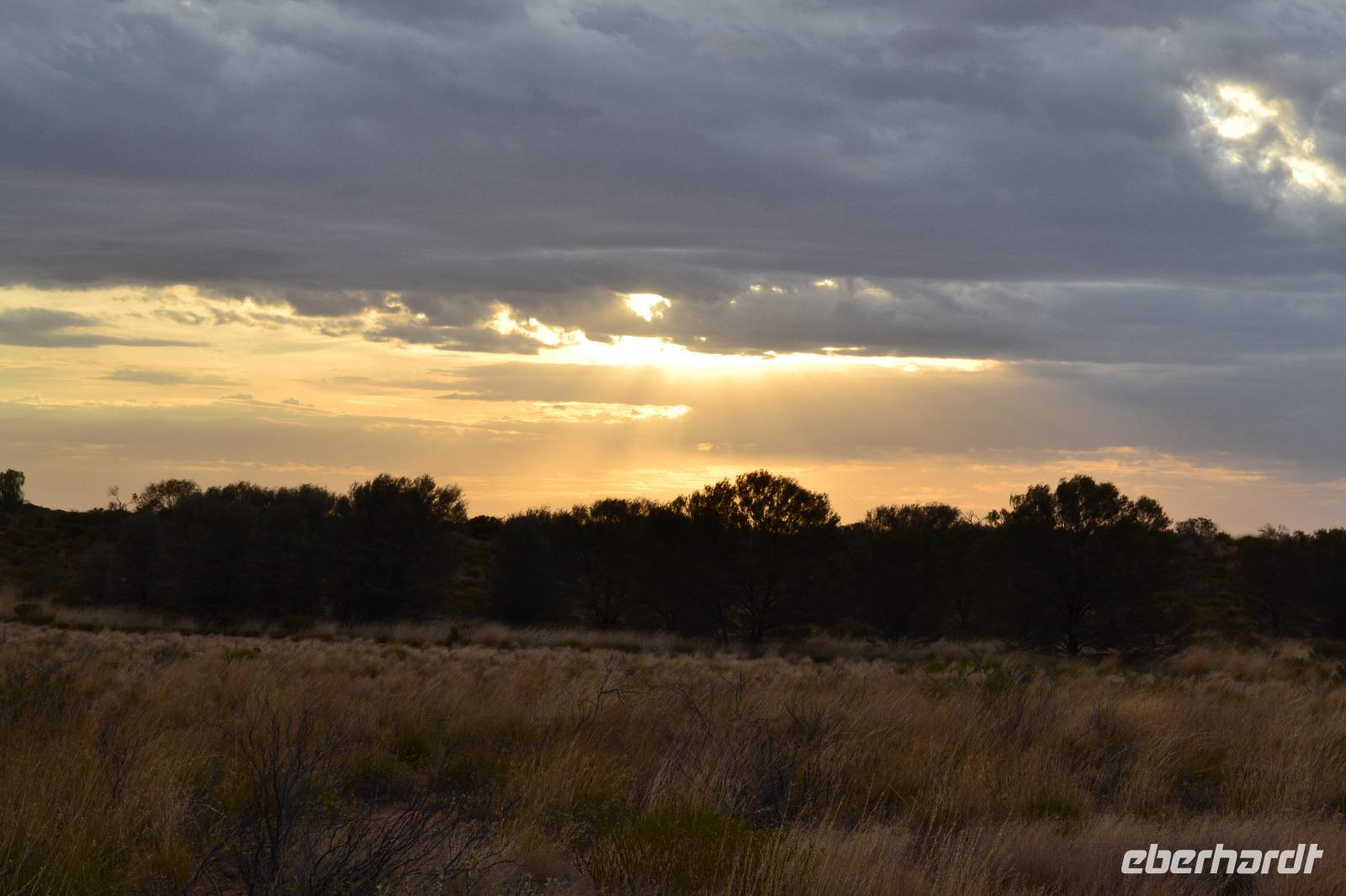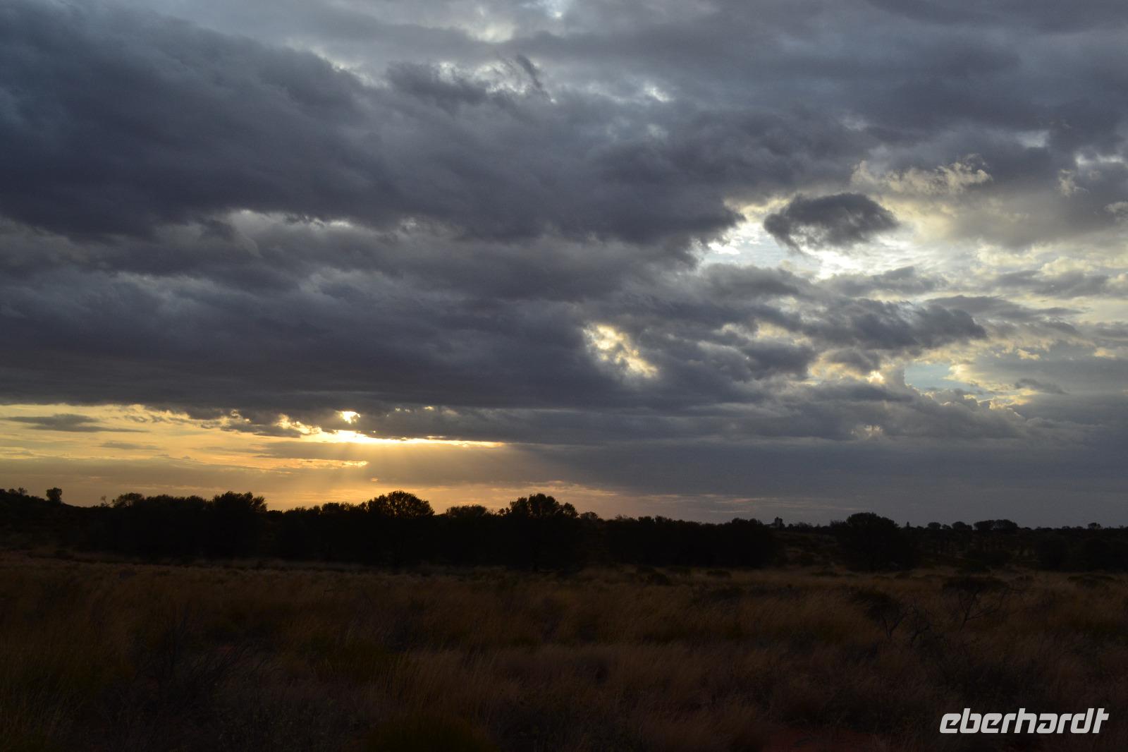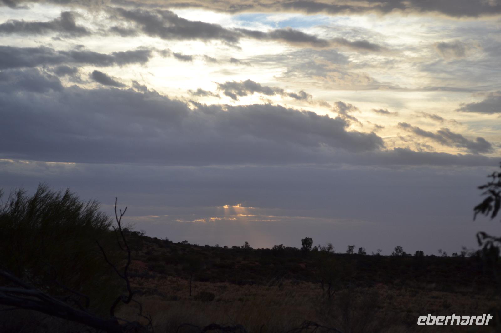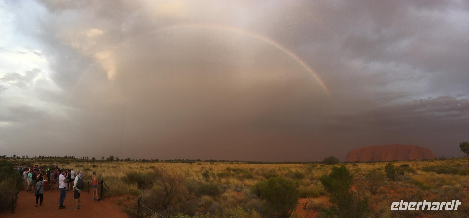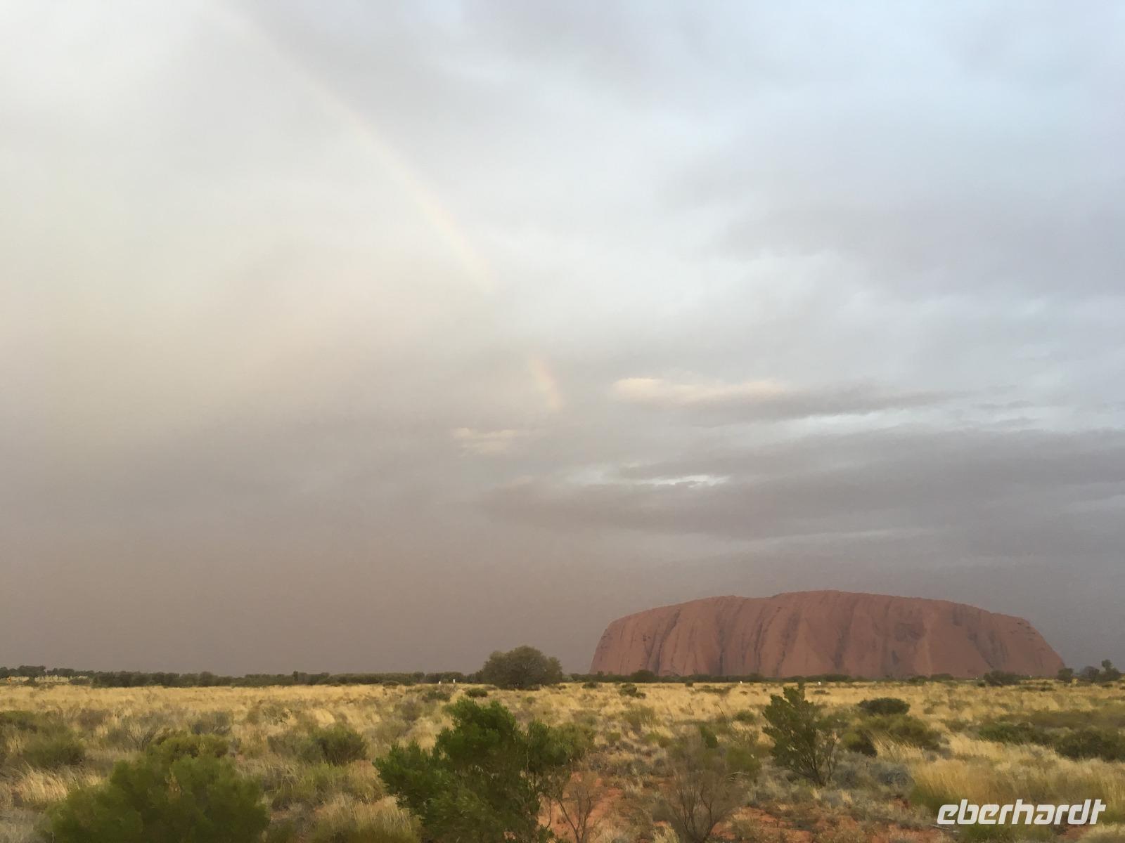 Das Herz des Roten Kontinents wartet heute auf uns - und es ist so ungeduldig, dass es uns gar nicht richtig ausschlafen lässt. Noch im Dunkeln werden wir zum Flughafen von Cairns gebracht, wo wir nach dem Einchecken unsere Frühstückspakete schlachten. Der Flughafen Ayers Rock ist noch übersichtlicher als der von Cairns, und so fällt es uns nicht schwer, unseren neuen örtlichen Reiseleiter Johannes zu finden, der gleichzeitig auch unser Fahrer ist. Wir laden die Koffer in den Anhänger und düsen los in Richtung Uluru-Kata-Tjuta-Nationalpark. Es ist sehr heiß draußen, aber zum Glück hat unser Kleinbus eine Klimaanlage und für Trinkwasser ist auch gesorgt. Am Uluru (Ayers Rock) fahren wir zunächst vorbei, auch wenn uns das bekannteste natürliche Wahrzeichen Australiens selbstverständlich ganz besonders reizt. Stattdessen fahren wir zur Kata Tjuta, den 36 Köpfen, dessen höchster mit 564 m sogar höher als der Uluru ist. Die Formationen Kata Tjuta (Olgas) und Uluru sind zur gleichen Zeit entstanden - vor mehr als 300 Millionen Jahren. Während der Uluru aus feinkörnigem Sandstein besteht, ist es bei den Olgas verkittetes Geröll. Nach einem ersten Panorama-Fotostopp können wir dies anschließend bei einer Wanderung in die Walpa Gorge auch eindeutig erkennen. Leider schmälern die vielen Fliegen und die brennende Sonne das Vergnügen. So flüchten wir nach einer Weile zurück in den Bus und fahren schon jetzt zum Sonnenuntergangs-Aussichtspunkt am Uluru, um ein paar Fotos zu machen. Die Mittagspause verbringen wir im übersichtlichen Zentrum des Resort-Ortes Yulara - Essen und Bier bekommt uns aber vorzüglich. In der Zwischenzeit checkt uns Johannes im Hotel ein und lässt uns die Koffer schon auf unsere Zimmer bringen. Dann holt er uns am Marktplatz ab, und wir können uns bis zum Abend erholen. Mit einem Gläschen Sekt und ein paar Snacks gerüstet, wollen wir später dann den Sonnenuntergang am Uluru genießen. Tatsächlich haben sich aber dunkle Regenwolken am Himmel gebildet, und vom Sonnenuntergang ist nicht so viel zu sehen. Dafür sehen wir aber einen wunderschönen Regenbogen und eine Schlange, die eine Fledermaus verspeist! Beim anschließenden Barbecue (australisch: Barbie) im Hotel können wir uns bei Live-Musik unser Abendessen selbst grillen - wie echte Australier.