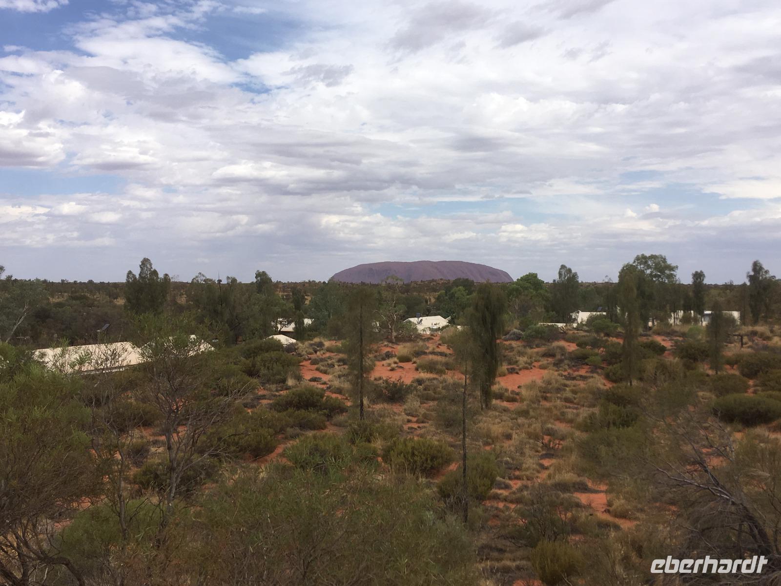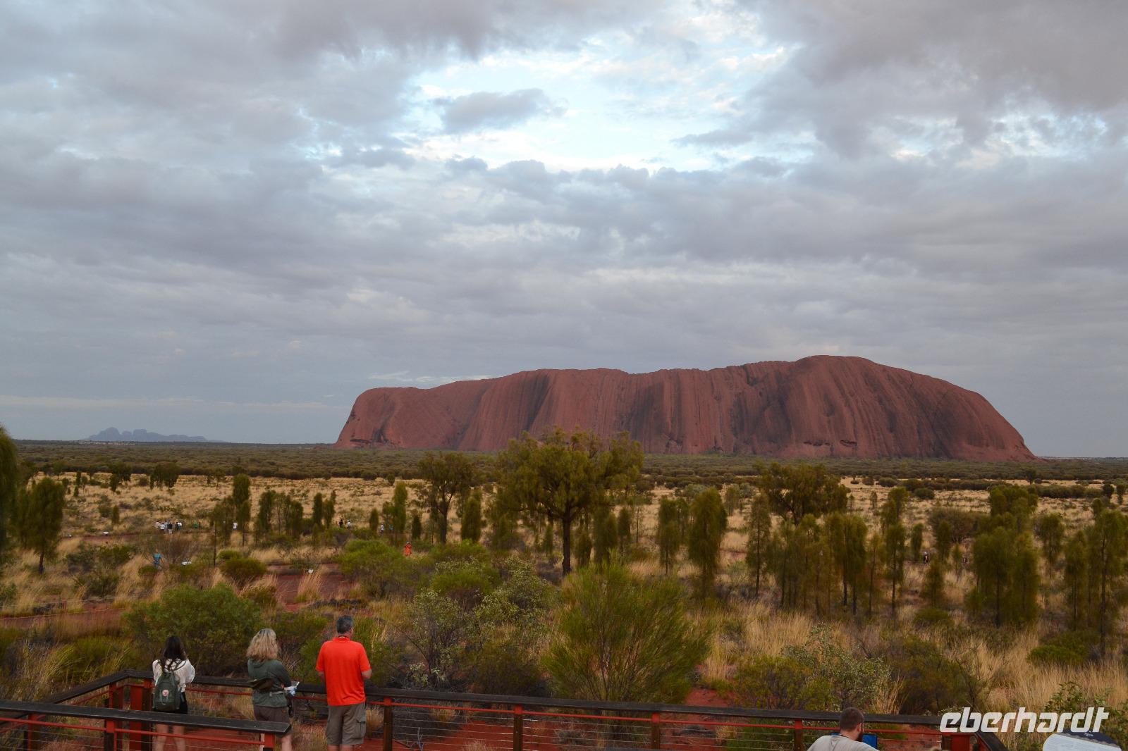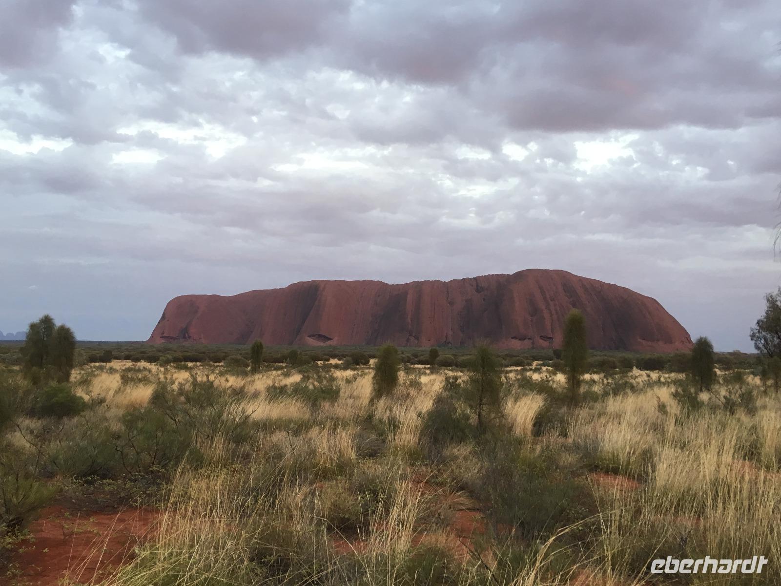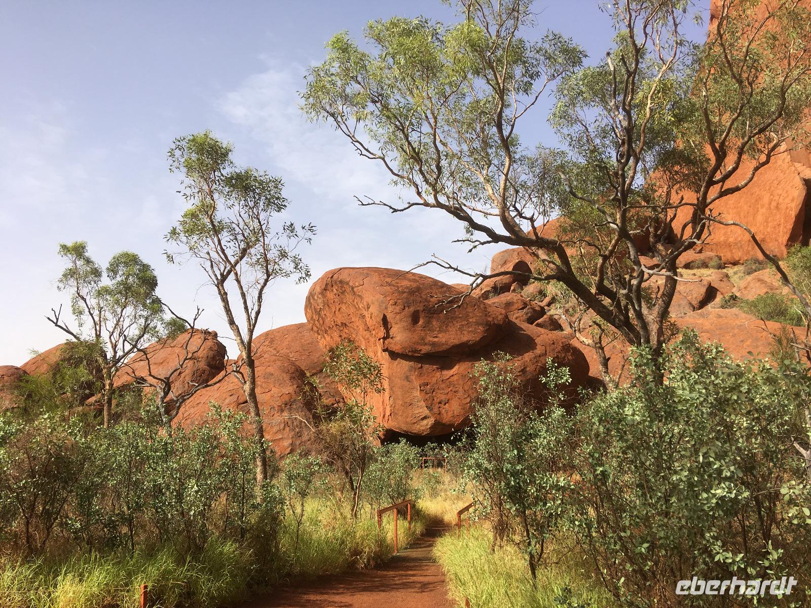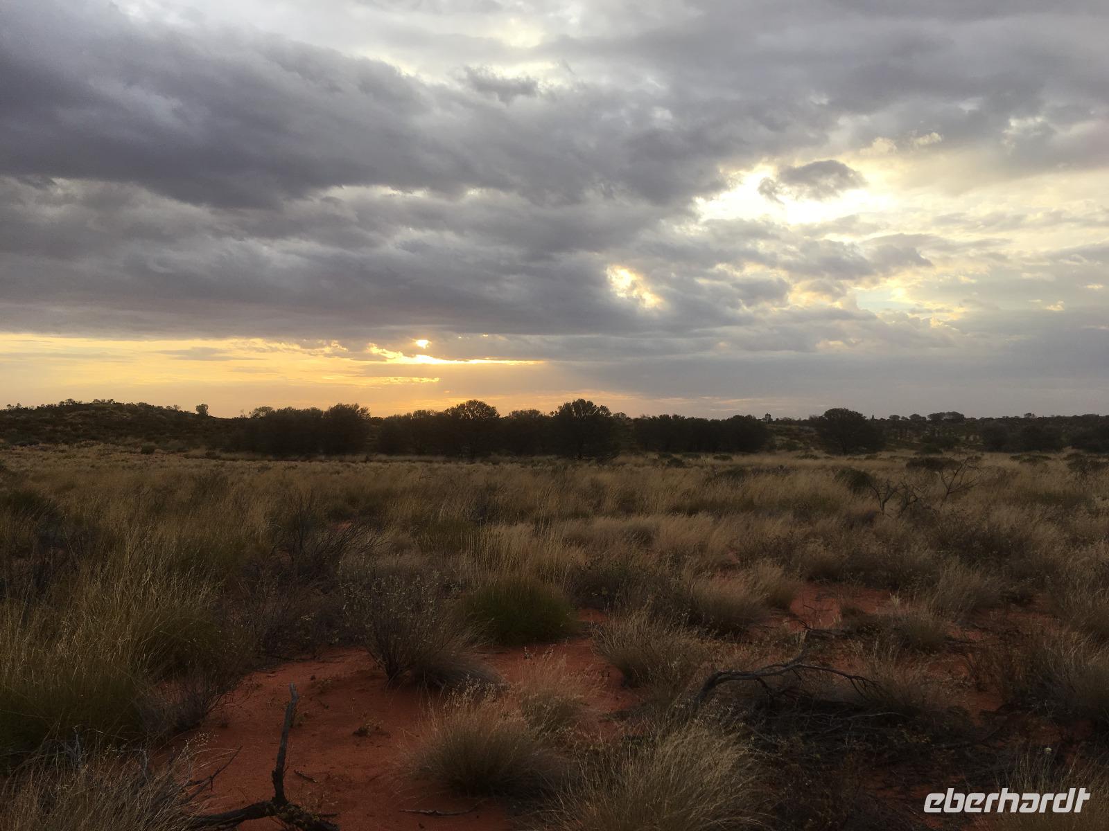 Das Herz des Roten Kontinents wartet heute auf uns - und es ist so ungeduldig, dass es uns gar nicht richtig ausschlafen lässt. Noch im Dunkeln werden wir zum Flughafen von Cairns gebracht, wo wir nach dem Einchecken unsere Frühstückspakete schlachten. Der Flughafen Ayers Rock ist noch übersichtlicher als der von Cairns, und so fällt es uns nicht schwer, unseren neuen örtlichen Reiseleiter Johannes zu finden, der gleichzeitig auch unser Fahrer ist. Wir laden die Koffer in den Anhänger und düsen los in Richtung Uluru-Kata-Tjuta-Nationalpark. Es ist sehr heiß draußen, aber zum Glück hat unser Kleinbus eine Klimaanlage und für Trinkwasser ist auch gesorgt. Am Uluru (Ayers Rock) fahren wir zunächst vorbei, auch wenn uns das bekannteste natürliche Wahrzeichen Australiens selbstverständlich ganz besonders reizt. Stattdessen fahren wir zur Kata Tjuta, den 36 Köpfen, dessen höchster mit 564 m sogar höher als der Uluru ist. Die Formationen Kata Tjuta (Olgas) und Uluru sind zur gleichen Zeit entstanden - vor mehr als 300 Millionen Jahren. Während der Uluru aus feinkörnigem Sandstein besteht, ist es bei den Olgas verkittetes Geröll. Nach einem ersten Panorama-Fotostopp können wir dies anschließend bei einer Wanderung in die Walpa Gorge auch eindeutig erkennen. Leider schmälern die vielen Fliegen und die brennende Sonne das Vergnügen. So flüchten wir nach einer Weile zurück in den Bus und fahren schon jetzt zum Sonnenuntergangs-Aussichtspunkt am Uluru, um ein paar Fotos zu machen. Die Mittagspause verbringen wir im übersichtlichen Zentrum des Resort-Ortes Yulara - Essen und Bier bekommt uns aber vorzüglich. In der Zwischenzeit checkt uns Johannes im Hotel ein und lässt uns die Koffer schon auf unsere Zimmer bringen. Dann holt er uns am Marktplatz ab, und wir können uns bis zum Abend erholen. Mit einem Gläschen Sekt und ein paar Snacks gerüstet, wollen wir später dann den Sonnenuntergang am Uluru genießen. Tatsächlich haben sich aber dunkle Regenwolken am Himmel gebildet, und vom Sonnenuntergang ist nicht so viel zu sehen. Dafür sehen wir aber einen wunderschönen Regenbogen und eine Schlange, die eine Fledermaus verspeist! Beim anschließenden Barbecue (australisch: Barbie) im Hotel können wir uns bei Live-Musik unser Abendessen selbst grillen - wie echte Australier.